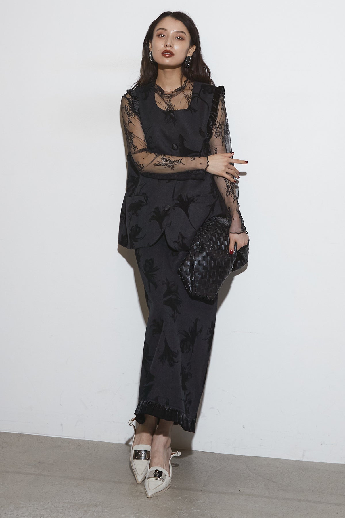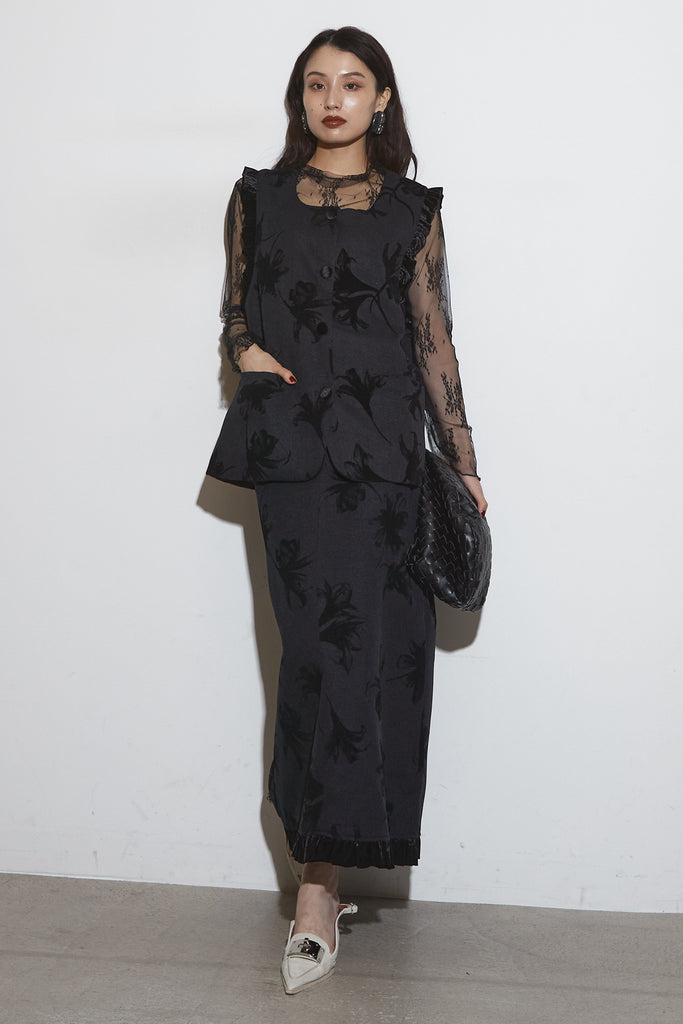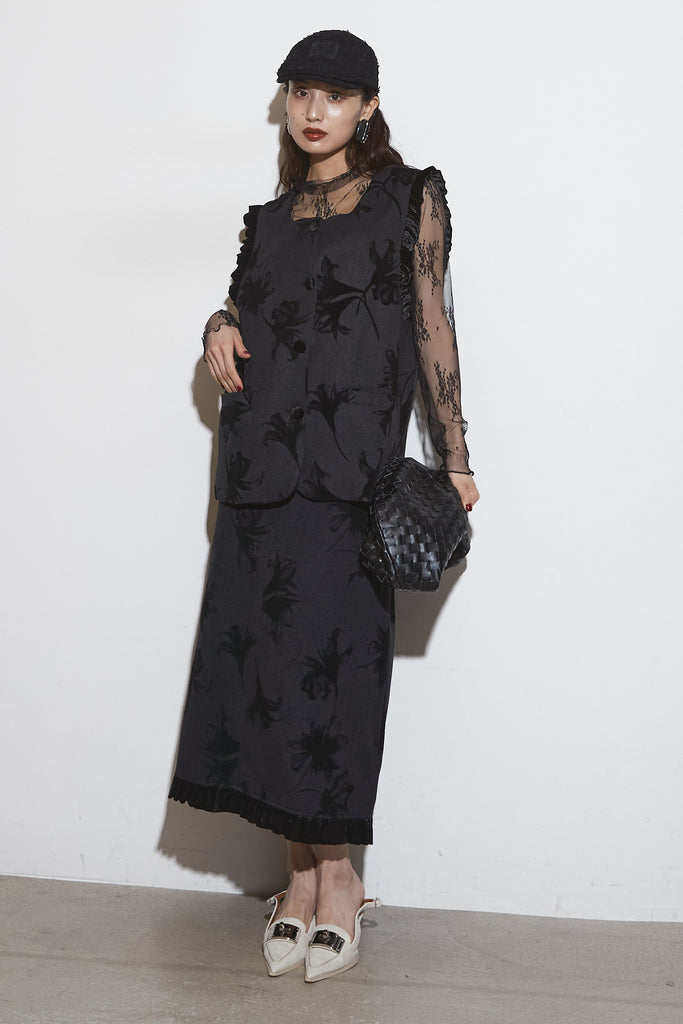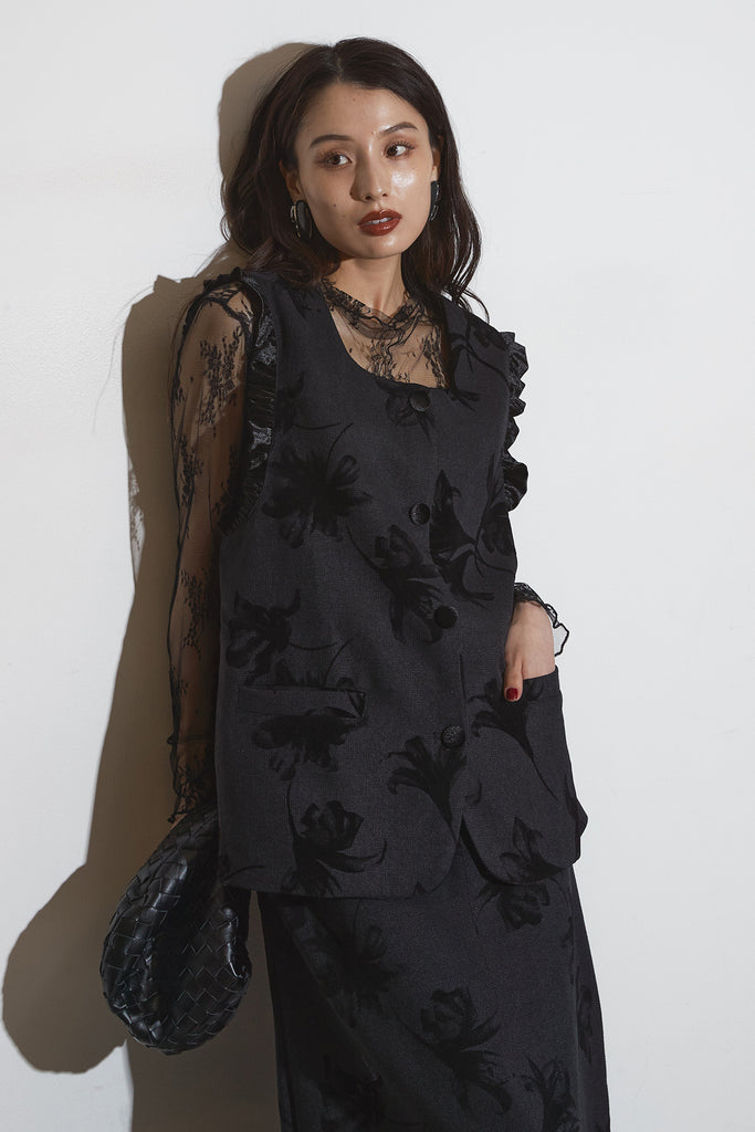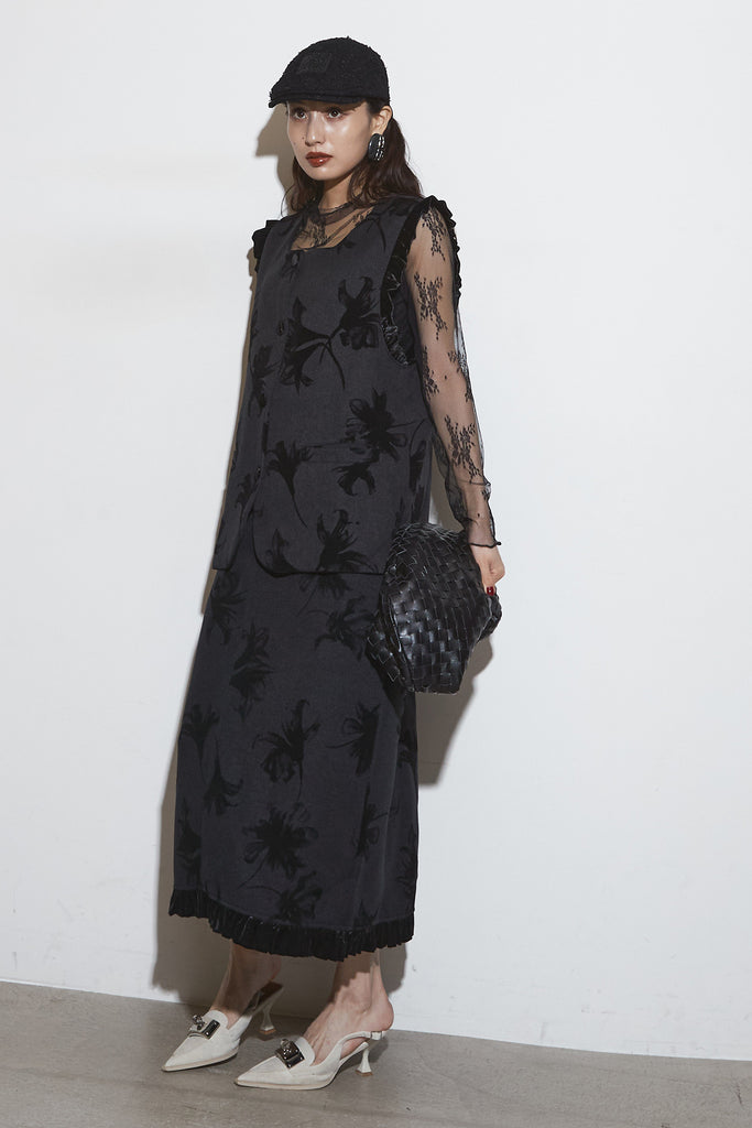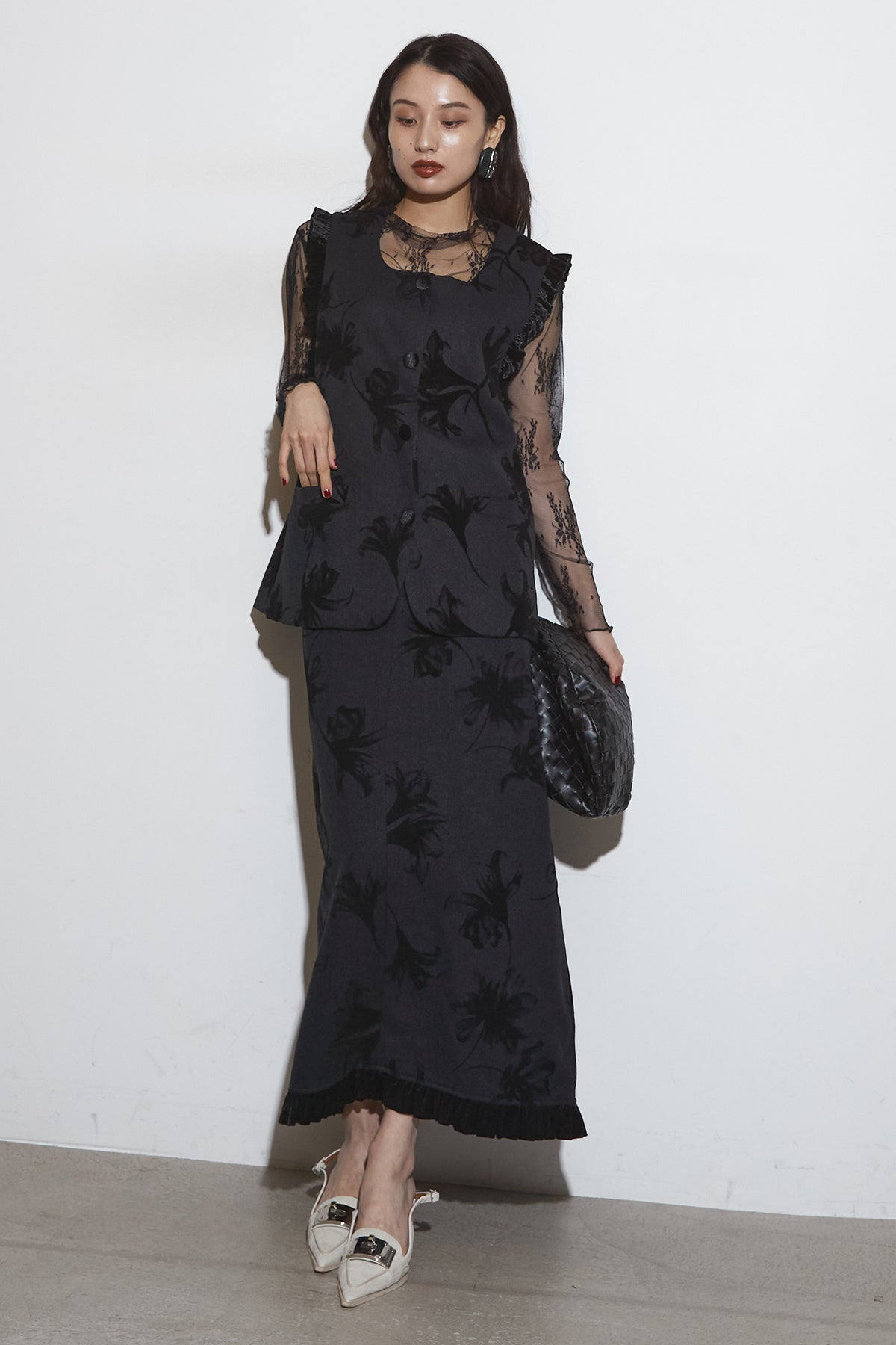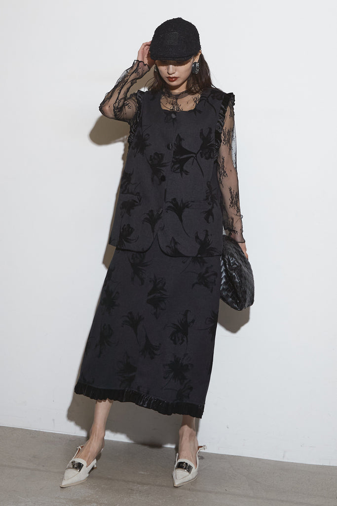 大胆なフラワーパターンが目を惹くセットアップ。 落ち着いた色味ながらも、立体的な柄がスタイリングに華やかさをプラスします。 ゆったりとしたシルエットでリラックス感がありながらも、上品な雰囲気を演出。 セットではもちろん、単品でも着回しやすい万能アイテムです。