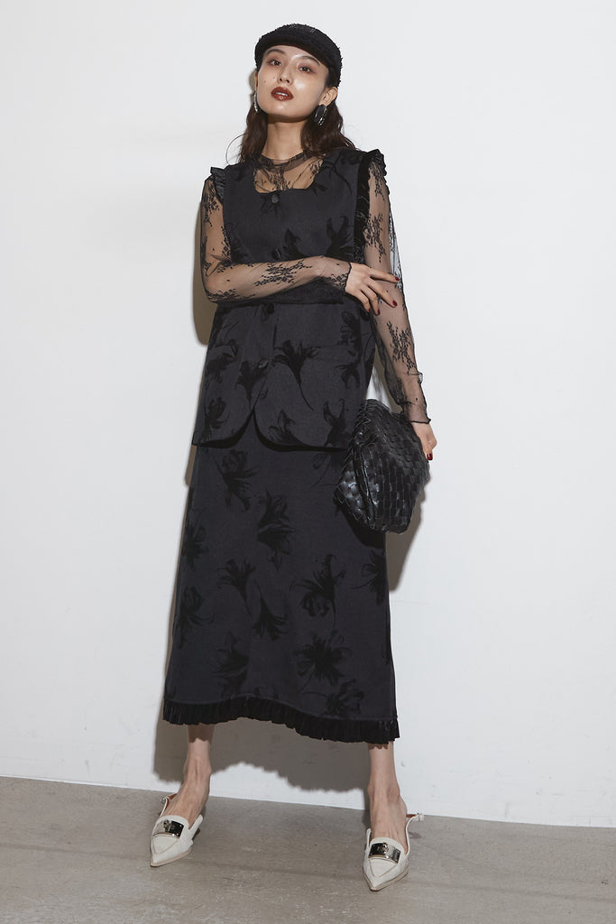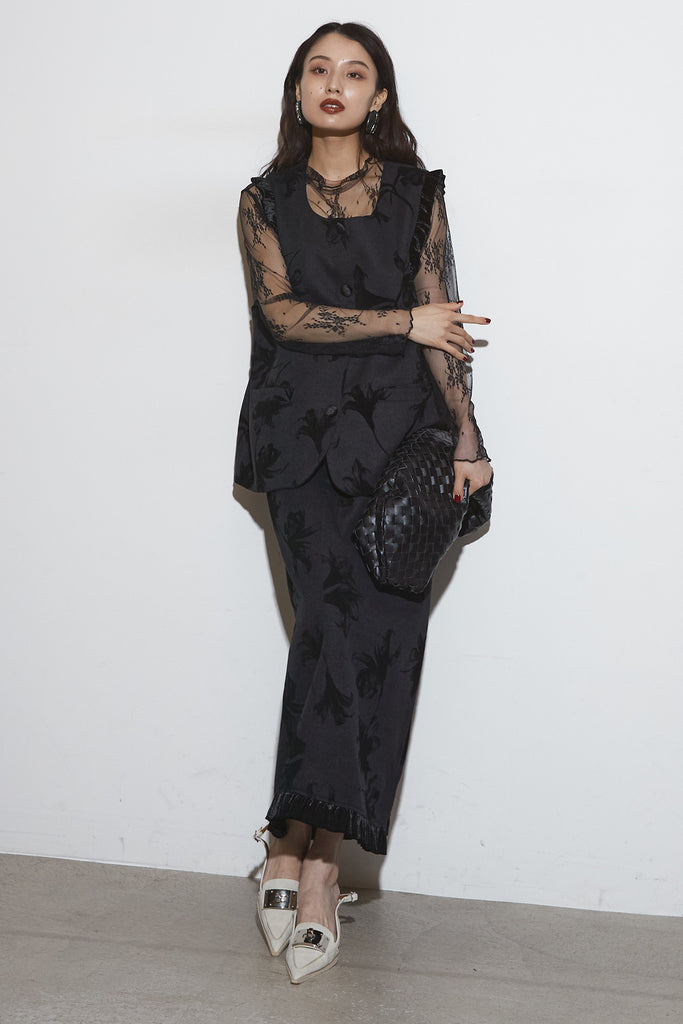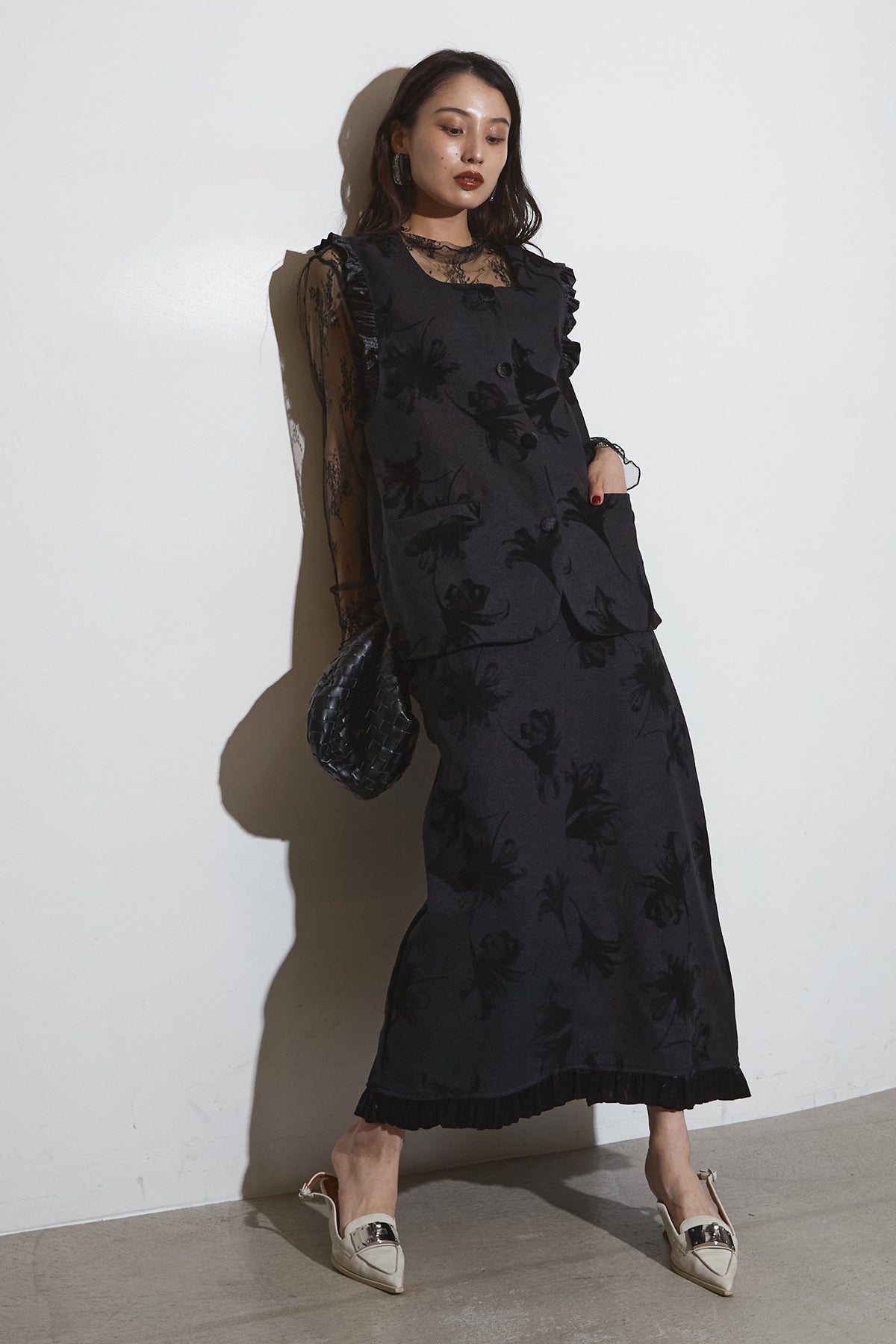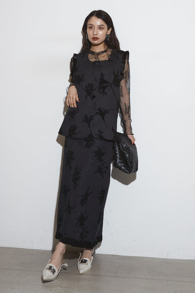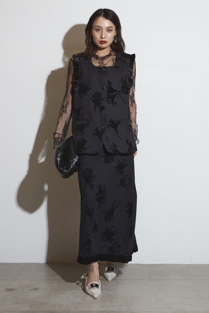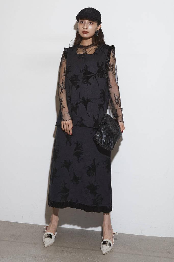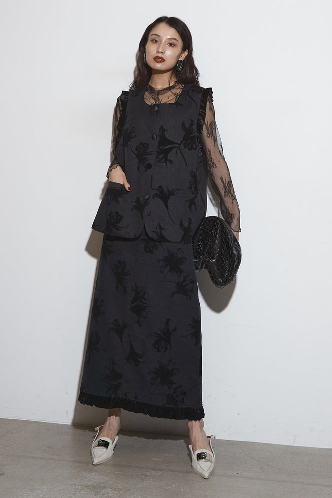 大胆なフラワーパターンが目を惹くセットアップ。 落ち着いた色味ながらも、立体的な柄がスタイリングに華やかさをプラスします。 ゆったりとしたシルエットでリラックス感がありながらも、上品な雰囲気を演出。 セットではもちろん、単品でも着回しやすい万能アイテムです。