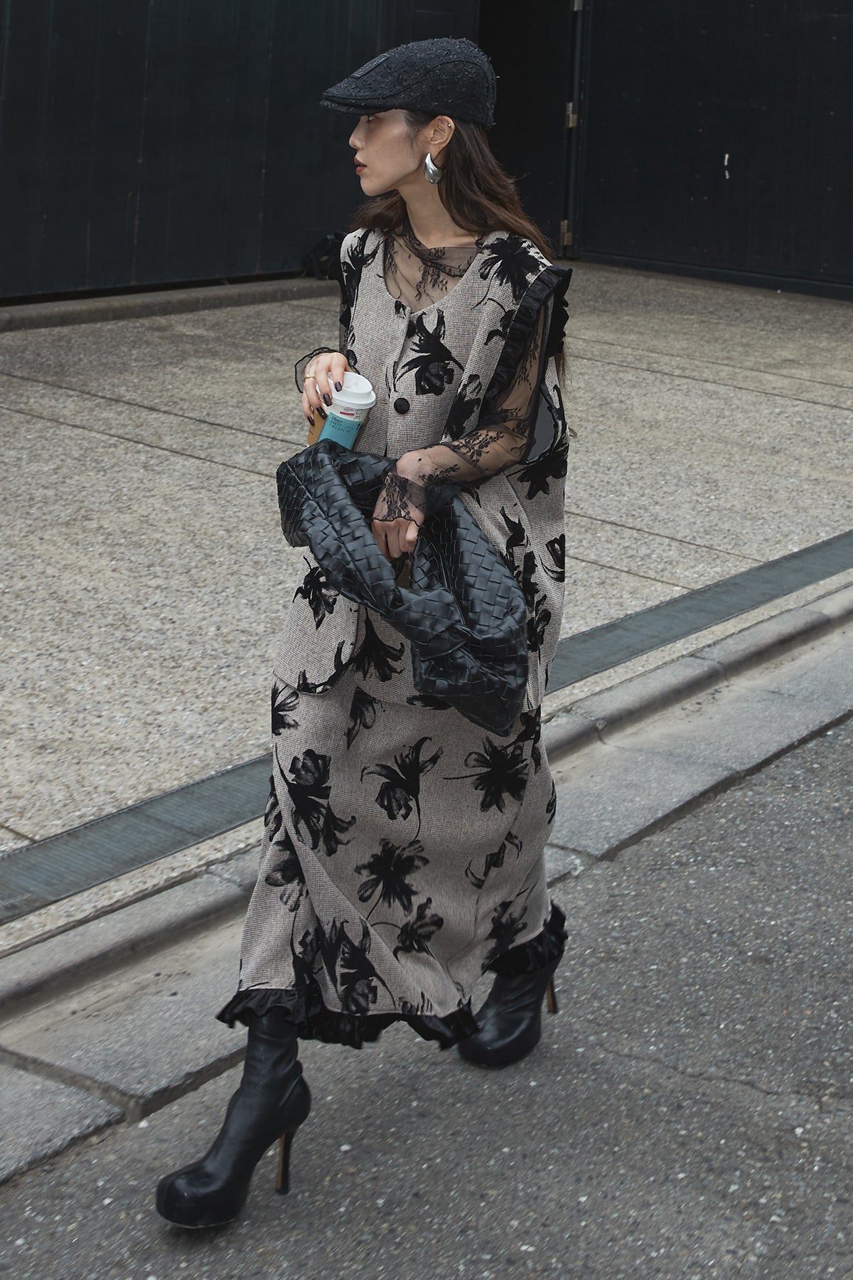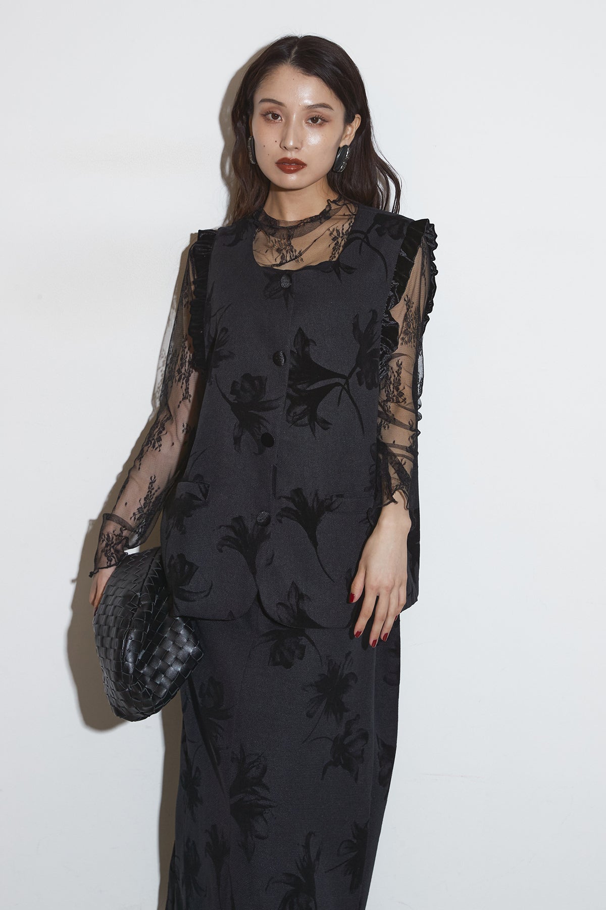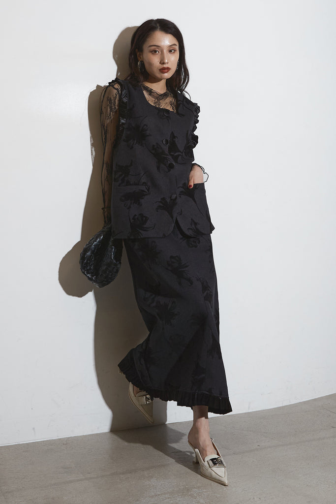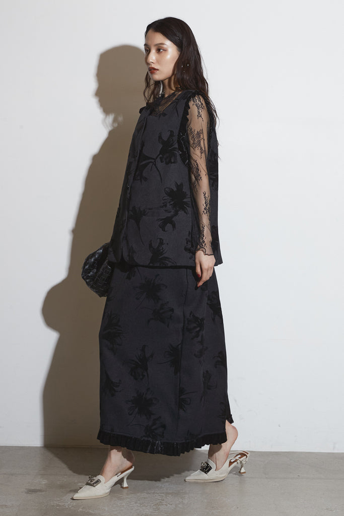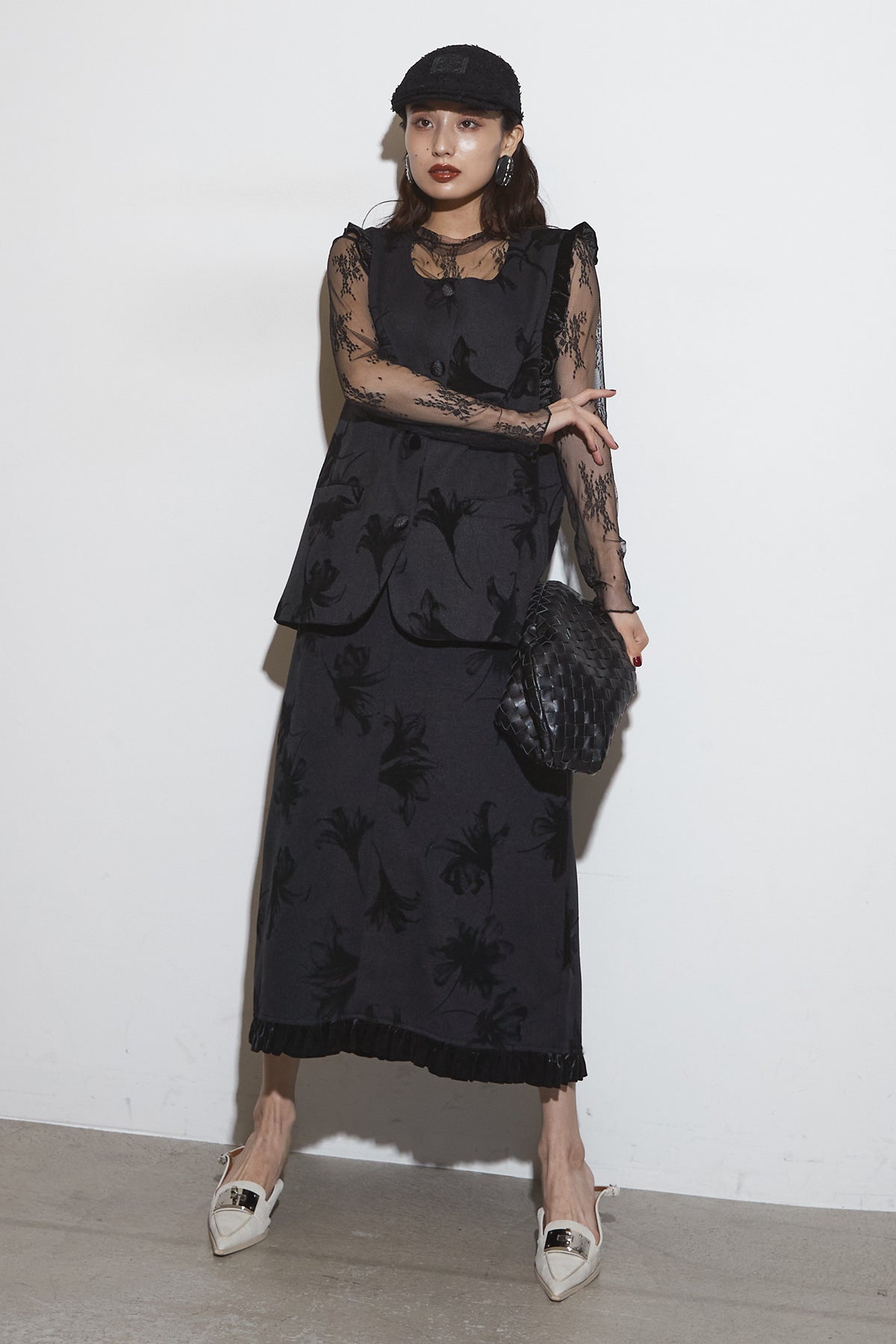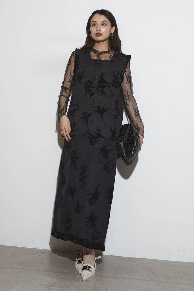 大胆なフラワーパターンが目を惹くセットアップ。 落ち着いた色味ながらも、立体的な柄がスタイリングに華やかさをプラスします。 ゆったりとしたシルエットでリラックス感がありながらも、上品な雰囲気を演出。 セットではもちろん、単品でも着回しやすい万能アイテムです。