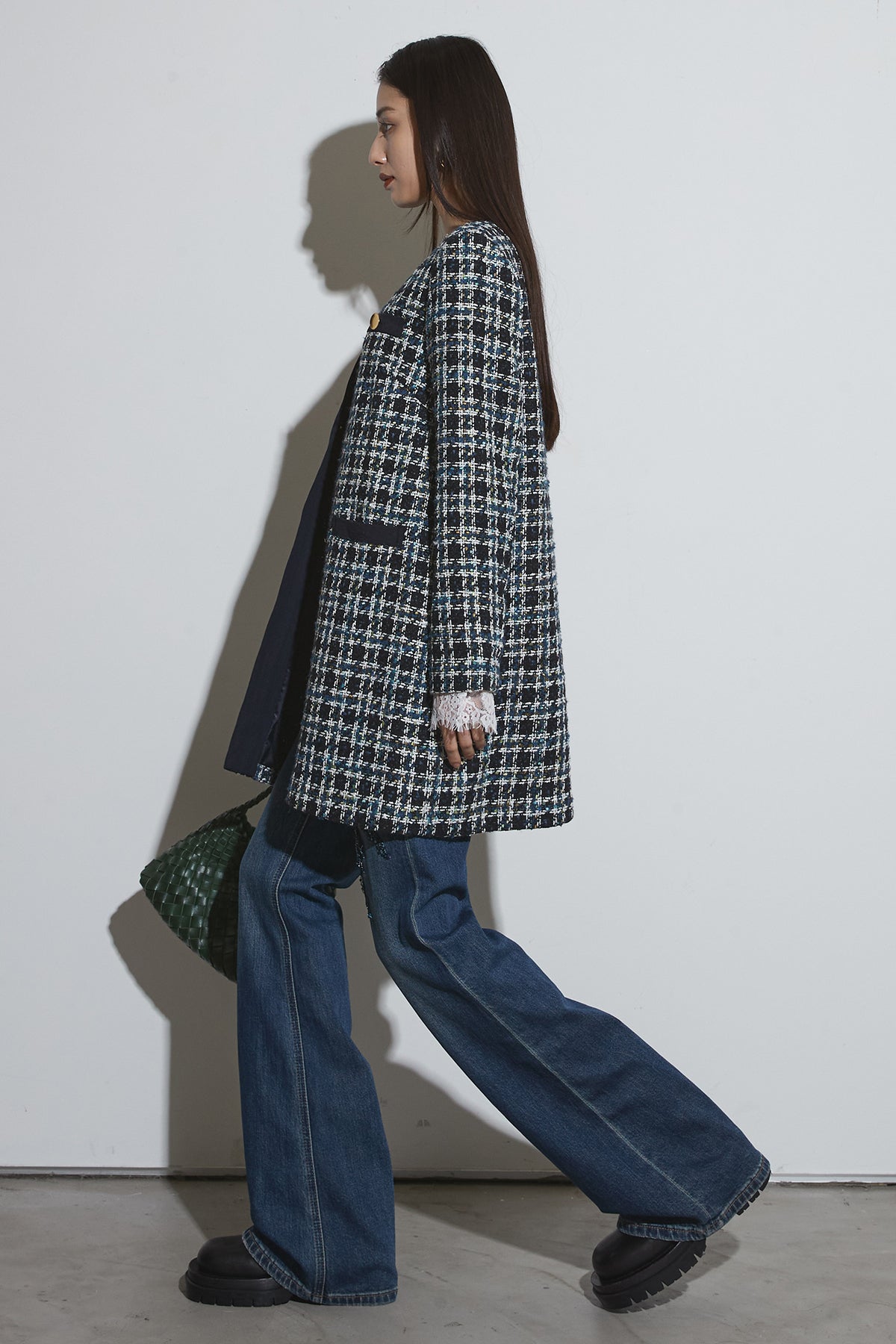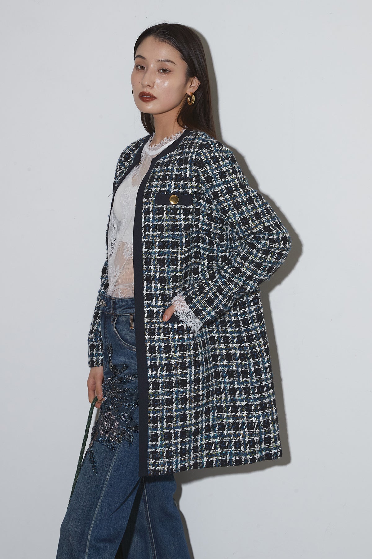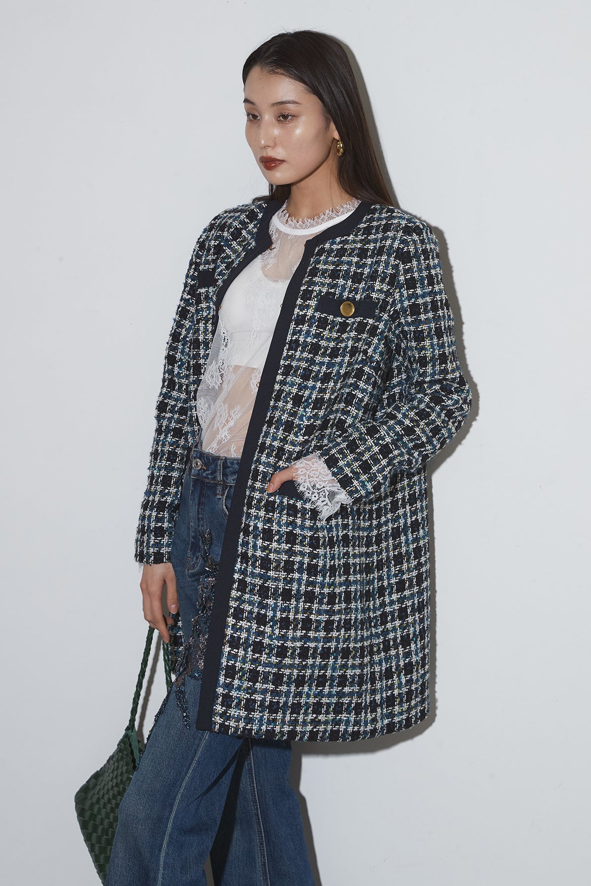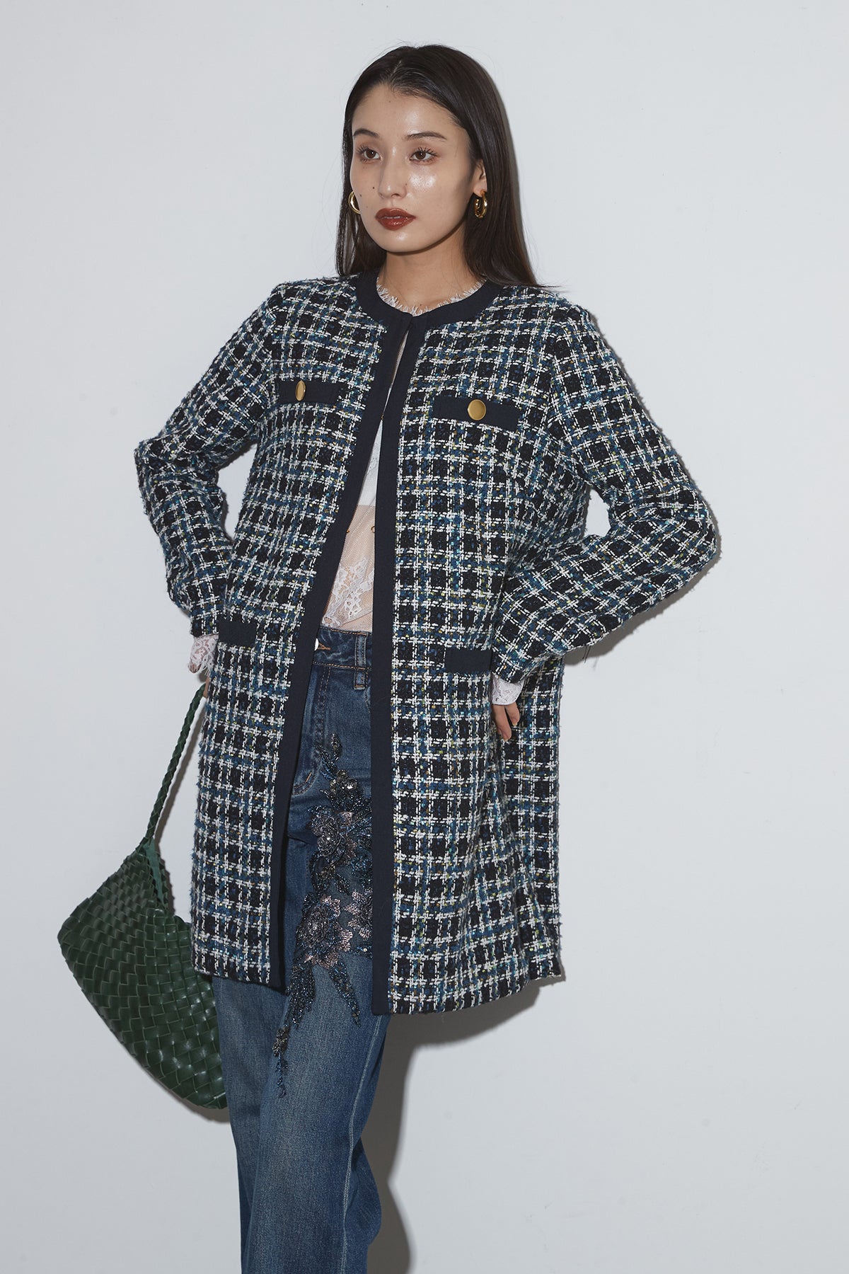 ツイードの立体的な表情が上品さを引き立て、ノーカラーのすっきりしたラインに配した飾りポケットとフロントの比翼デザインがクラシックな雰囲気を添えるジャケットです。