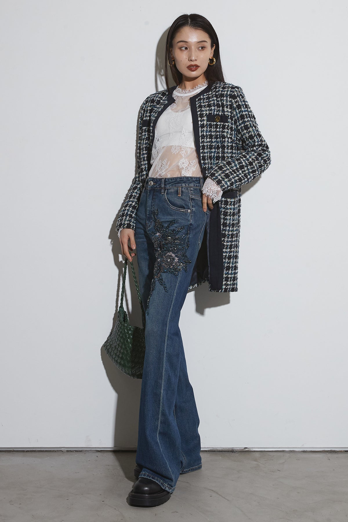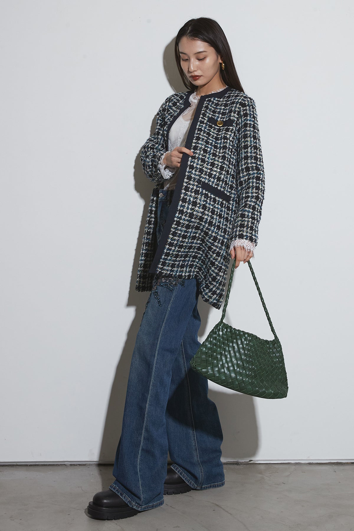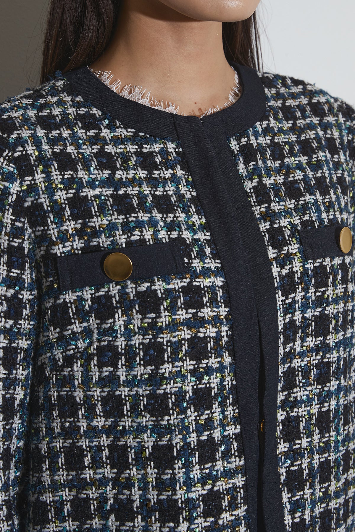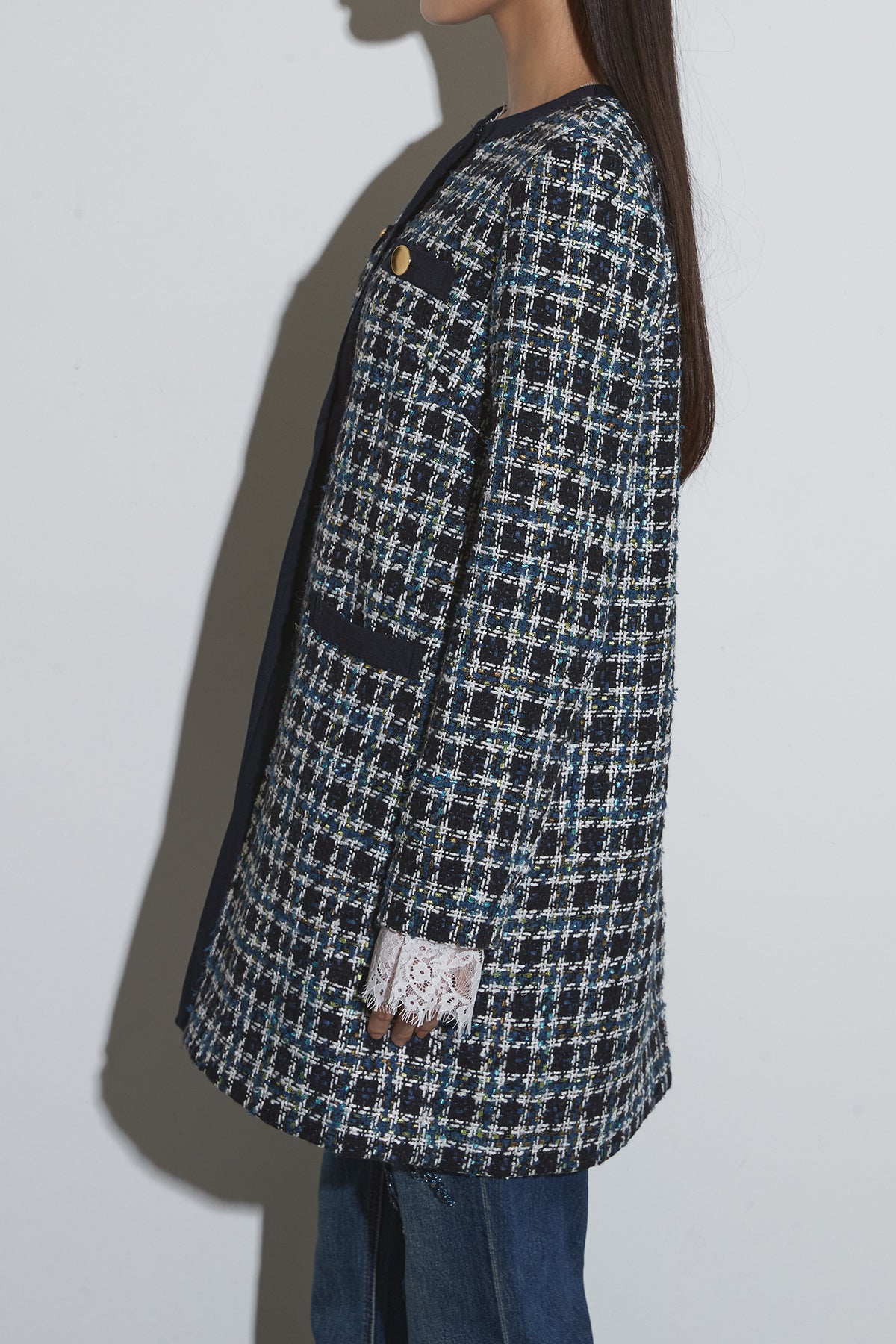 ツイードの立体的な表情が上品さを引き立て、ノーカラーのすっきりしたラインに配した飾りポケットとフロントの比翼デザインがクラシックな雰囲気を添えるジャケットです。