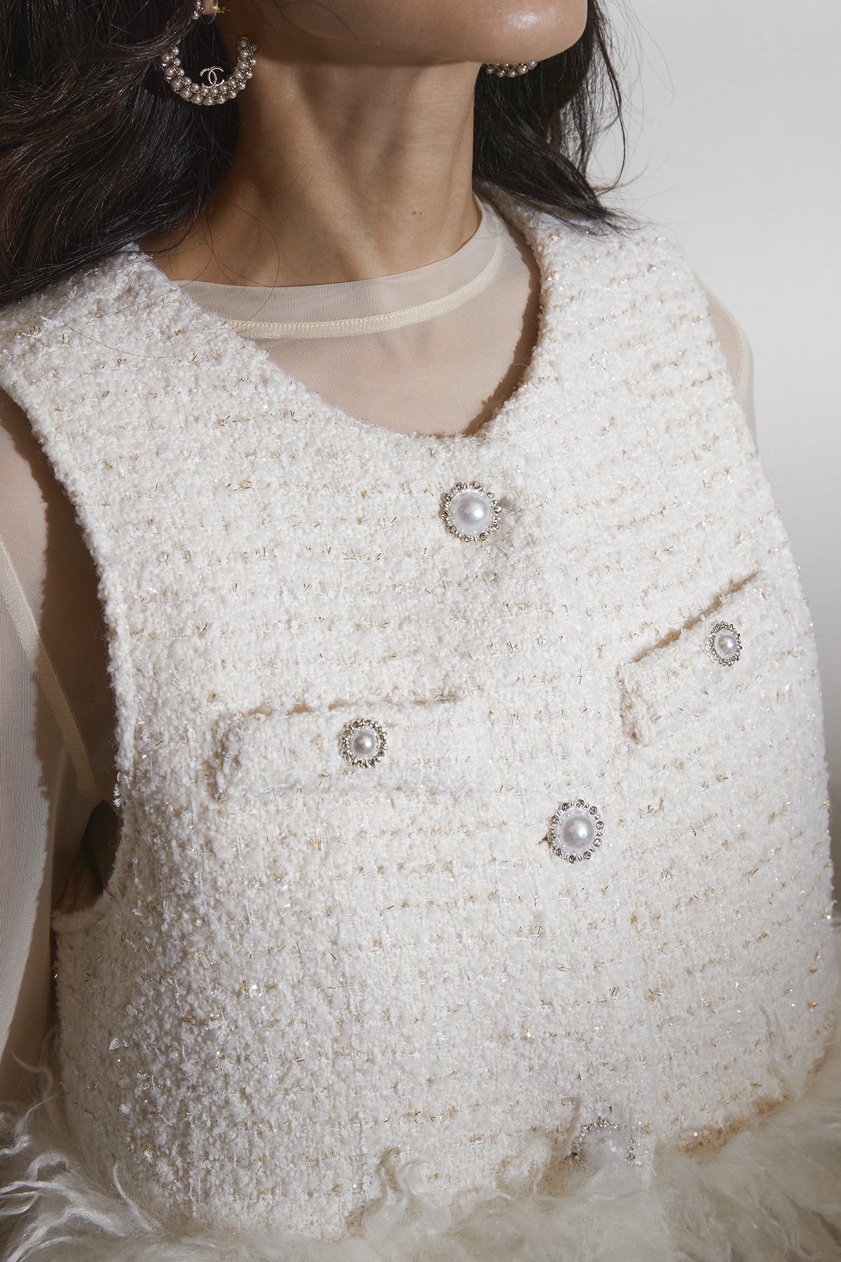 ふわふわのフェザーデザインを裾にあしらったツイードベスト。ニュアンスのある立体的なツイード生地に、フロントの装飾的なボタンが上品なアクセント。軽やかな透けトップスやワンピースに重ねるだけで華やかさが増し、特別感のあるスタイリングが完成します。