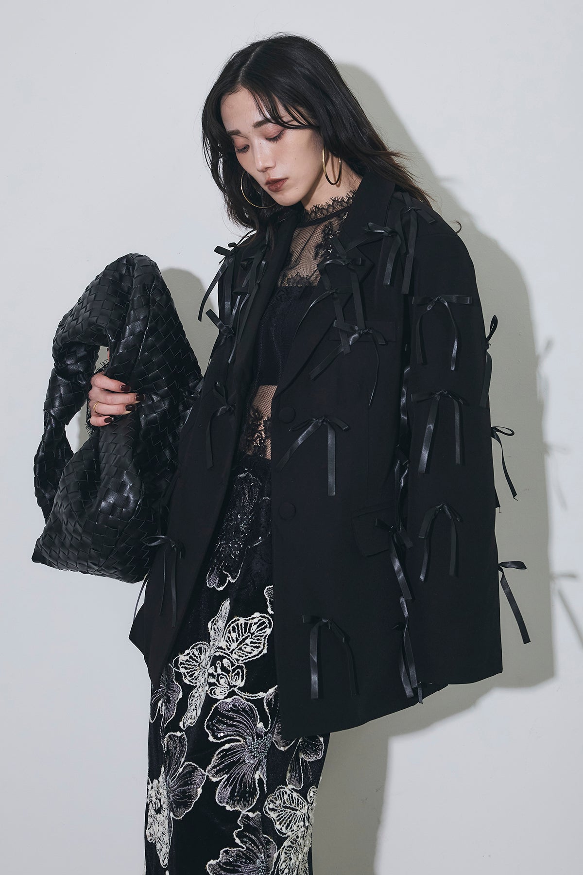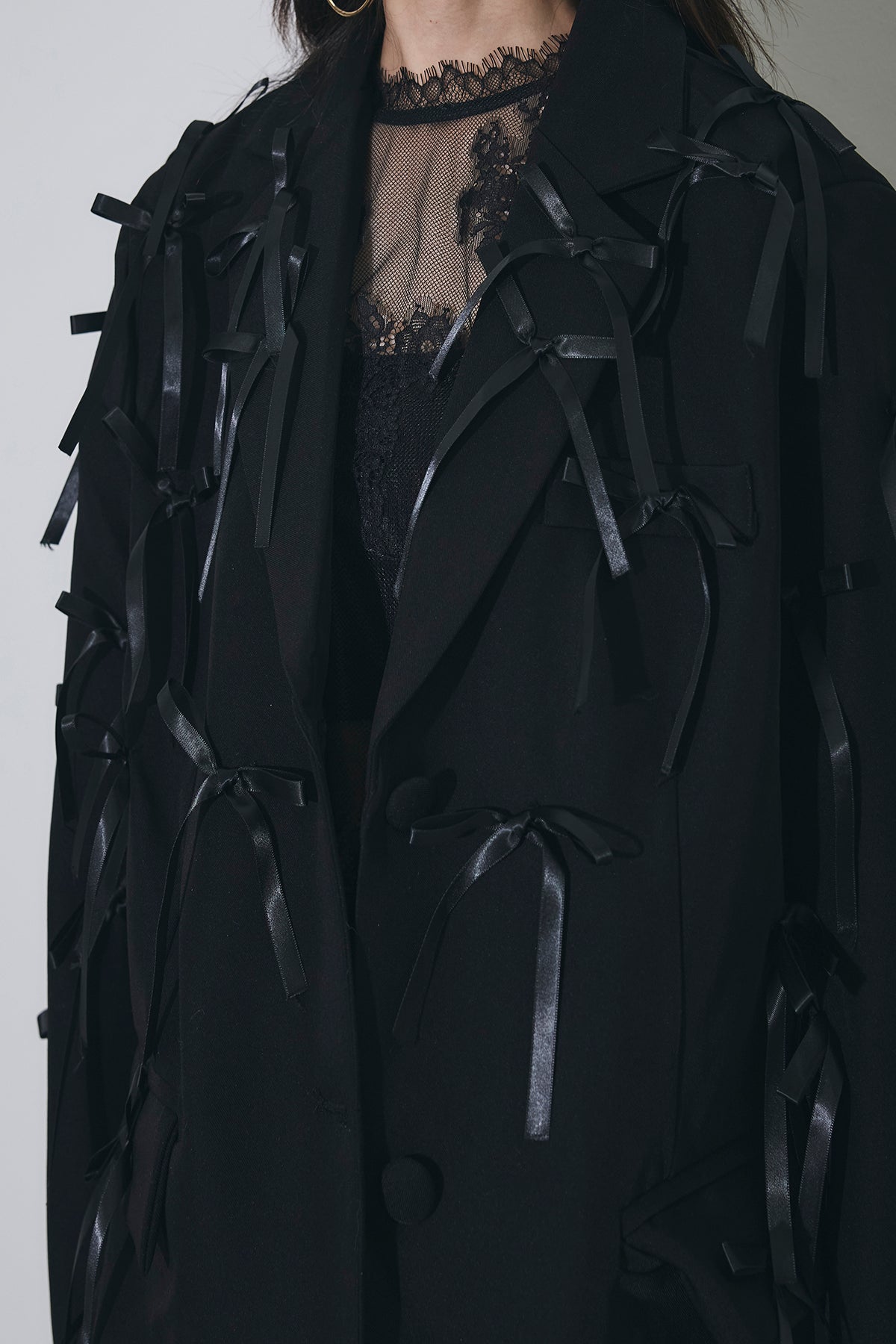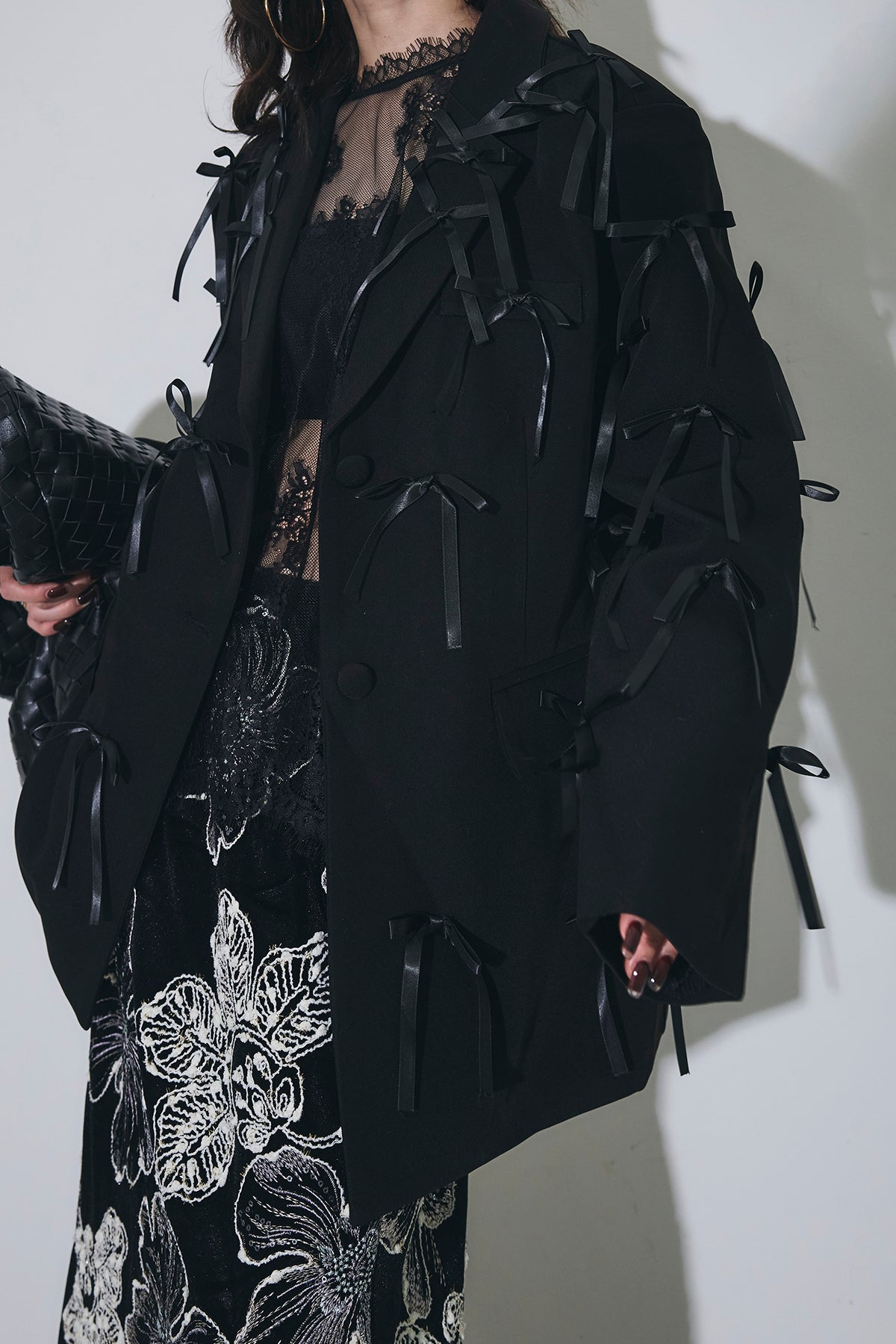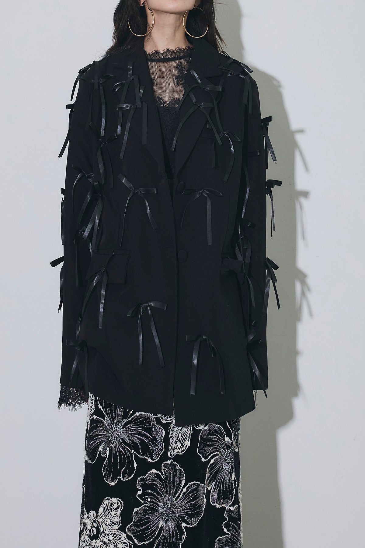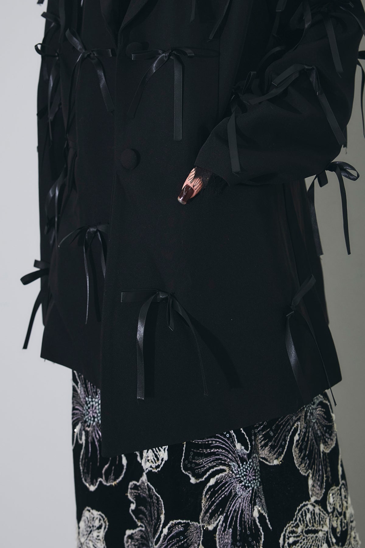 ご注文前に必ずページ下部「お届け期間」をご確認くださいませ。全体にあしらわれたリボンディテールが印象的なデザインジャケット。 柔らかい布テープで結ばれたリボンが立体感を生み、 モードな雰囲気の中にフェミニンなアクセントを添えます。 ゆったりとしたシルエットで抜け感がありながらも、 構築的なフォルムがスタイルを引き締めて見せる一着です。