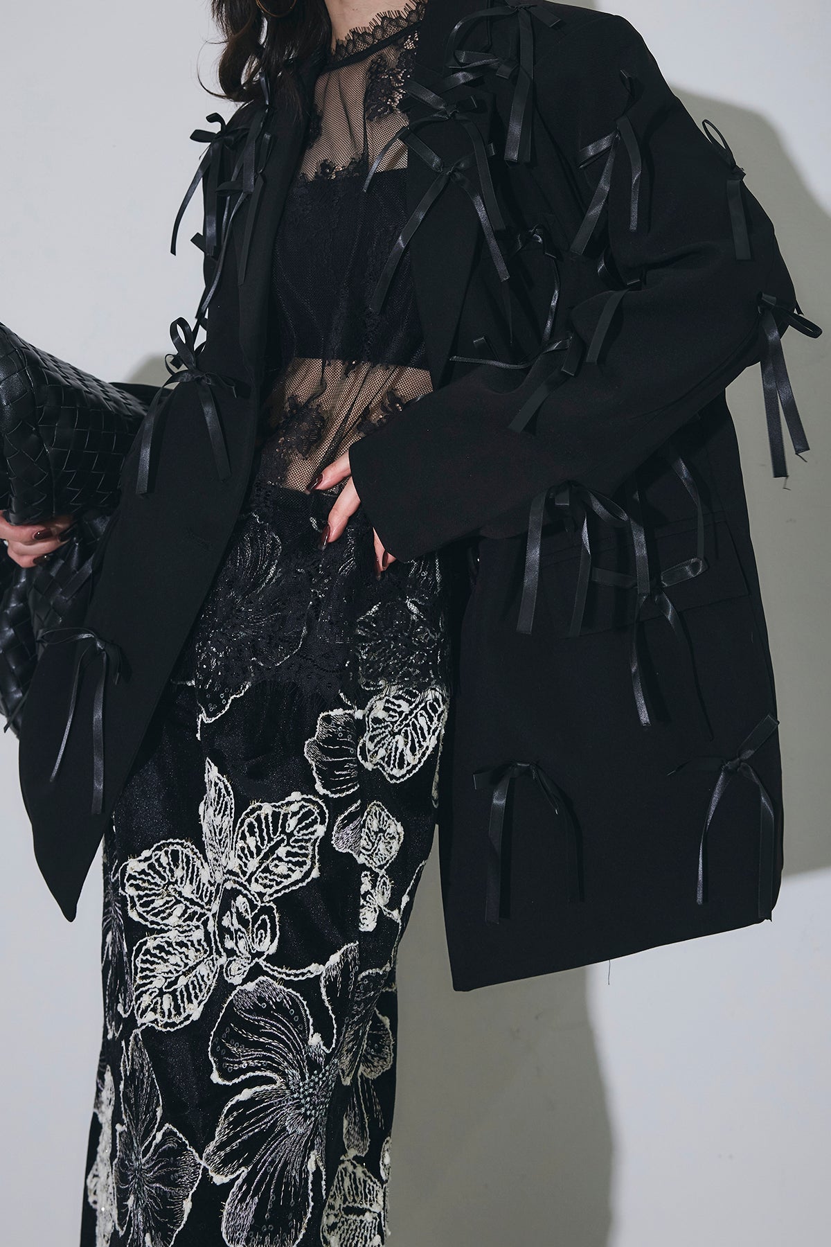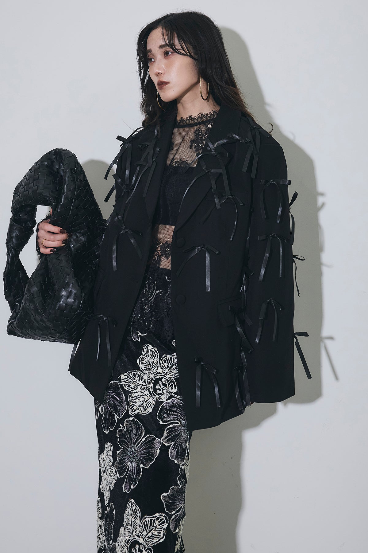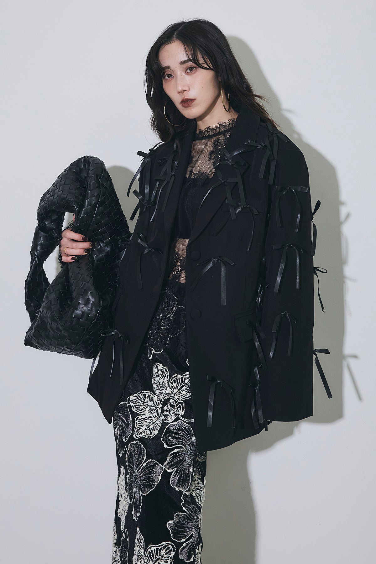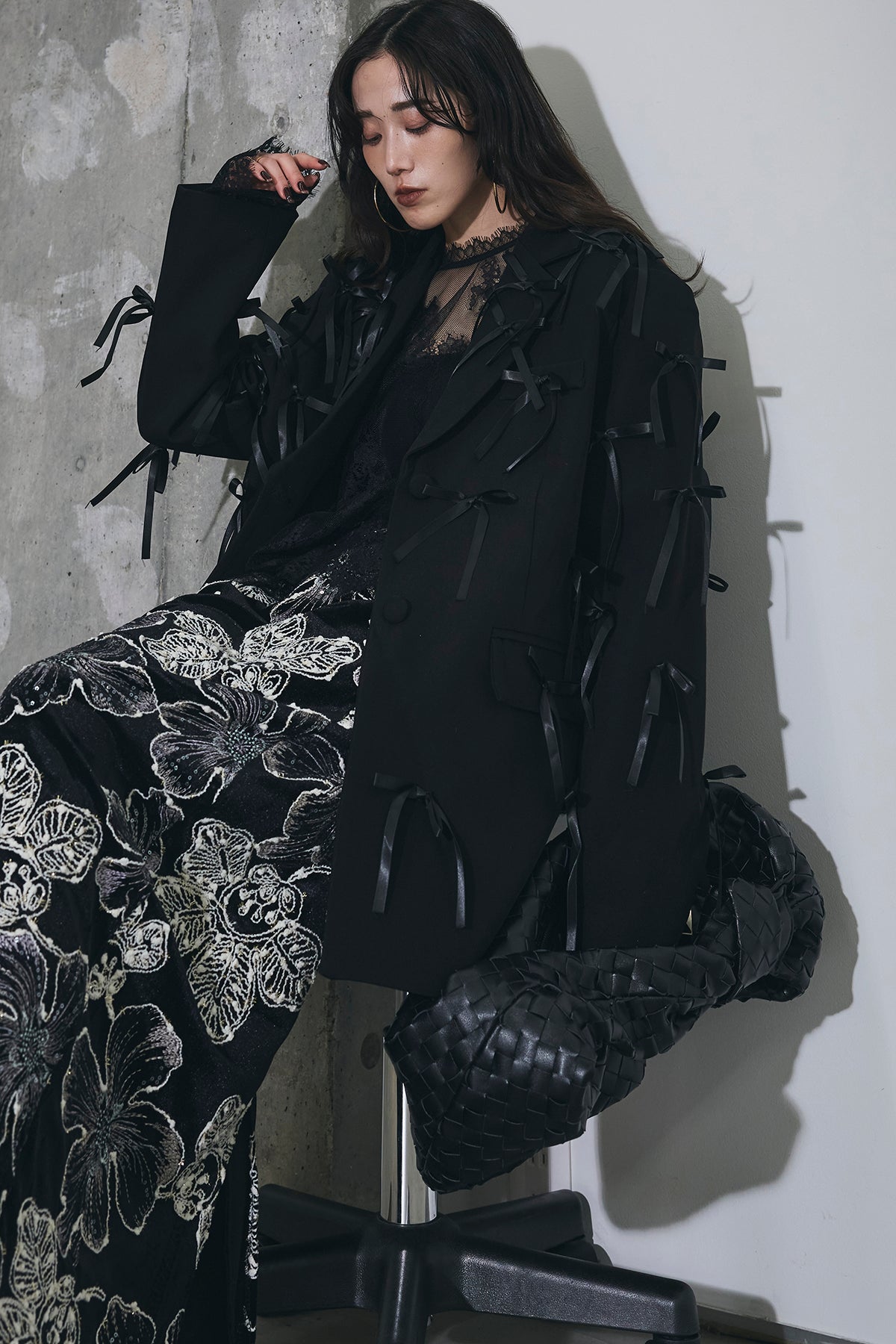 ご注文前に必ずページ下部「お届け期間」をご確認くださいませ。全体にあしらわれたリボンディテールが印象的なデザインジャケット。 柔らかい布テープで結ばれたリボンが立体感を生み、 モードな雰囲気の中にフェミニンなアクセントを添えます。 ゆったりとしたシルエットで抜け感がありながらも、 構築的なフォルムがスタイルを引き締めて見せる一着です。