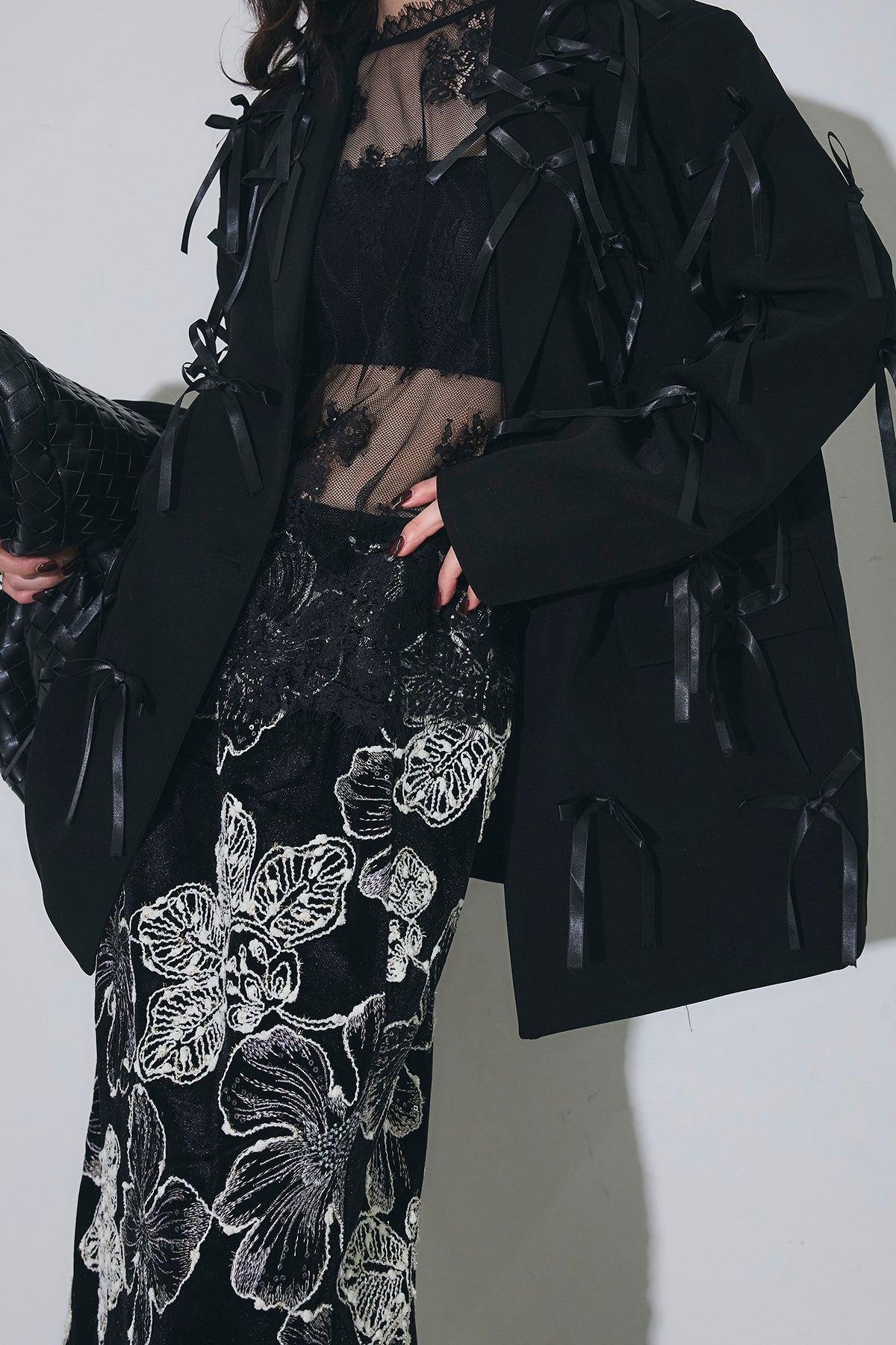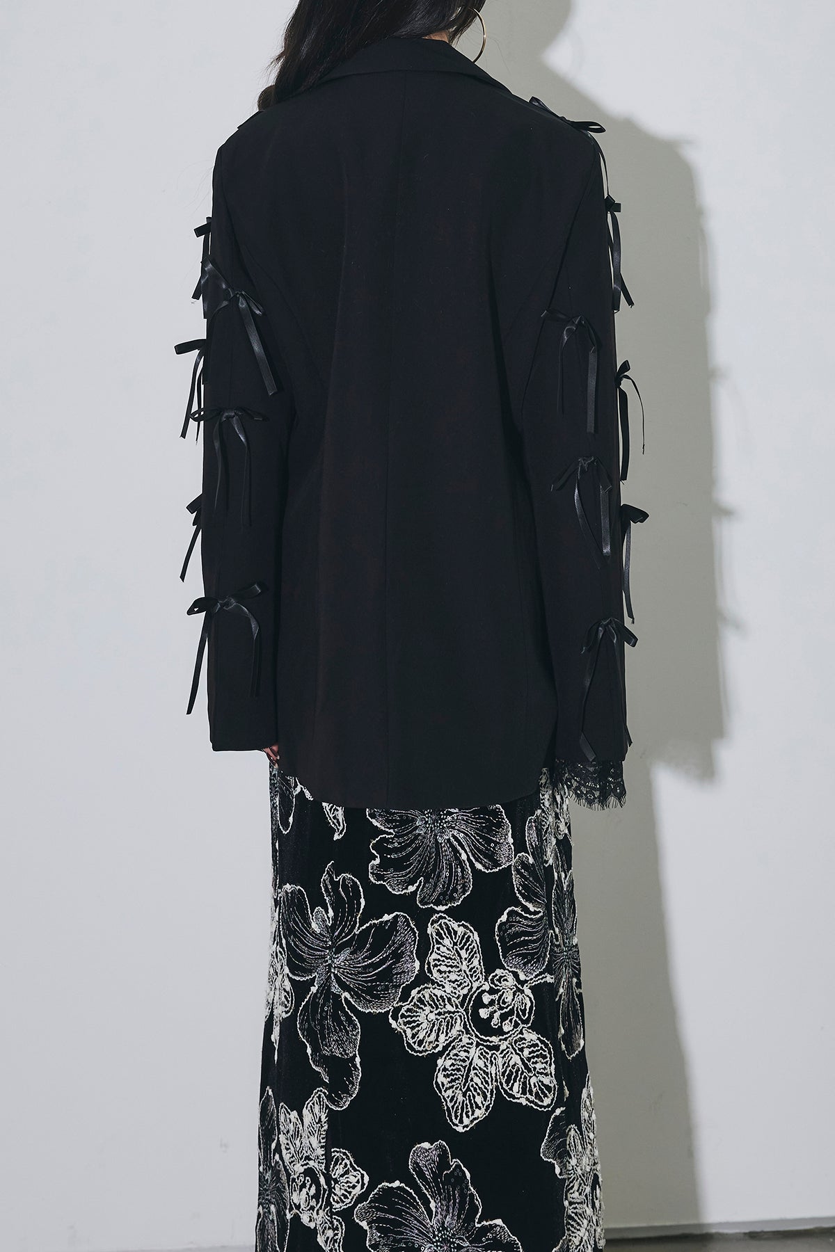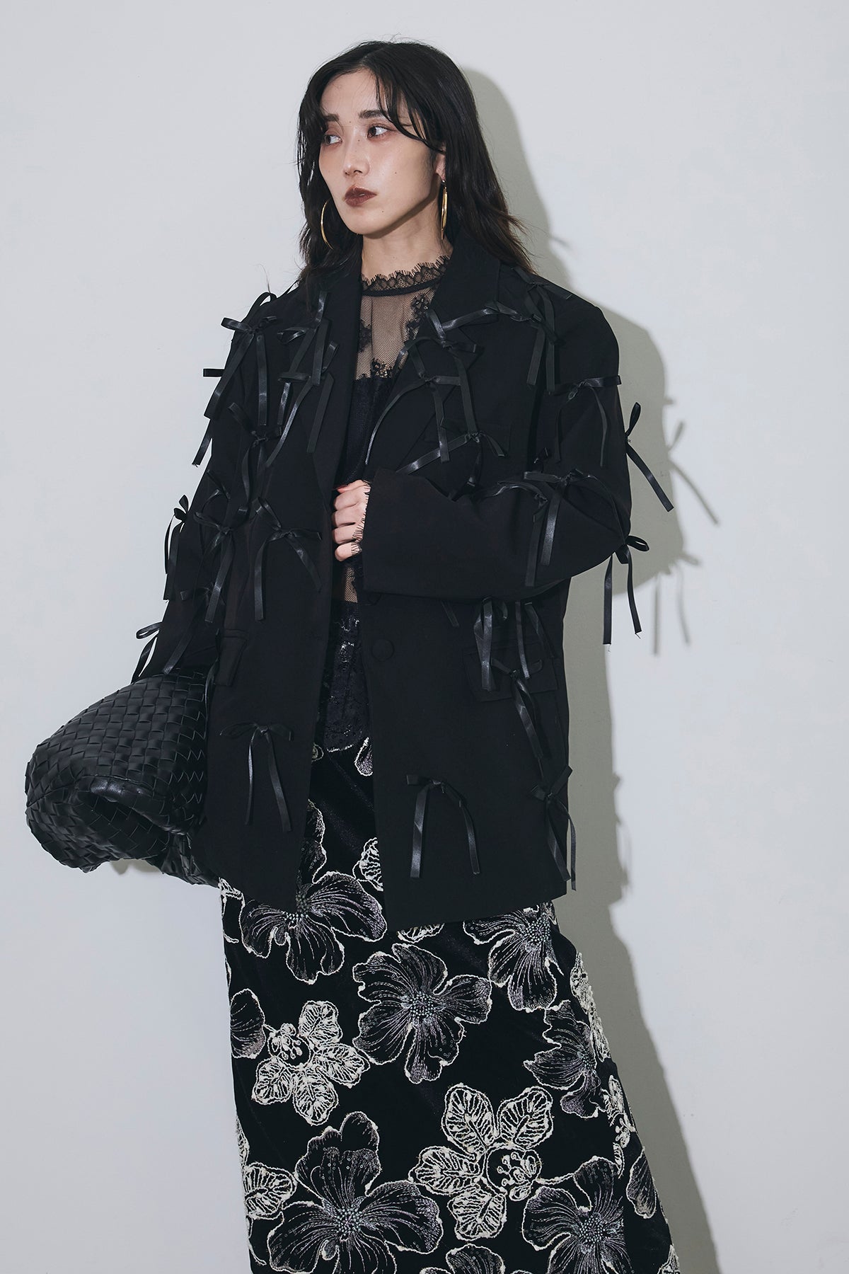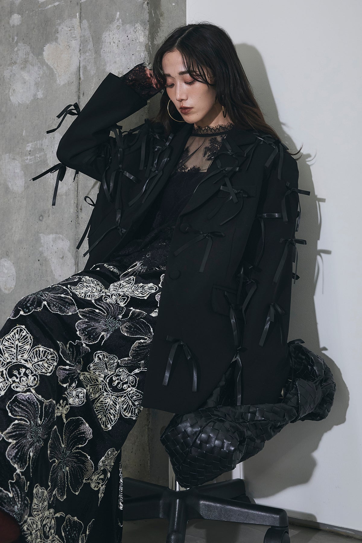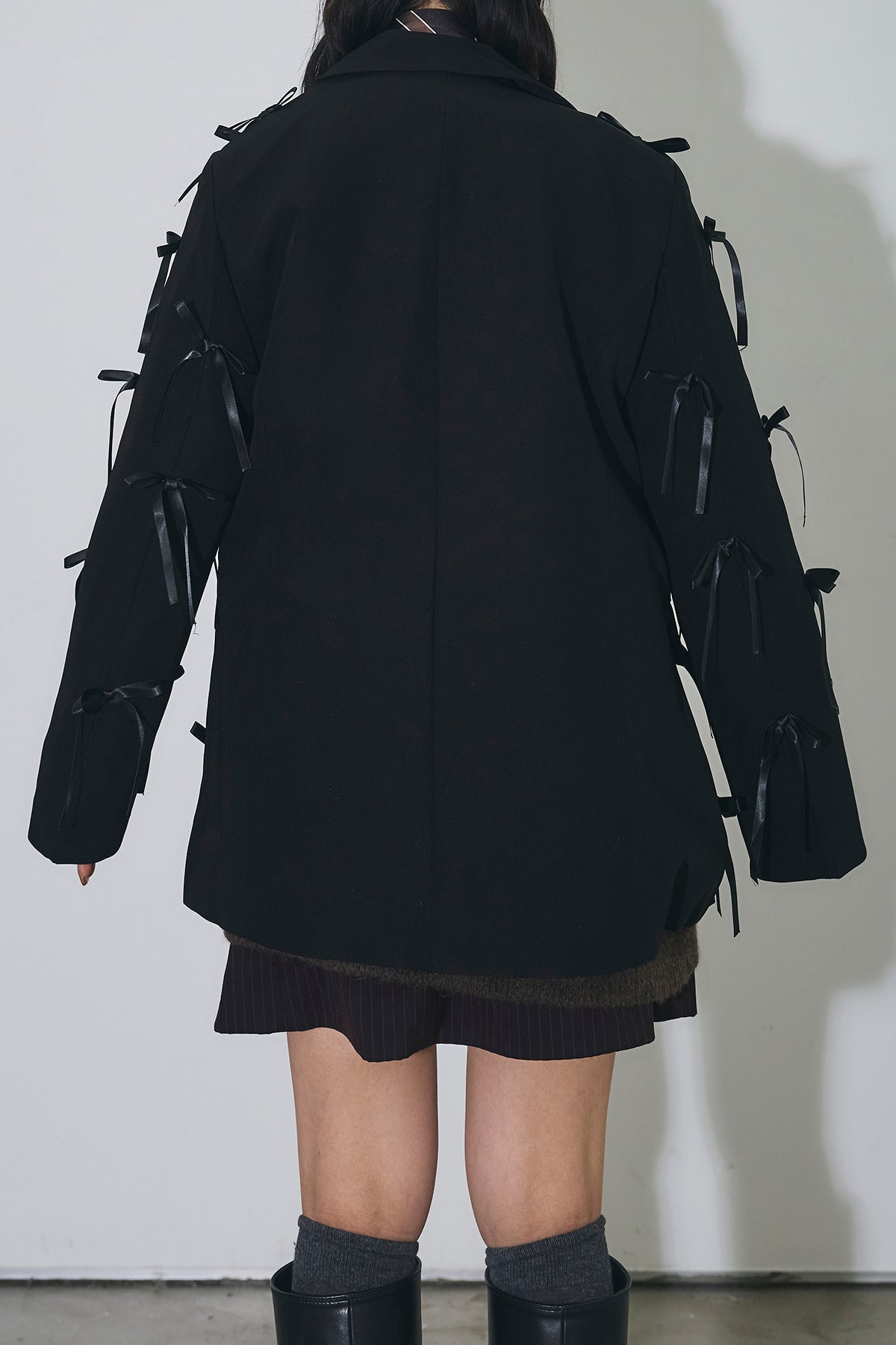 ご注文前に必ずページ下部「お届け期間」をご確認くださいませ。全体にあしらわれたリボンディテールが印象的なデザインジャケット。 柔らかい布テープで結ばれたリボンが立体感を生み、 モードな雰囲気の中にフェミニンなアクセントを添えます。 ゆったりとしたシルエットで抜け感がありながらも、 構築的なフォルムがスタイルを引き締めて見せる一着です。