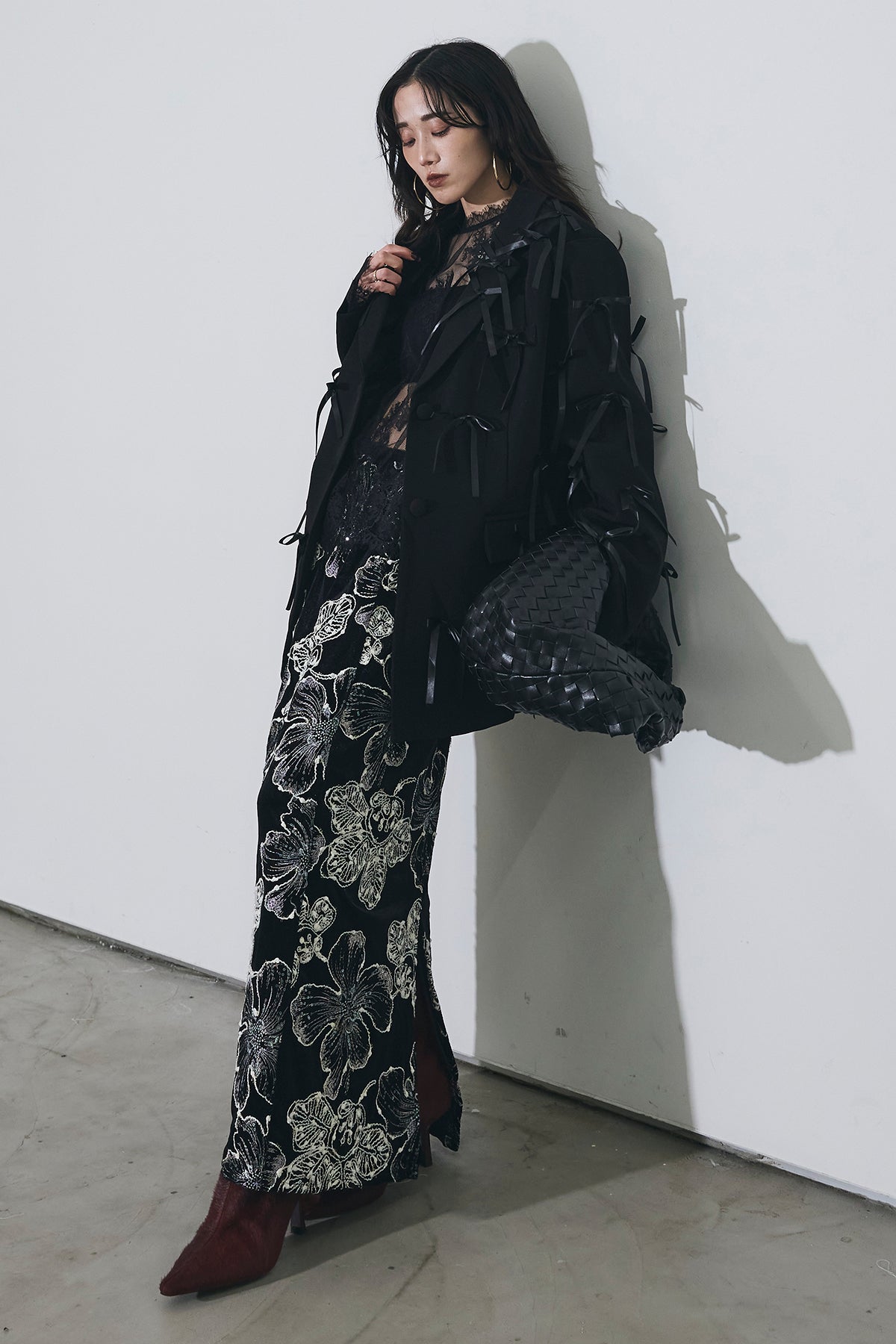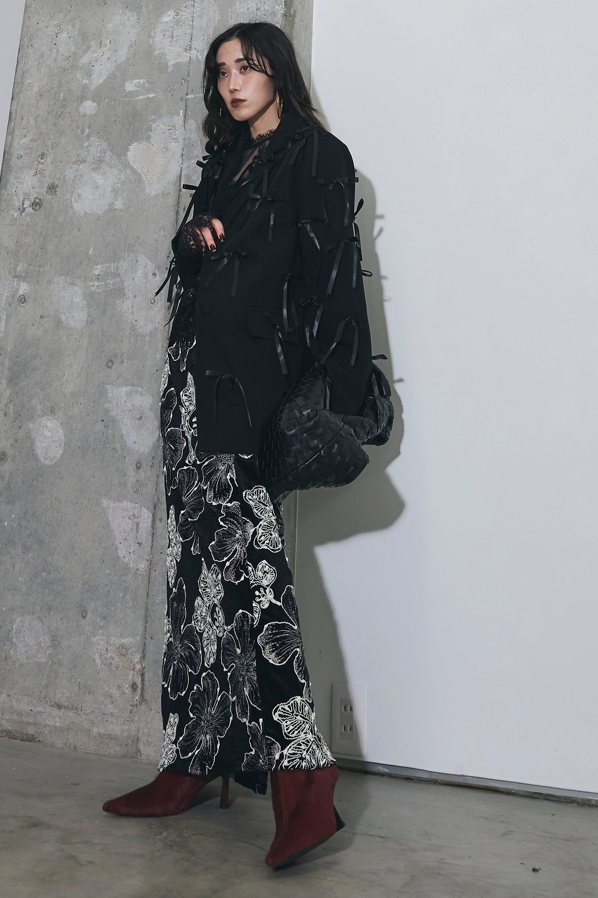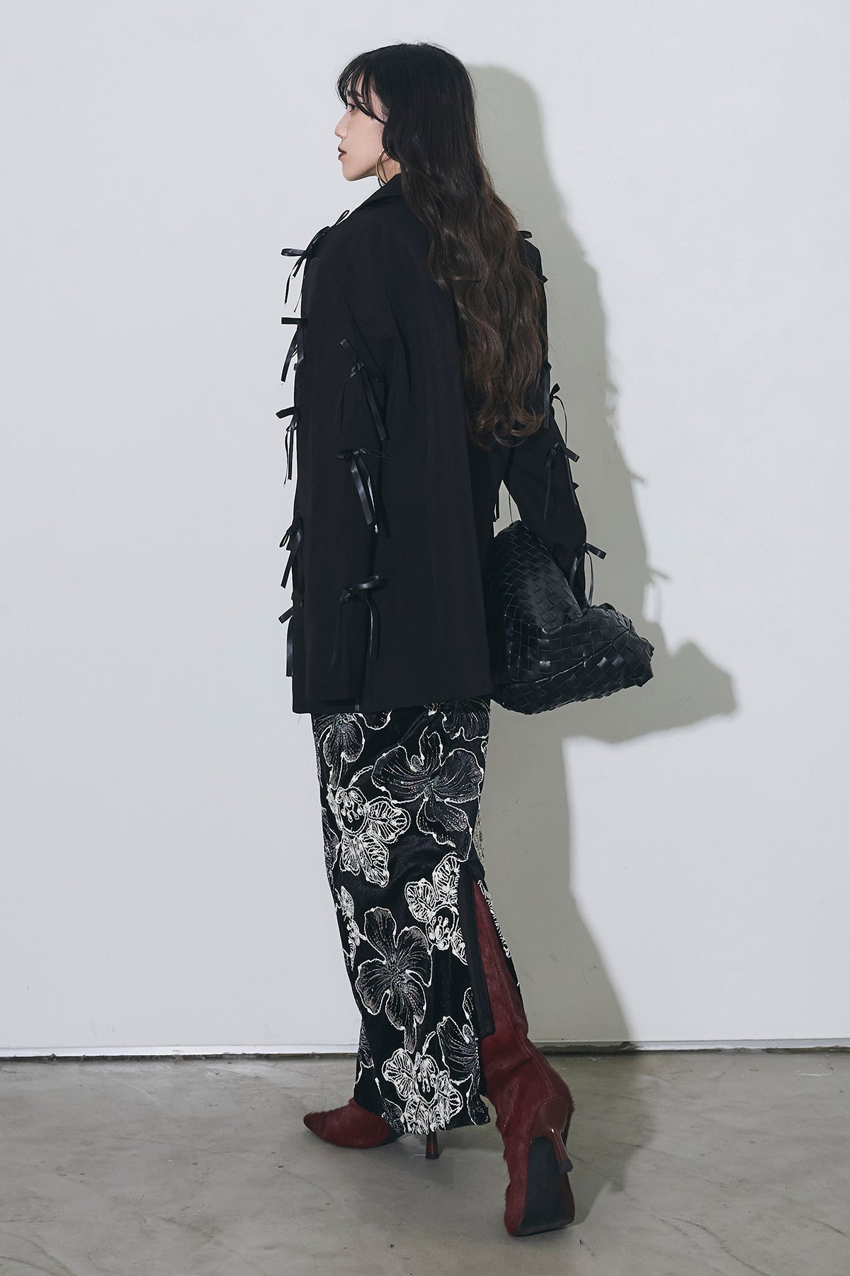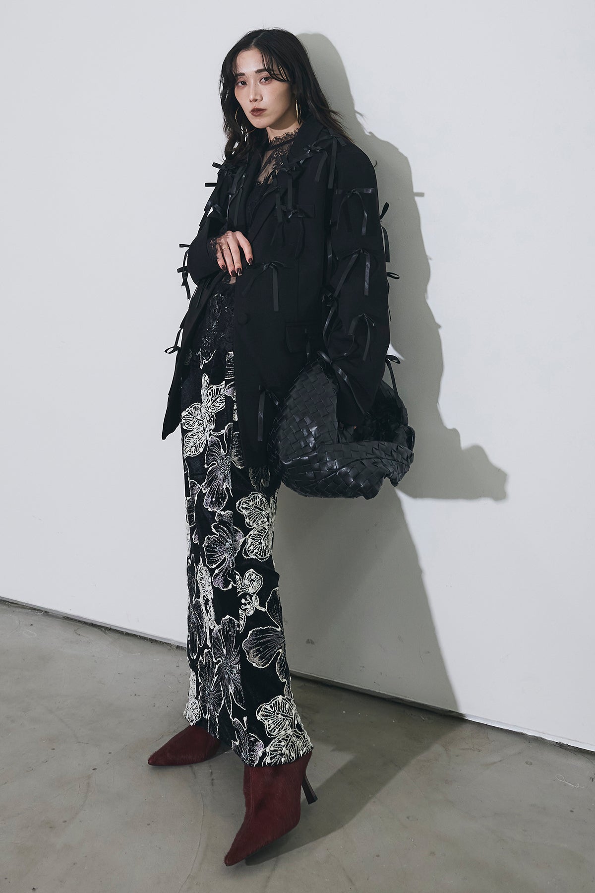 ご注文前に必ずページ下部「お届け期間」をご確認くださいませ。全体にあしらわれたリボンディテールが印象的なデザインジャケット。 柔らかい布テープで結ばれたリボンが立体感を生み、 モードな雰囲気の中にフェミニンなアクセントを添えます。 ゆったりとしたシルエットで抜け感がありながらも、 構築的なフォルムがスタイルを引き締めて見せる一着です。