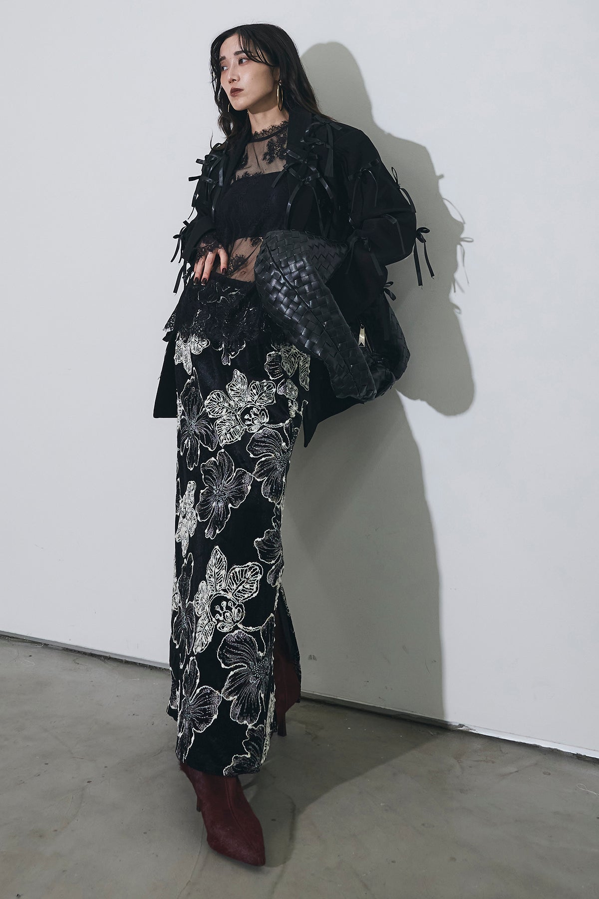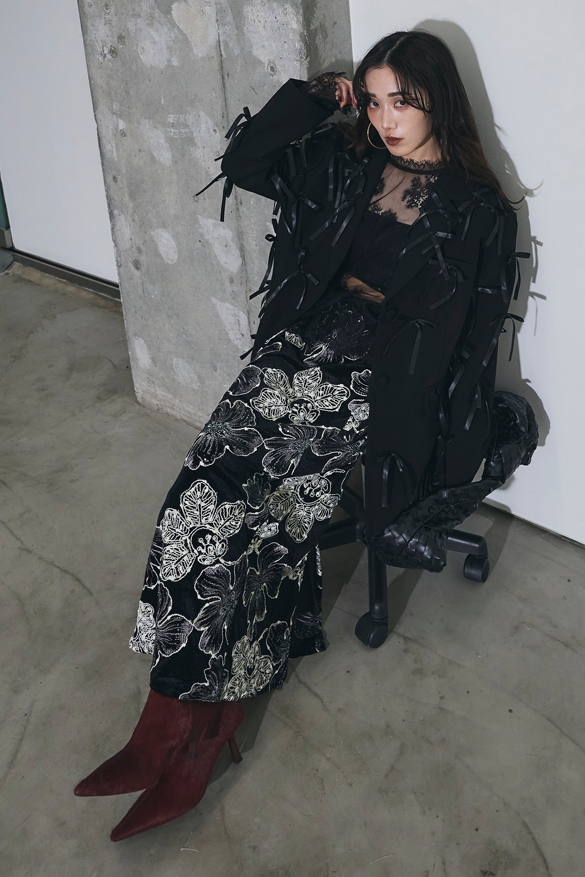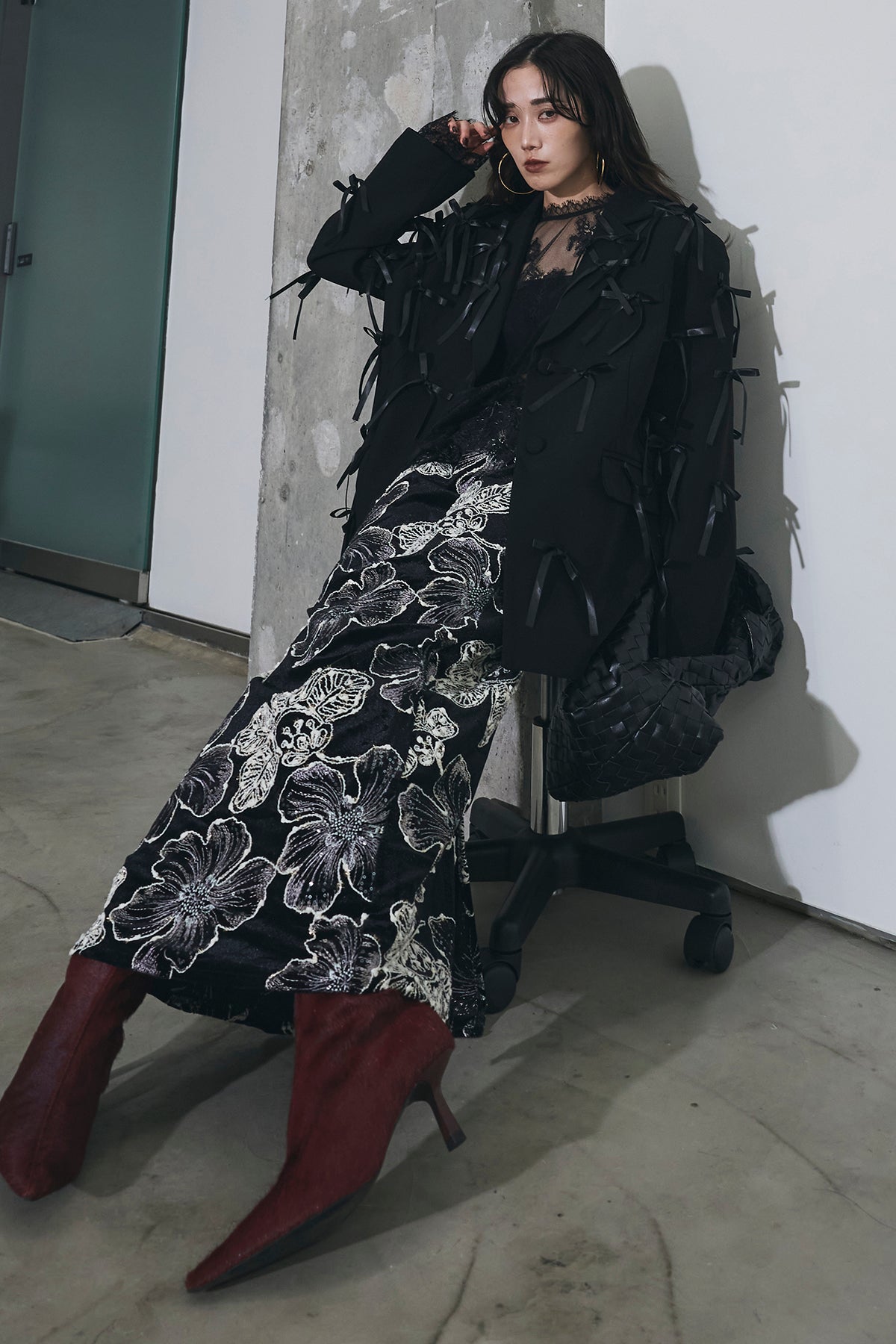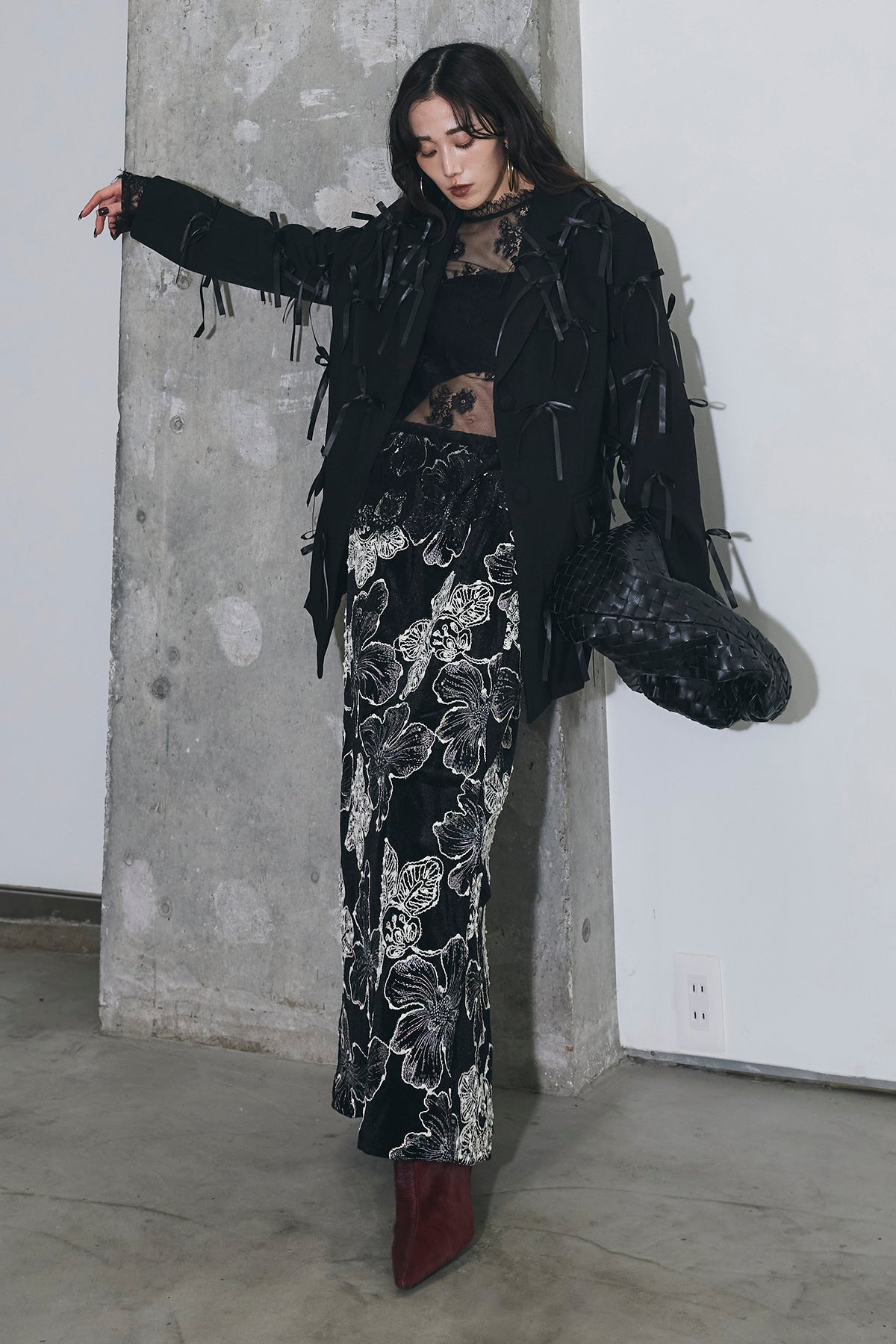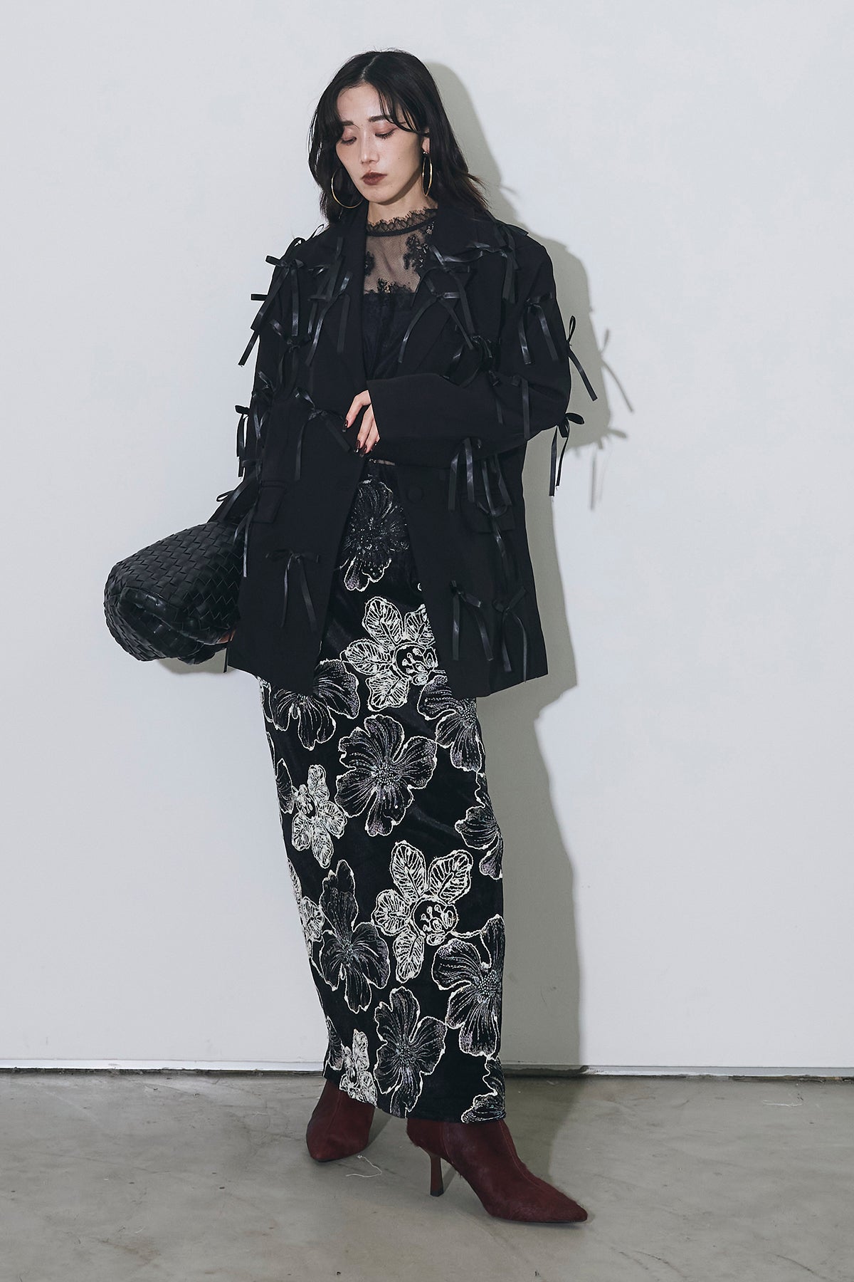 ご注文前に必ずページ下部「お届け期間」をご確認くださいませ。全体にあしらわれたリボンディテールが印象的なデザインジャケット。 柔らかい布テープで結ばれたリボンが立体感を生み、 モードな雰囲気の中にフェミニンなアクセントを添えます。 ゆったりとしたシルエットで抜け感がありながらも、 構築的なフォルムがスタイルを引き締めて見せる一着です。