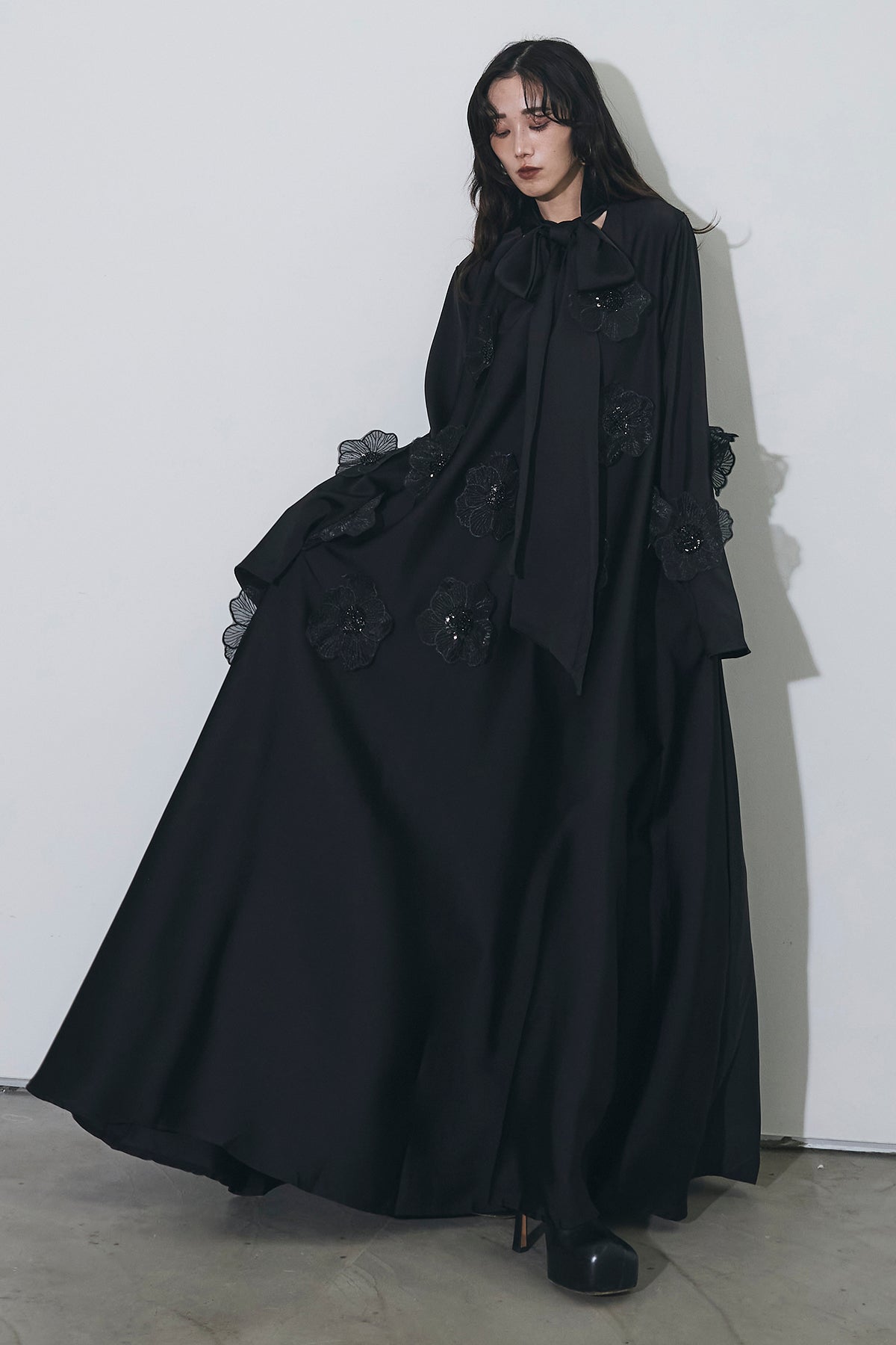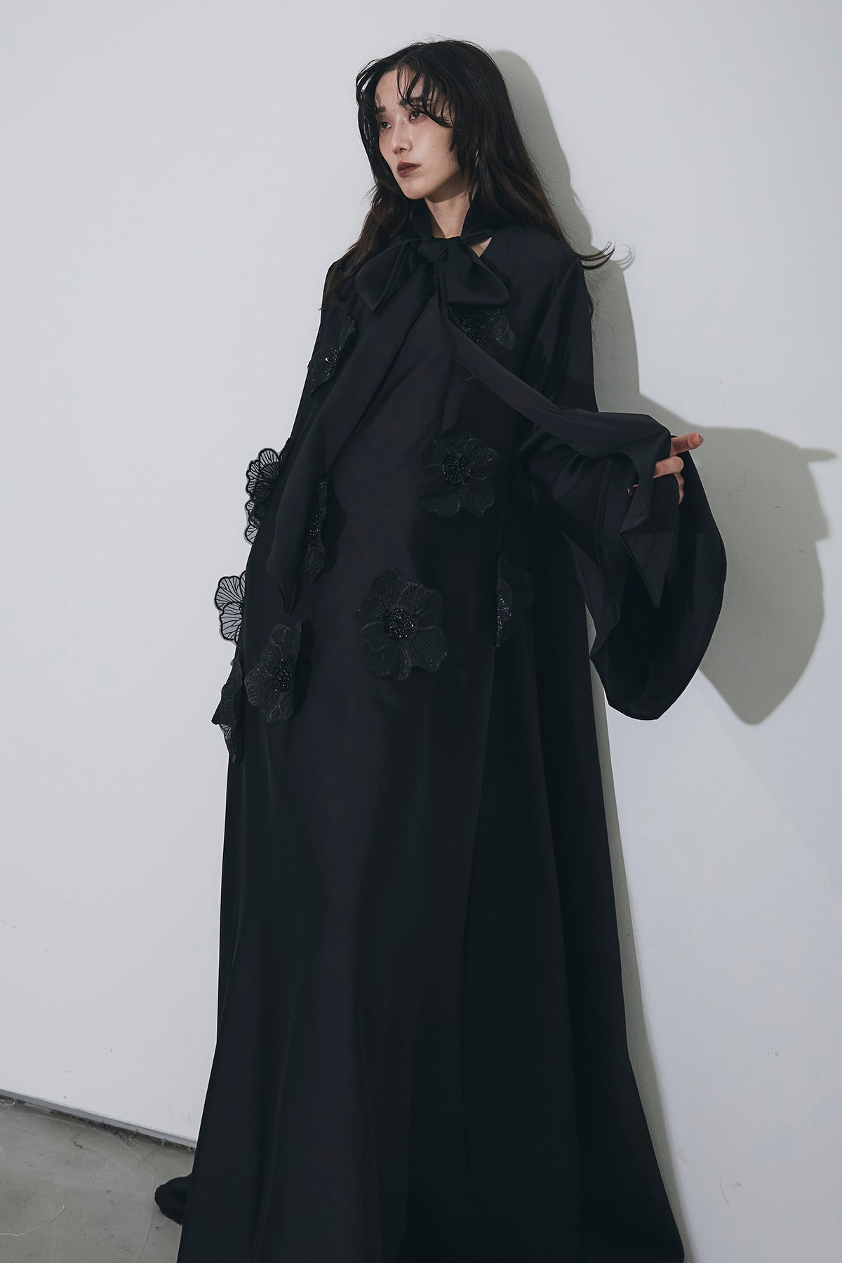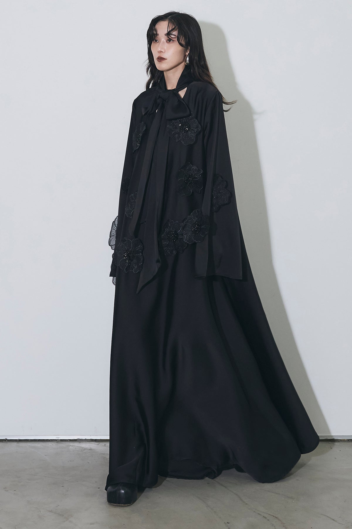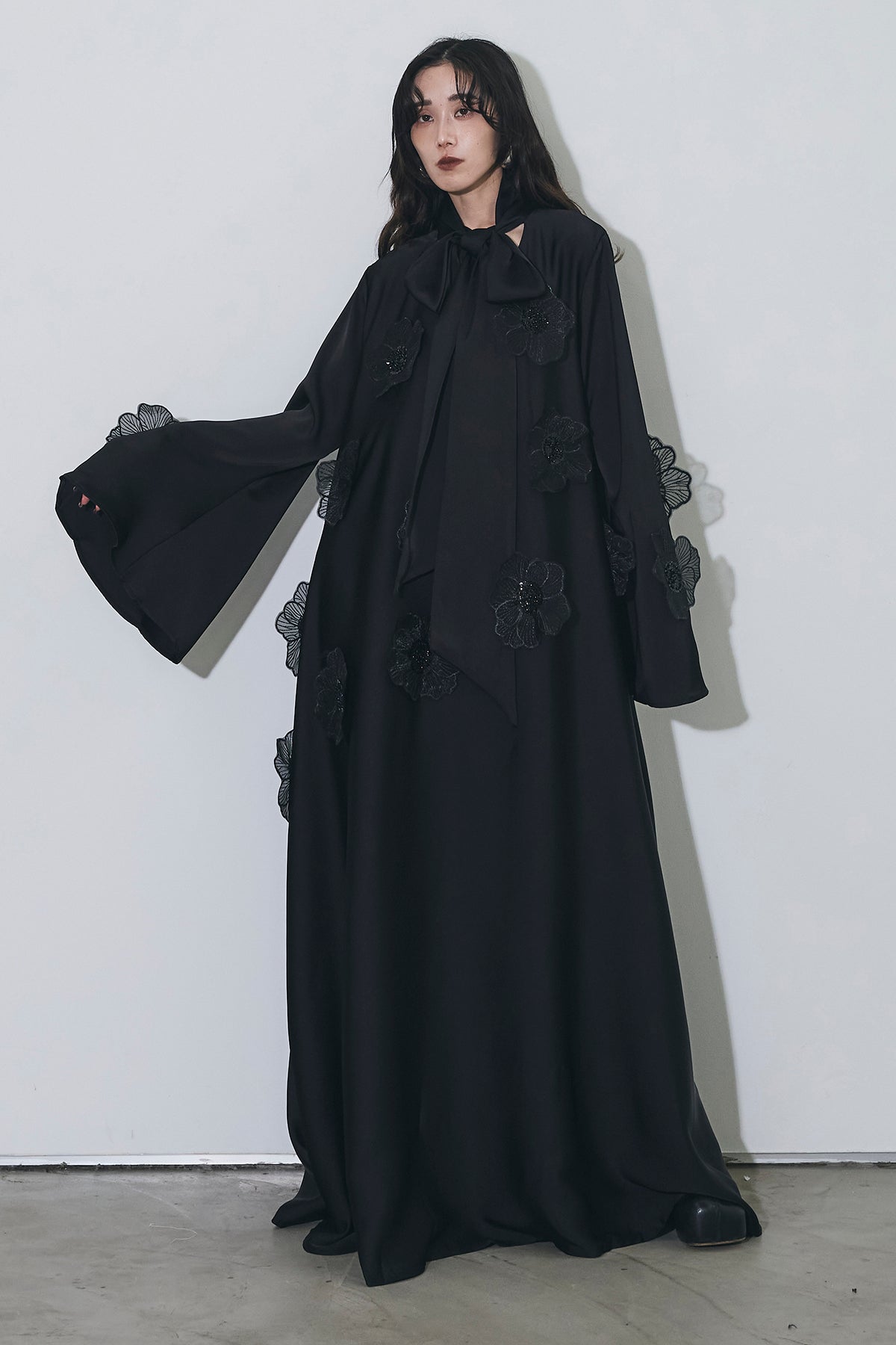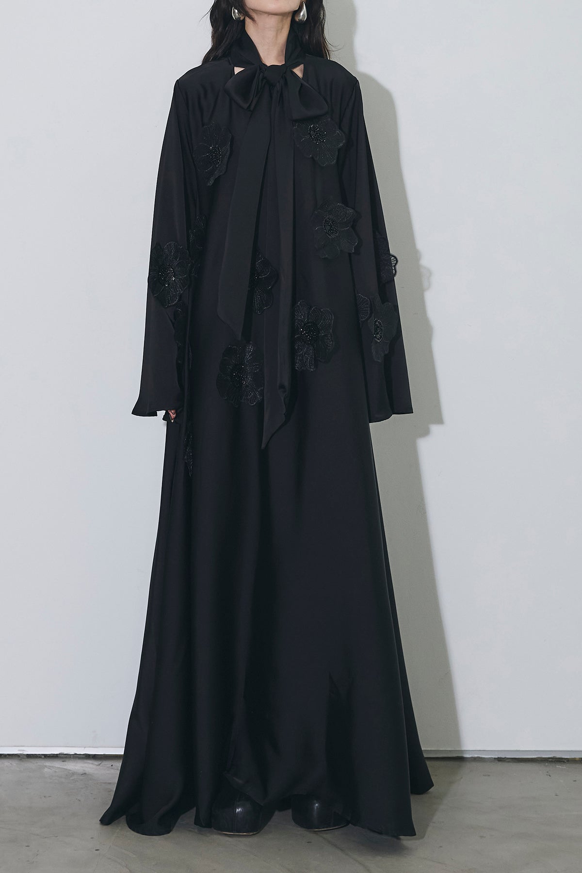 胸元のリボンタイと立体的なフラワーモチーフが印象的なロングワンピース。 ゆったりとしたシルエットとフレアに広がるスカートラインが、 動くたびにエレガントな揺らめきを生み出します。 繊細なモチーフが同色で施され、華やかさと落ち着きを兼ね備えた一着。 特別なシーンからデイリーまで、存在感を放ちながらも上品に着こなせます。