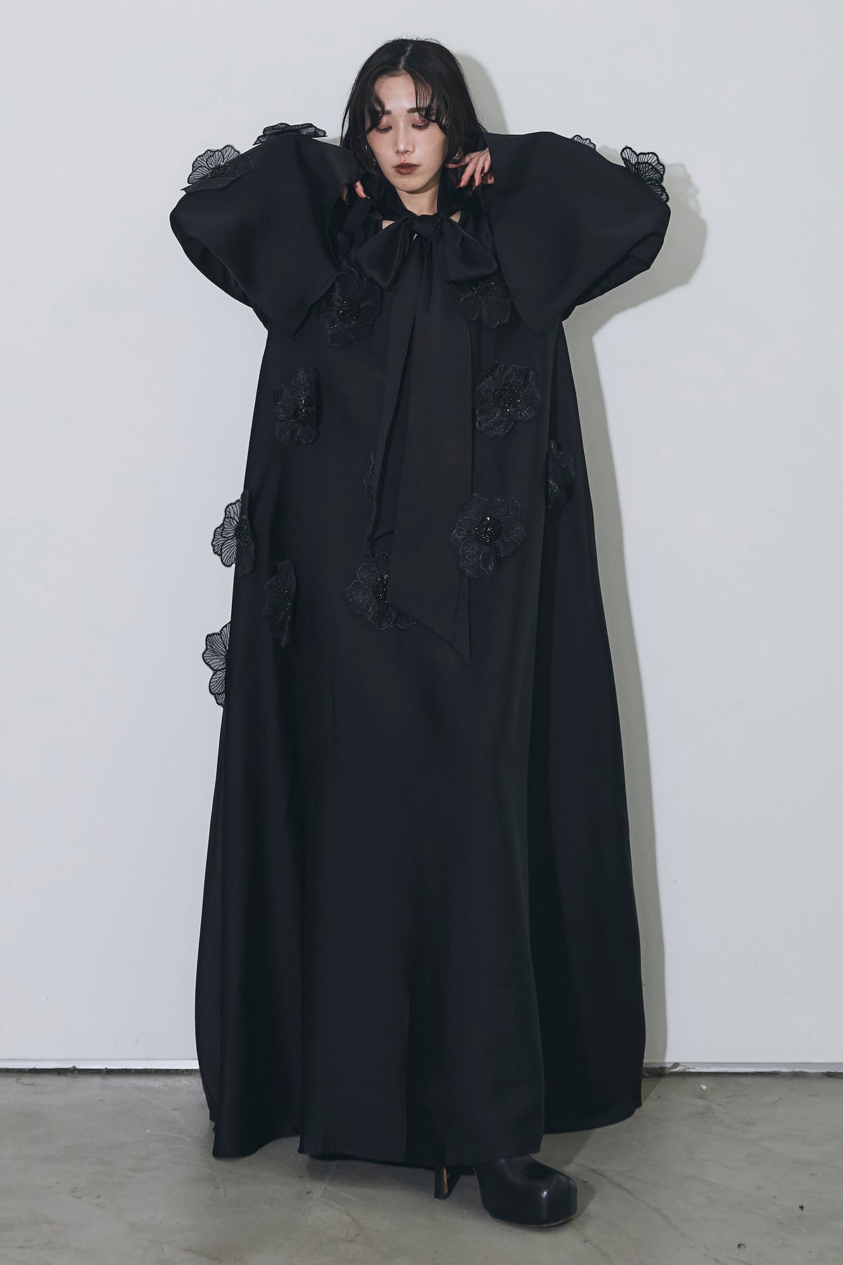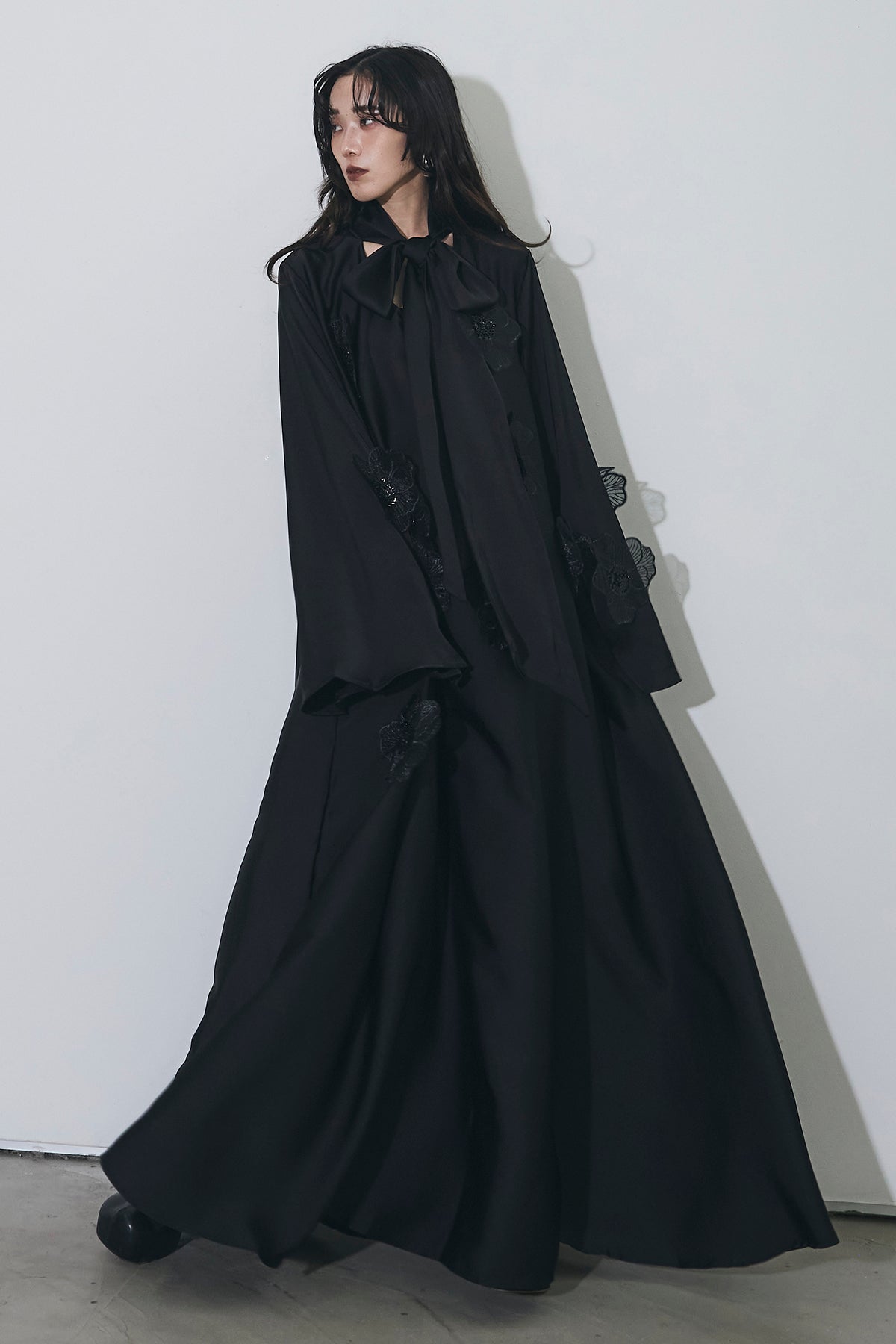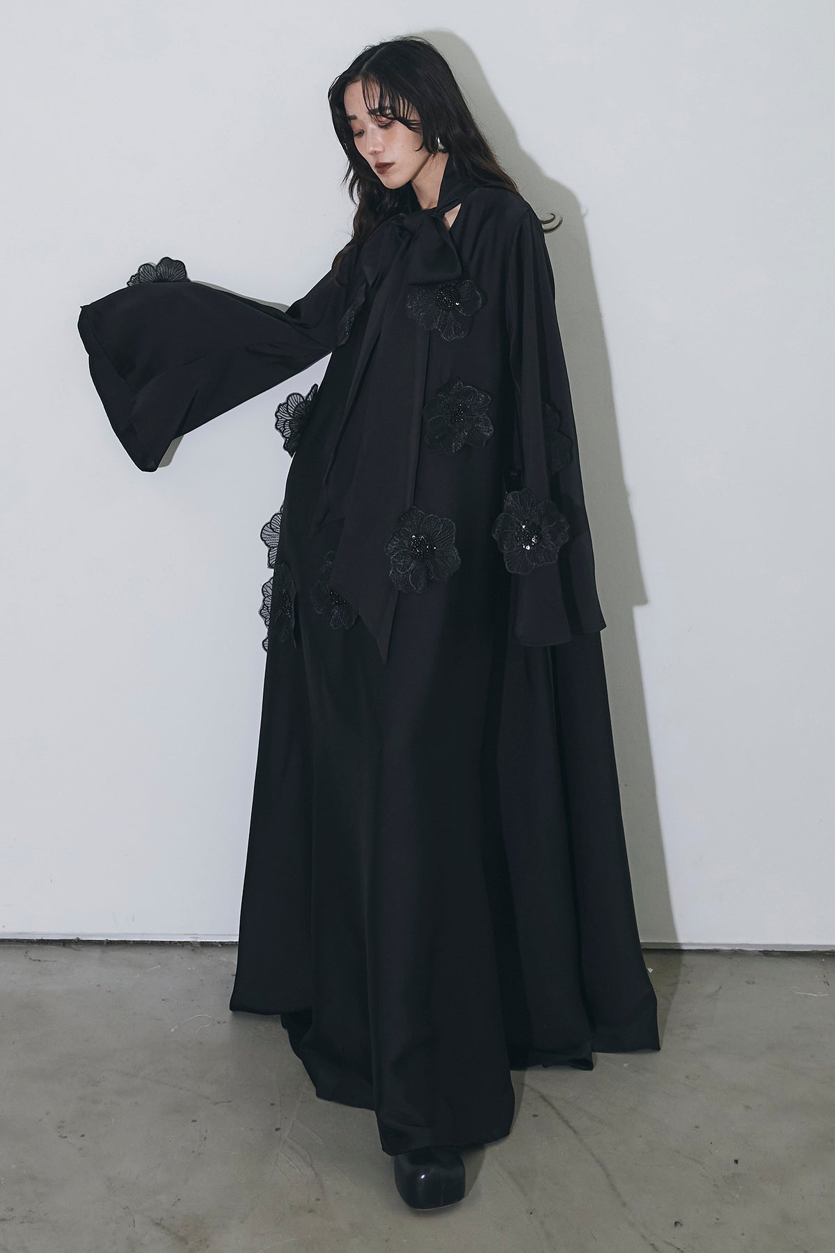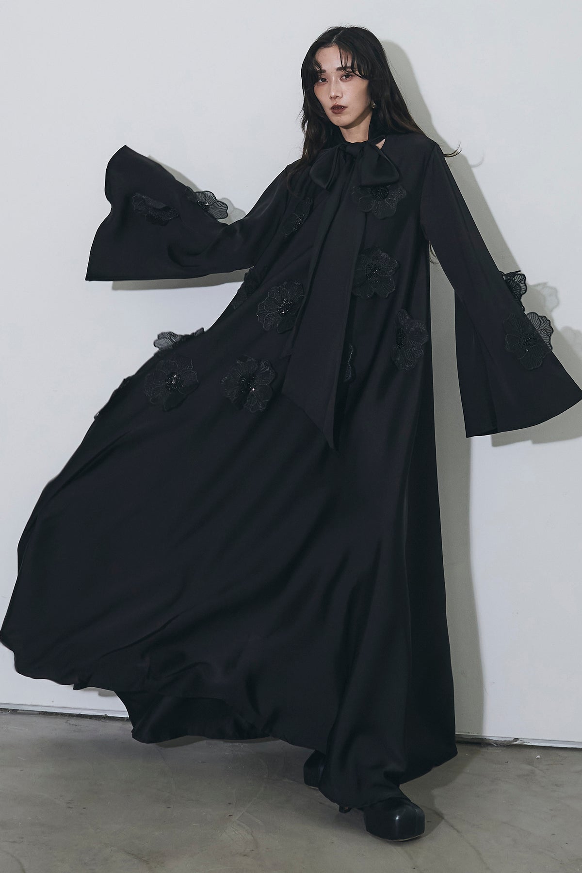 胸元のリボンタイと立体的なフラワーモチーフが印象的なロングワンピース。 ゆったりとしたシルエットとフレアに広がるスカートラインが、 動くたびにエレガントな揺らめきを生み出します。 繊細なモチーフが同色で施され、華やかさと落ち着きを兼ね備えた一着。 特別なシーンからデイリーまで、存在感を放ちながらも上品に着こなせます。