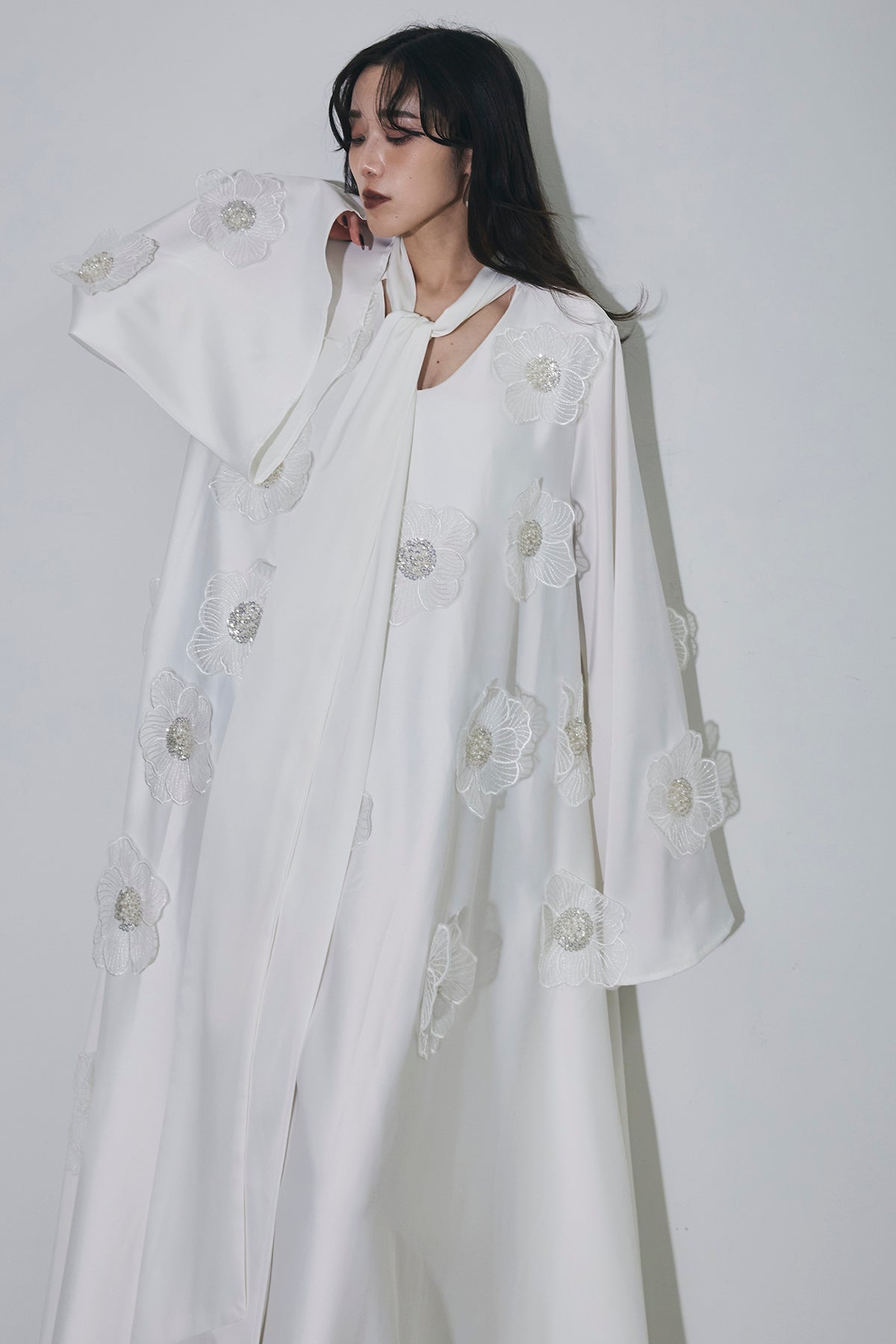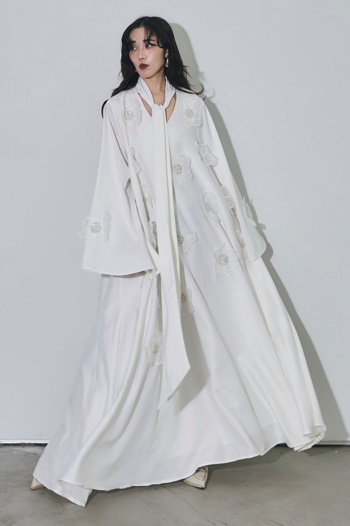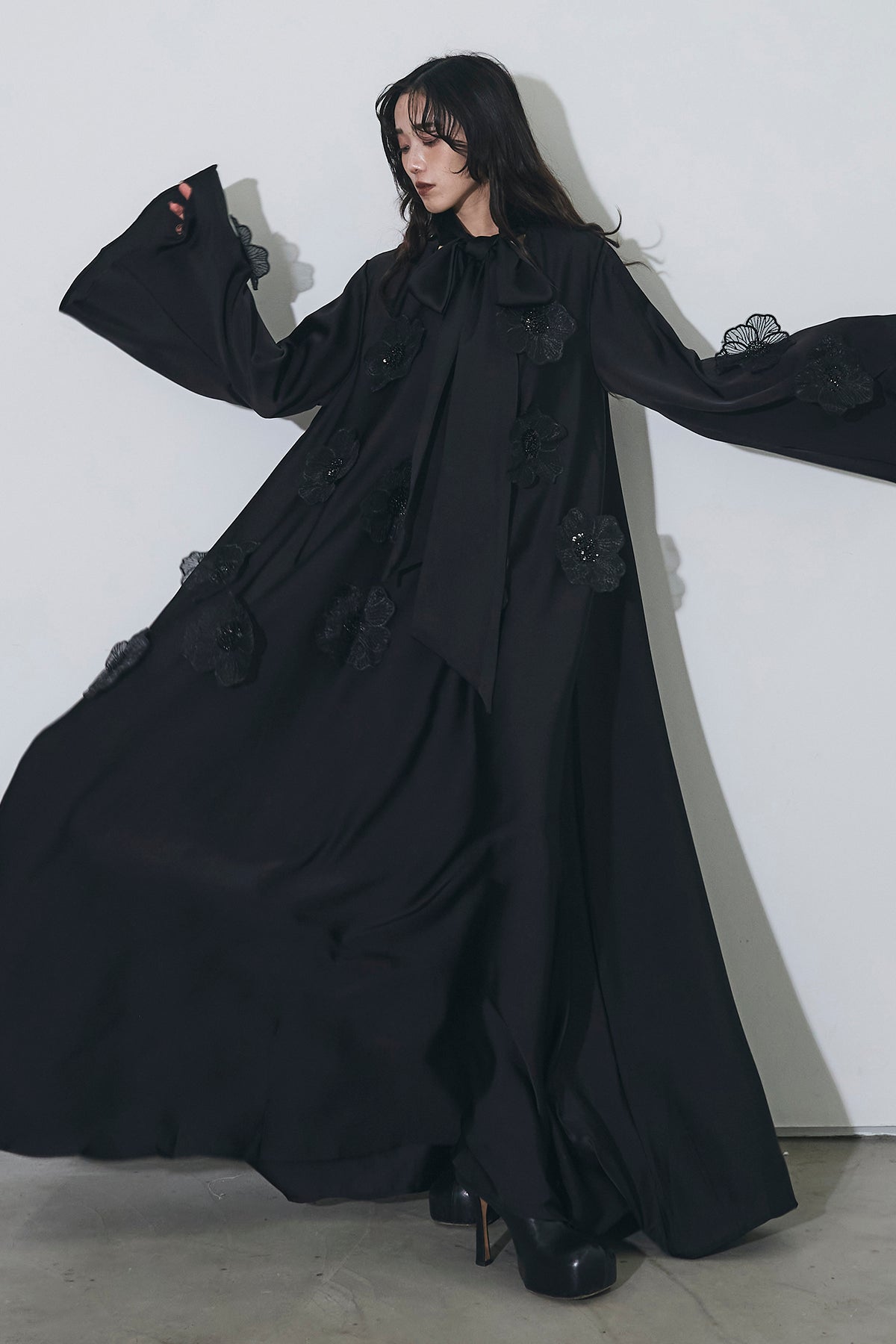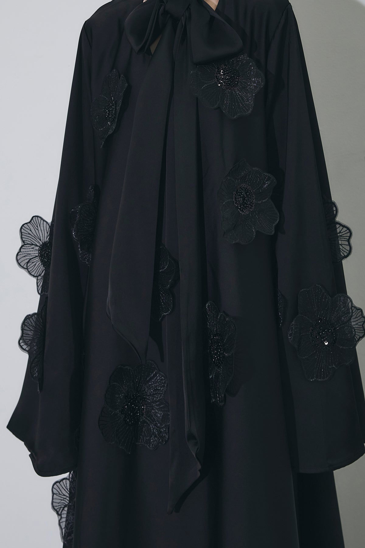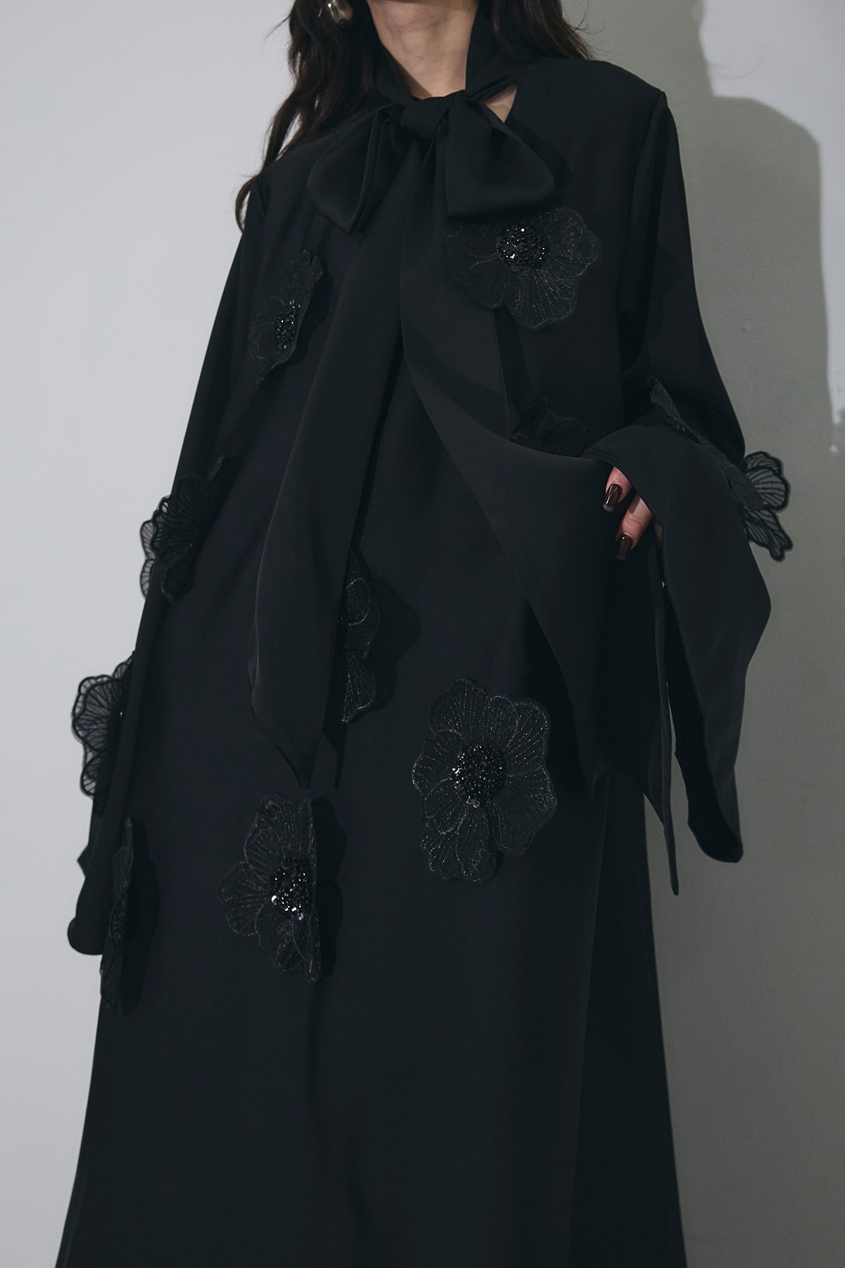 胸元のリボンタイと立体的なフラワーモチーフが印象的なロングワンピース。 ゆったりとしたシルエットとフレアに広がるスカートラインが、 動くたびにエレガントな揺らめきを生み出します。 繊細なモチーフが同色で施され、華やかさと落ち着きを兼ね備えた一着。 特別なシーンからデイリーまで、存在感を放ちながらも上品に着こなせます。
