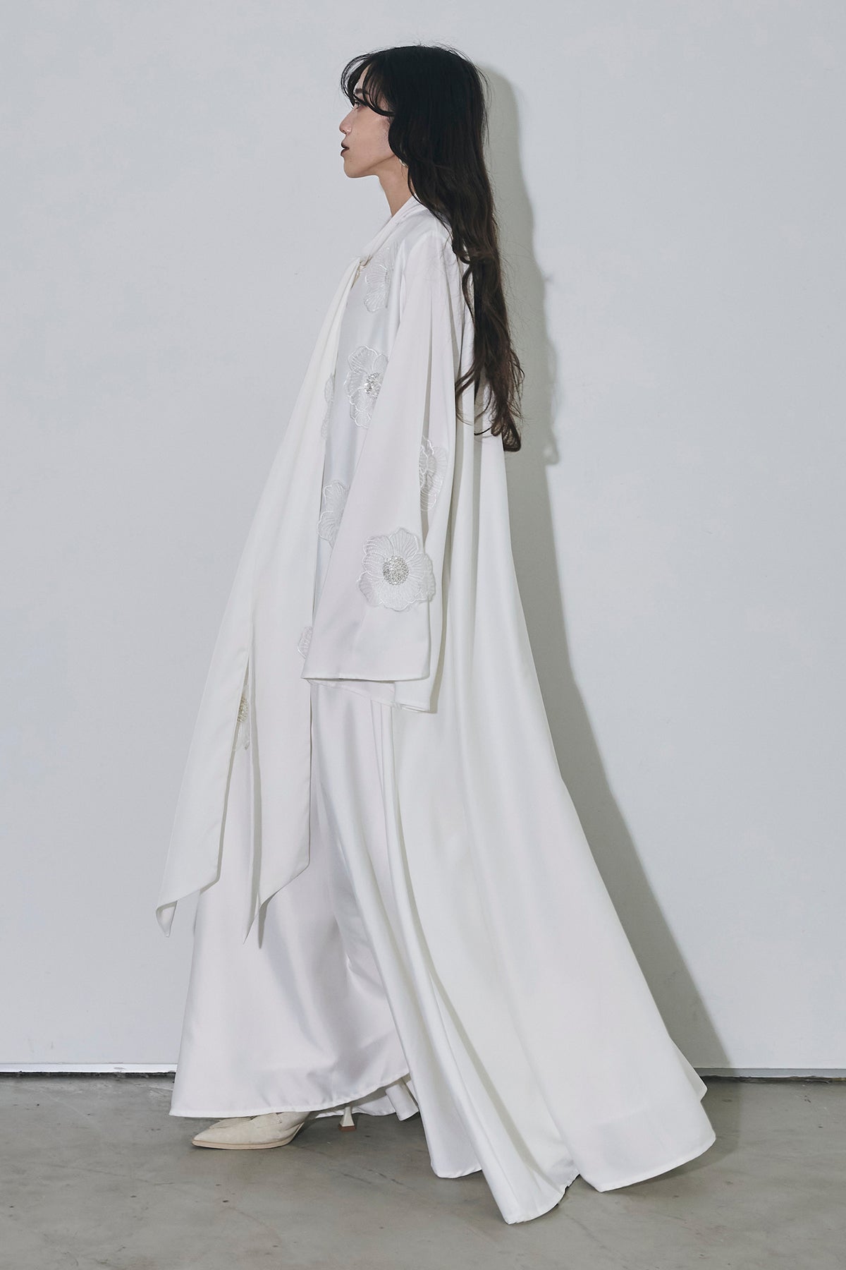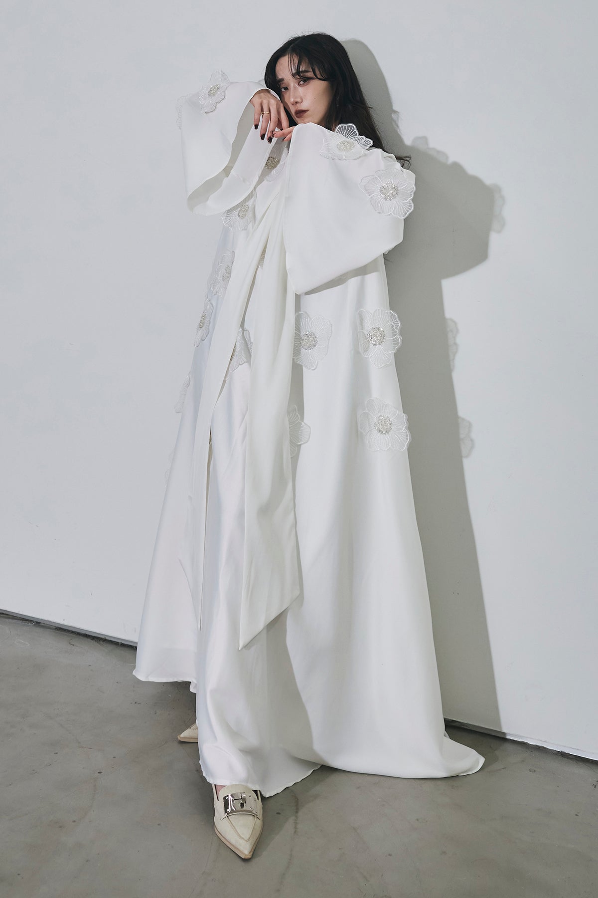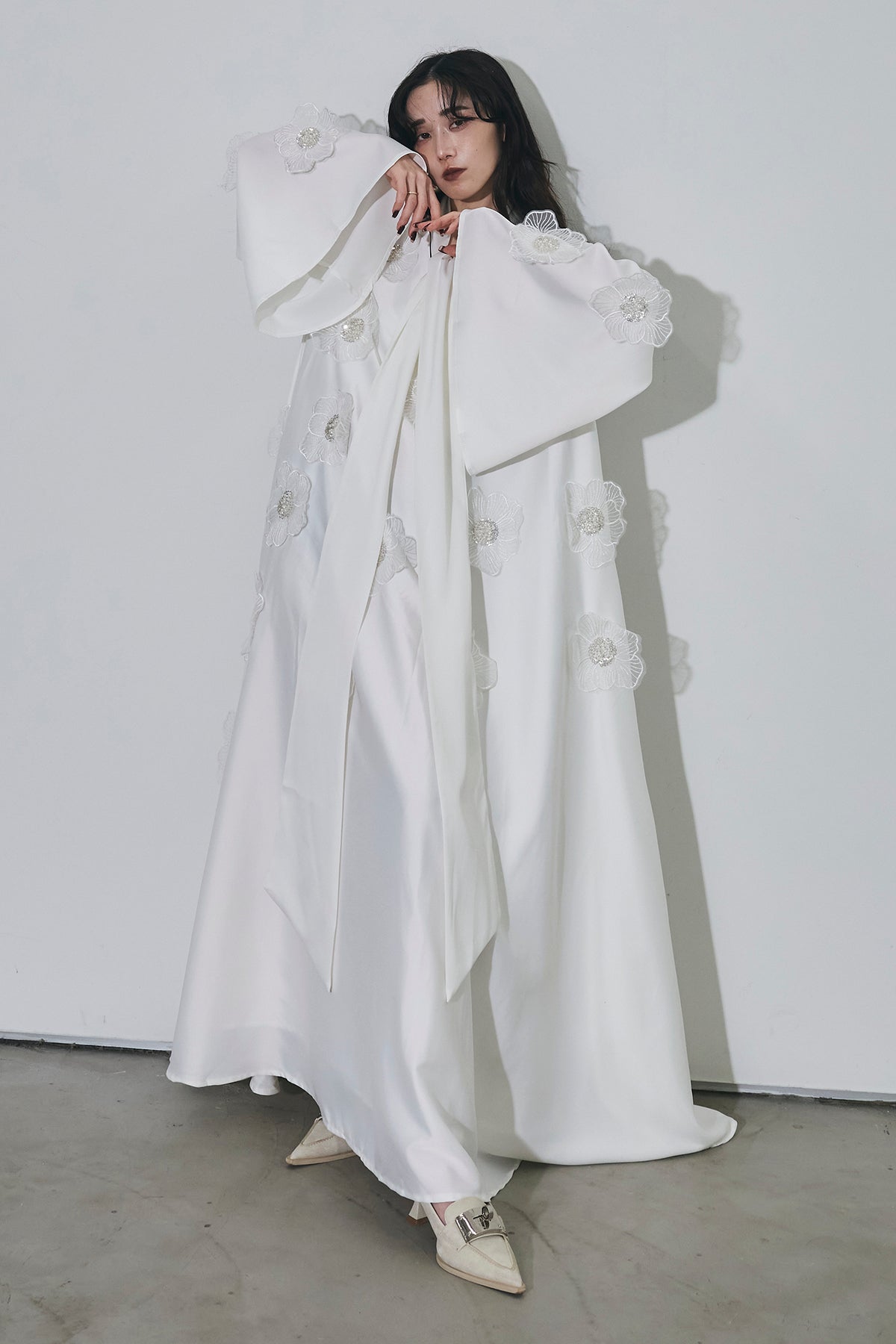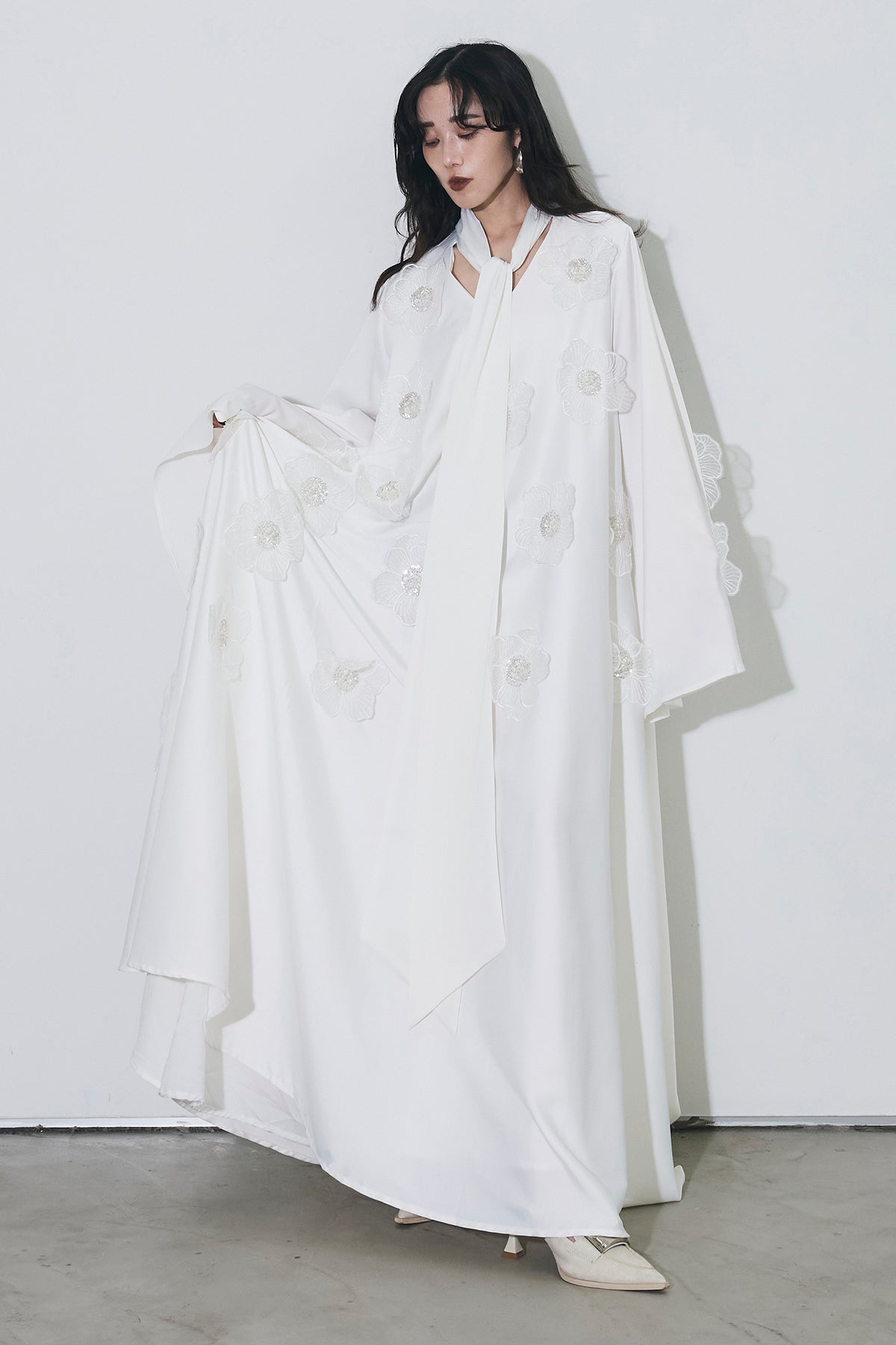 胸元のリボンタイと立体的なフラワーモチーフが印象的なロングワンピース。 ゆったりとしたシルエットとフレアに広がるスカートラインが、 動くたびにエレガントな揺らめきを生み出します。 繊細なモチーフが同色で施され、華やかさと落ち着きを兼ね備えた一着。 特別なシーンからデイリーまで、存在感を放ちながらも上品に着こなせます。