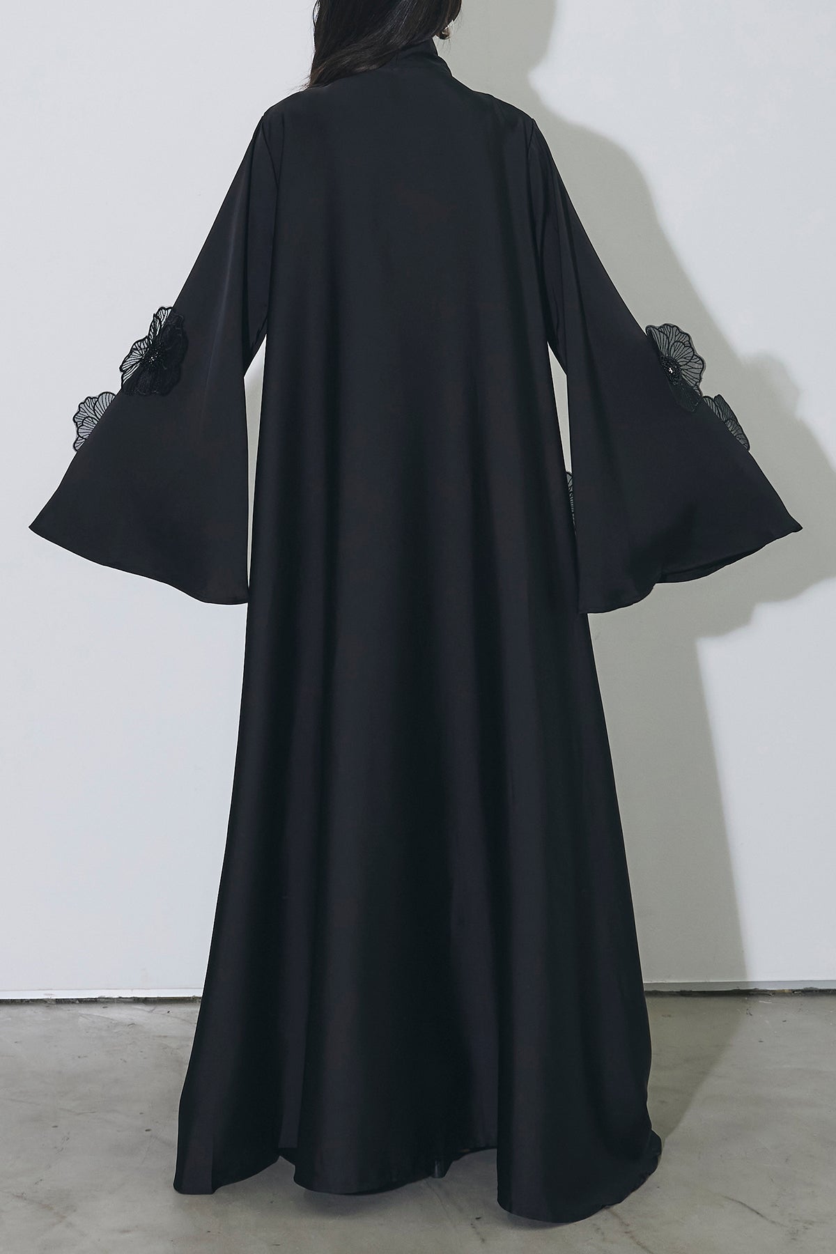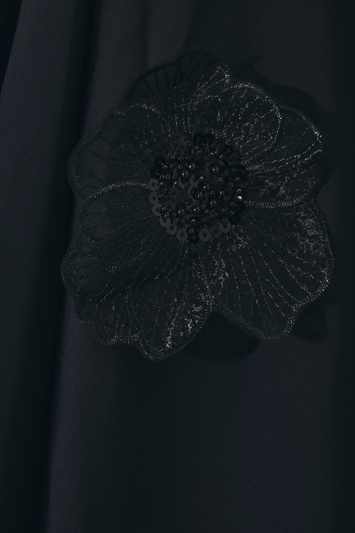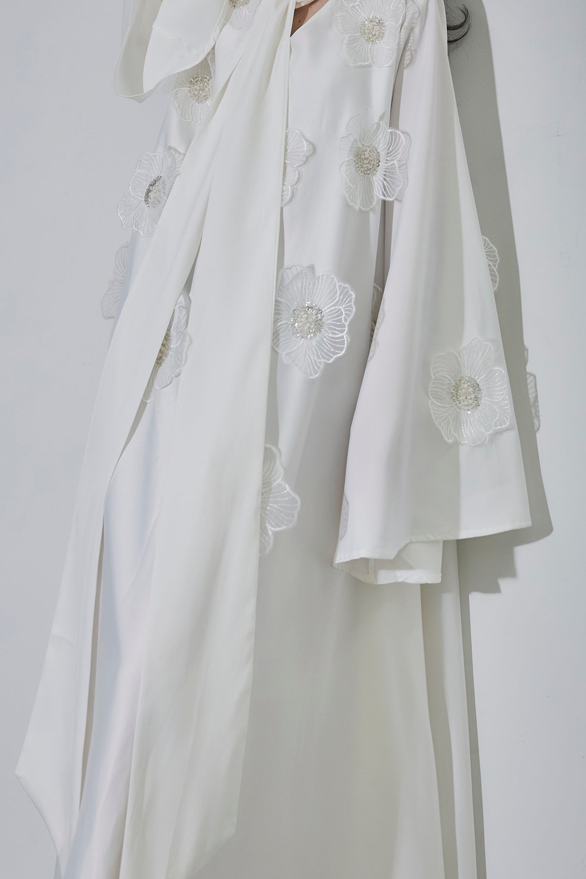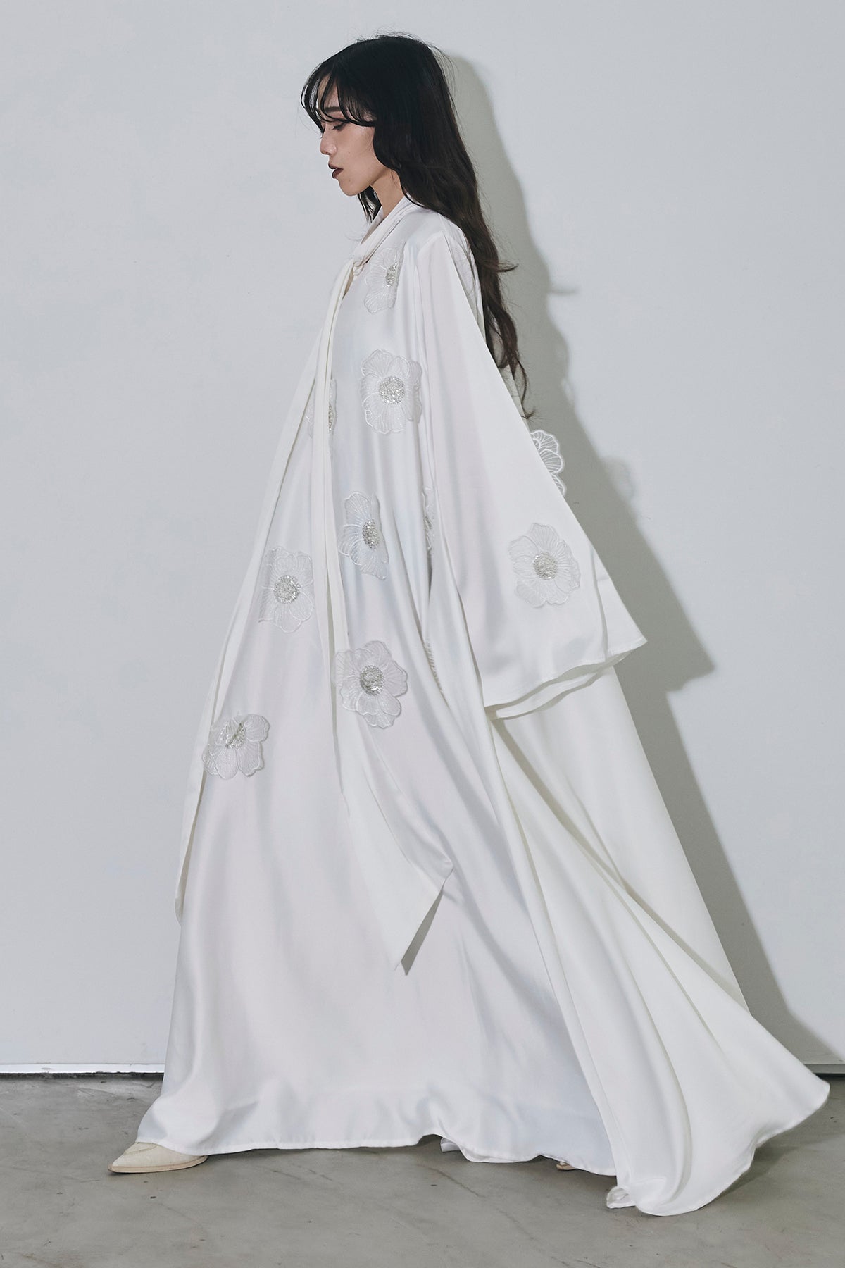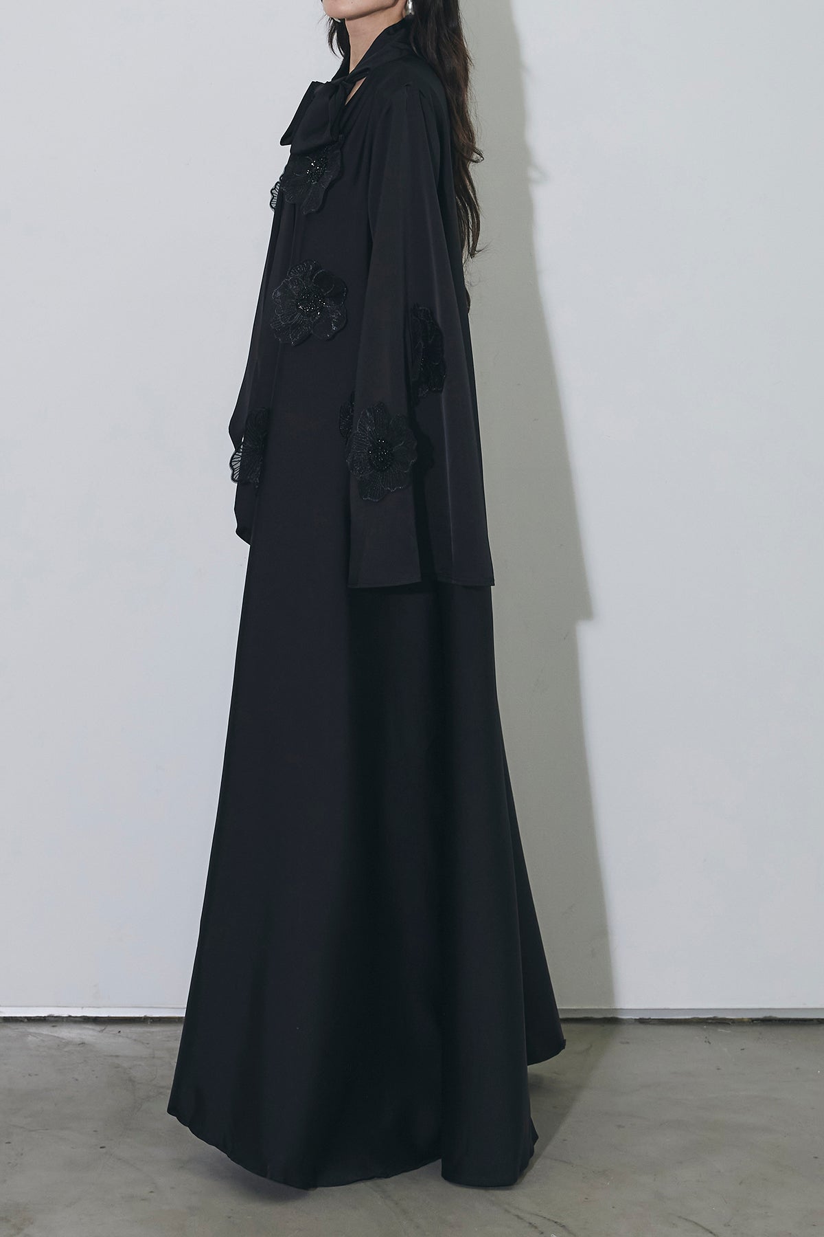胸元のリボンタイと立体的なフラワーモチーフが印象的なロングワンピース。 ゆったりとしたシルエットとフレアに広がるスカートラインが、 動くたびにエレガントな揺らめきを生み出します。 繊細なモチーフが同色で施され、華やかさと落ち着きを兼ね備えた一着。 特別なシーンからデイリーまで、存在感を放ちながらも上品に着こなせます。