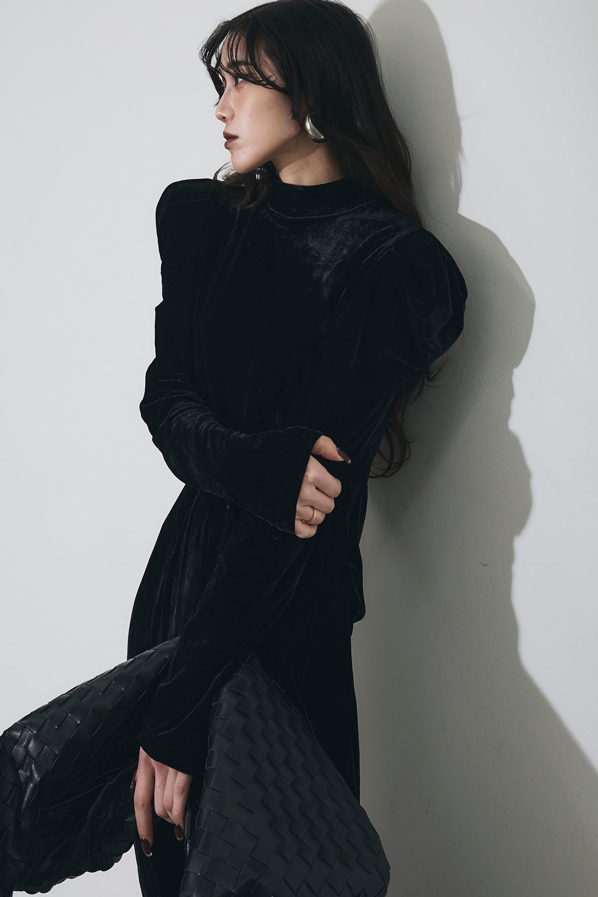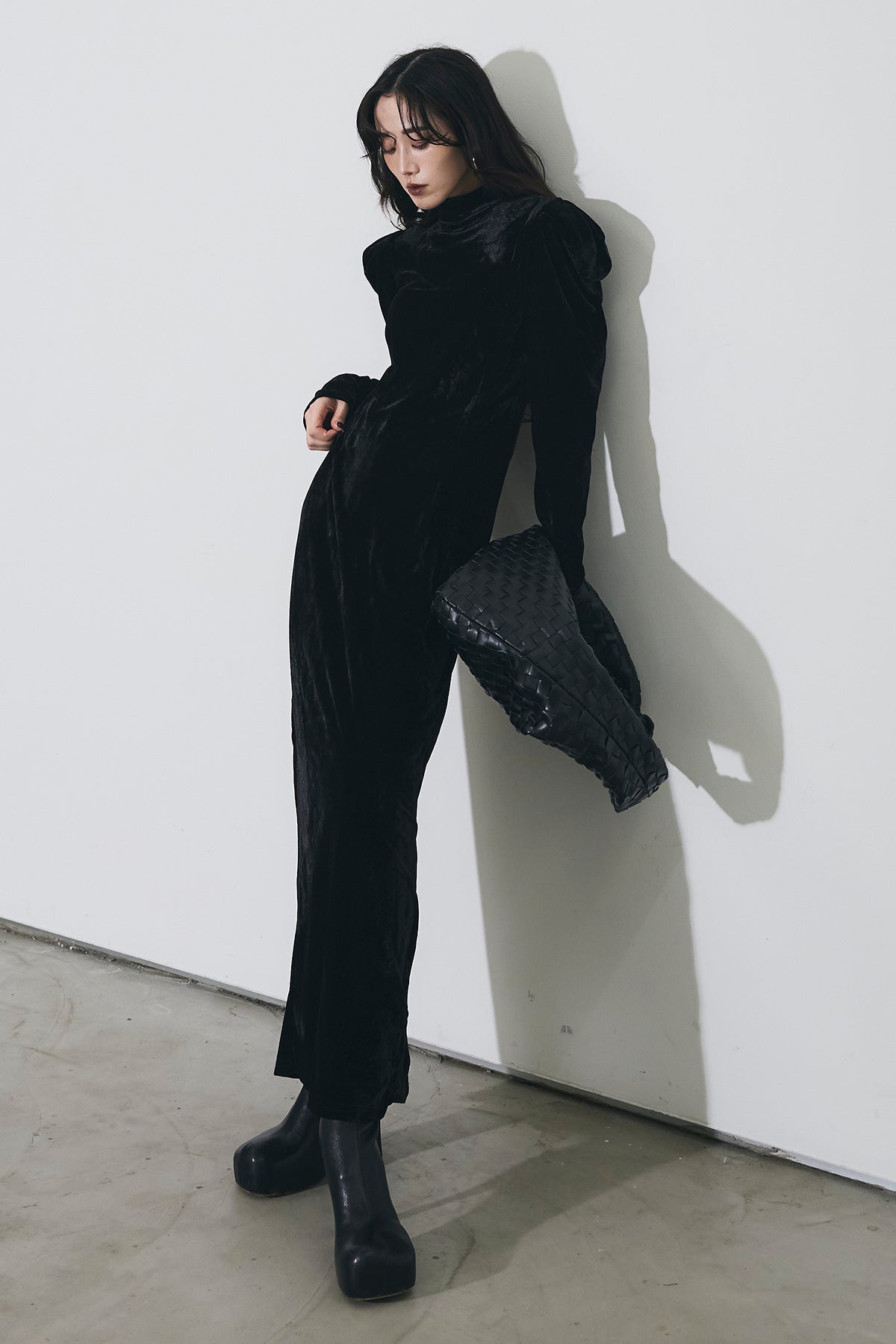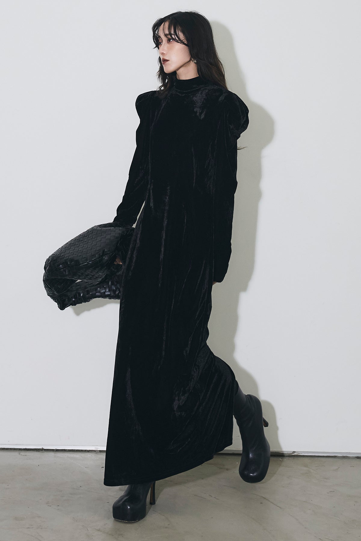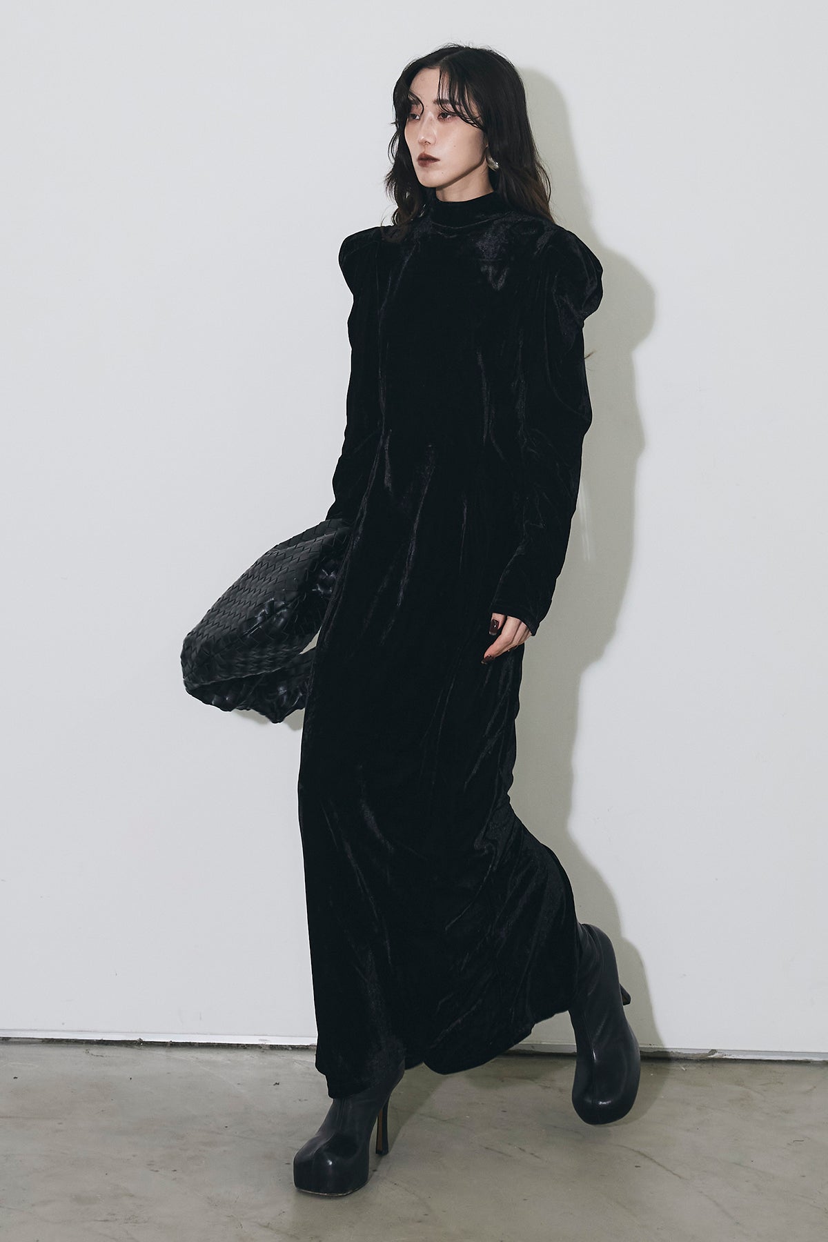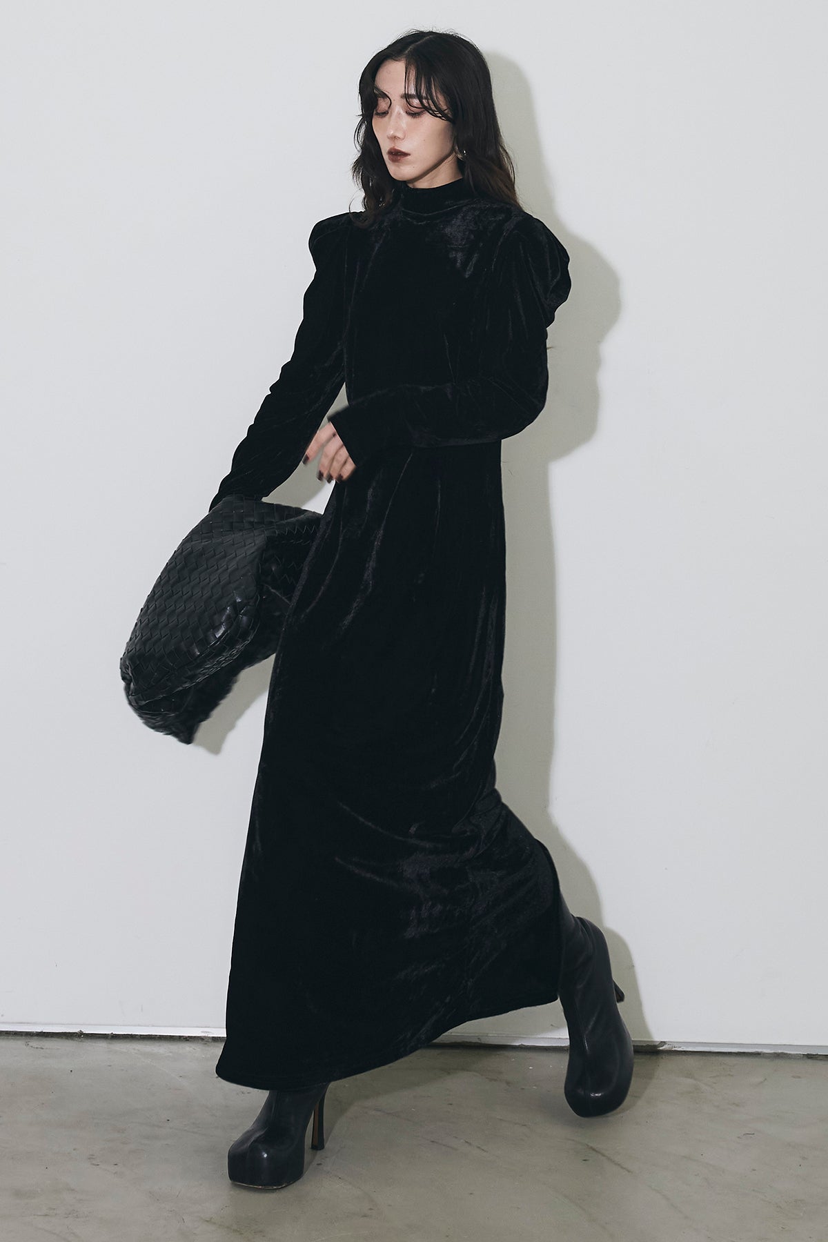 深みのある光沢が美しいベルベット素材を使用したロングワンピース。 立体的なショルダーデザインが特徴で、構築的なシルエットがモードな印象を与えます。 身体に沿う柔らかな素材感と落ち感のあるラインがエレガントさを演出。 フォーマルなシーンから特別な日の装いまで活躍する上品な一着。