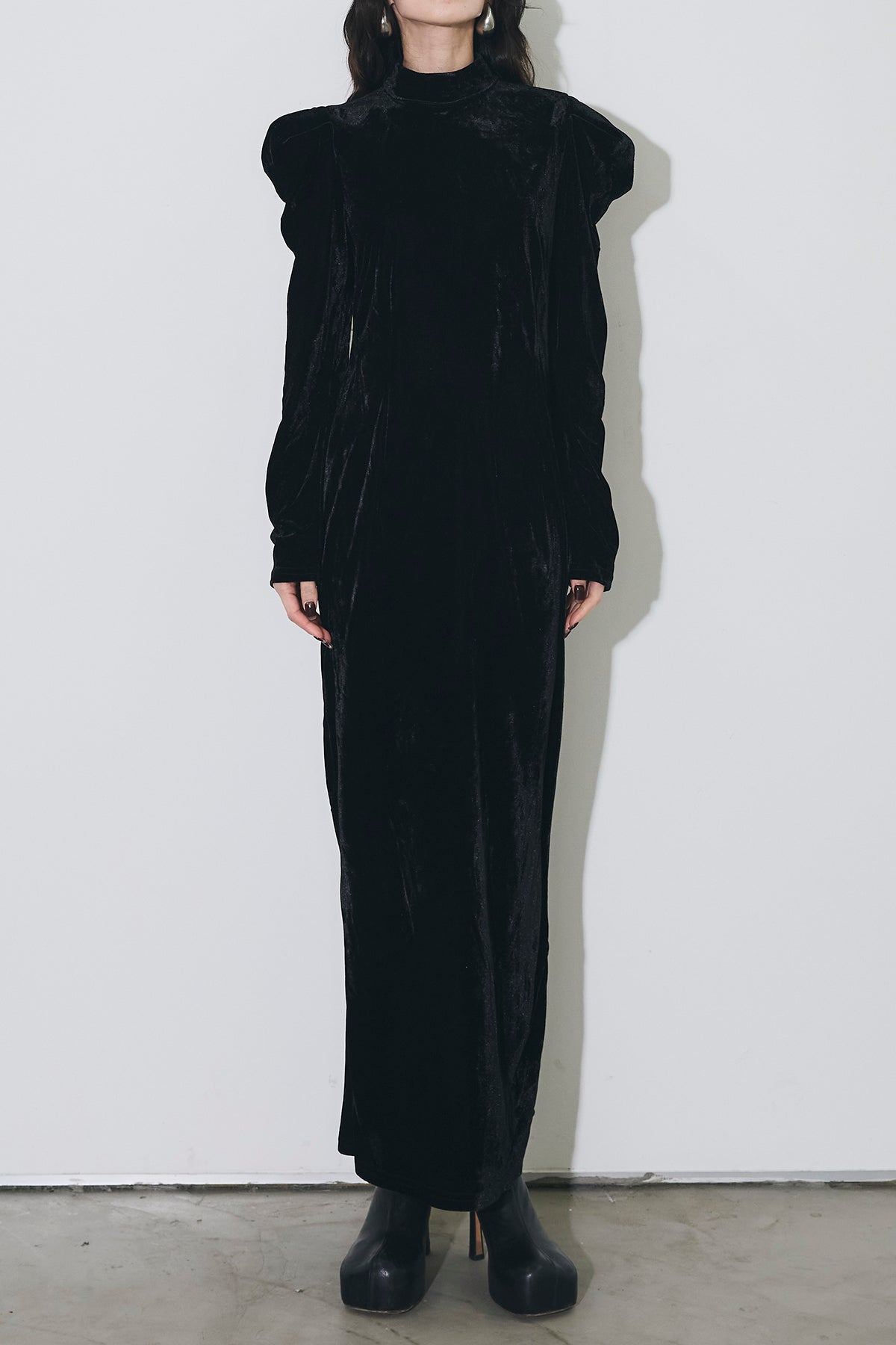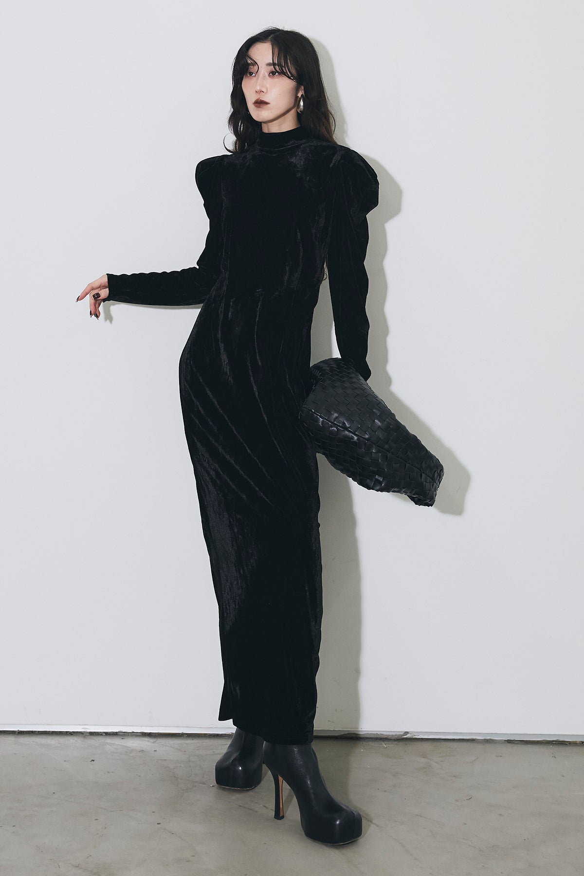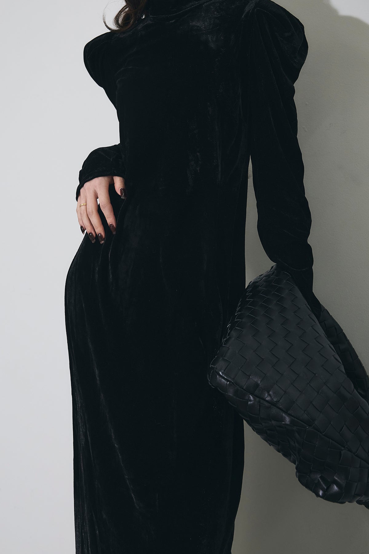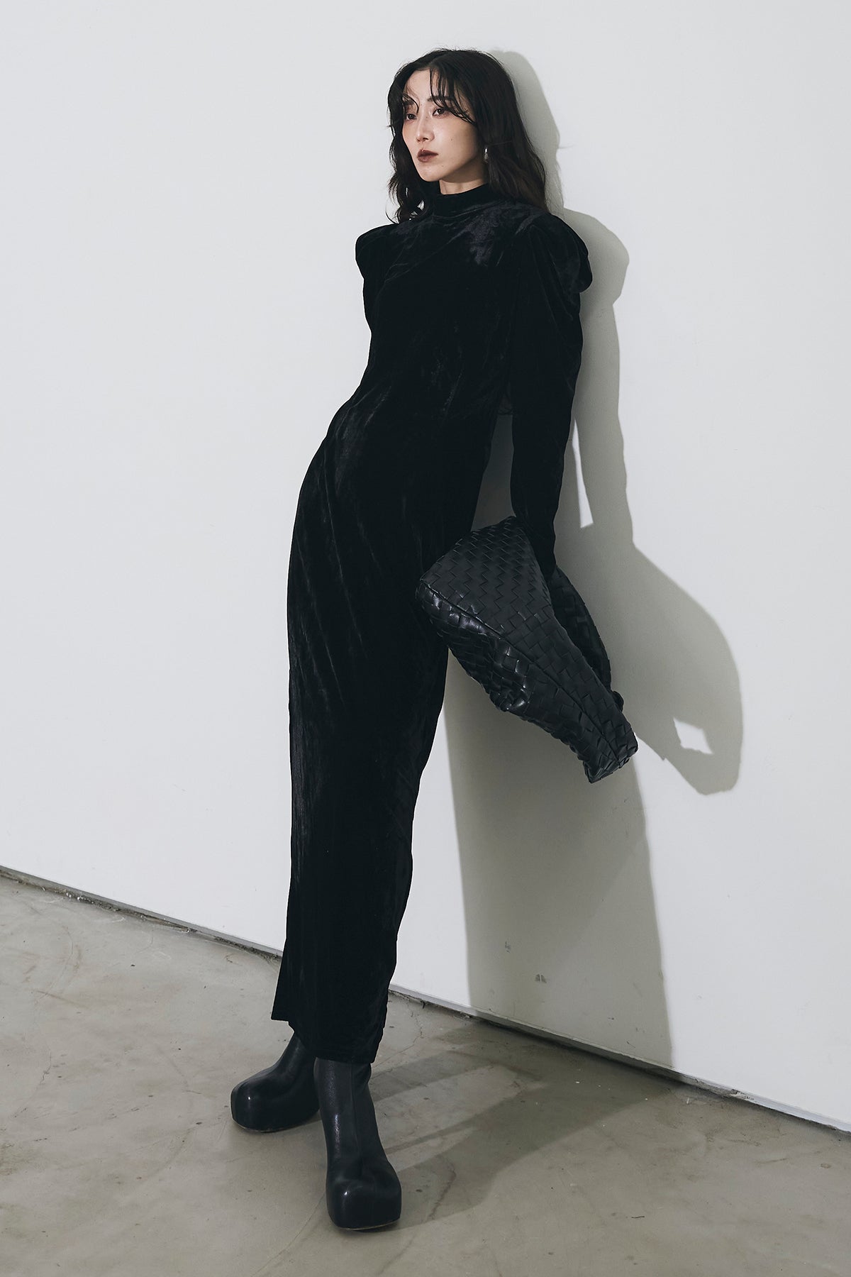 深みのある光沢が美しいベルベット素材を使用したロングワンピース。 立体的なショルダーデザインが特徴で、構築的なシルエットがモードな印象を与えます。 身体に沿う柔らかな素材感と落ち感のあるラインがエレガントさを演出。 フォーマルなシーンから特別な日の装いまで活躍する上品な一着。