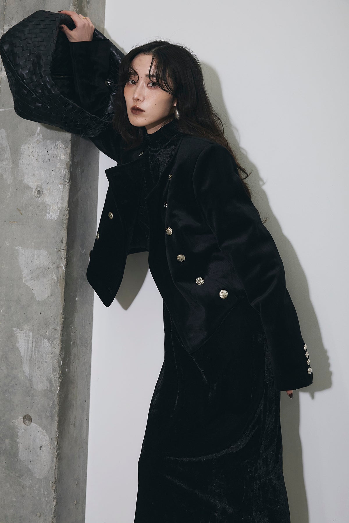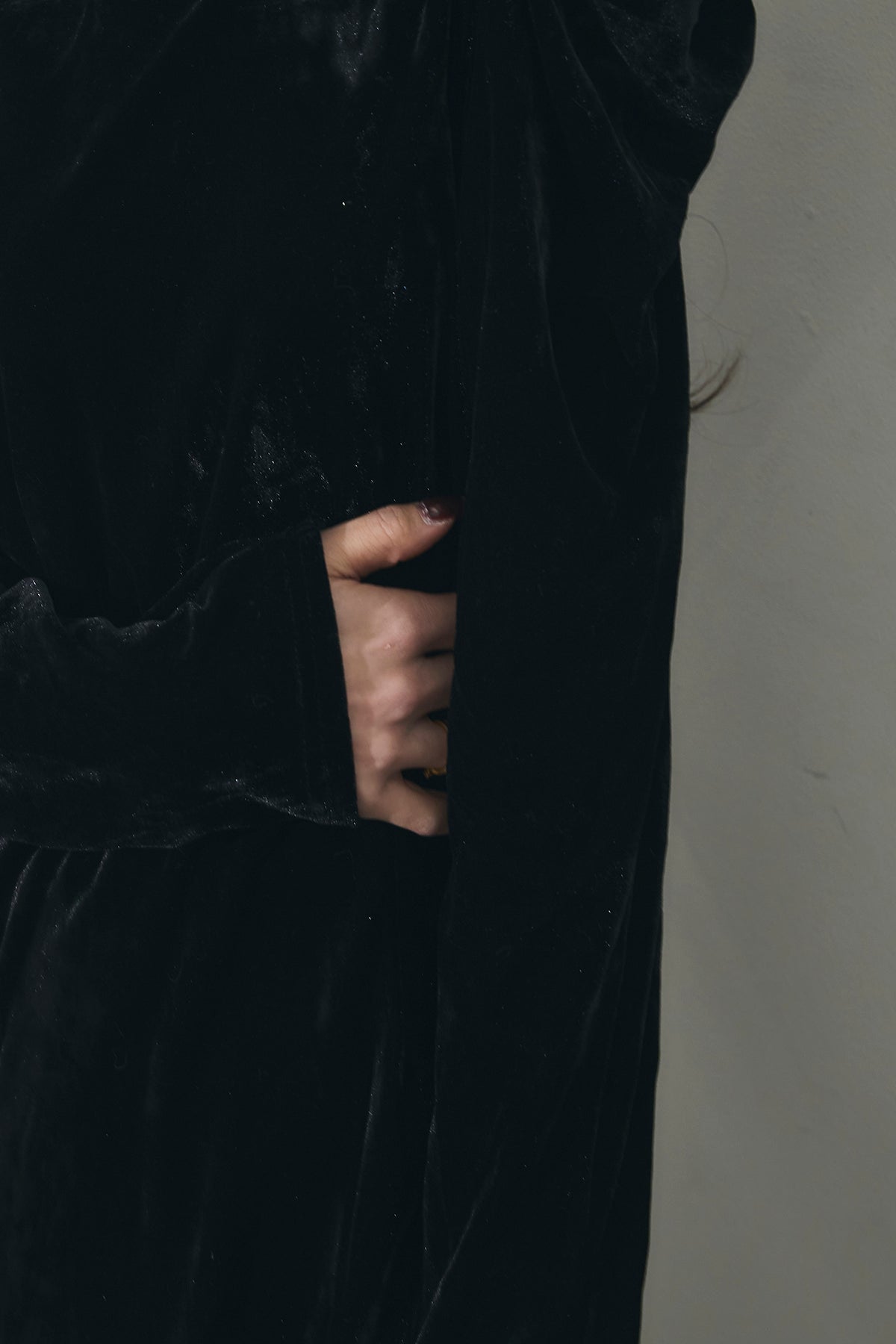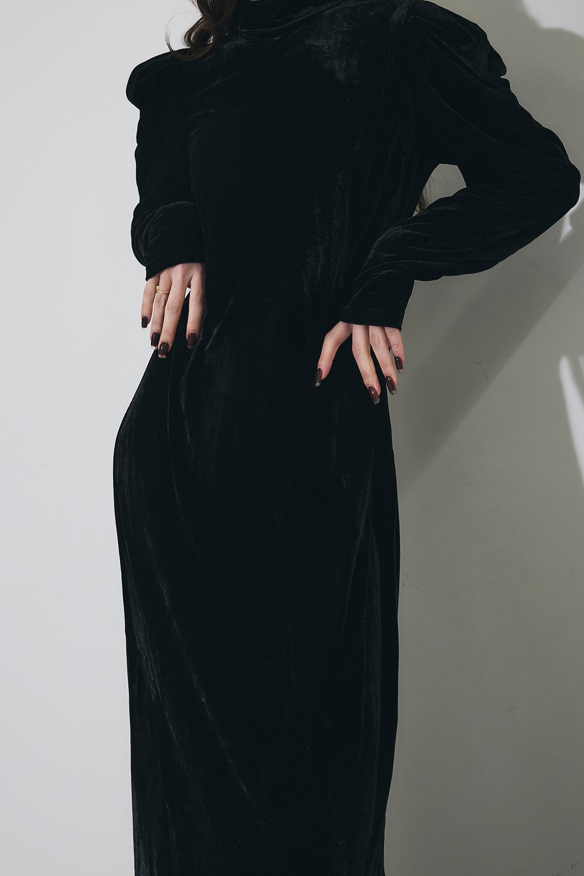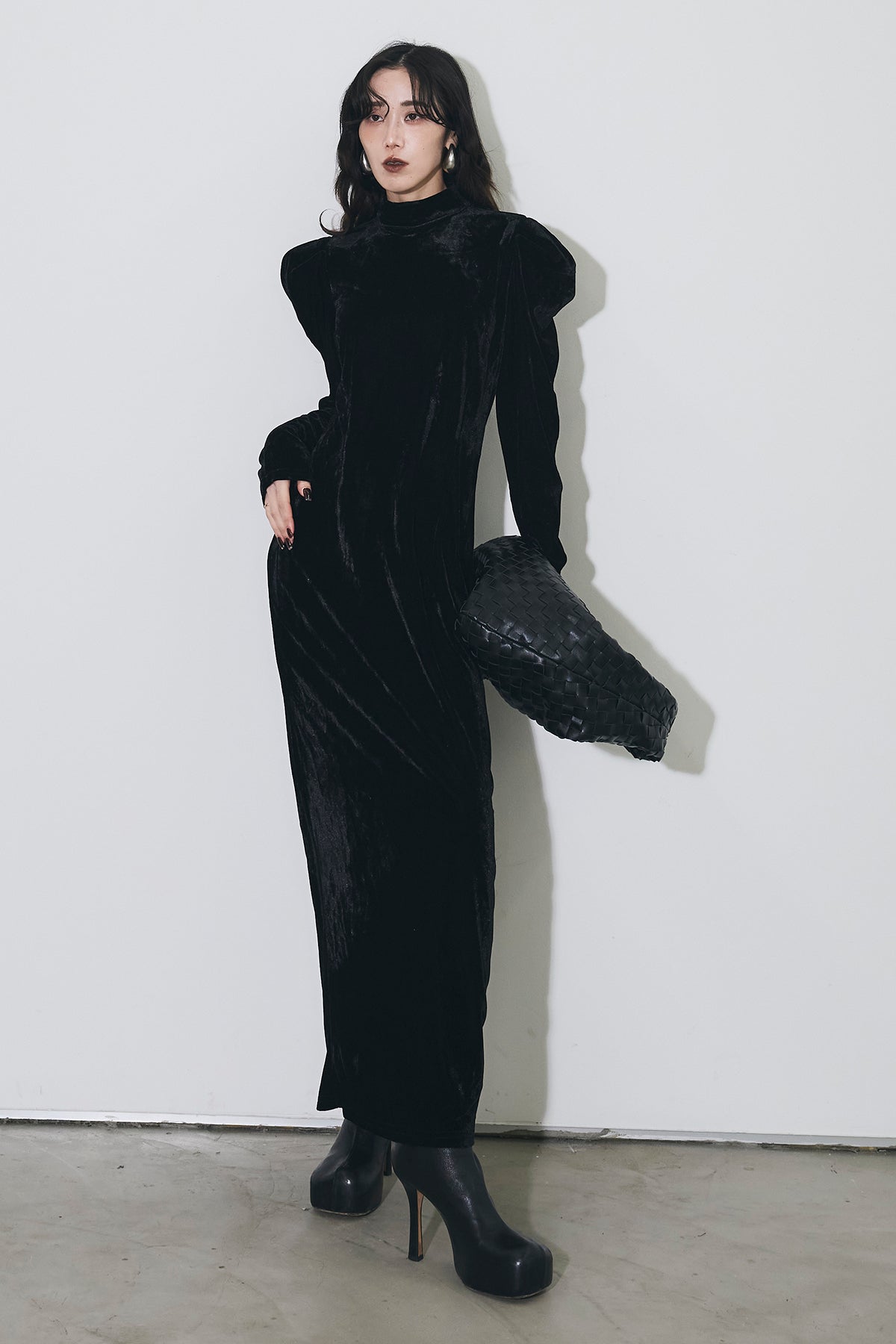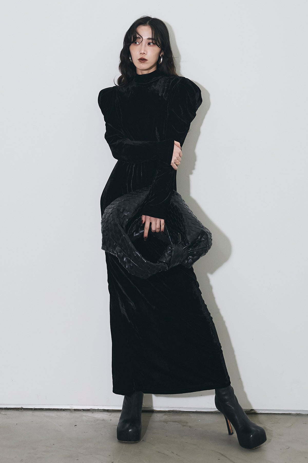 深みのある光沢が美しいベルベット素材を使用したロングワンピース。 立体的なショルダーデザインが特徴で、構築的なシルエットがモードな印象を与えます。 身体に沿う柔らかな素材感と落ち感のあるラインがエレガントさを演出。 フォーマルなシーンから特別な日の装いまで活躍する上品な一着。