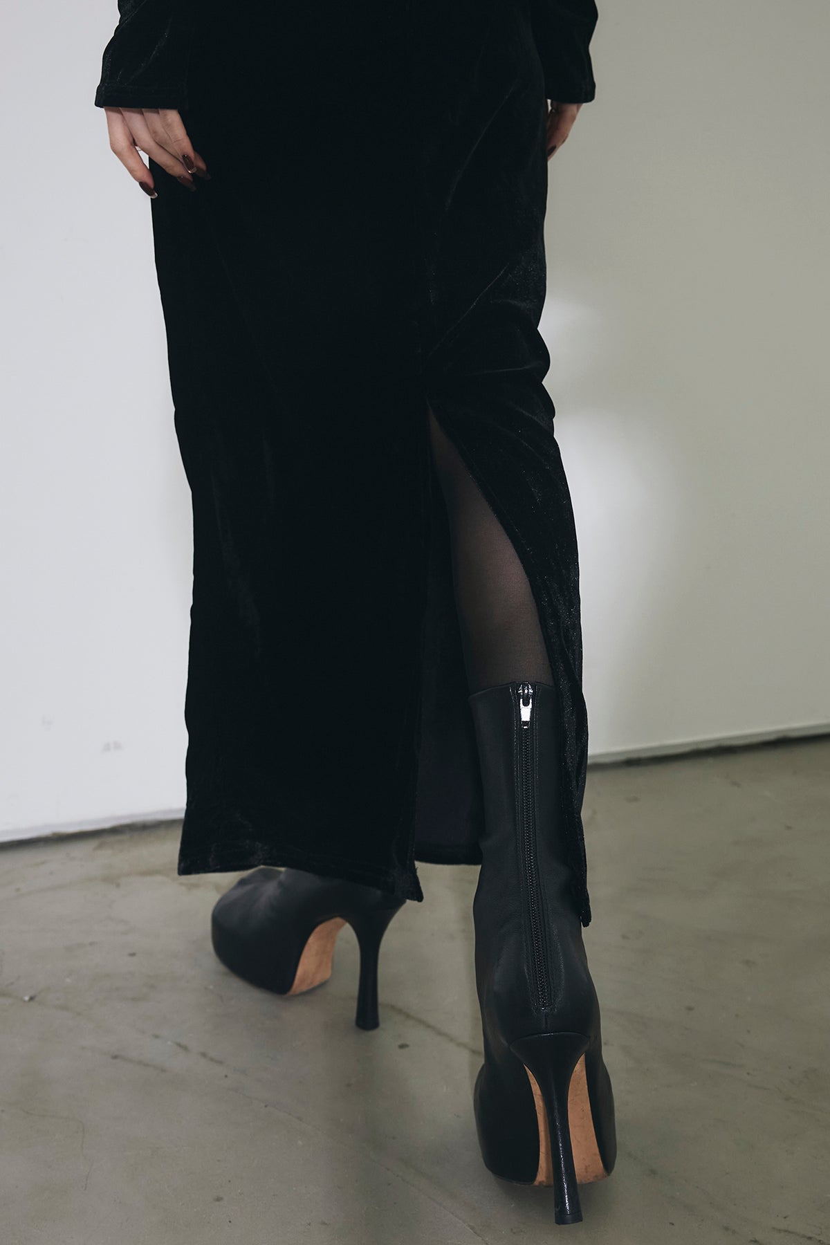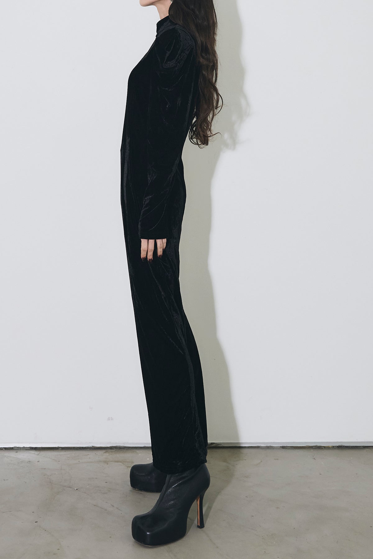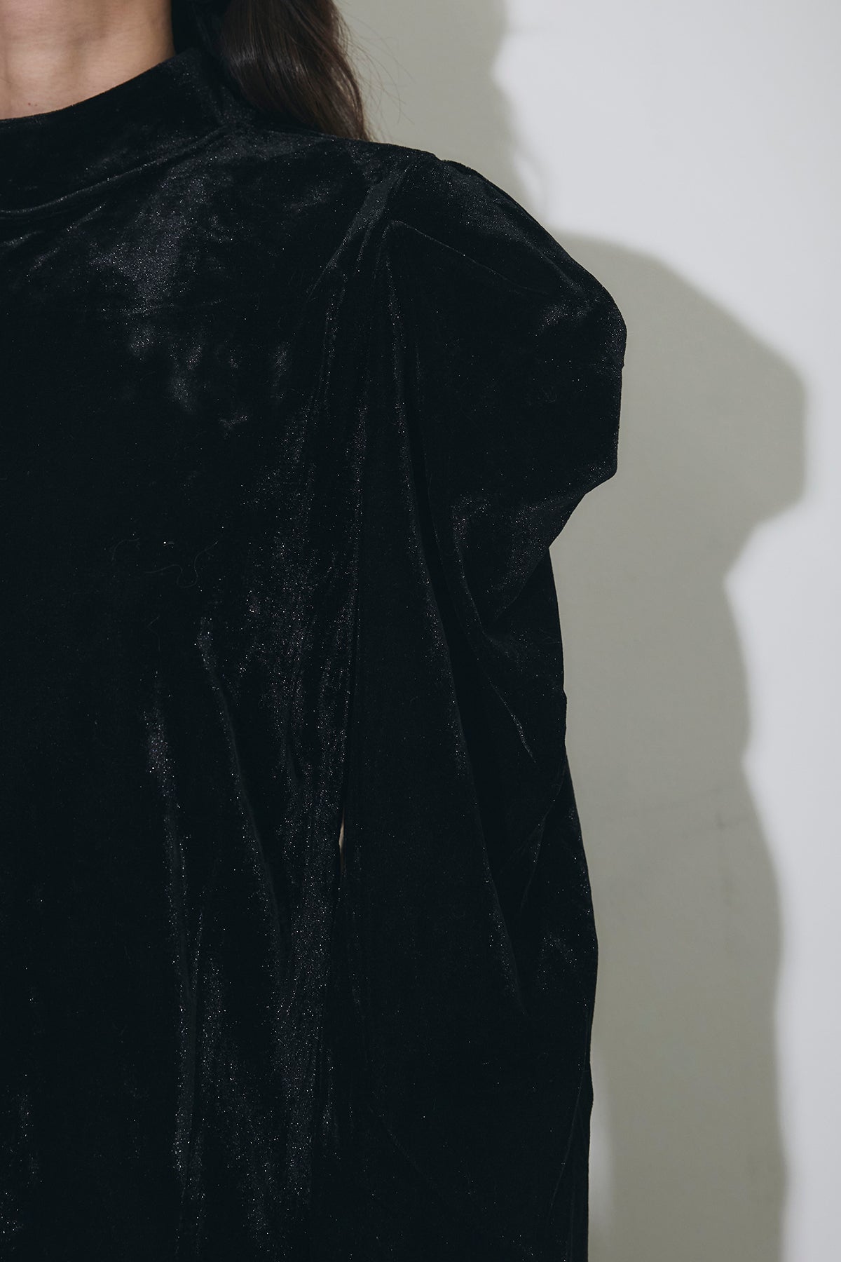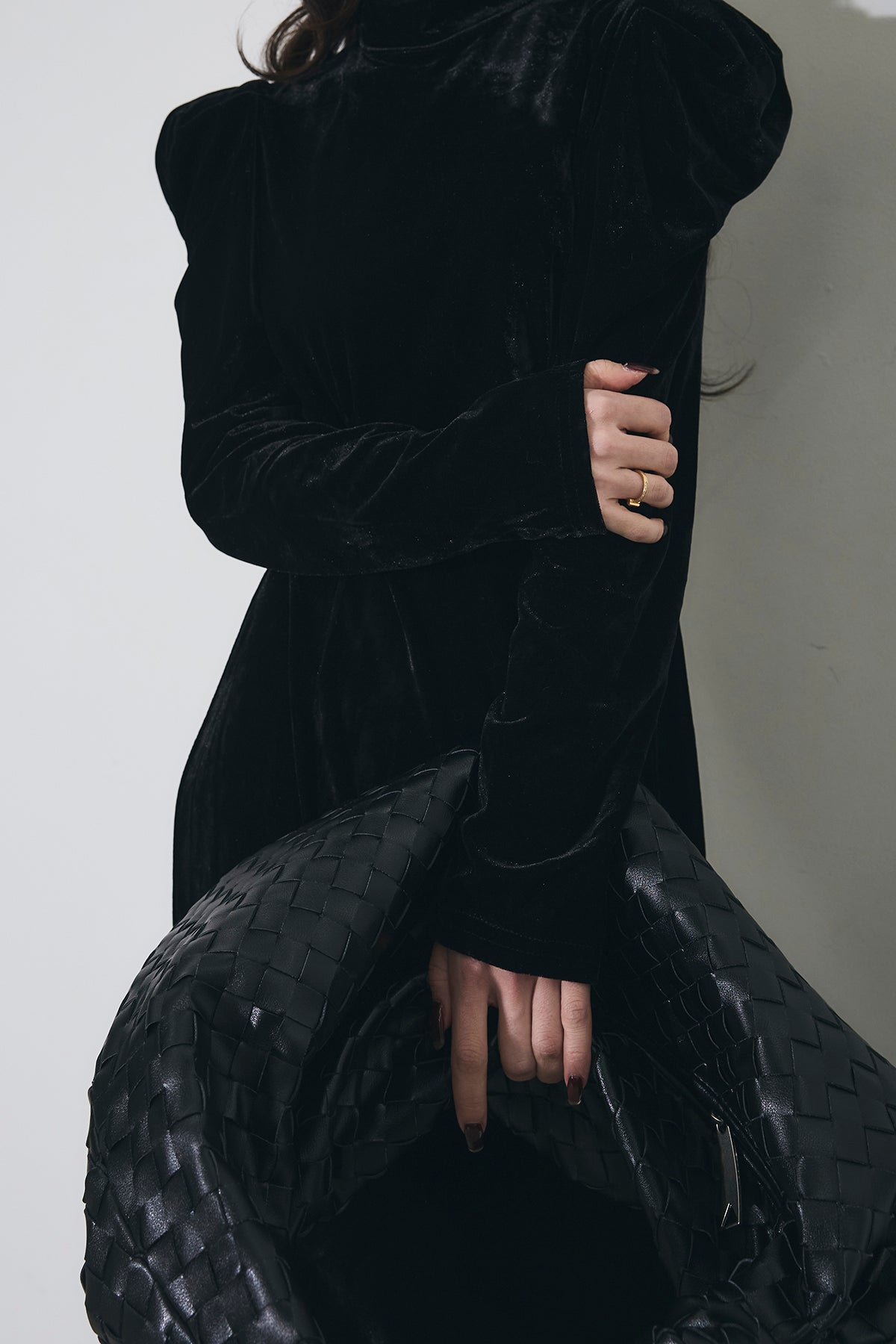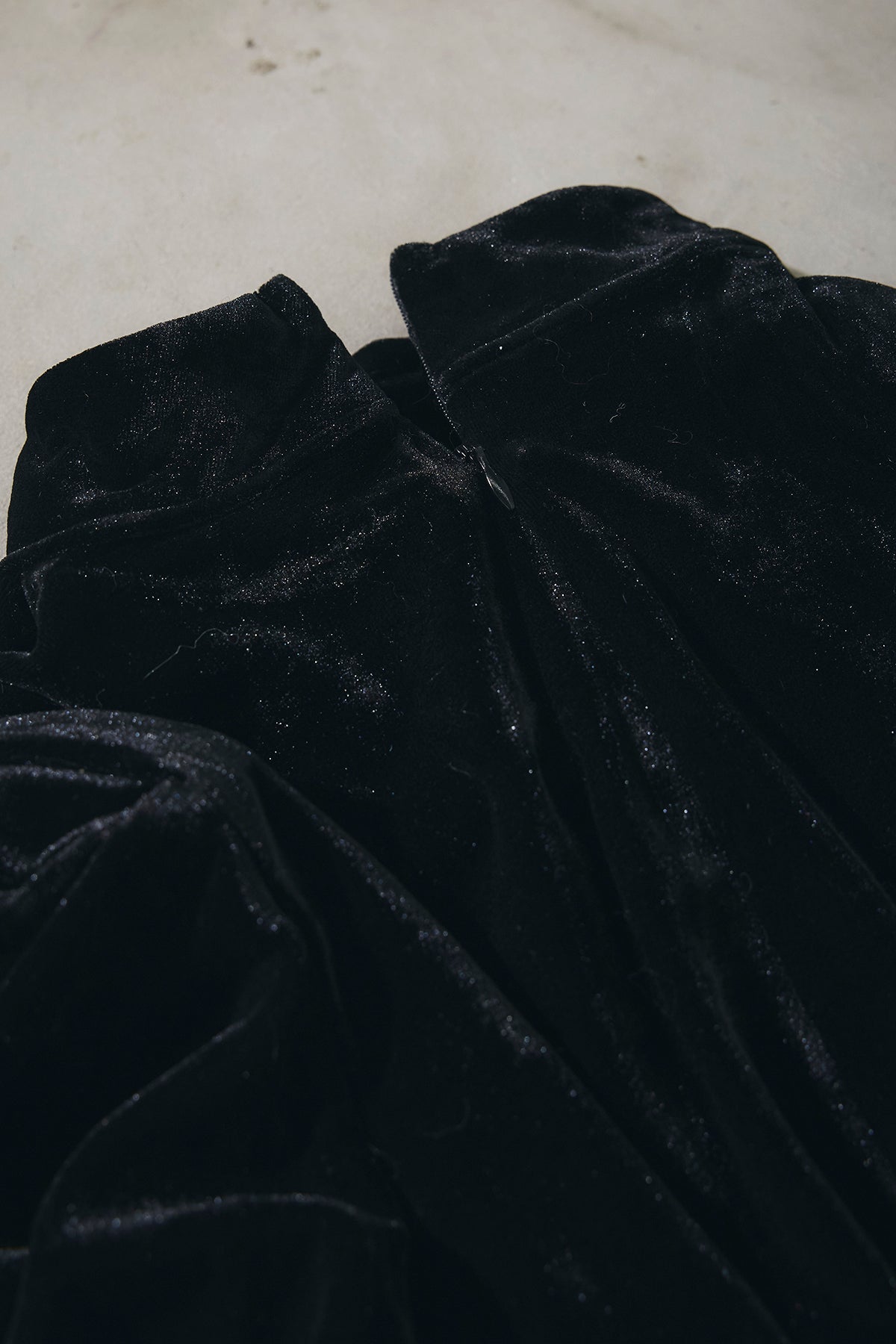 深みのある光沢が美しいベルベット素材を使用したロングワンピース。 立体的なショルダーデザインが特徴で、構築的なシルエットがモードな印象を与えます。 身体に沿う柔らかな素材感と落ち感のあるラインがエレガントさを演出。 フォーマルなシーンから特別な日の装いまで活躍する上品な一着。