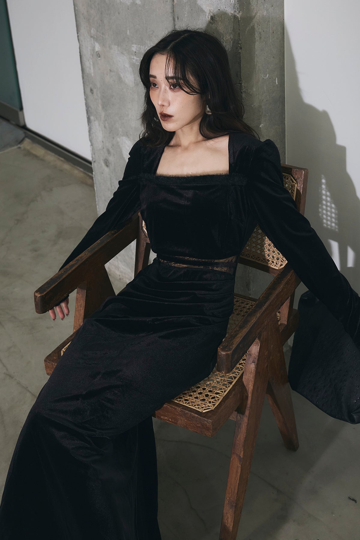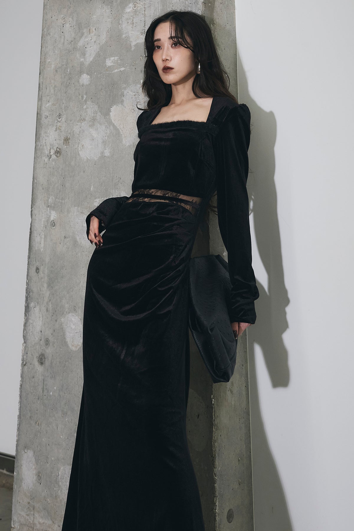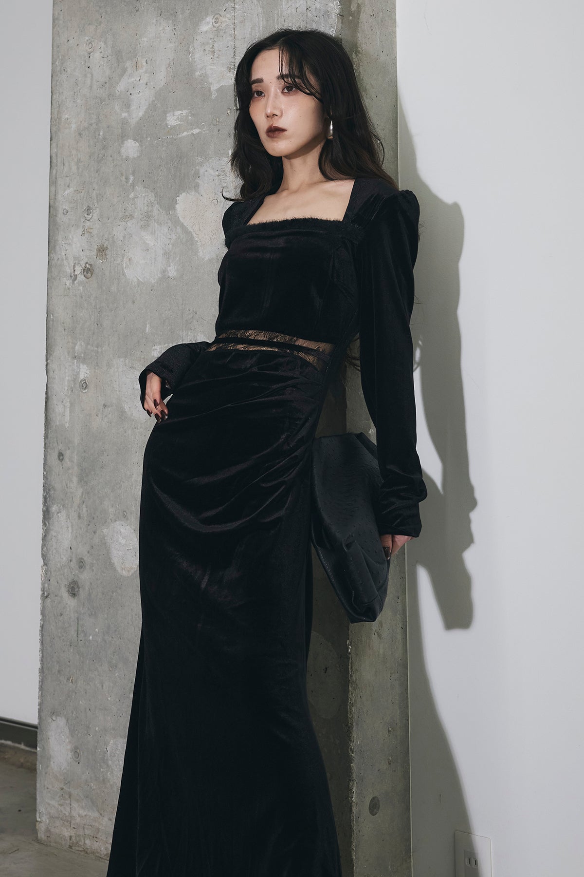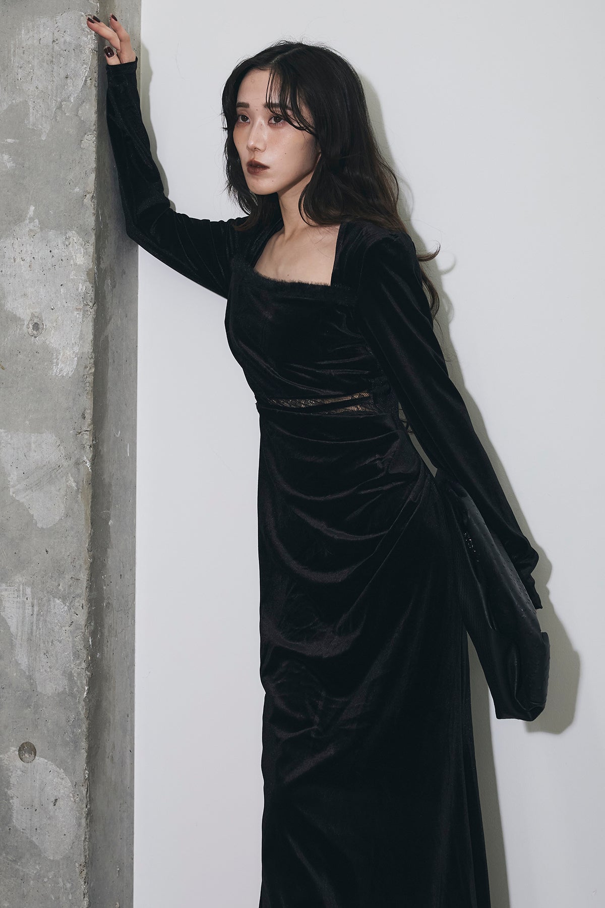 深みのある光沢を放つベルベット素材に、レースをドッキングしたロングワンピース。 スクエアネックとウエストの透け感が女性らしさを引き立てつつ、 シックでモードなムードを漂わせます。 柔らかな素材感と落ち感のあるシルエットが上品で、 一枚でドレスライクな存在感を放つアイテム。 特別な日のお出かけやパーティシーンにもおすすめです。