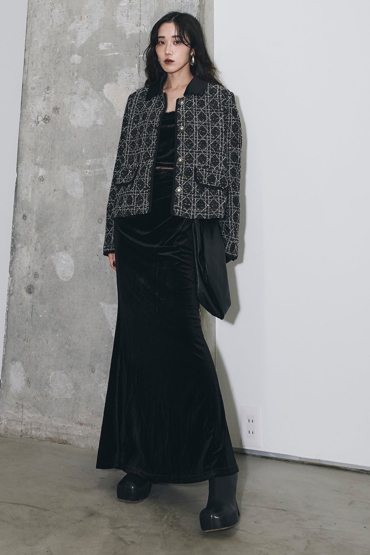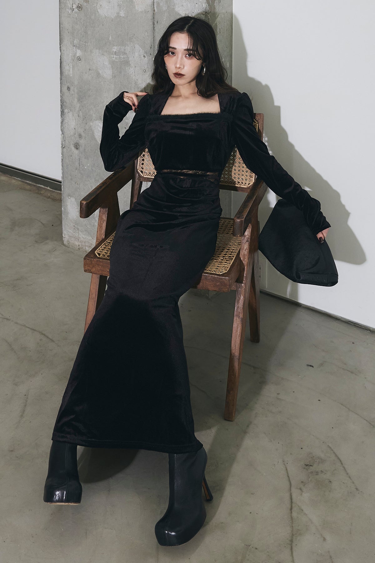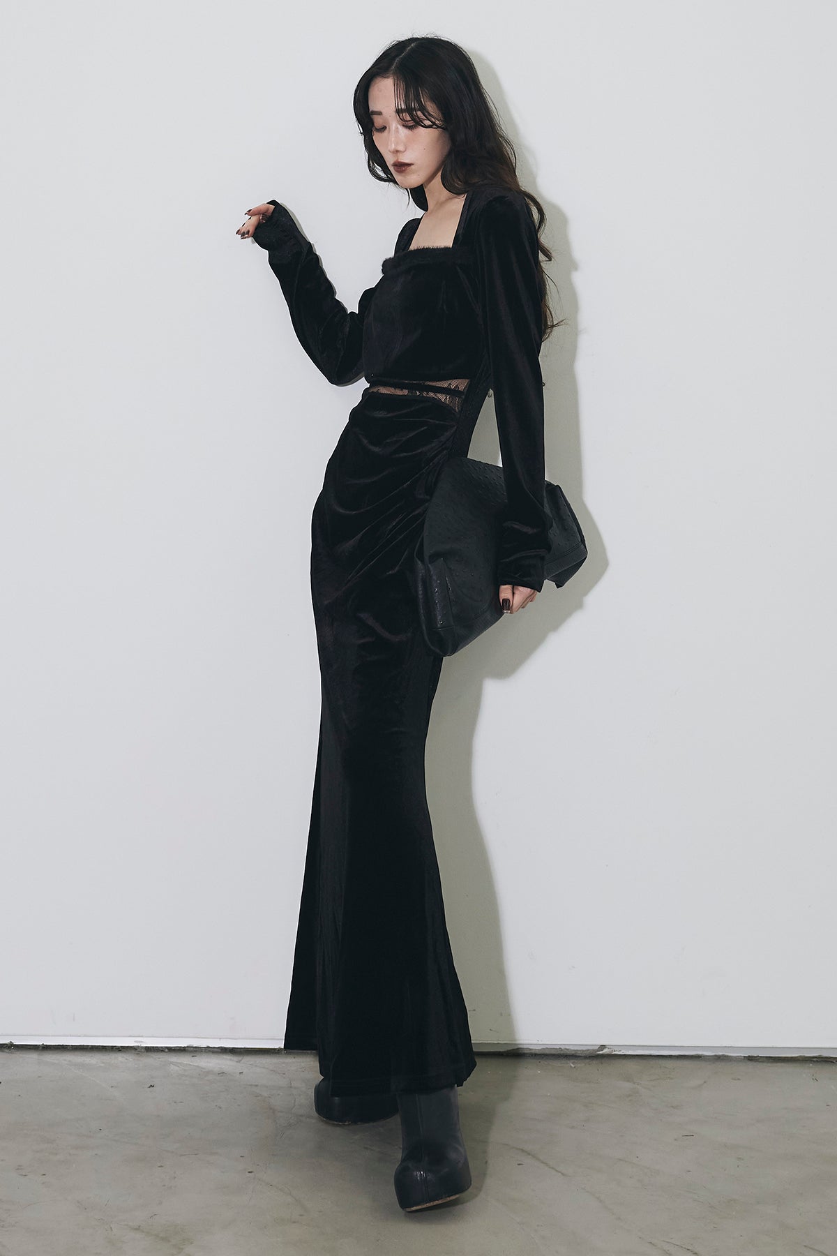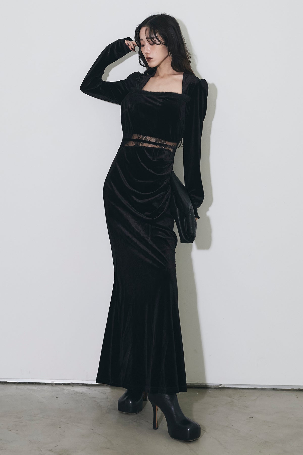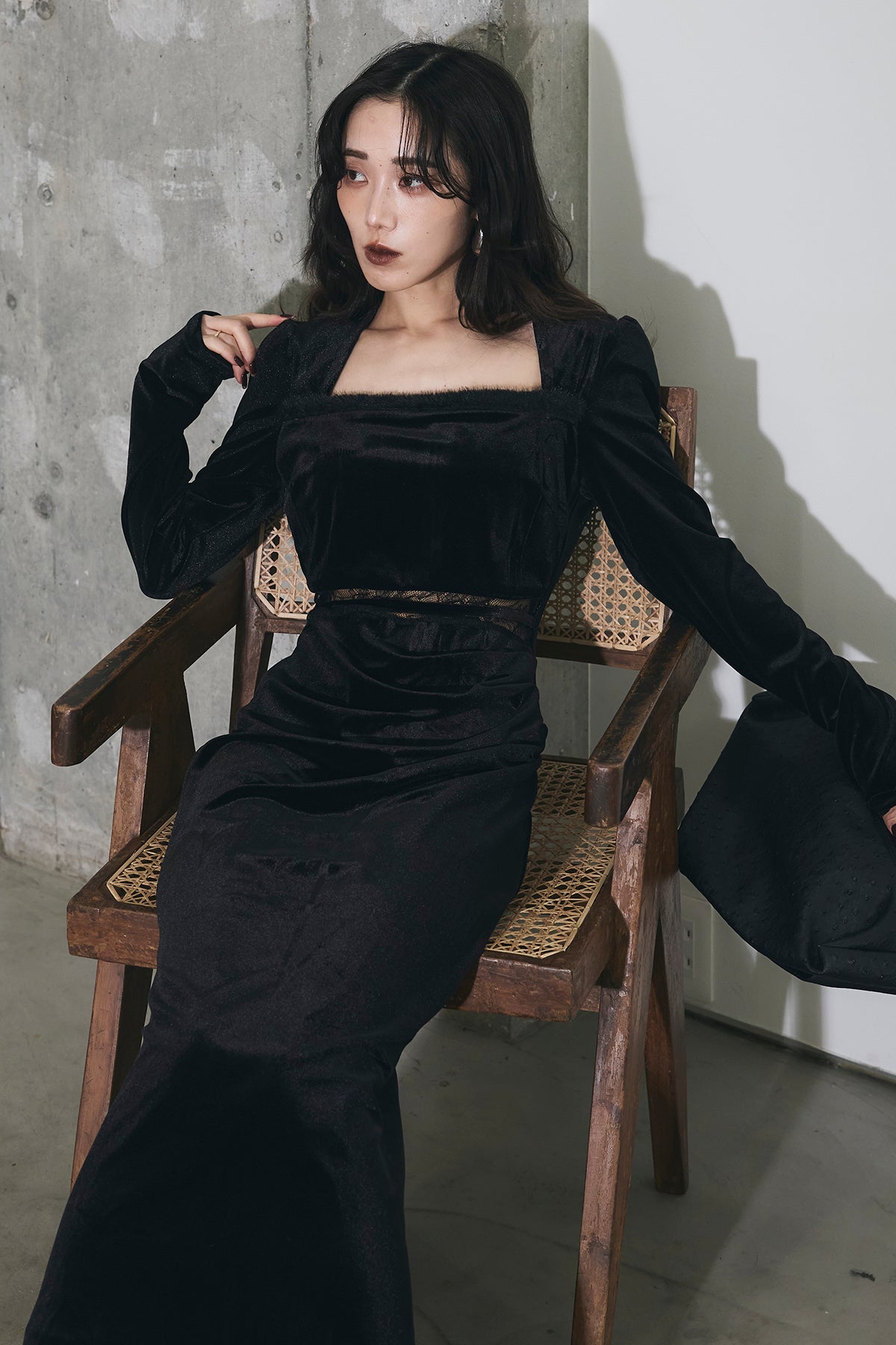 深みのある光沢を放つベルベット素材に、レースをドッキングしたロングワンピース。 スクエアネックとウエストの透け感が女性らしさを引き立てつつ、 シックでモードなムードを漂わせます。 柔らかな素材感と落ち感のあるシルエットが上品で、 一枚でドレスライクな存在感を放つアイテム。 特別な日のお出かけやパーティシーンにもおすすめです。