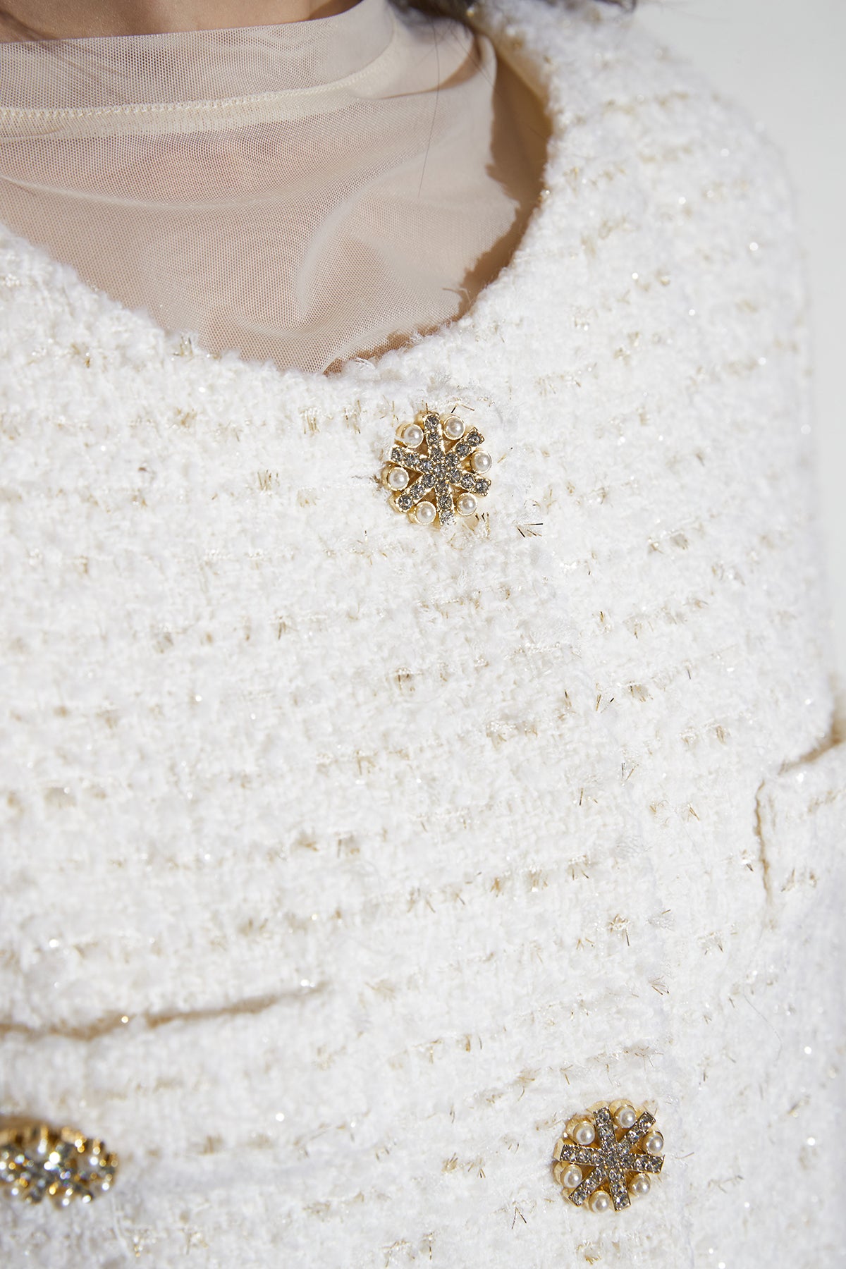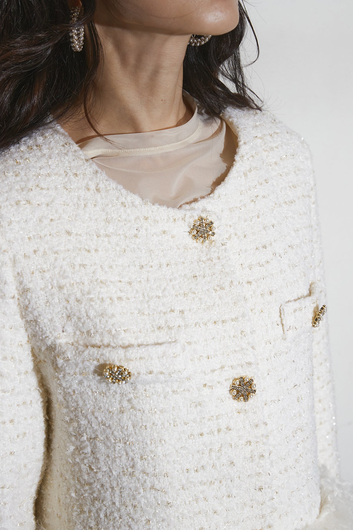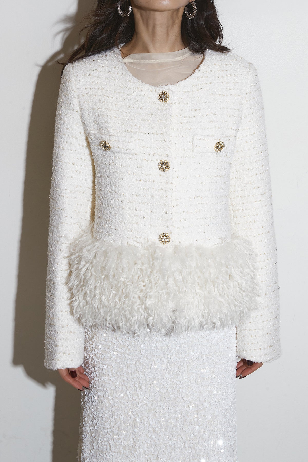 クラシックなツイードジャケット。ゴールド調のボタンが品よく輝き、裾に施したフェザーデザインがラグジュアリーなムードをプラス。程よくコンパクトなシルエットでワンピースにも合わせやすく、オケージョンからデイリーのドレッシーコーデまで幅広く活躍します。