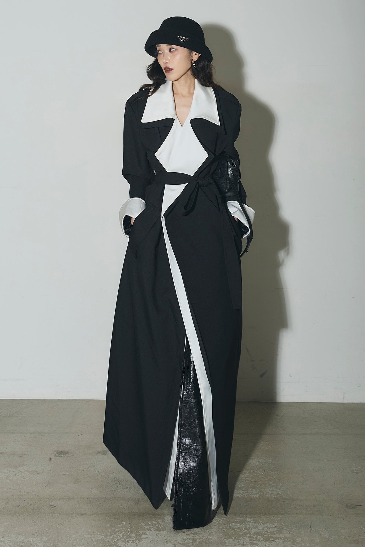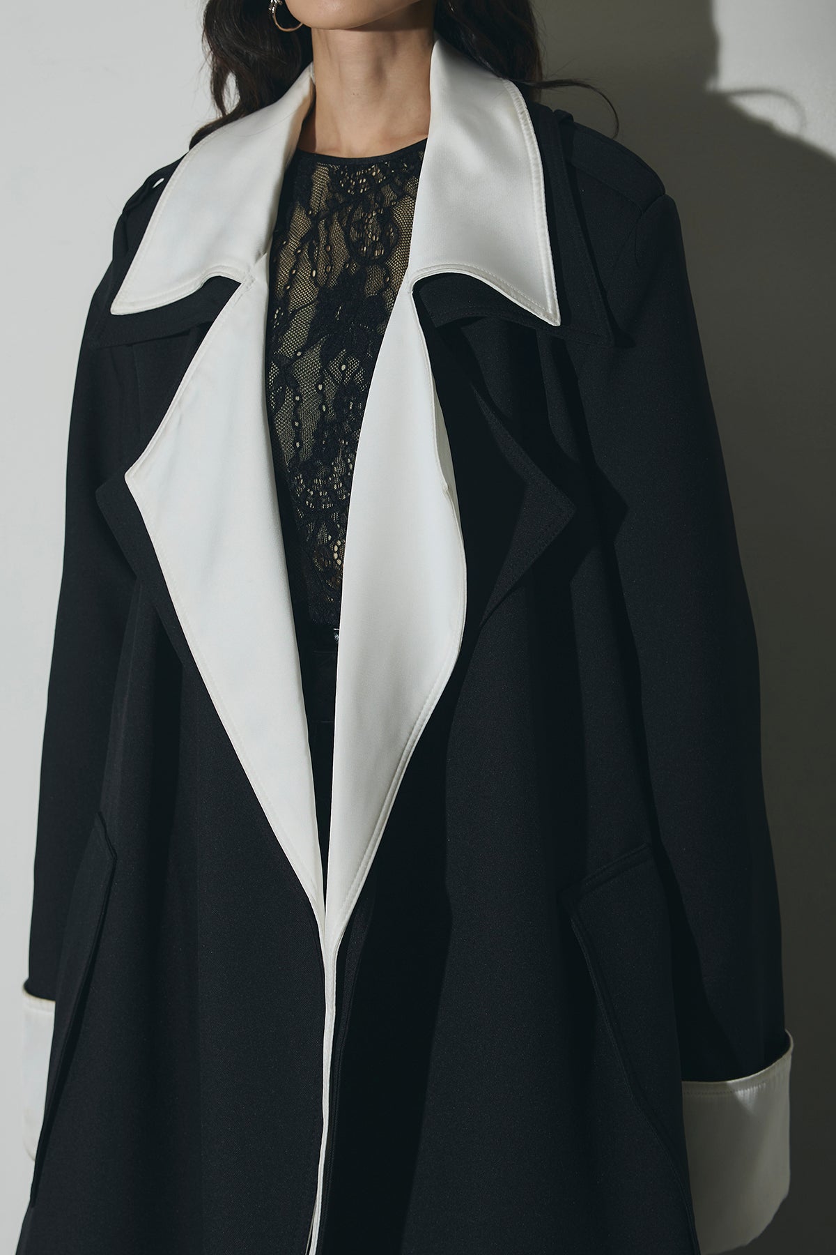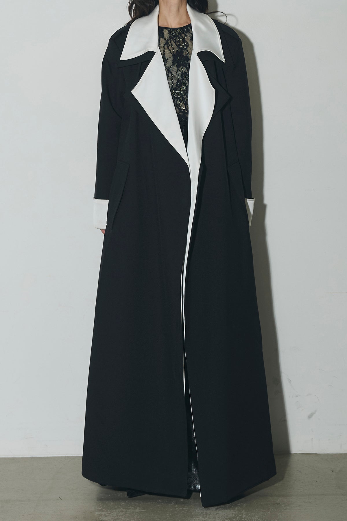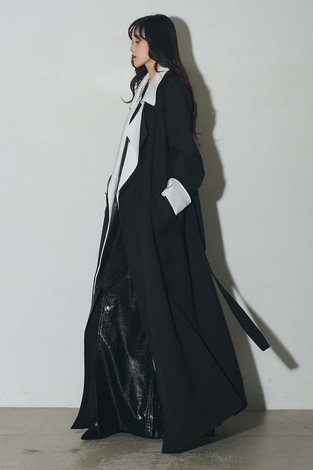 配色デザインが印象的なロングコート。シャープな襟元と縦のラインを強調するシルエットで、羽織るだけでスタイリングを引き締めます。すっきりとした落ち感のあるフォルムながら、程よい存在感があり、デイリーからオケージョンまで幅広く活躍。前を開けて軽く羽織るのはもちろん、閉じてワンピース感覚で着用するのもおすすめです。シンプルなコーデにプラスするだけで、洗練された印象に仕上がります。