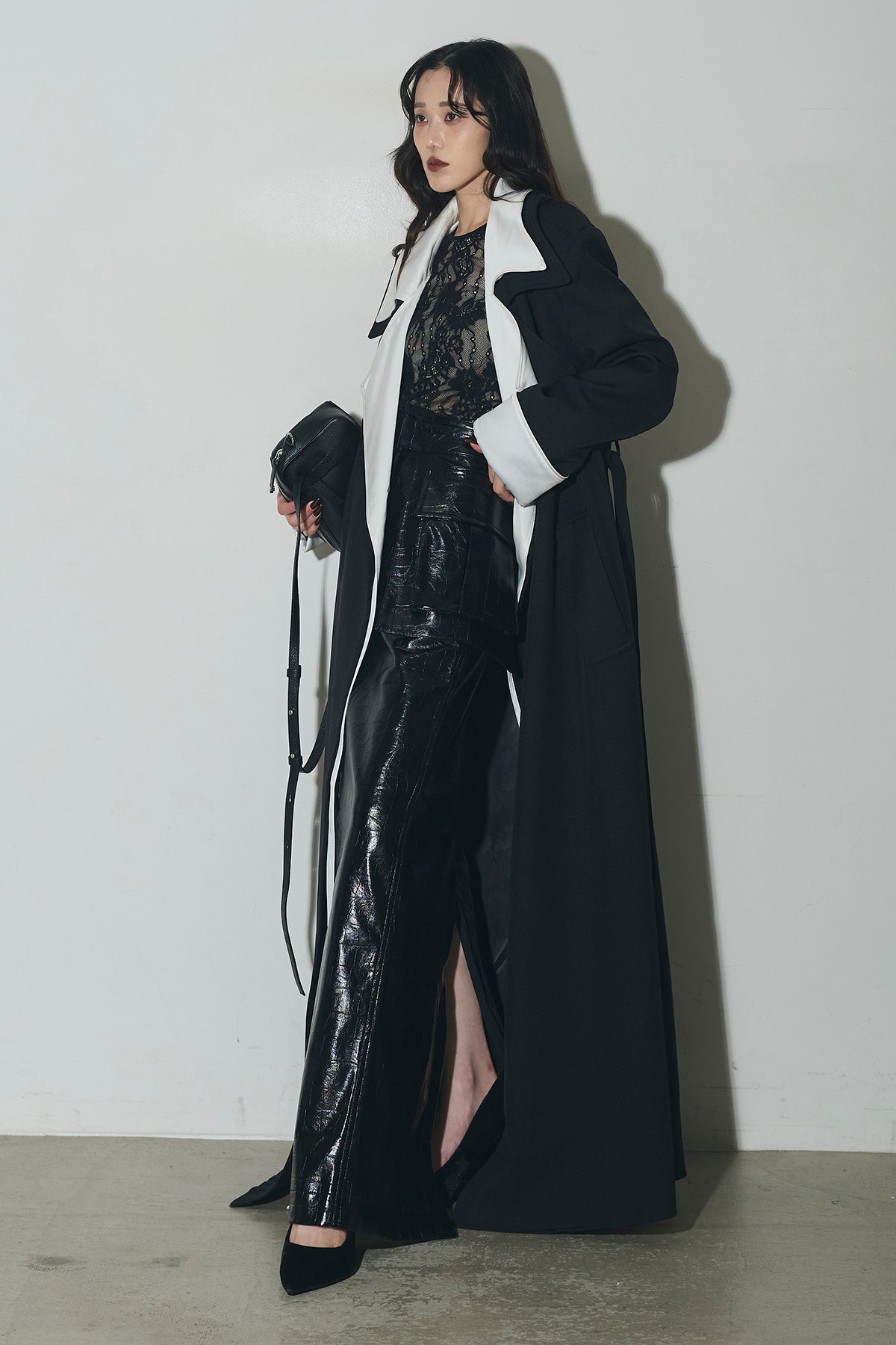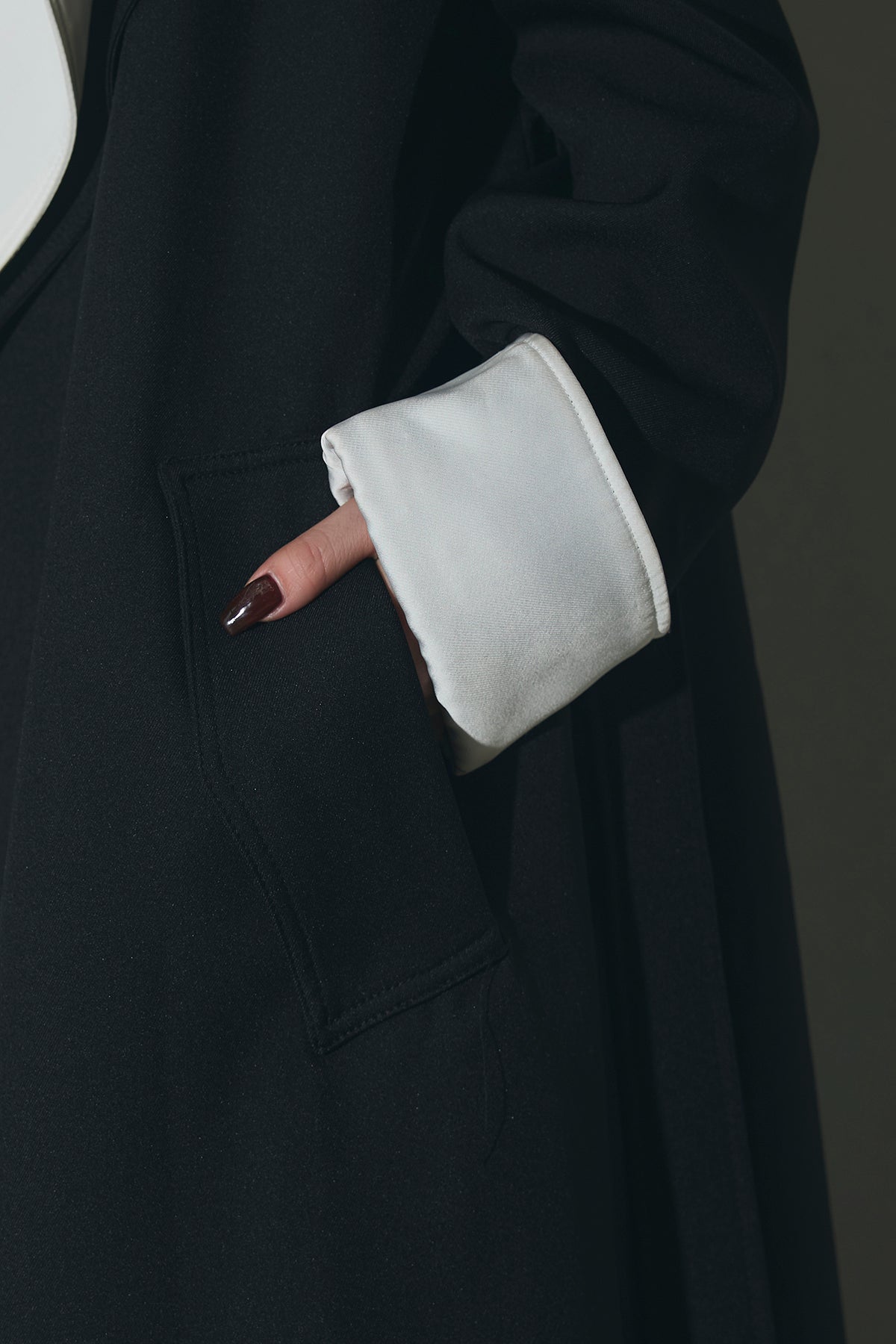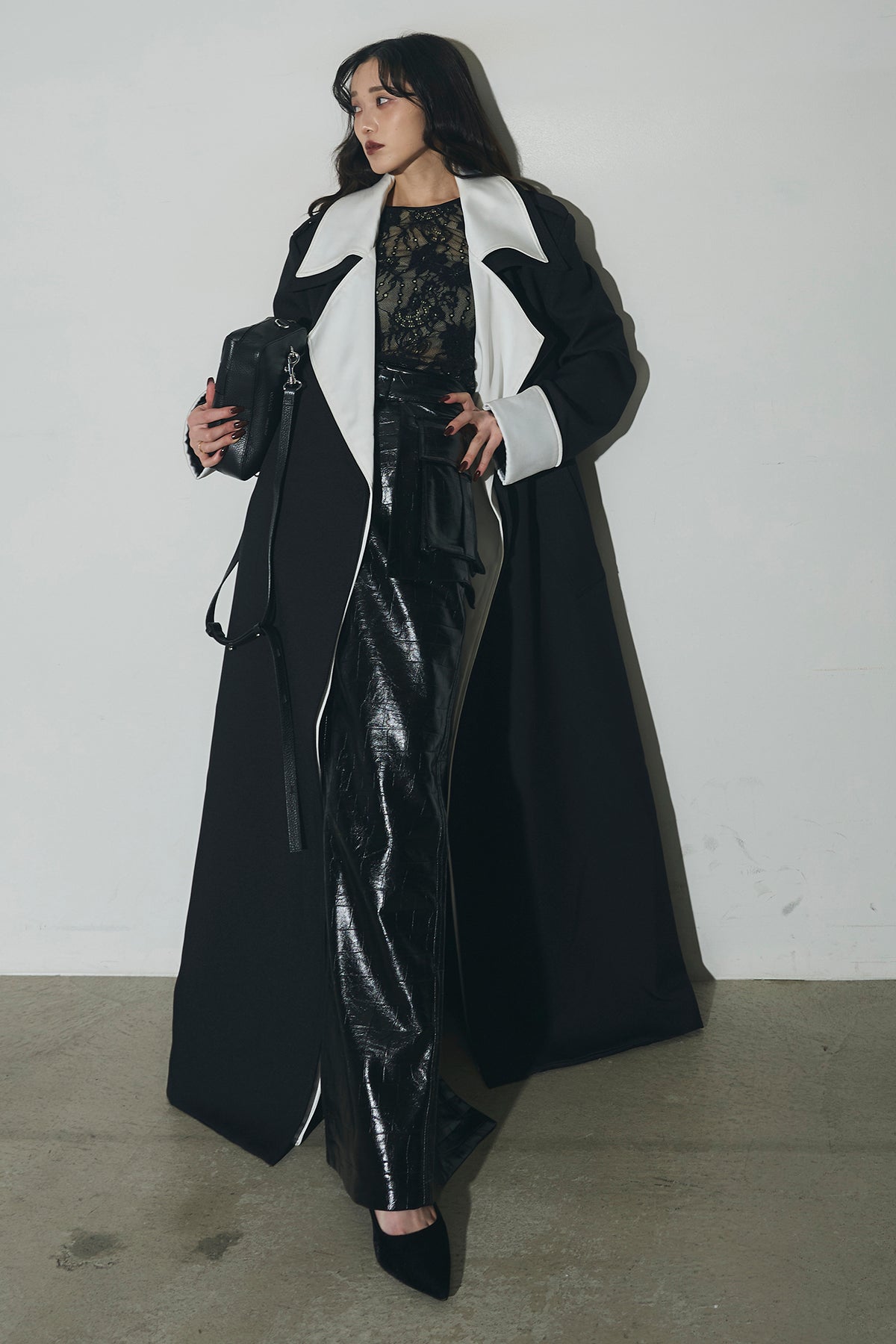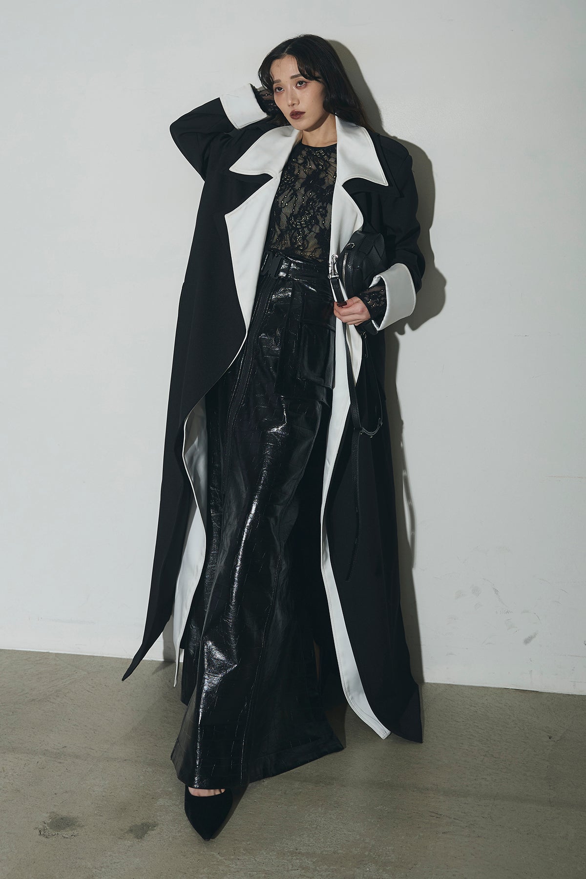 配色デザインが印象的なロングコート。シャープな襟元と縦のラインを強調するシルエットで、羽織るだけでスタイリングを引き締めます。すっきりとした落ち感のあるフォルムながら、程よい存在感があり、デイリーからオケージョンまで幅広く活躍。前を開けて軽く羽織るのはもちろん、閉じてワンピース感覚で着用するのもおすすめです。シンプルなコーデにプラスするだけで、洗練された印象に仕上がります。