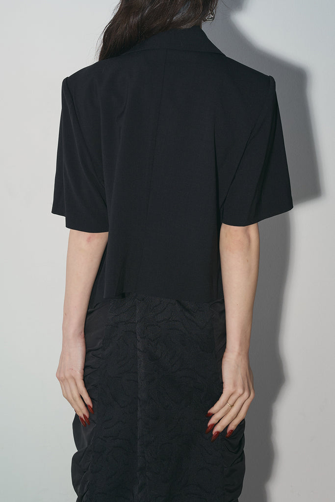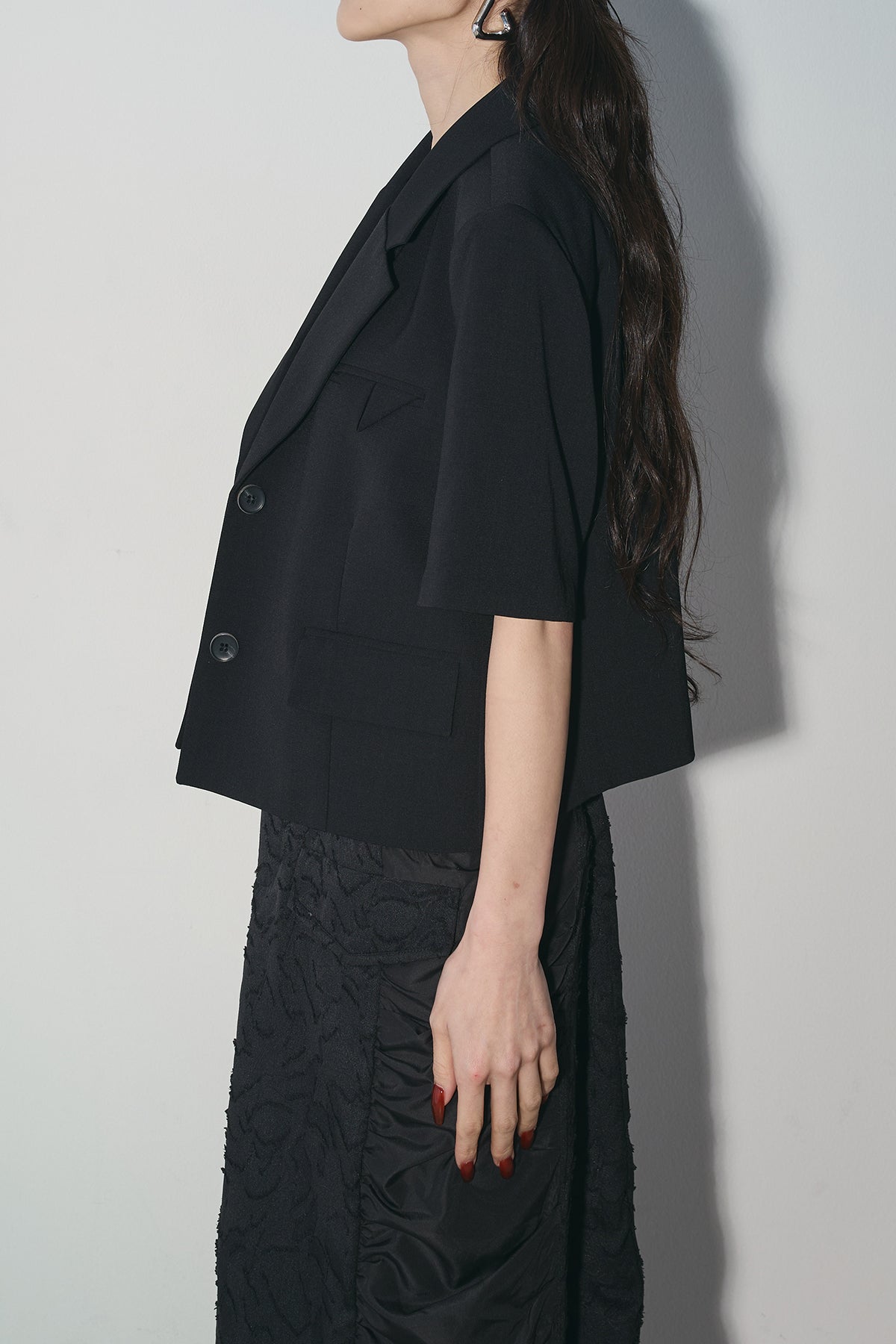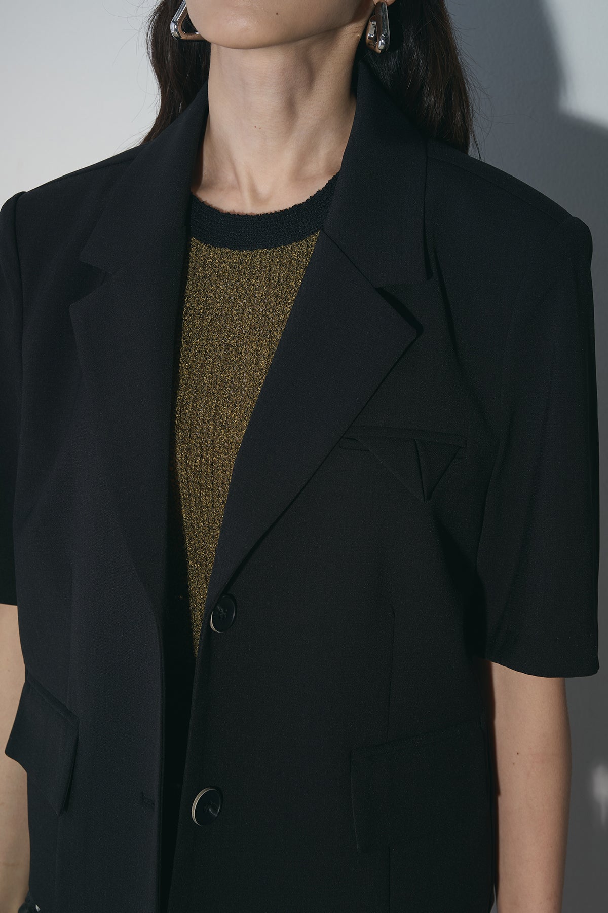 ミニマルで洗練された印象のショートスリーブジャケット。 すっきりとした丈感がスタイルアップを叶え、ワンピースやハイウエストボトムとの相性も◎ カジュアルにもモードにも振れる、着回し力の高い一着です。