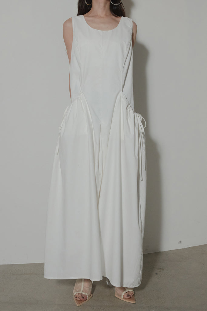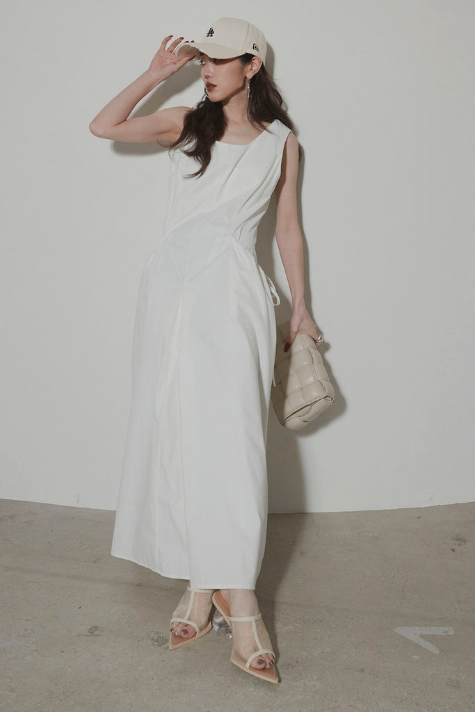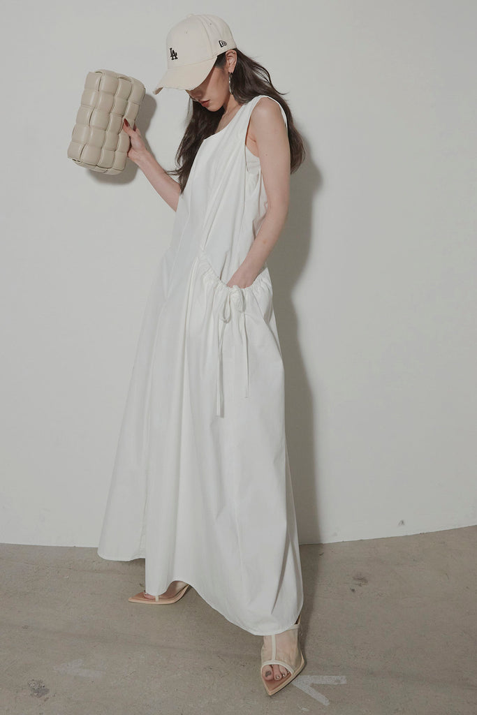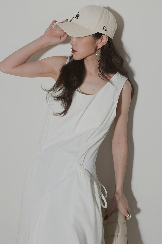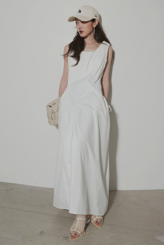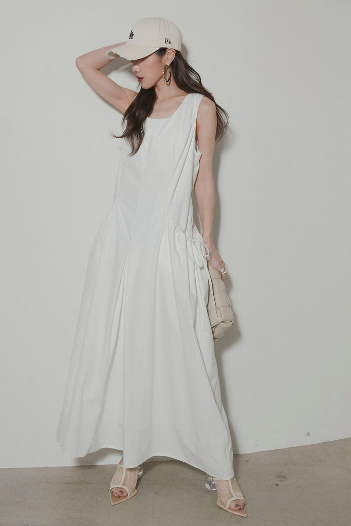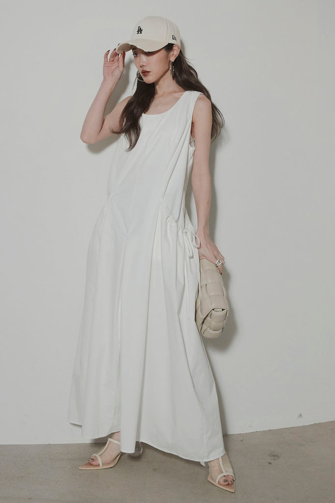 サイドのドローストリングが特徴的なノースリーブワンピース。 絞り具合でシルエットに変化をつけられ、立体感のあるフォルムを楽しめます。 軽やかな素材感とミニマルなデザインが、夏のスタイルにぴったりの一着です。