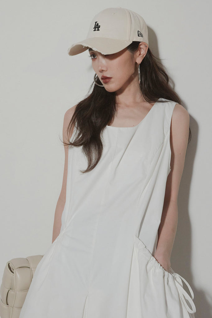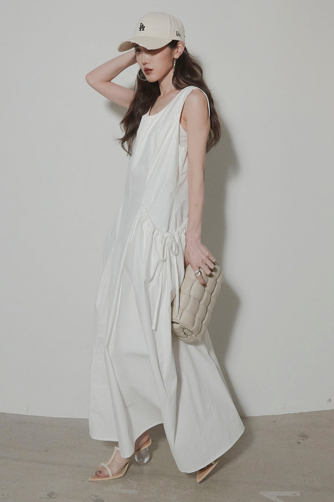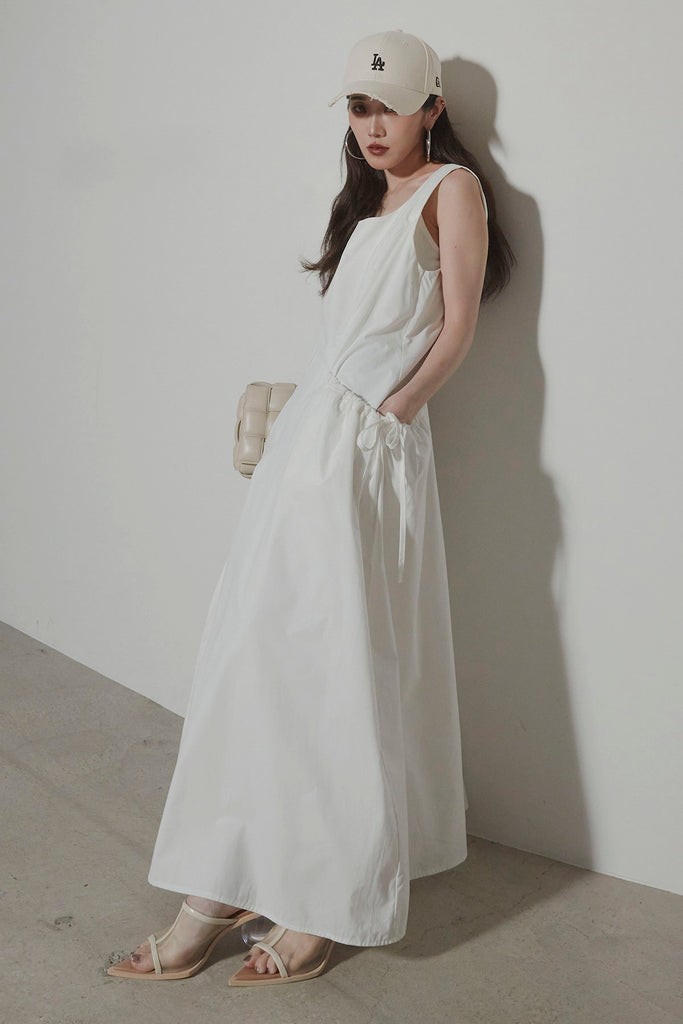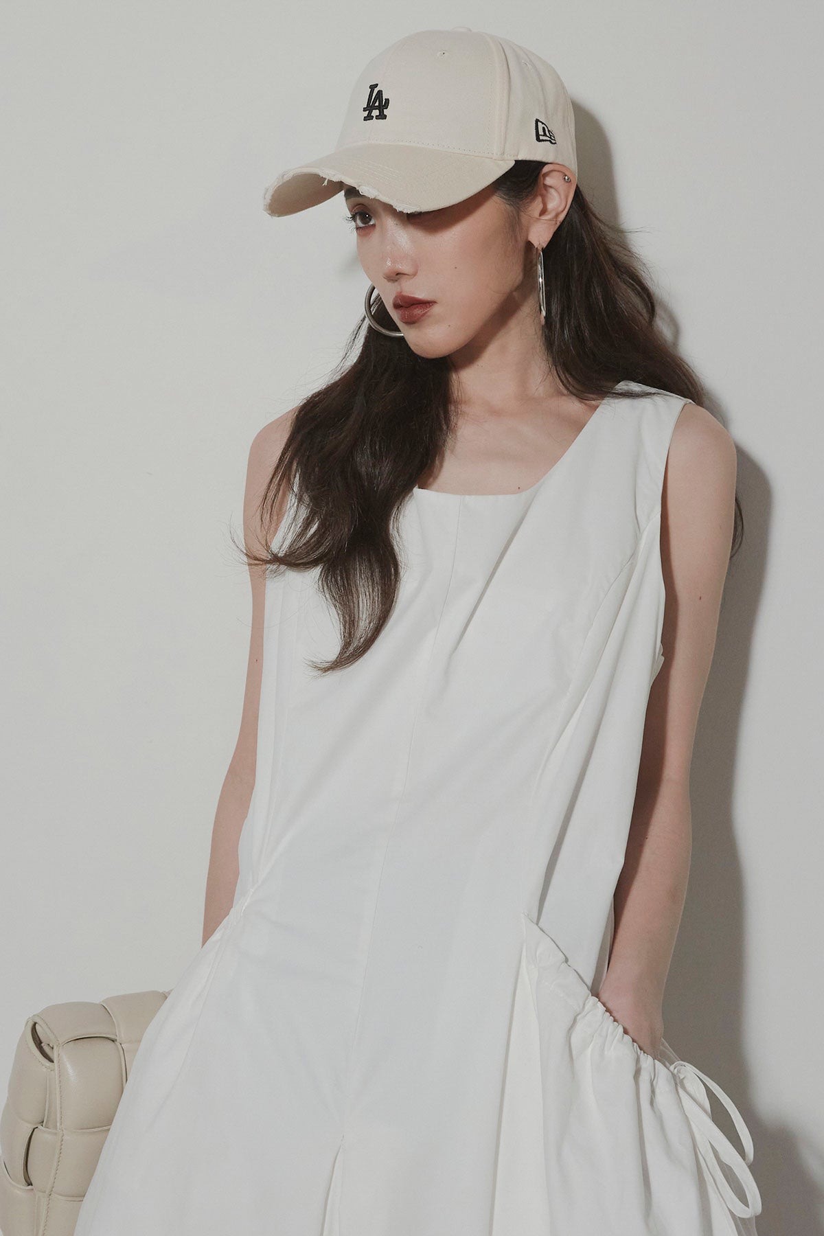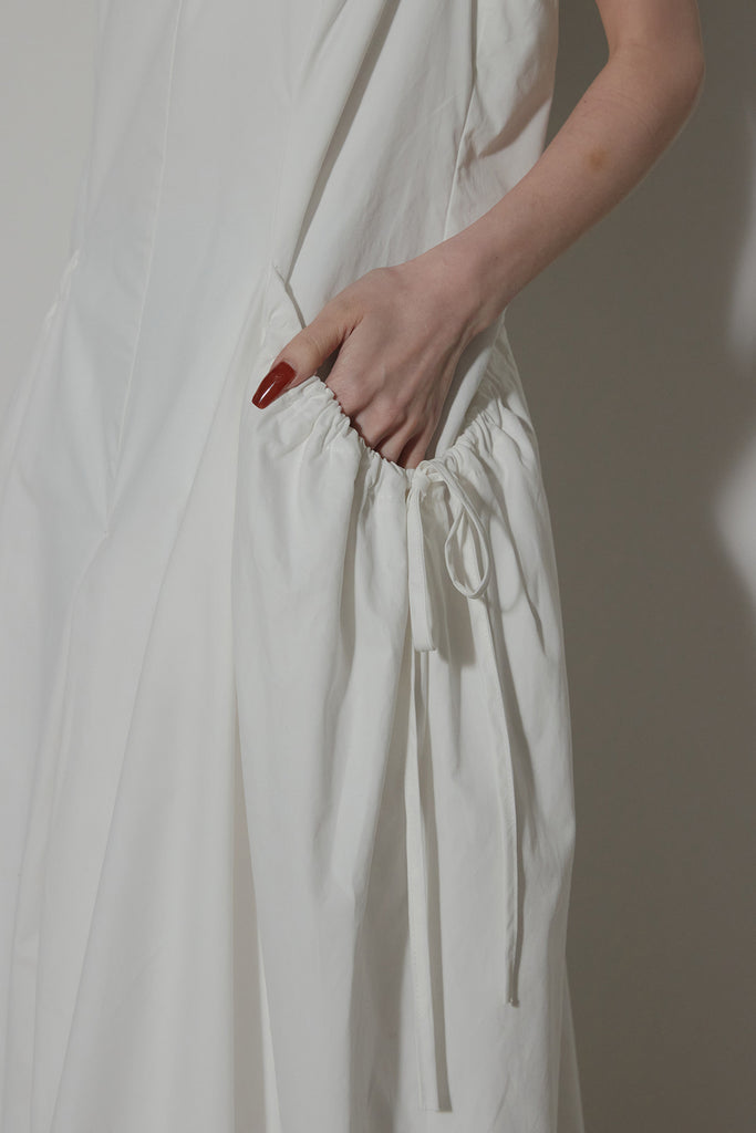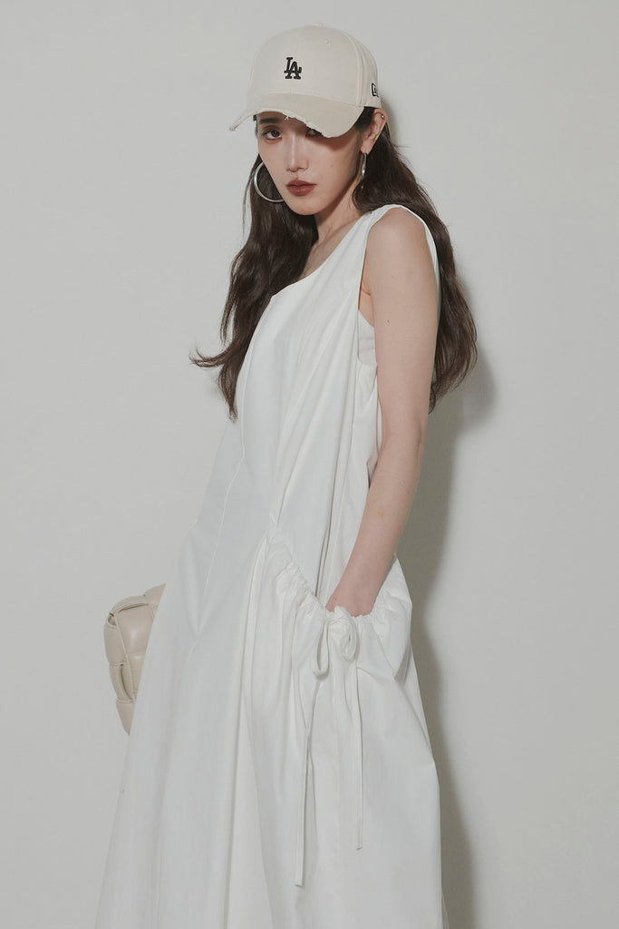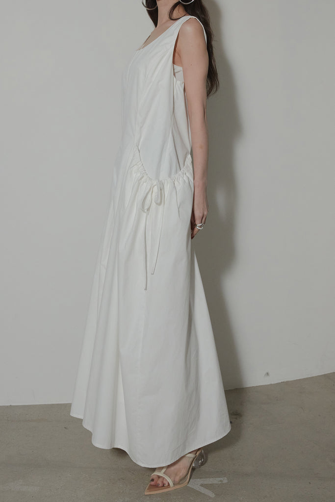サイドのドローストリングが特徴的なノースリーブワンピース。 絞り具合でシルエットに変化をつけられ、立体感のあるフォルムを楽しめます。 軽やかな素材感とミニマルなデザインが、夏のスタイルにぴったりの一着です。