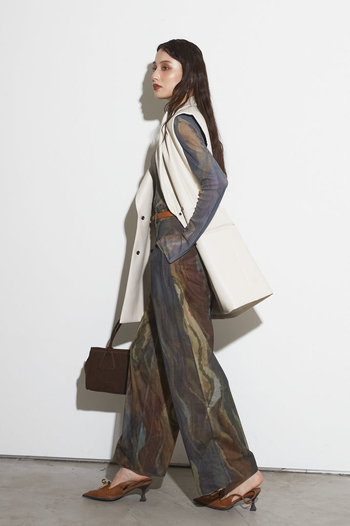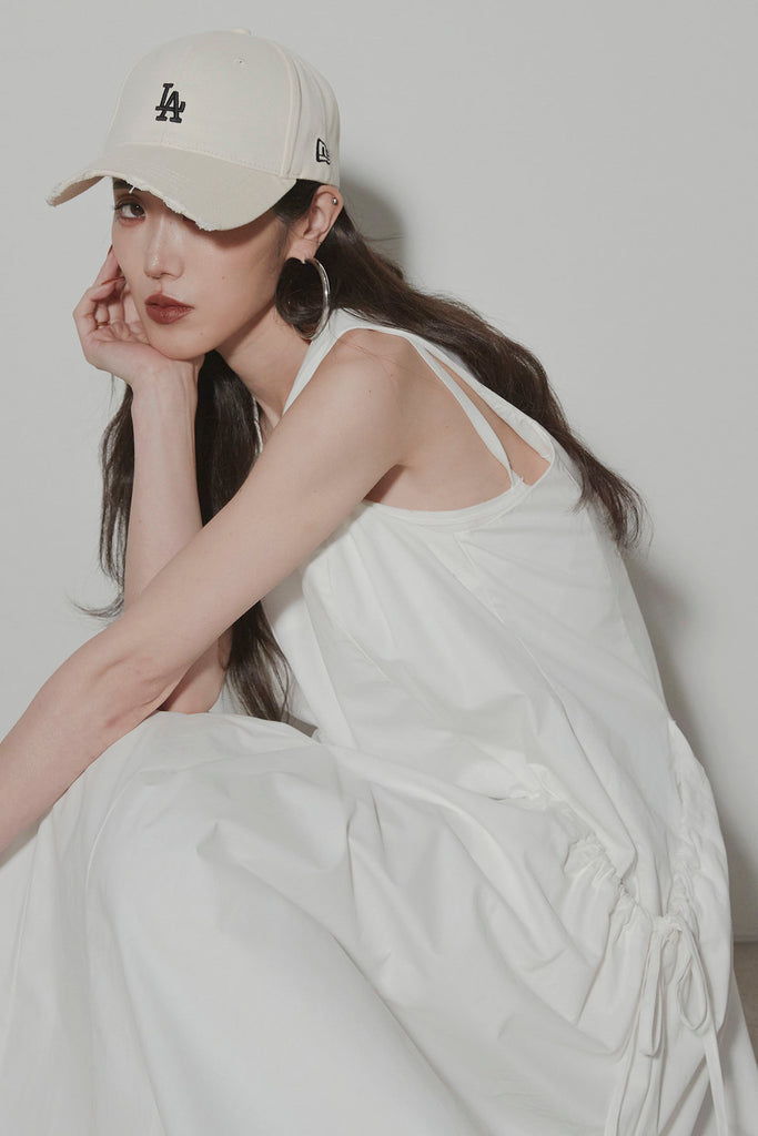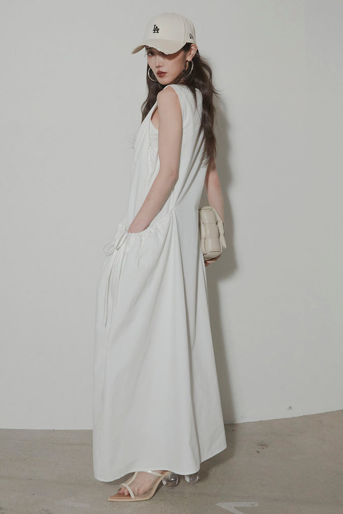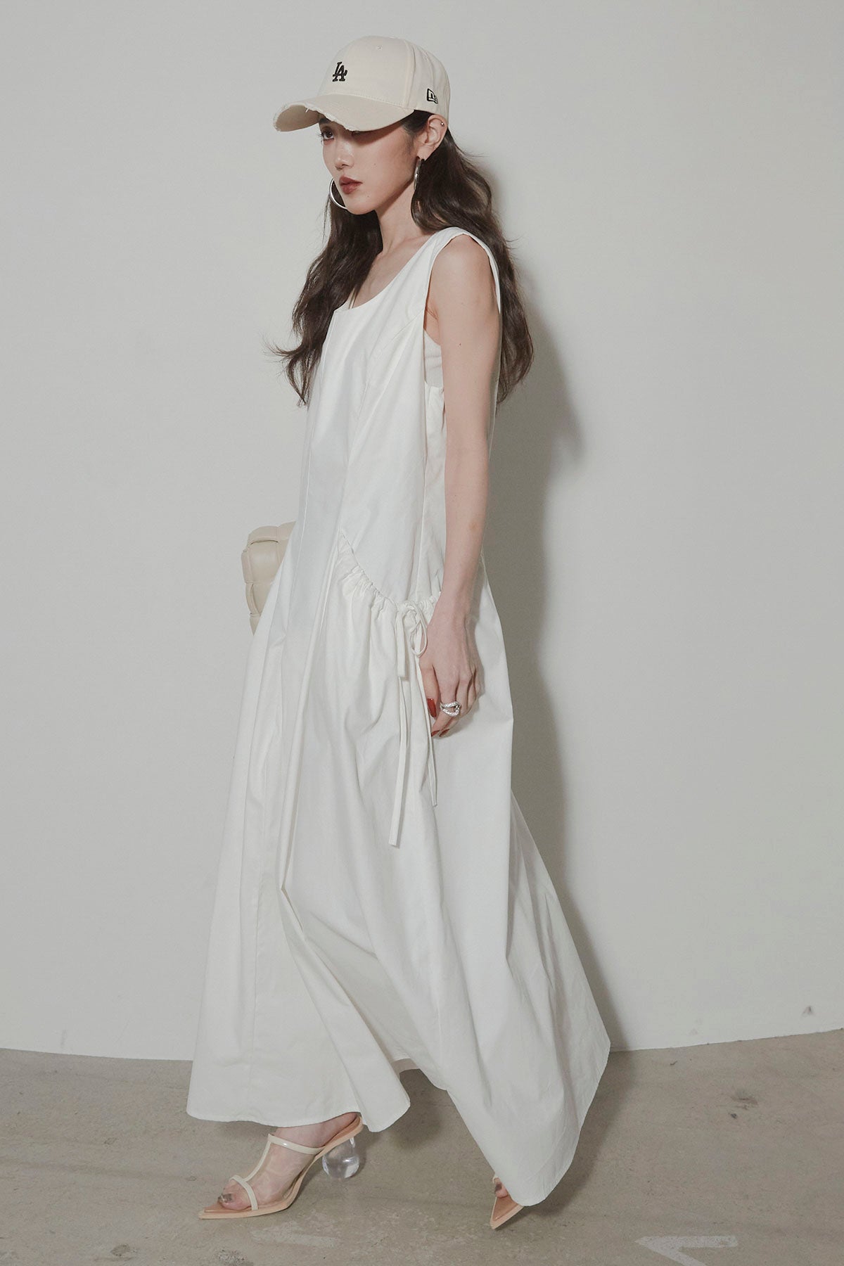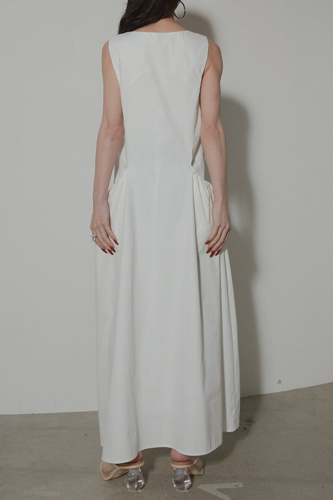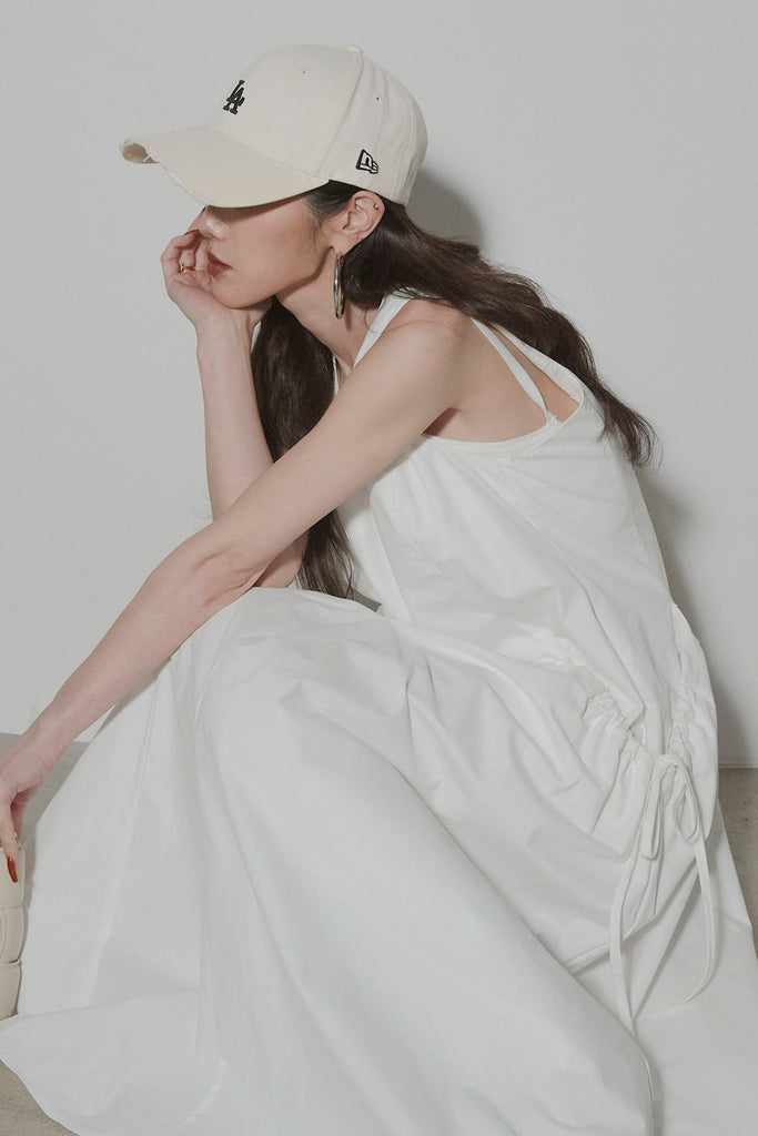 サイドのドローストリングが特徴的なノースリーブワンピース。 絞り具合でシルエットに変化をつけられ、立体感のあるフォルムを楽しめます。 軽やかな素材感とミニマルなデザインが、夏のスタイルにぴったりの一着です。