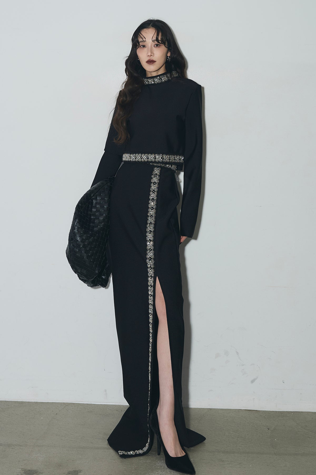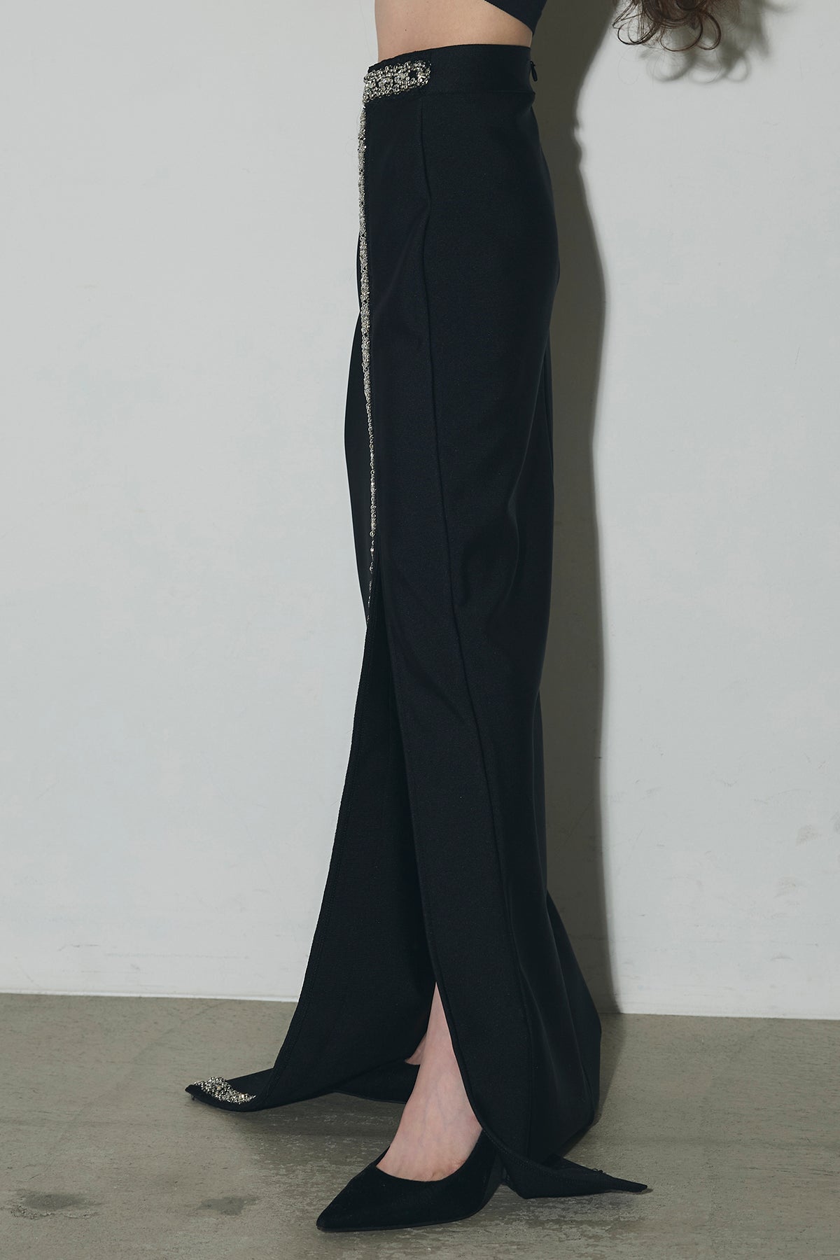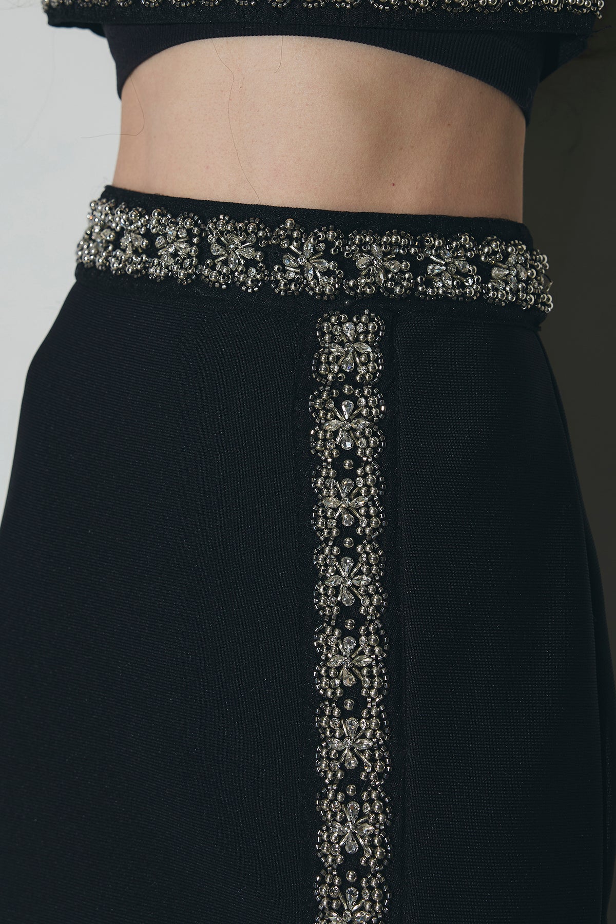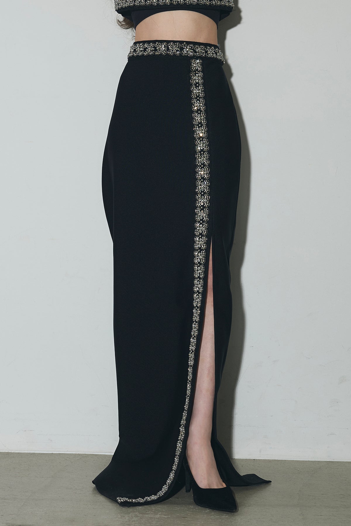 ビジュー使いが目を引くトップスとスカートのセットアップ。 トップスはショート丈でバランス良く、スカートは縦ラインとスリットで動きをプラス。 それぞれ単品使いもでき、オケージョンからデイリーまで幅広く活躍します。