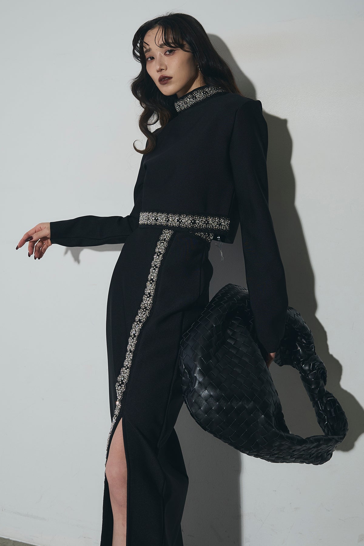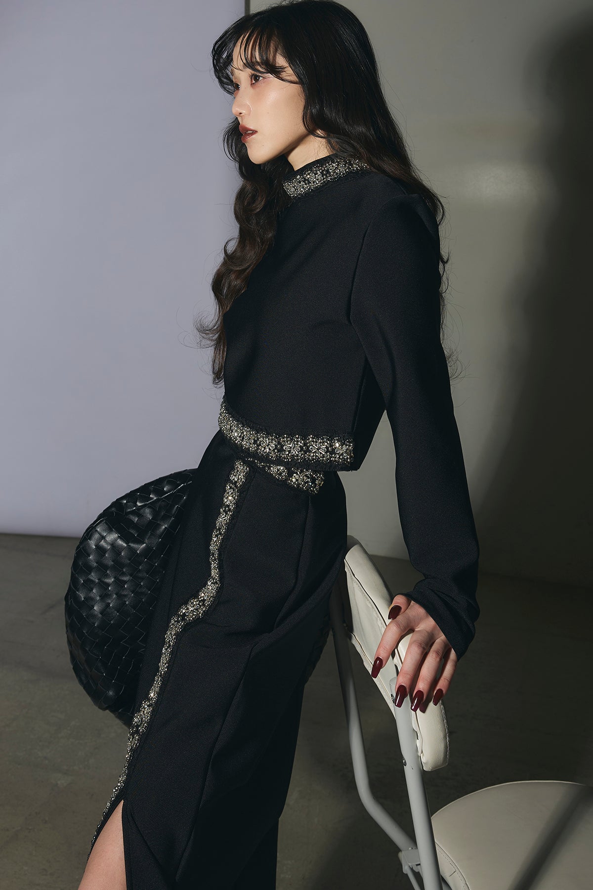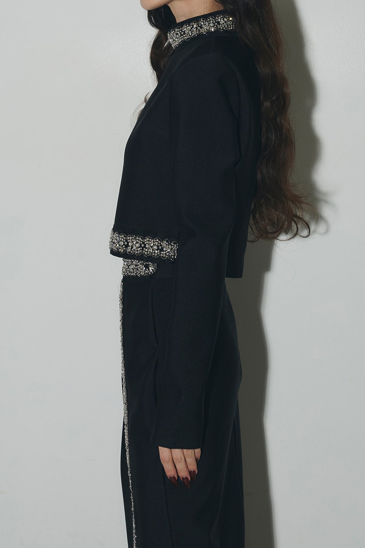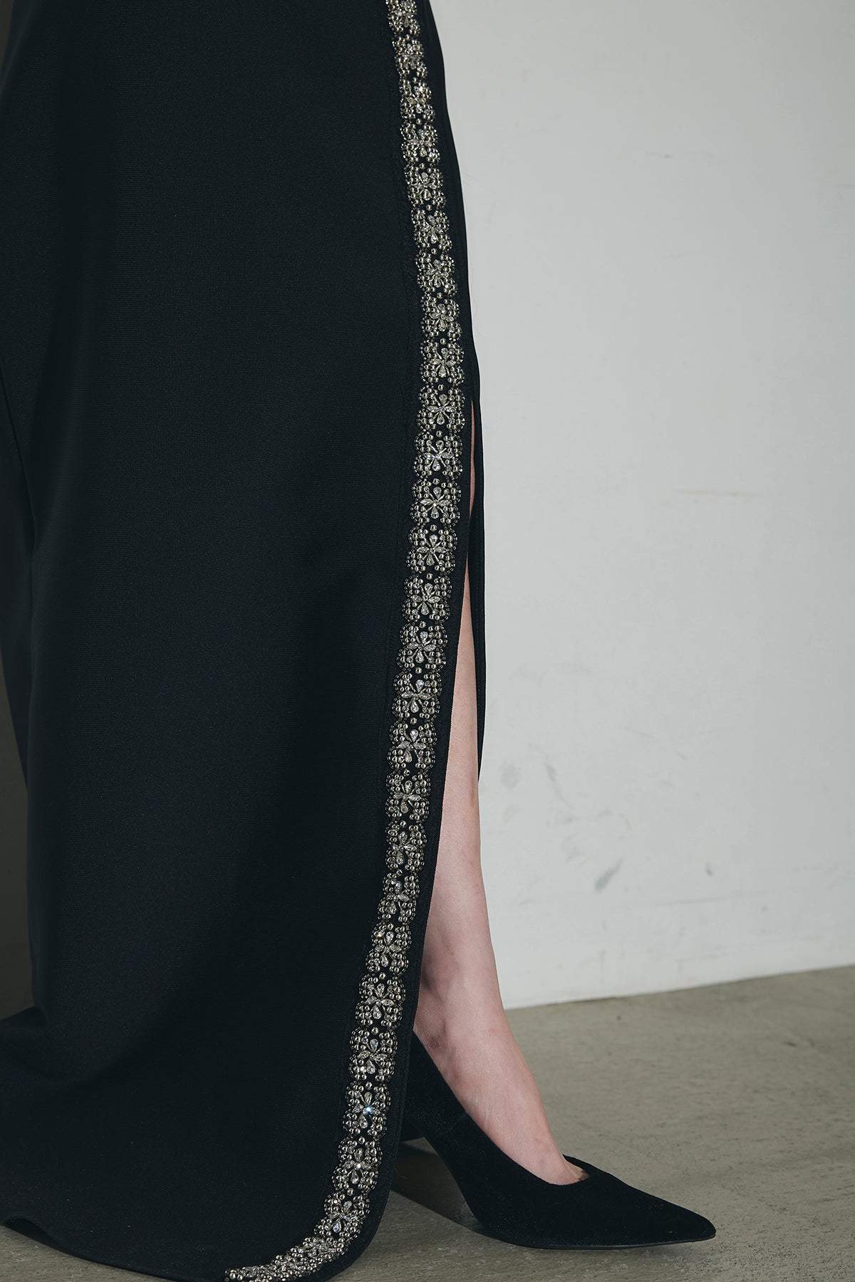 ビジュー使いが目を引くトップスとスカートのセットアップ。 トップスはショート丈でバランス良く、スカートは縦ラインとスリットで動きをプラス。 それぞれ単品使いもでき、オケージョンからデイリーまで幅広く活躍します。