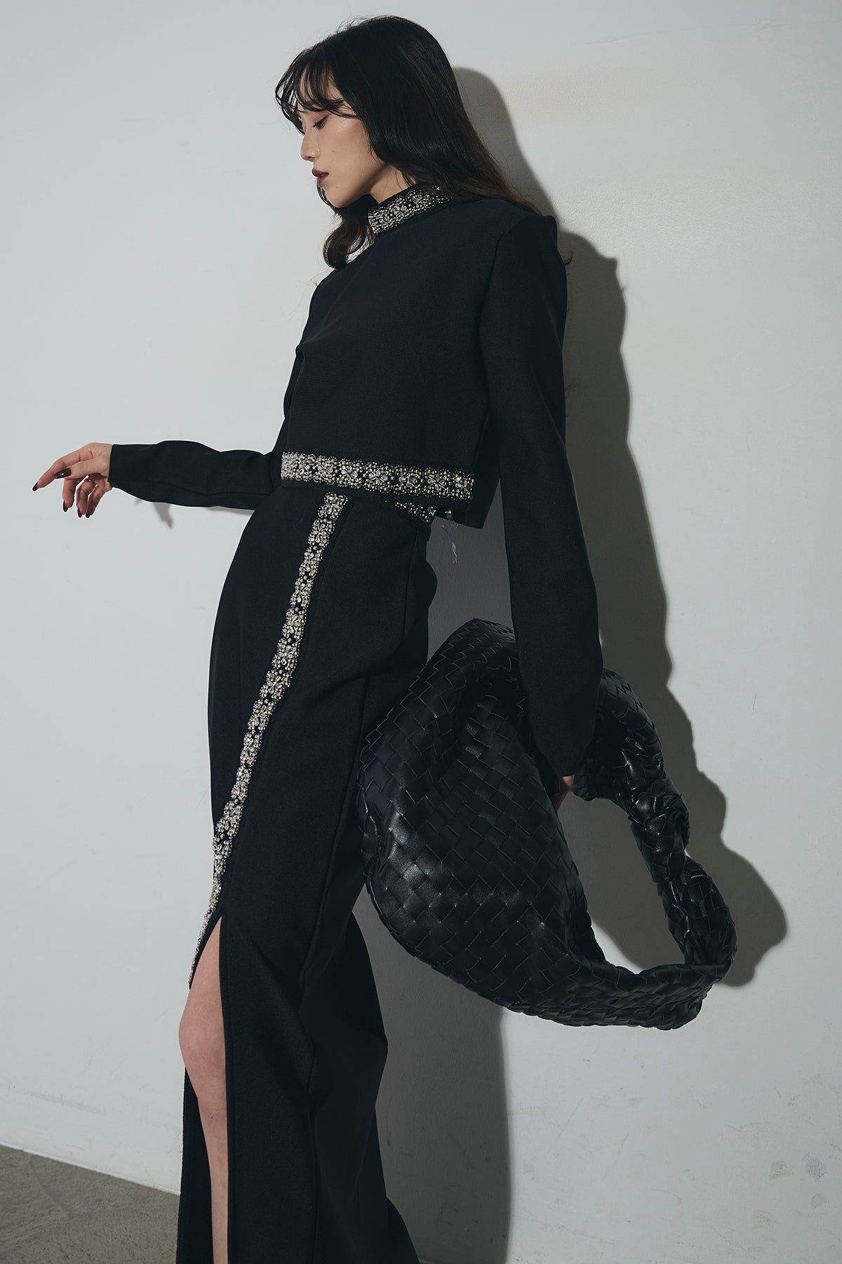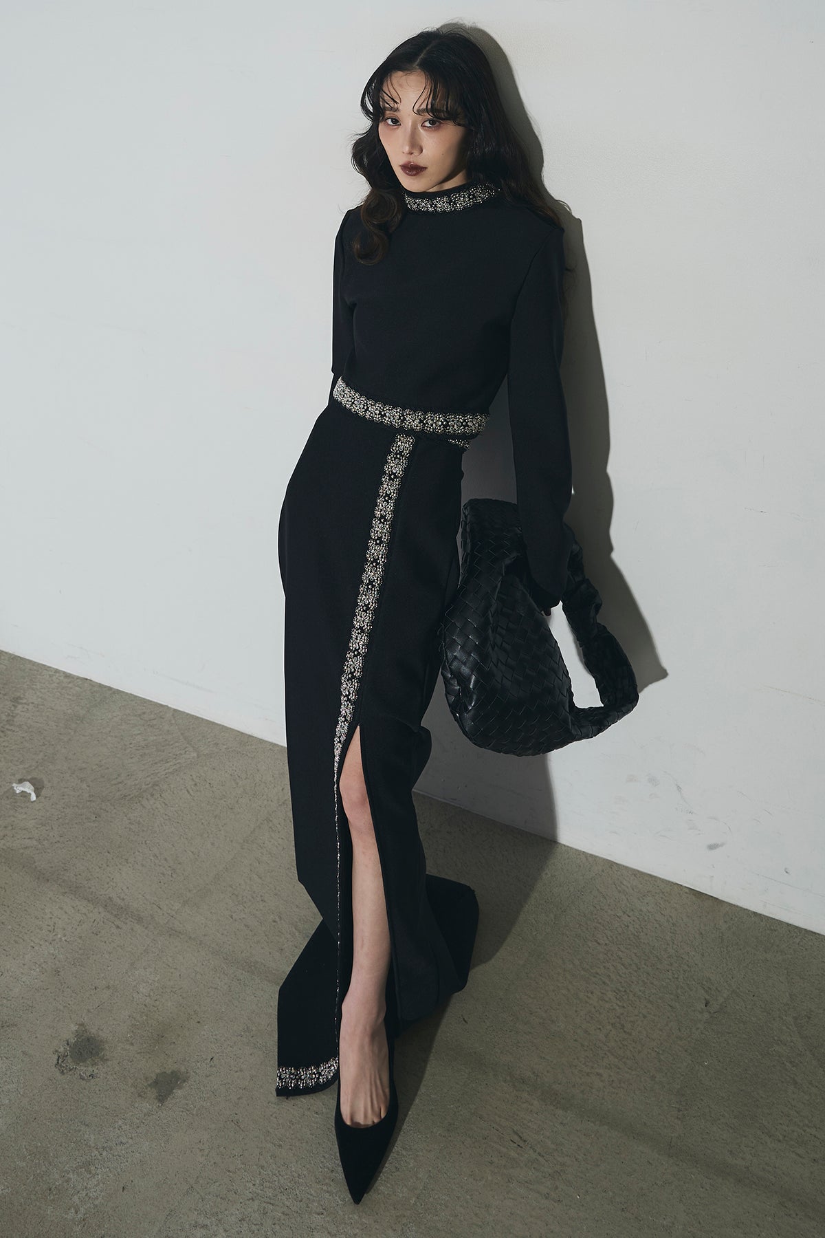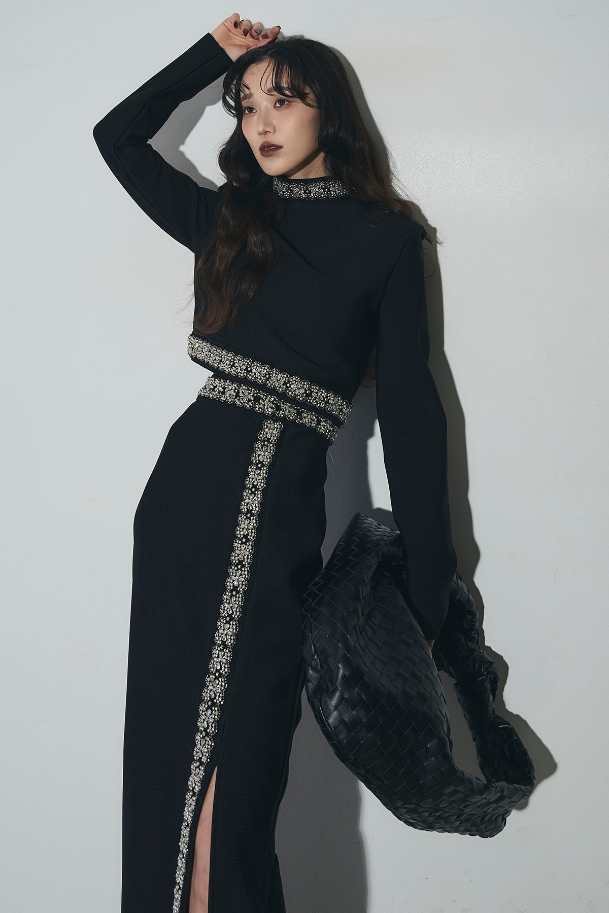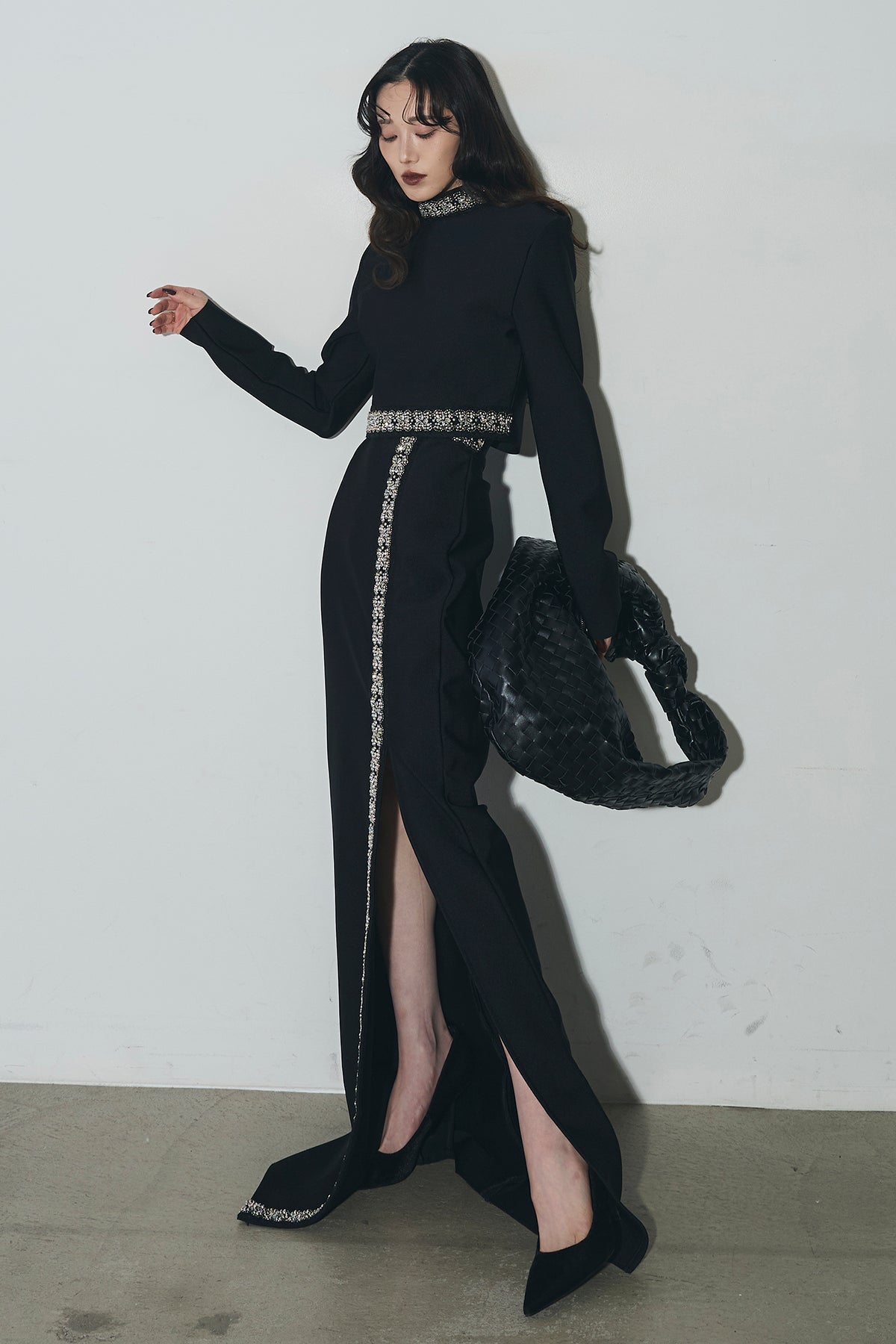 ビジュー使いが目を引くトップスとスカートのセットアップ。 トップスはショート丈でバランス良く、スカートは縦ラインとスリットで動きをプラス。 それぞれ単品使いもでき、オケージョンからデイリーまで幅広く活躍します。