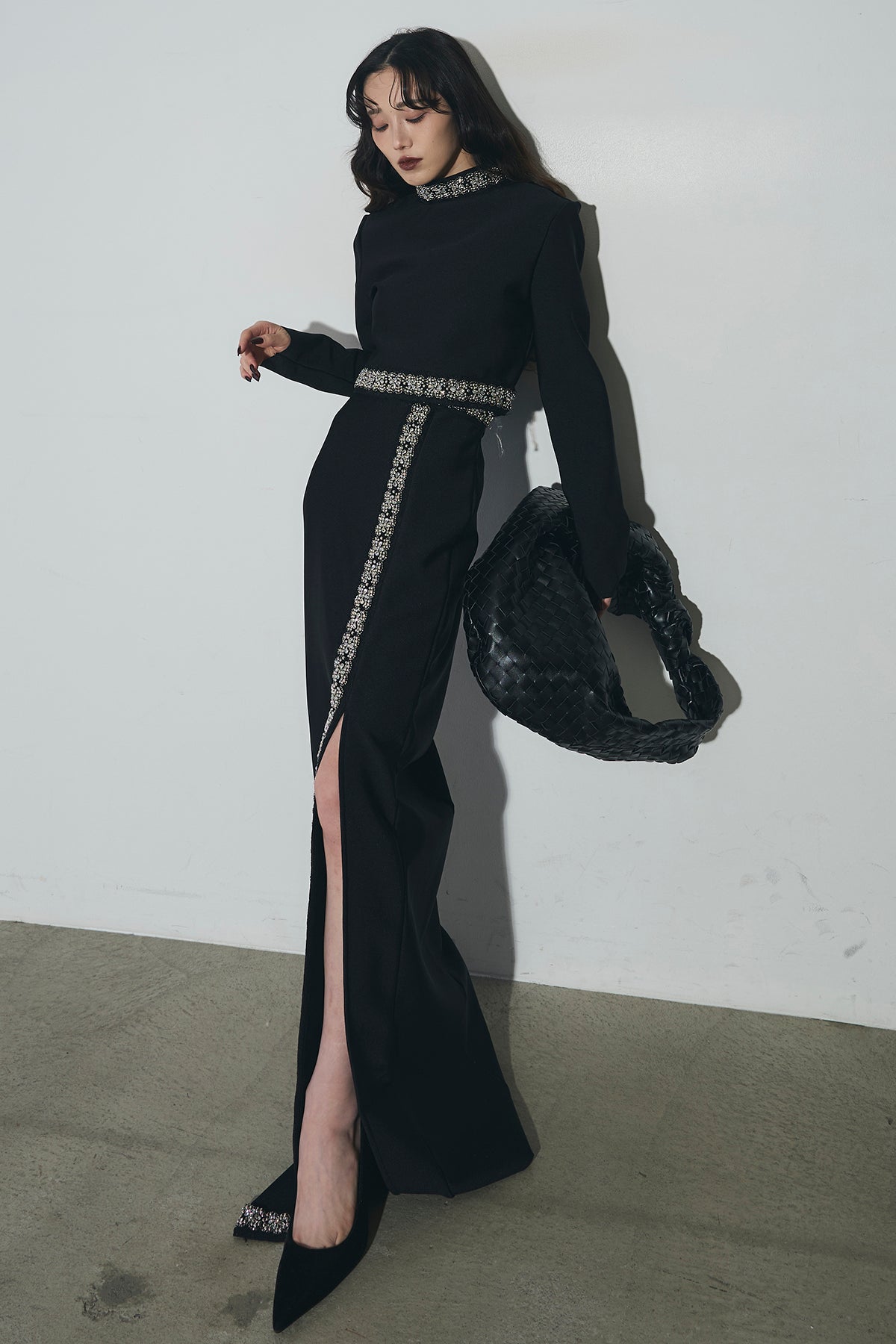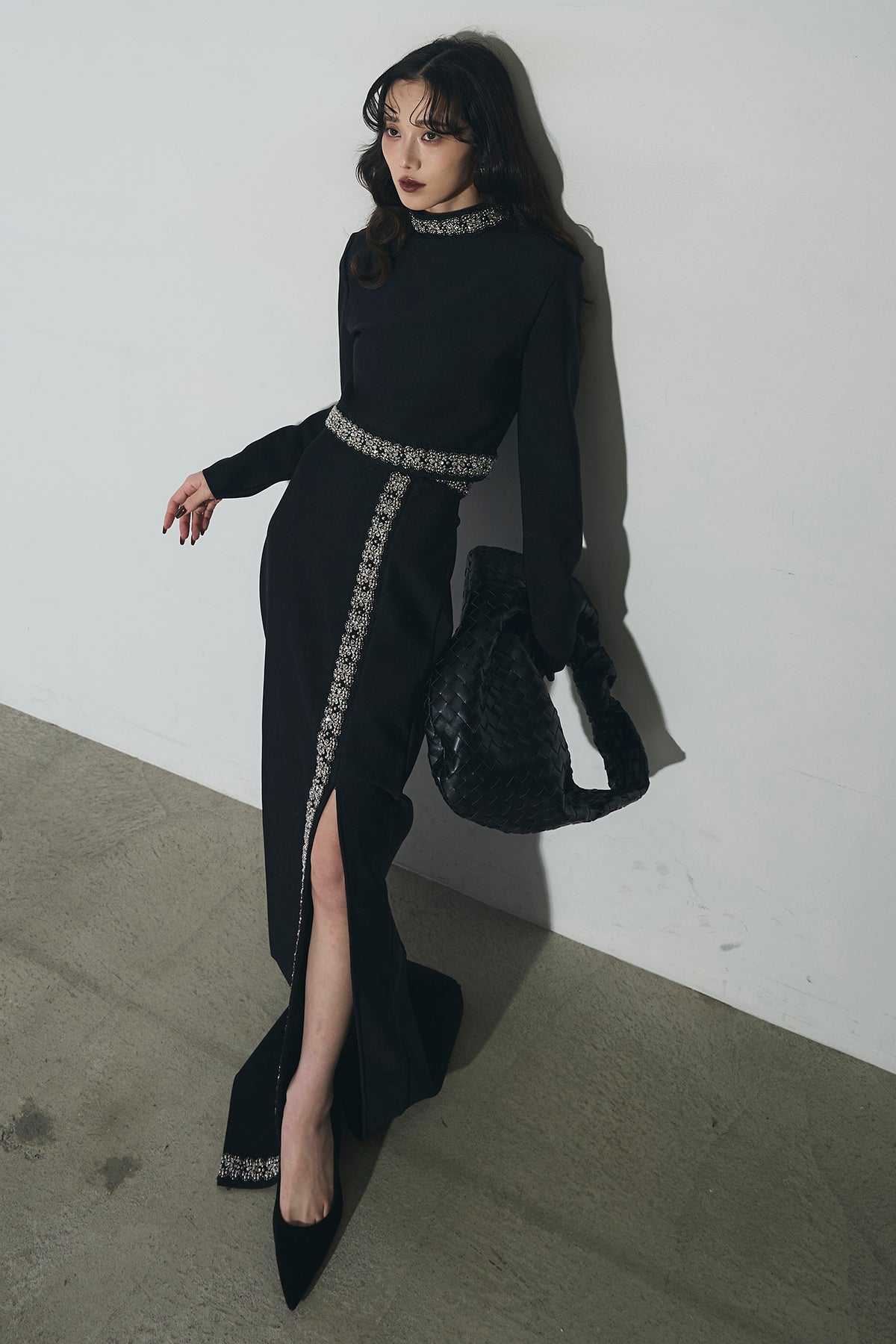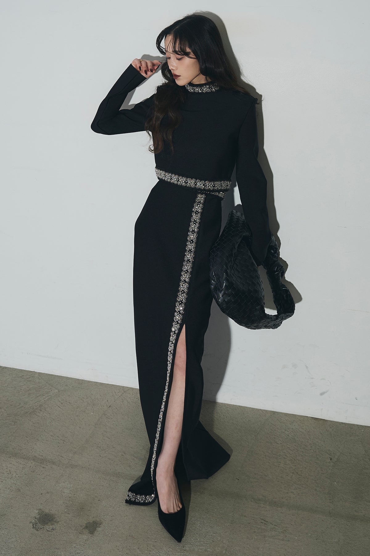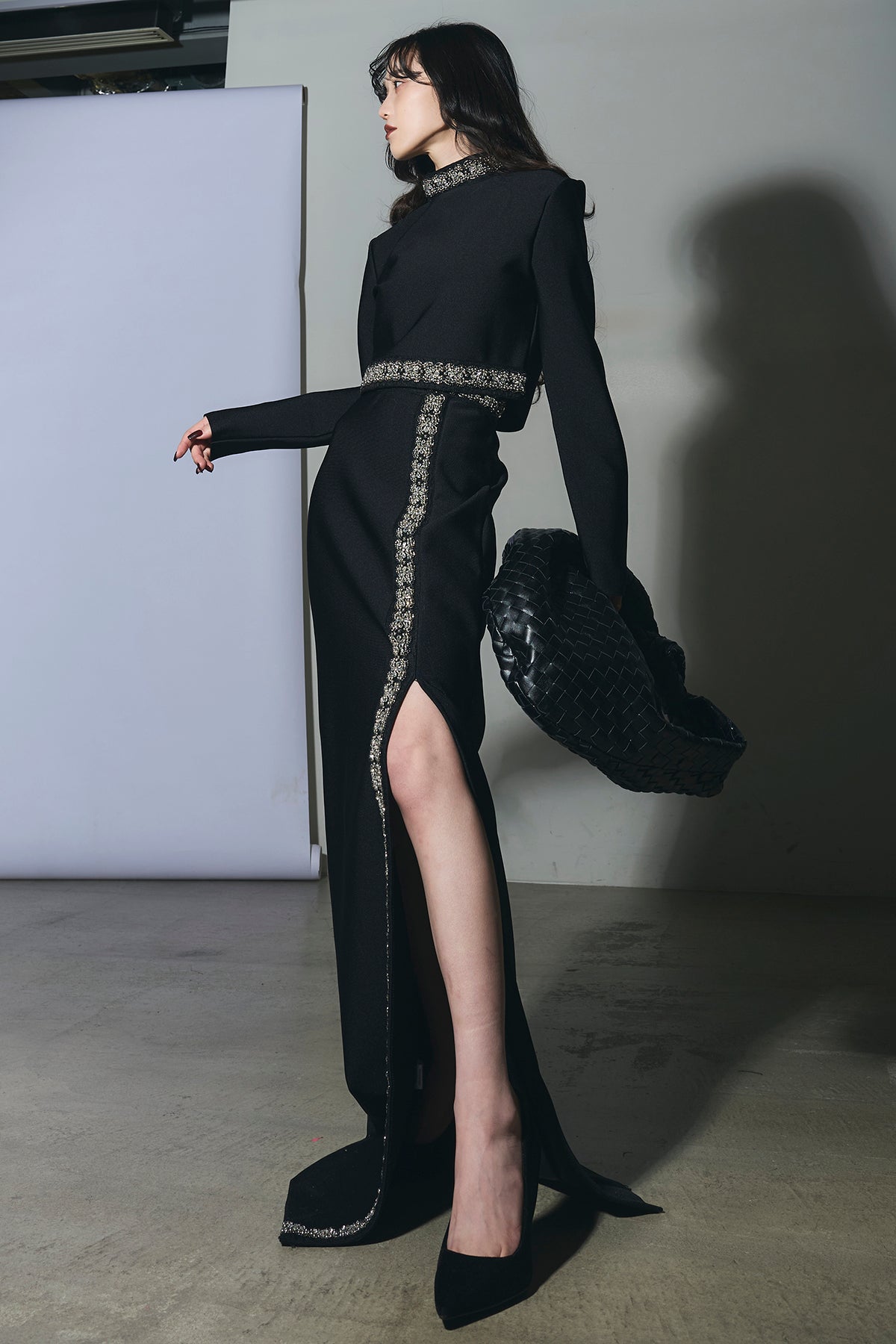 ビジュー使いが目を引くトップスとスカートのセットアップ。 トップスはショート丈でバランス良く、スカートは縦ラインとスリットで動きをプラス。 それぞれ単品使いもでき、オケージョンからデイリーまで幅広く活躍します。