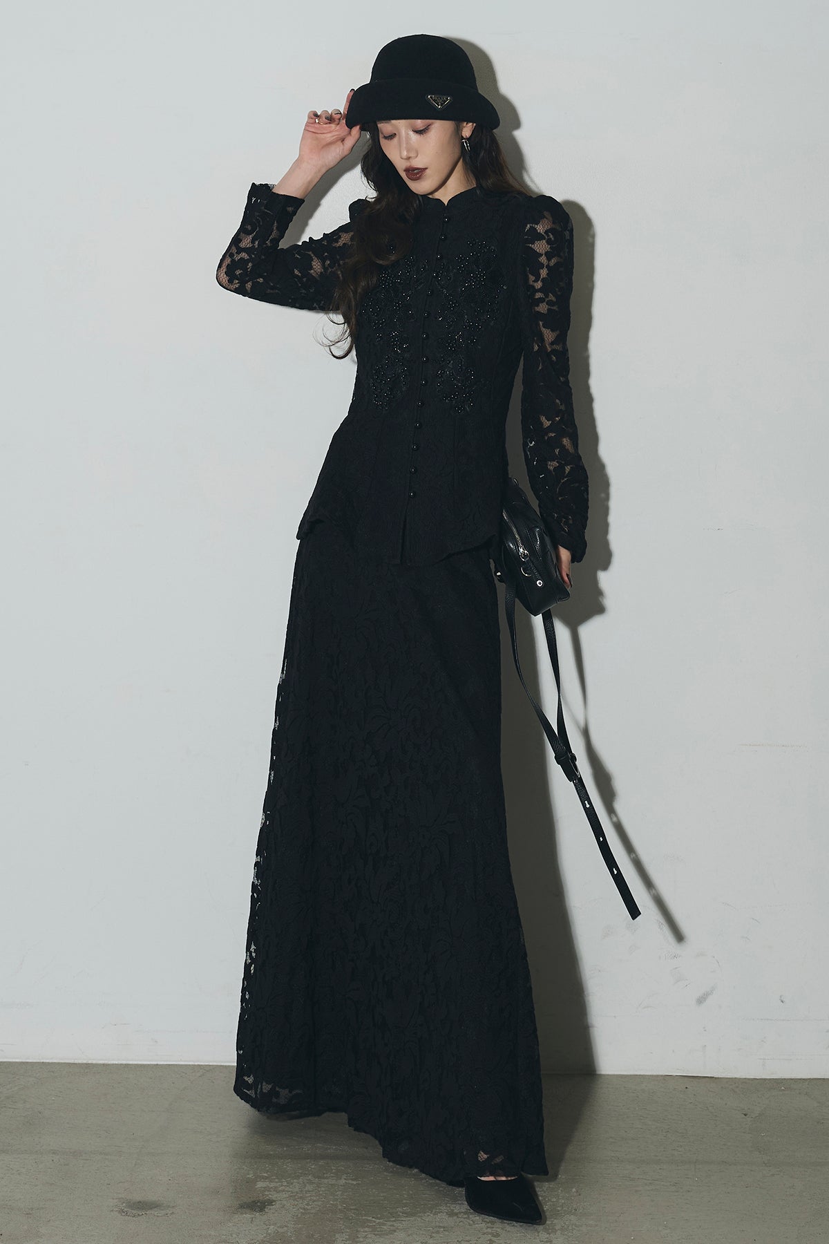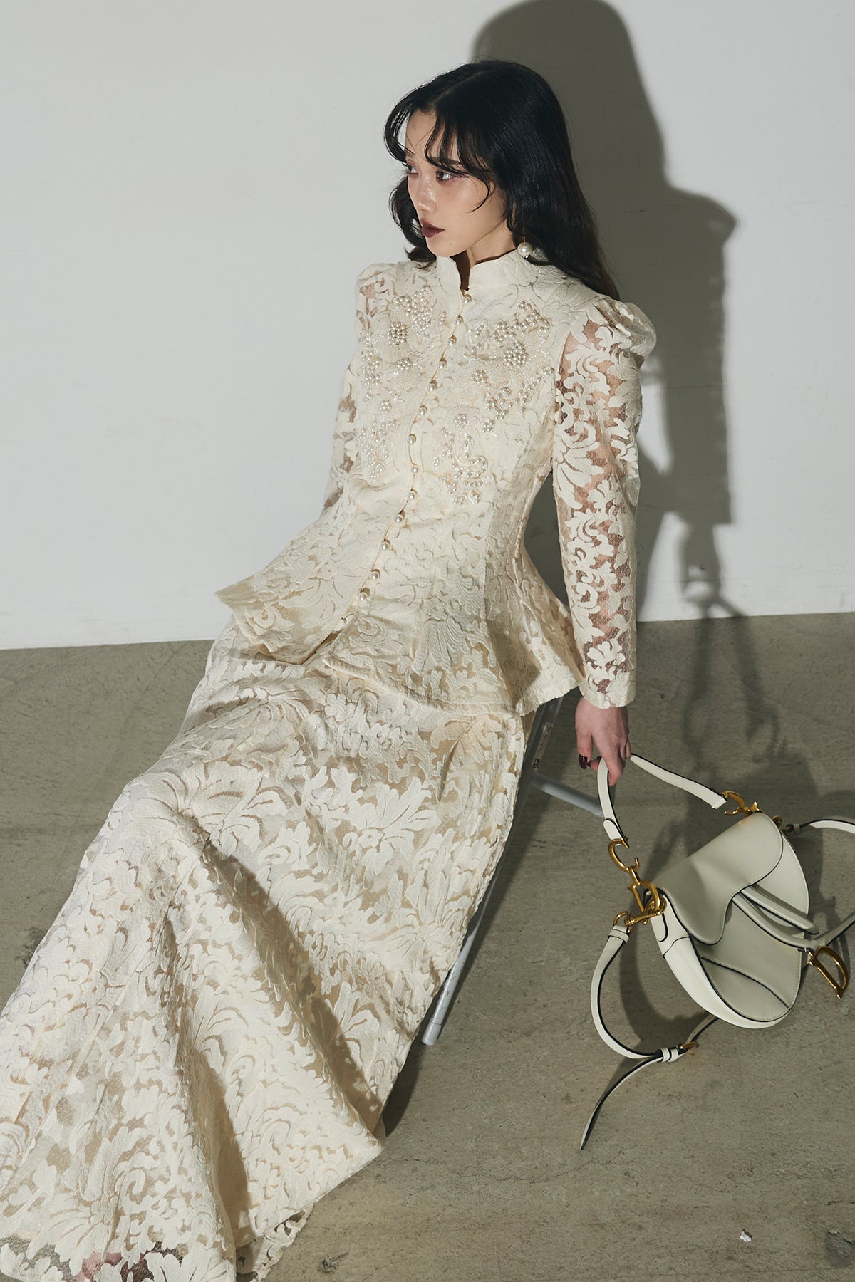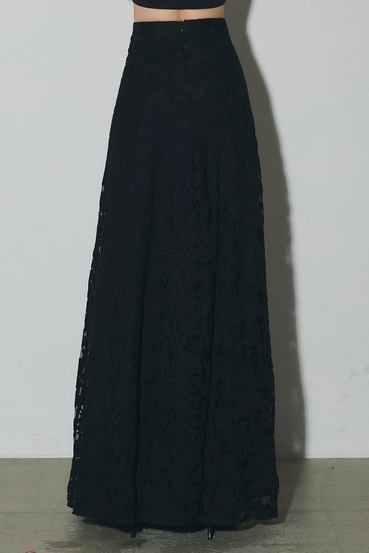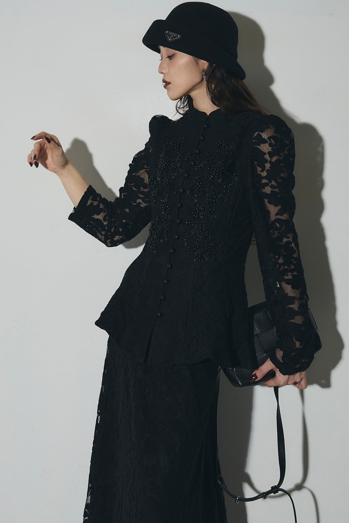 繊細なレース素材を使用した、上品さとモード感を兼ね備えたセットアップ。トップスはコンパクトなシルエットで、程よい肌見せが女性らしさを引き立てます。スカートは縦ラインを強調するデザインで、スタイルアップ効果も◎。それぞれ単品使いはもちろん、セットで着用すれば特別感のある洗練されたコーディネートが完成します。