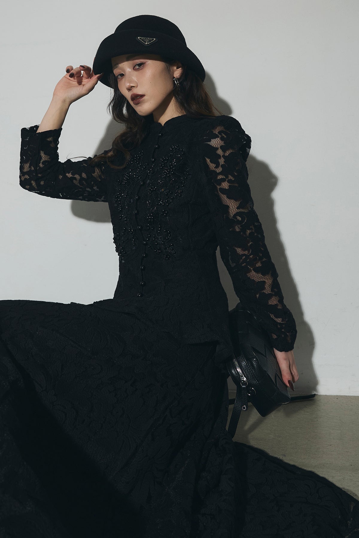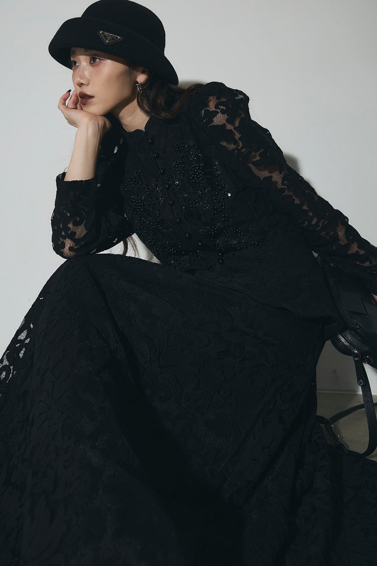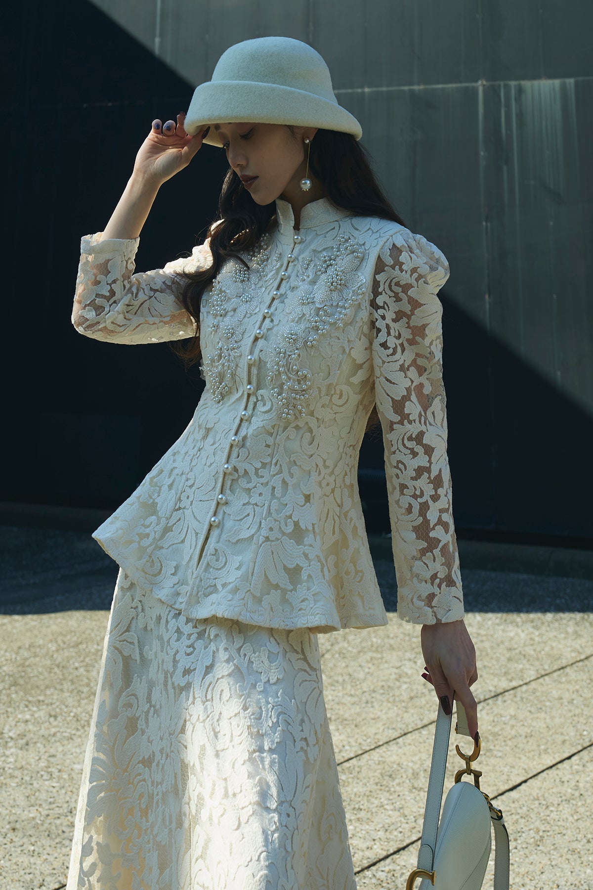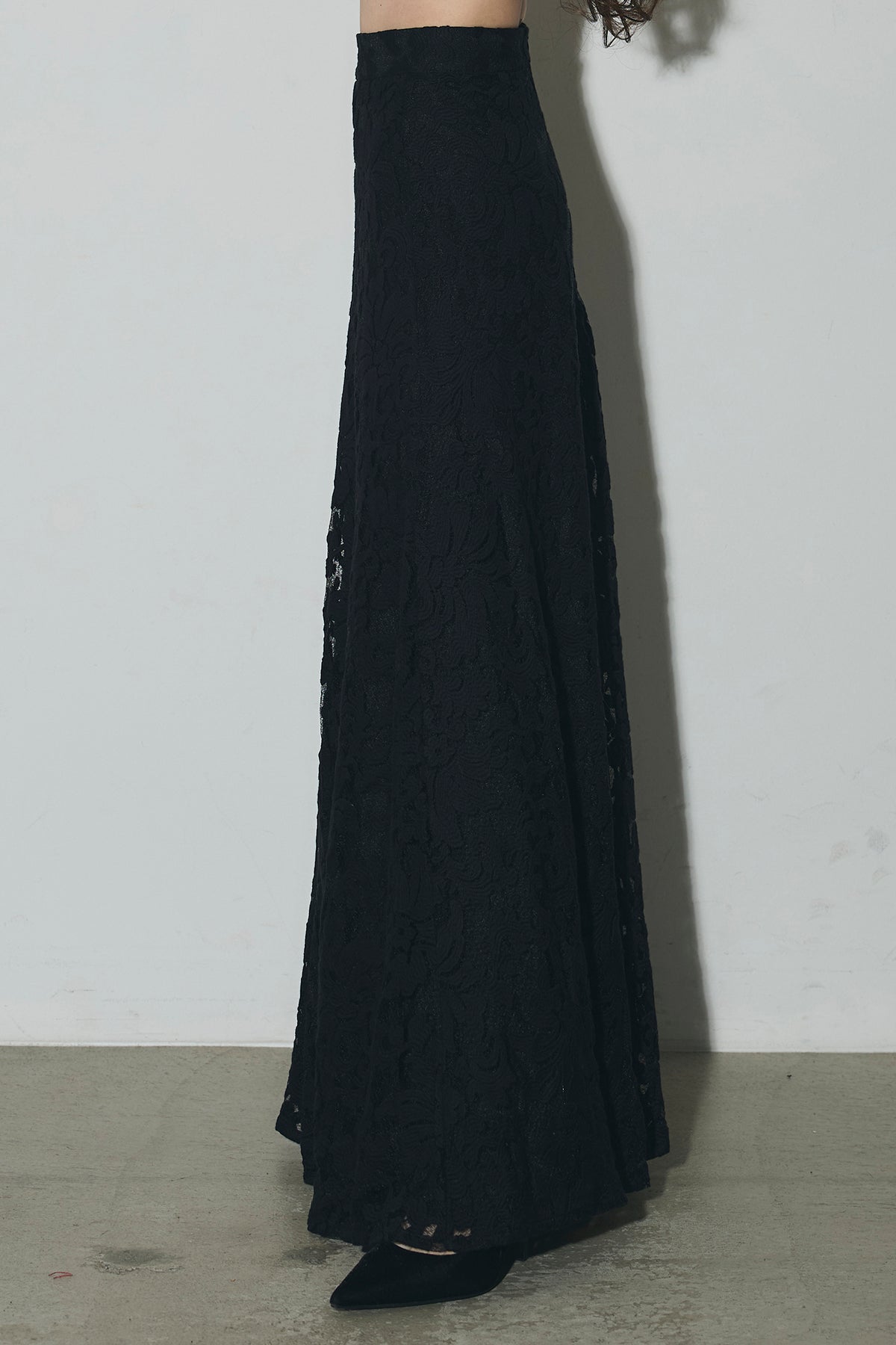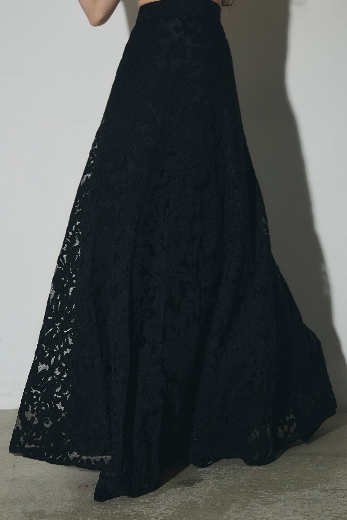 繊細なレース素材を使用した、上品さとモード感を兼ね備えたセットアップ。トップスはコンパクトなシルエットで、程よい肌見せが女性らしさを引き立てます。スカートは縦ラインを強調するデザインで、スタイルアップ効果も◎。それぞれ単品使いはもちろん、セットで着用すれば特別感のある洗練されたコーディネートが完成します。