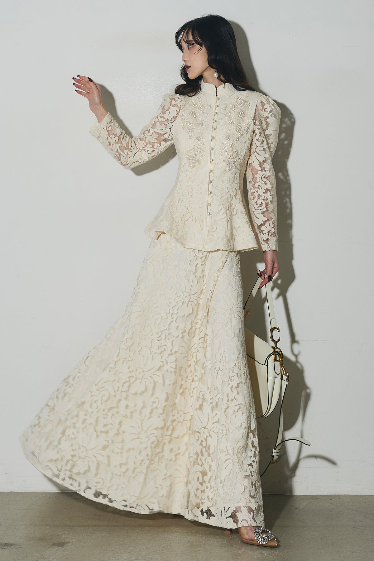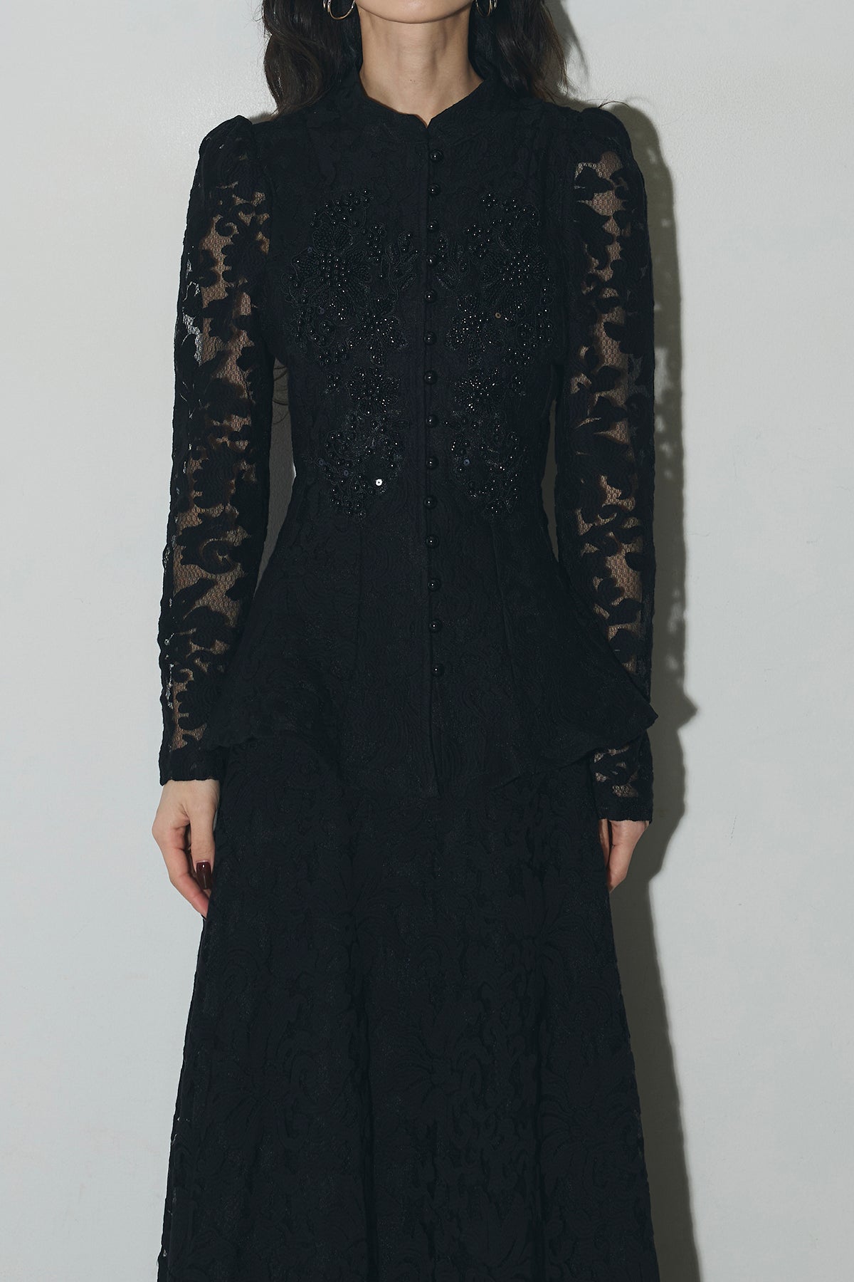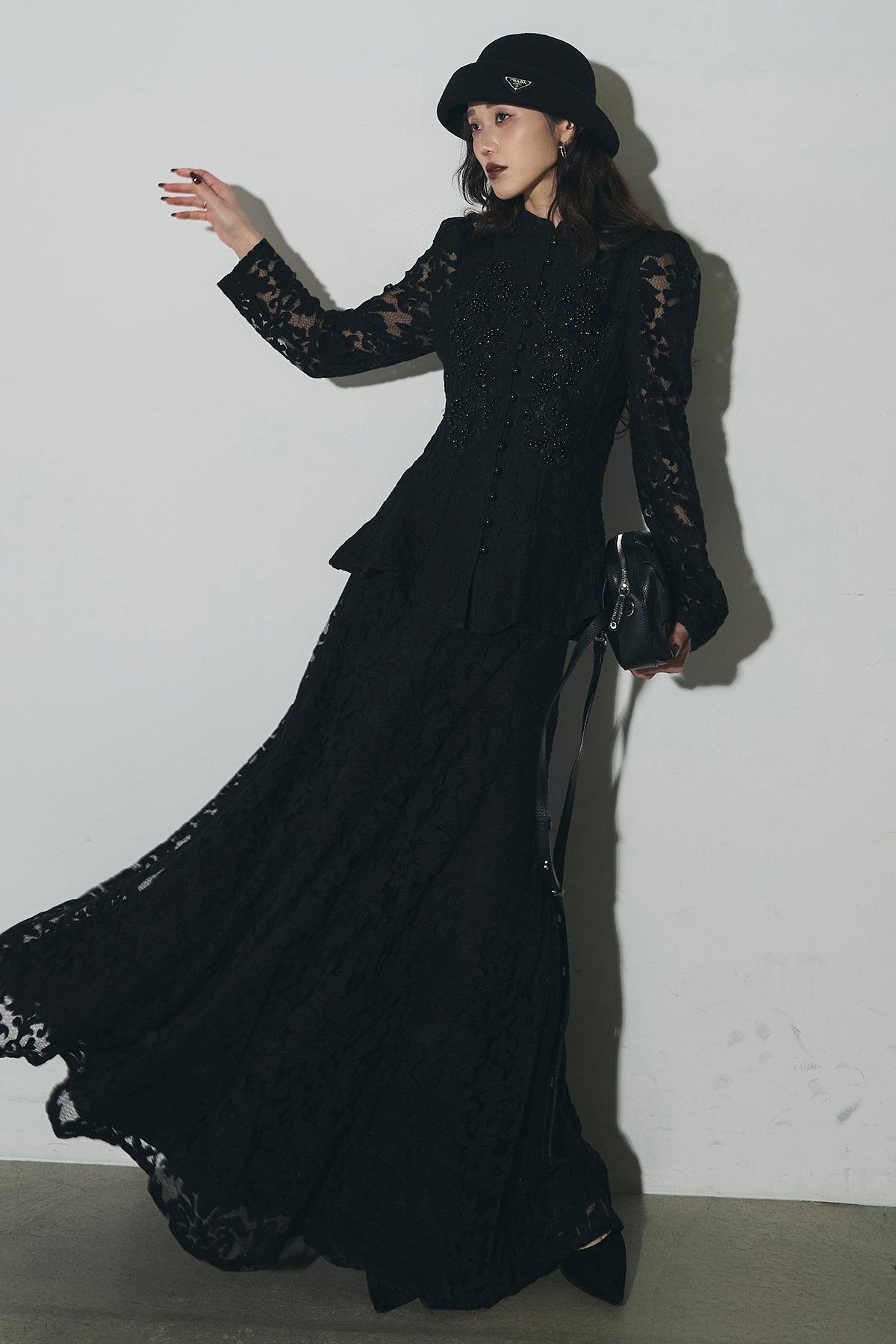 ビジューレースペプラムブラウス&レースフレアスカート