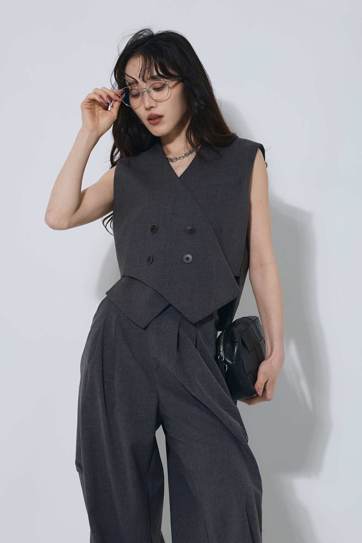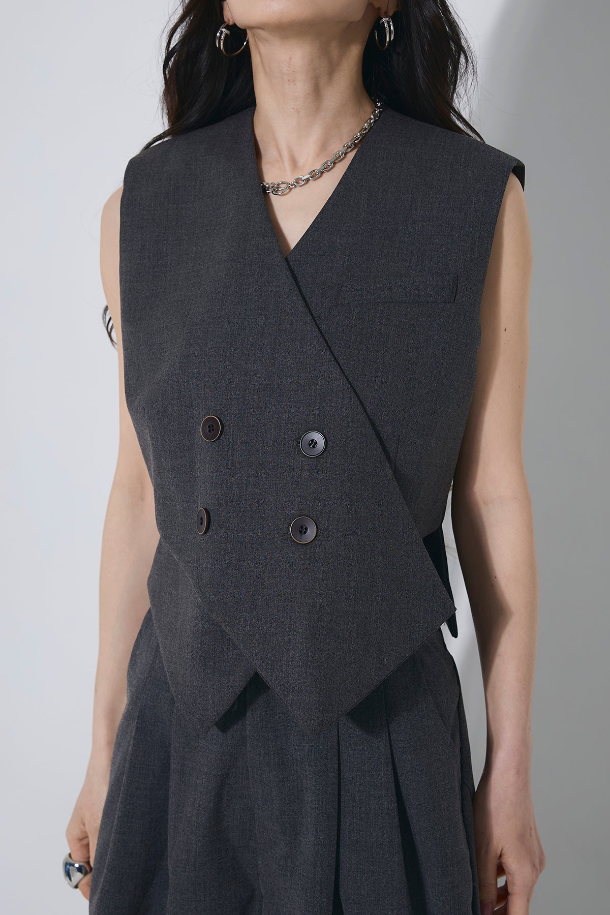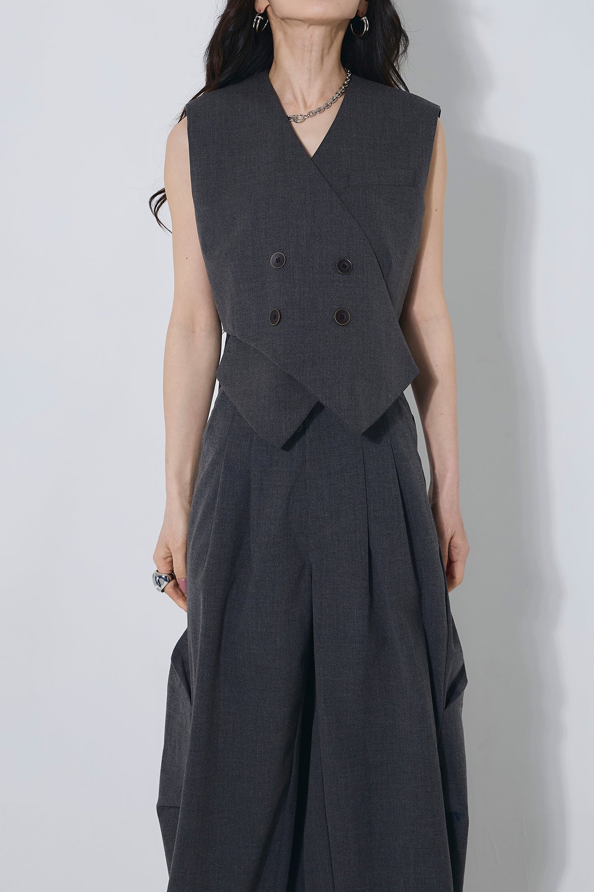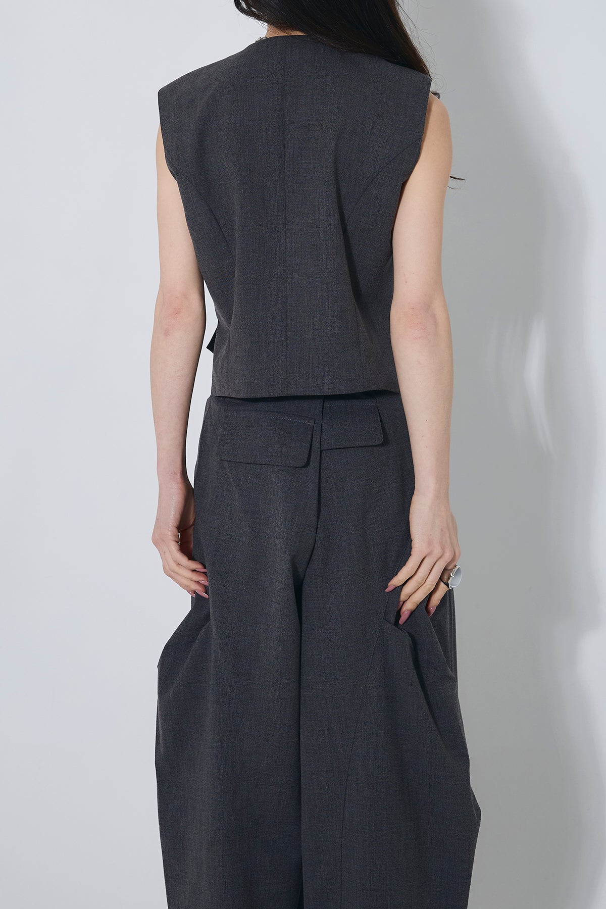 ご注文前に必ずページ下部「お届け期間」をご確認くださいませ。すっきりとしたシルエットが魅力のベスト。ミニマルなデザインで、上品かつ洗練された印象に仕上がります。別売りのパンツとセットでの着用もおすすめです。