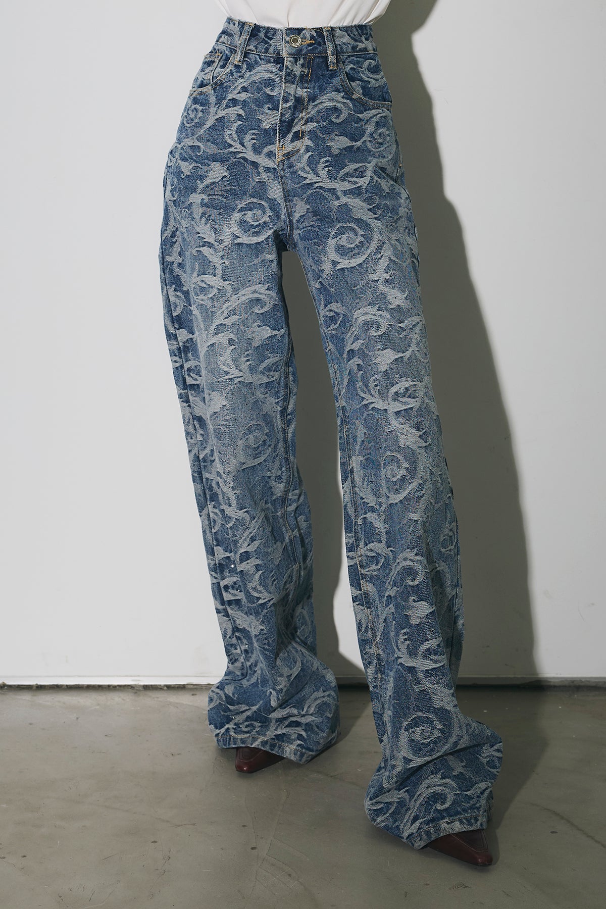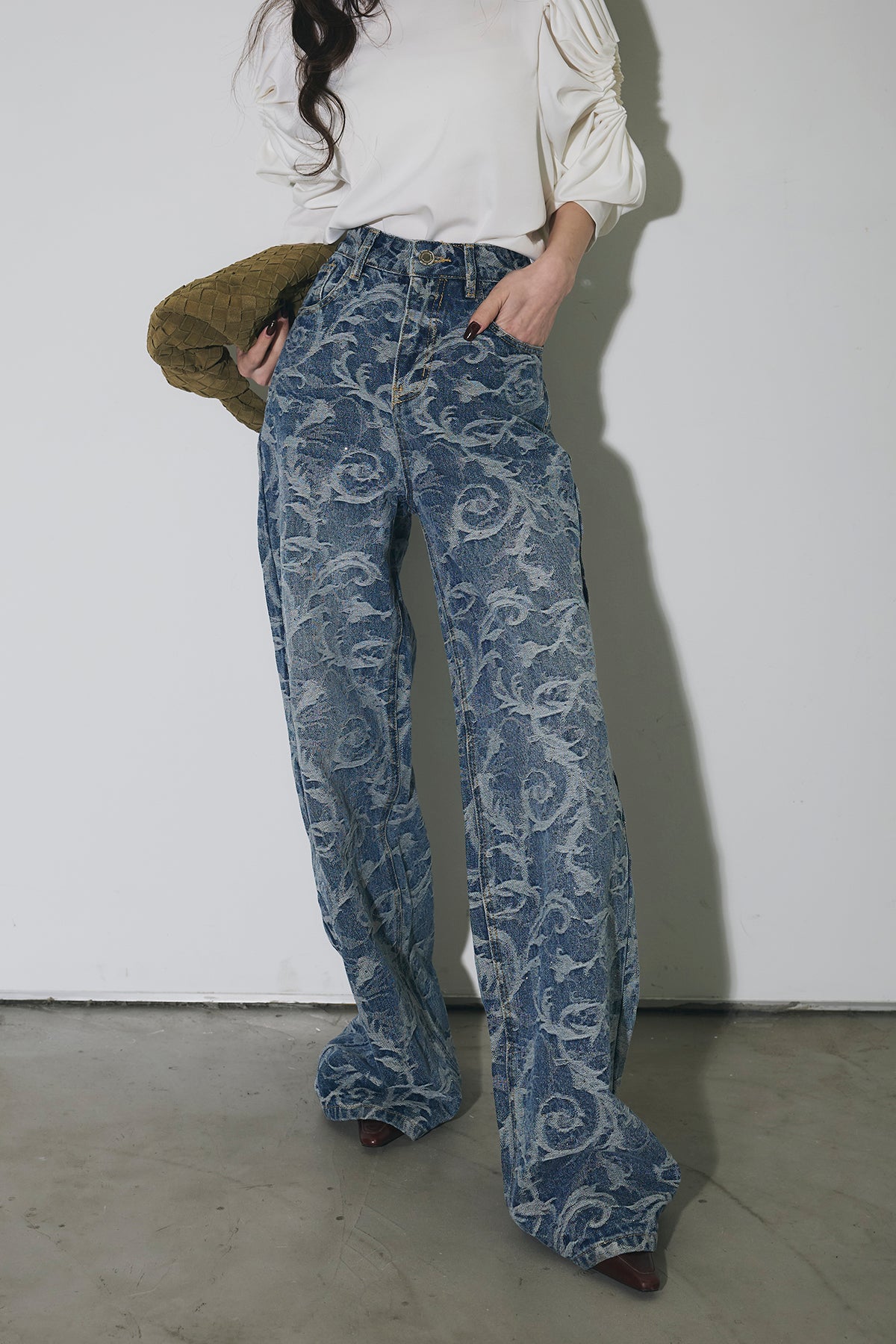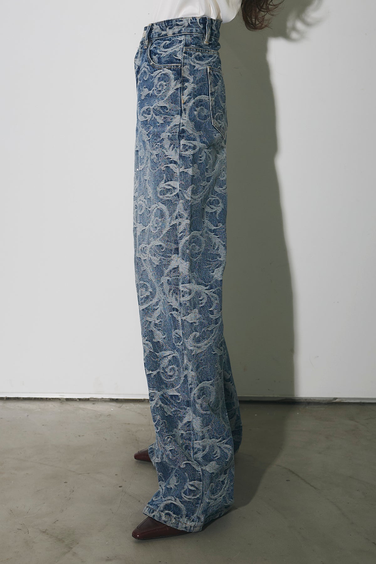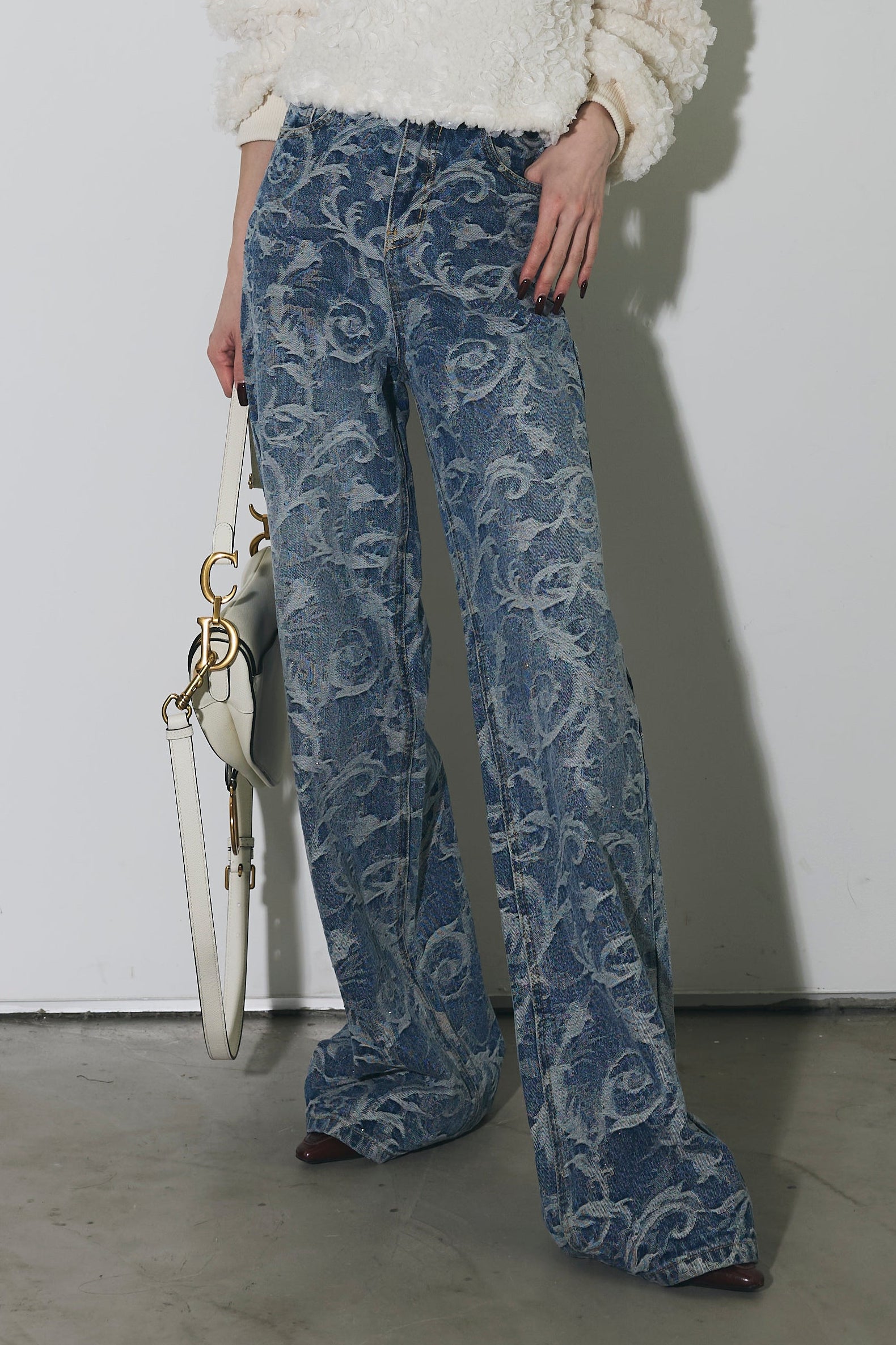 全面に施されたアートライクな柄がスタイリングの主役になる一本。ストレート寄りのワイドシルエットで、脚のラインを拾いにくく、自然と縦のラインを強調してくれます。ウエストまわりはすっきりとした設計で、トップスをインしてもバランス良く着用可能。シンプルなトップスと合わせるだけでコーディネートが完成し、きれいめからカジュアルまで幅広いスタイリングに対応します。デニムながらも個性を楽しめる、ワードローブに加えたいアイテムです。