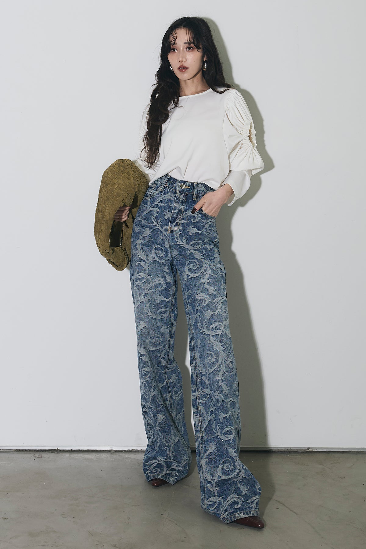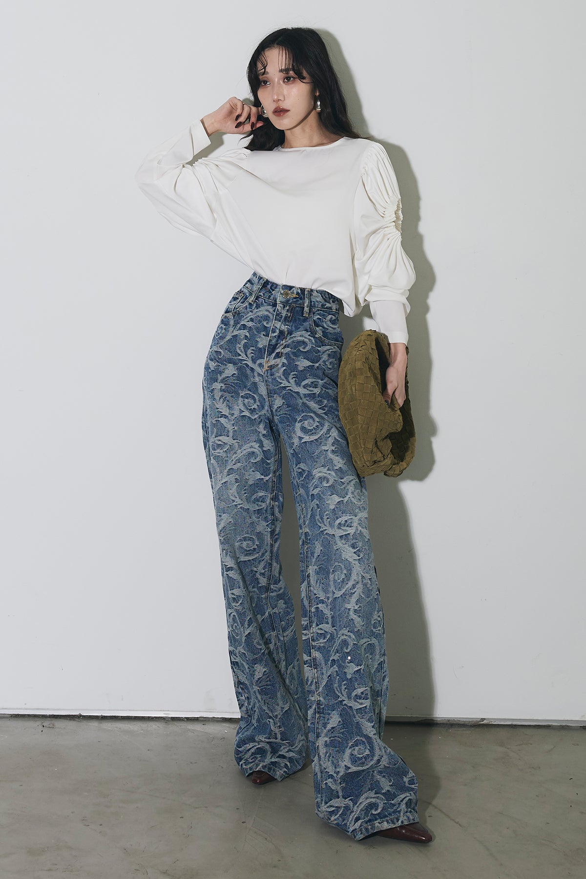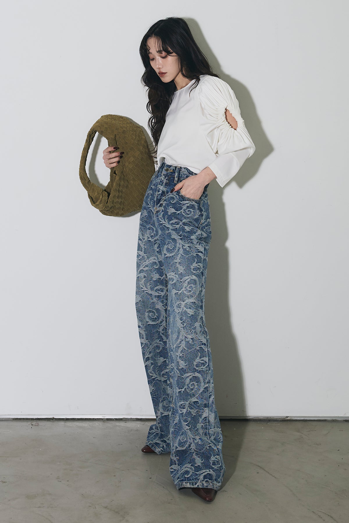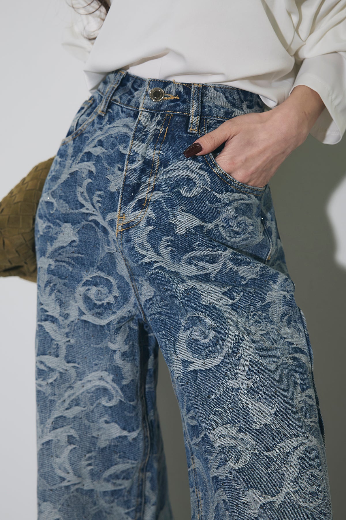 全面に施されたアートライクな柄がスタイリングの主役になる一本。ストレート寄りのワイドシルエットで、脚のラインを拾いにくく、自然と縦のラインを強調してくれます。ウエストまわりはすっきりとした設計で、トップスをインしてもバランス良く着用可能。シンプルなトップスと合わせるだけでコーディネートが完成し、きれいめからカジュアルまで幅広いスタイリングに対応します。デニムながらも個性を楽しめる、ワードローブに加えたいアイテムです。