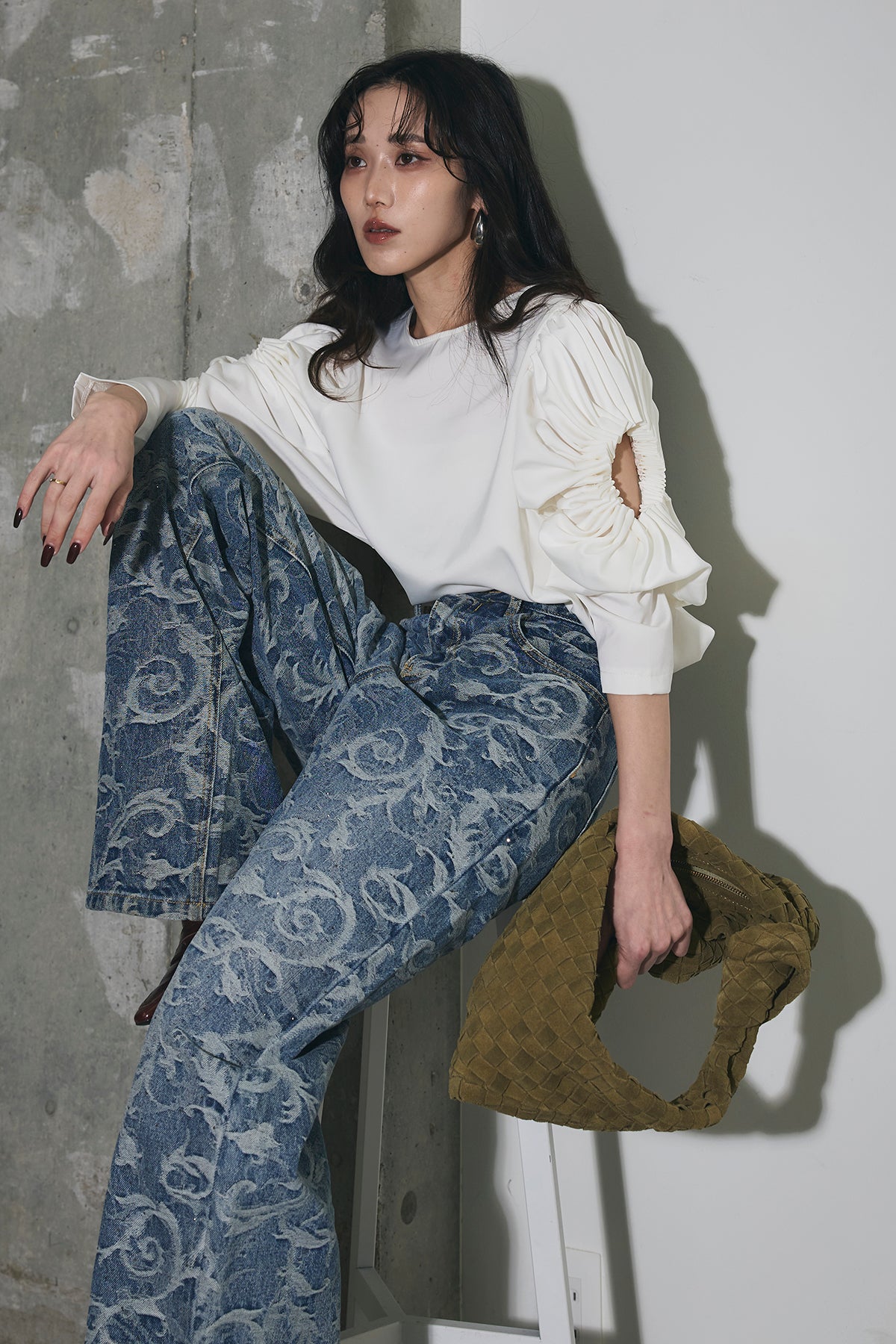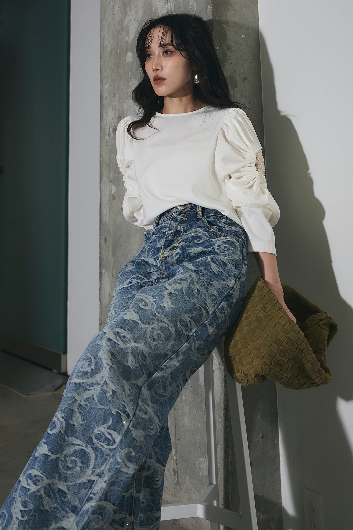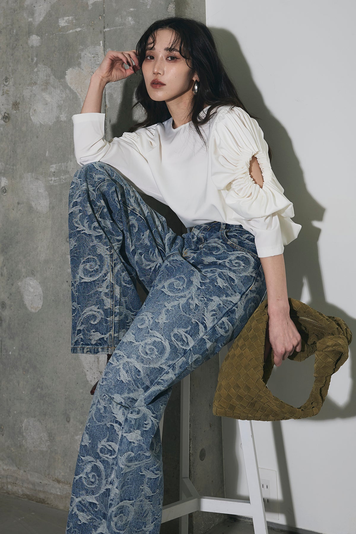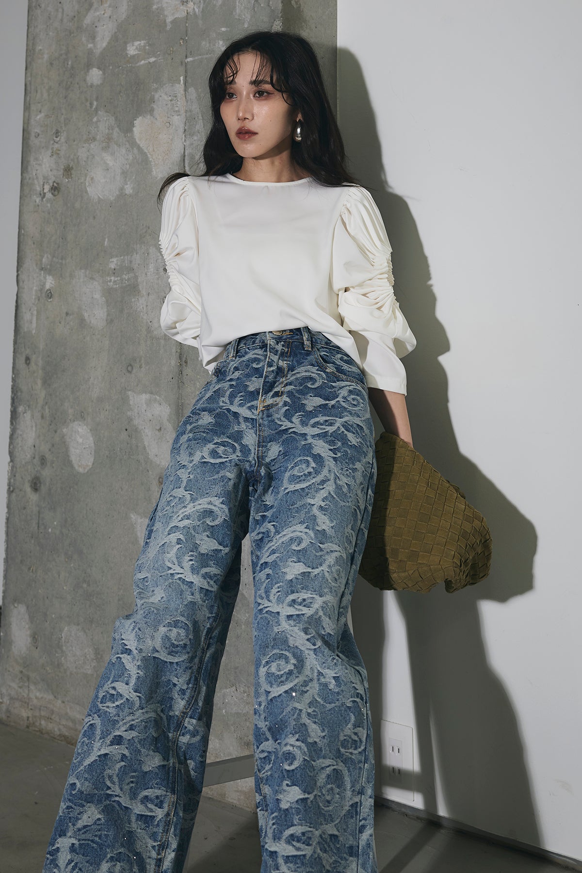 全面に施されたアートライクな柄がスタイリングの主役になる一本。ストレート寄りのワイドシルエットで、脚のラインを拾いにくく、自然と縦のラインを強調してくれます。ウエストまわりはすっきりとした設計で、トップスをインしてもバランス良く着用可能。シンプルなトップスと合わせるだけでコーディネートが完成し、きれいめからカジュアルまで幅広いスタイリングに対応します。デニムながらも個性を楽しめる、ワードローブに加えたいアイテムです。