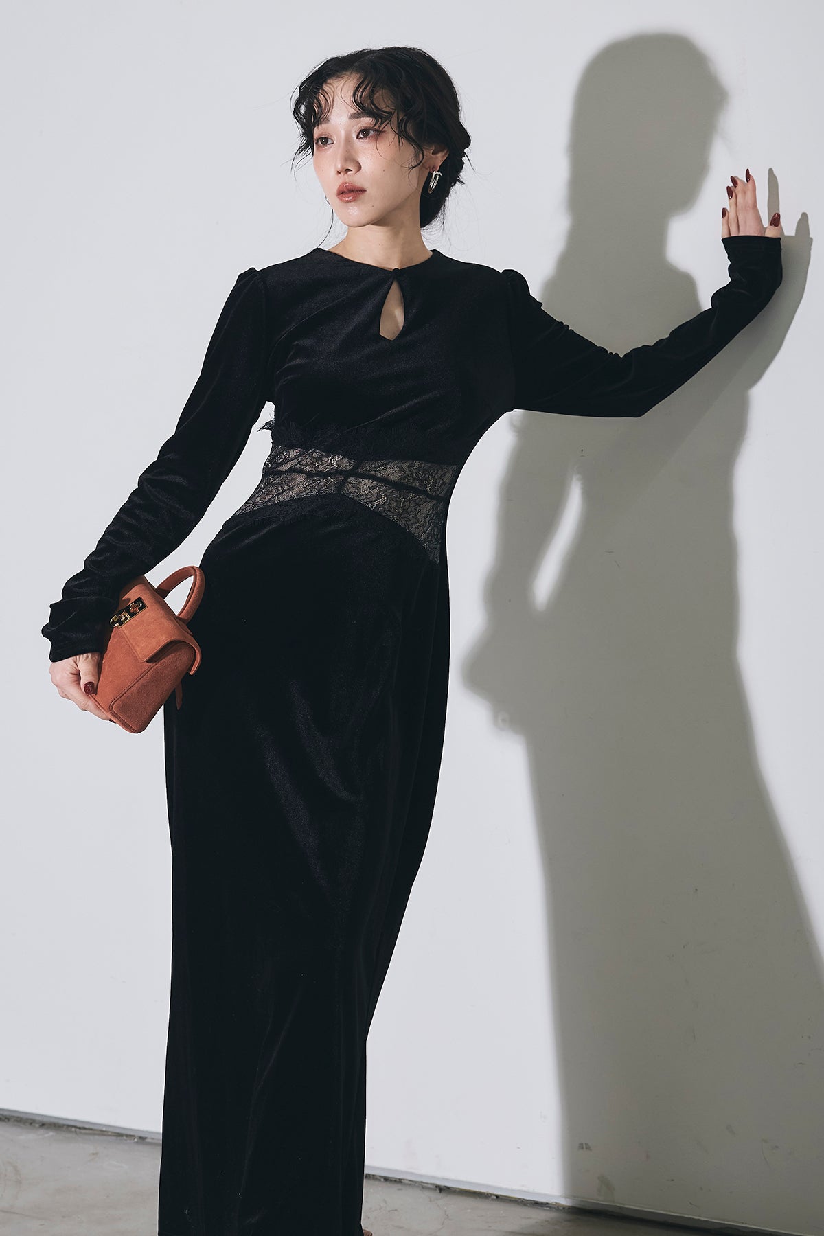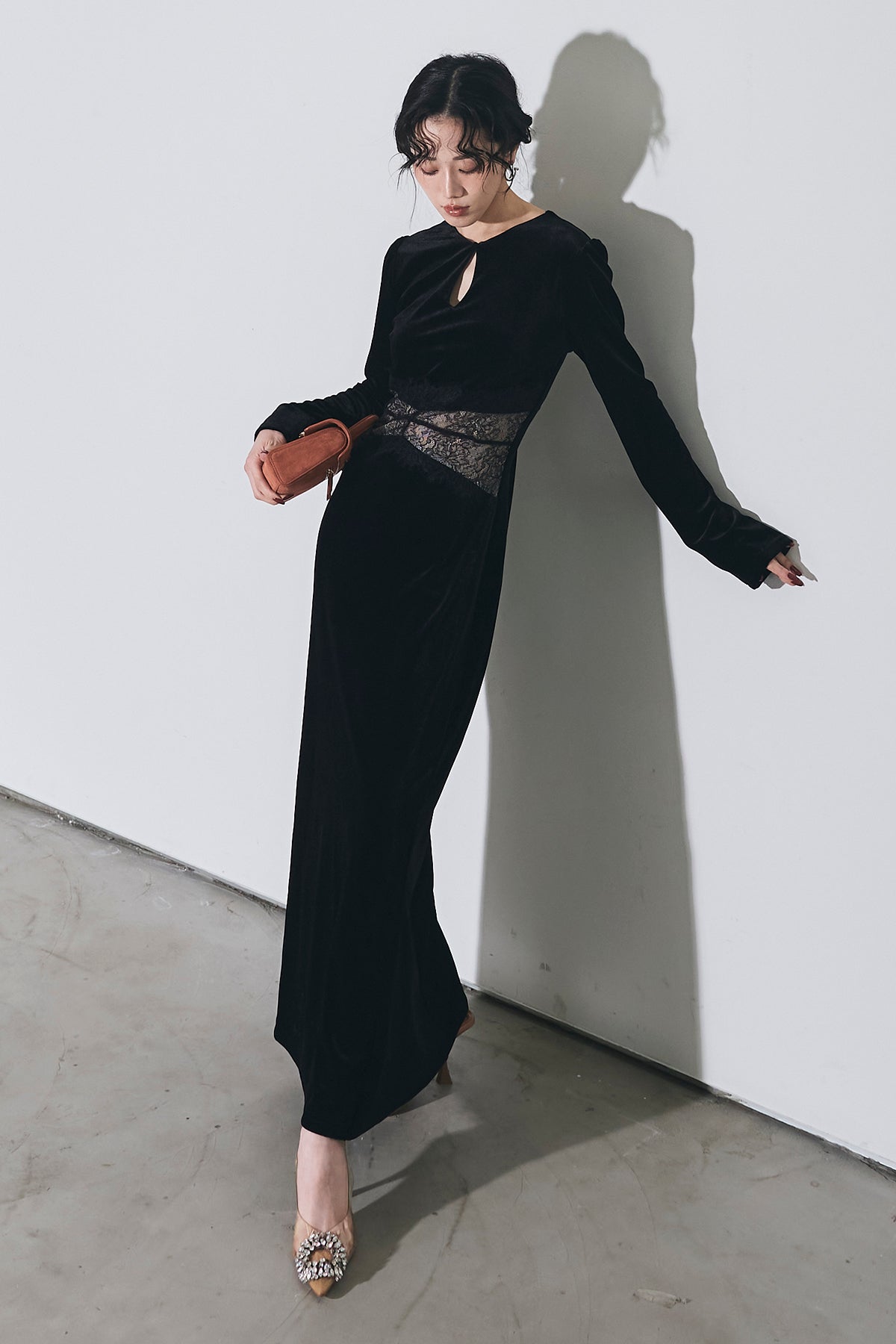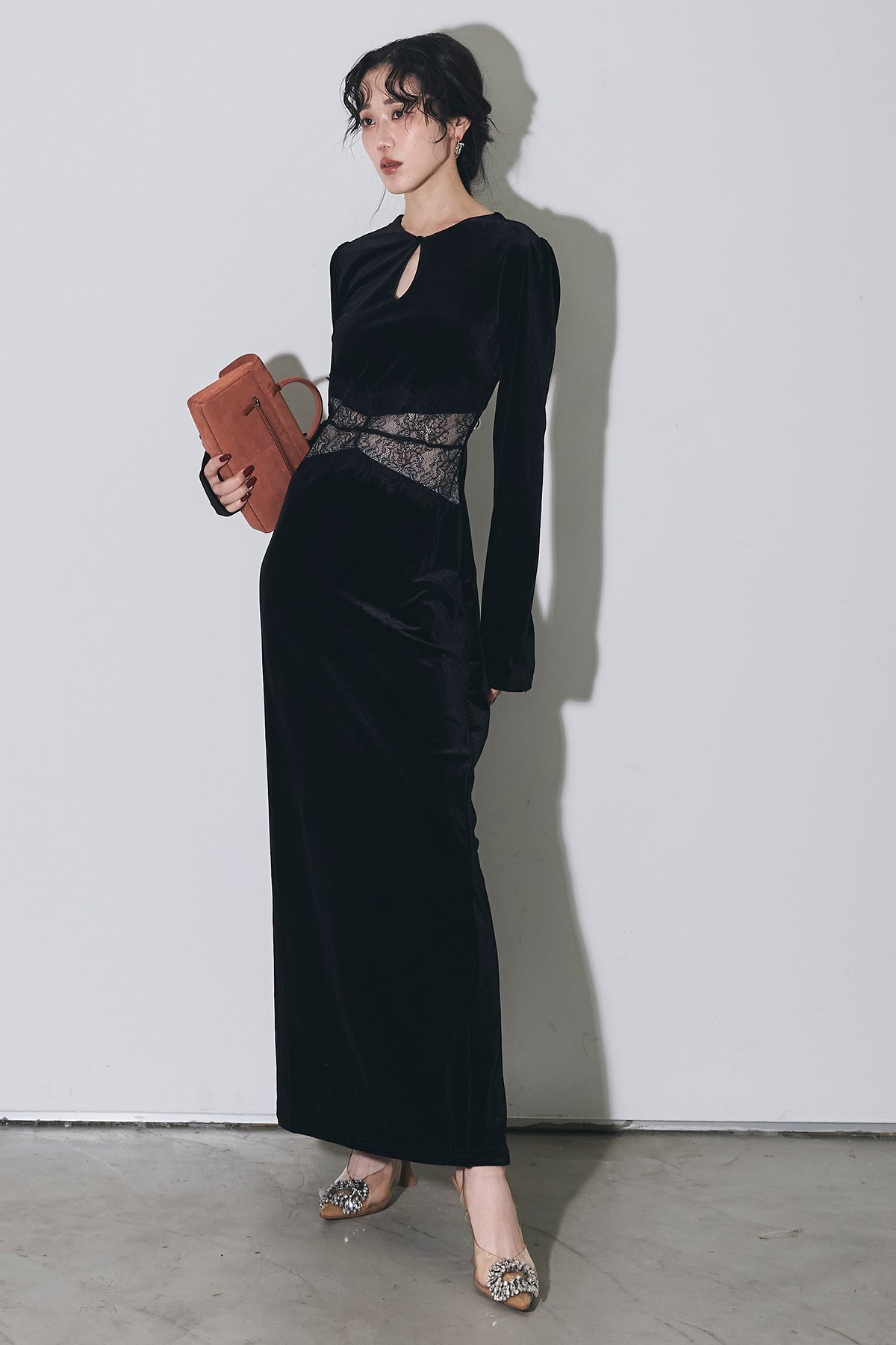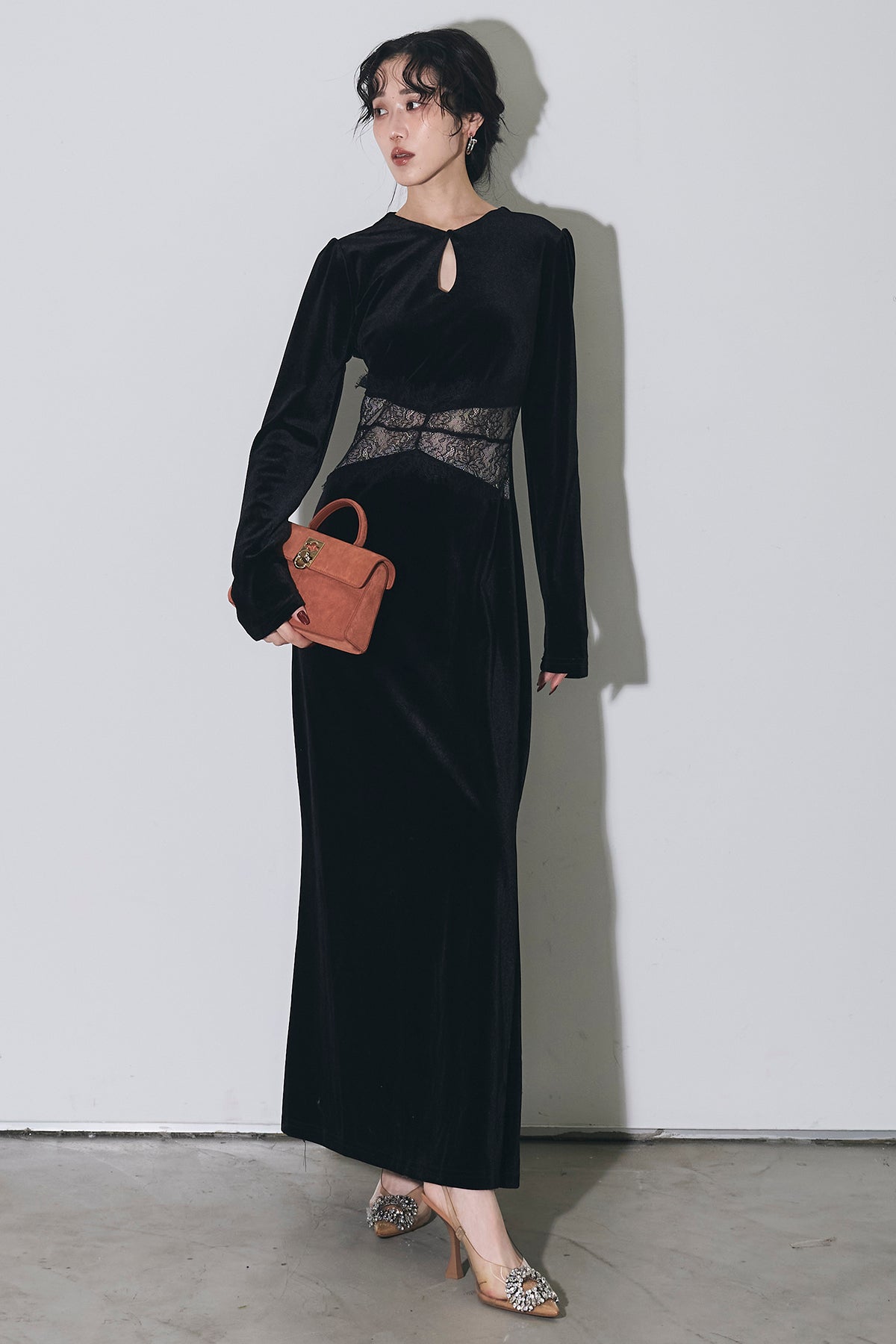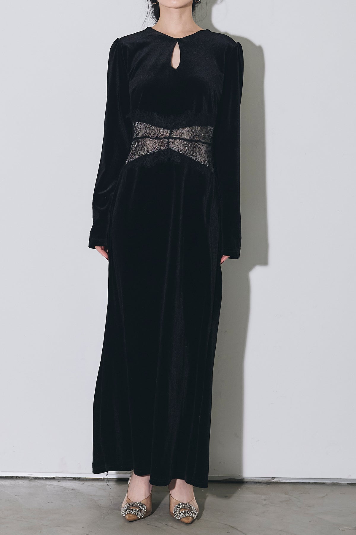 上品な光沢のベロア素材に、胸元のスリットとウエストのレース切り替えがアクセントになった、シンプルながら女性らしさが引き立つロングワンピース。