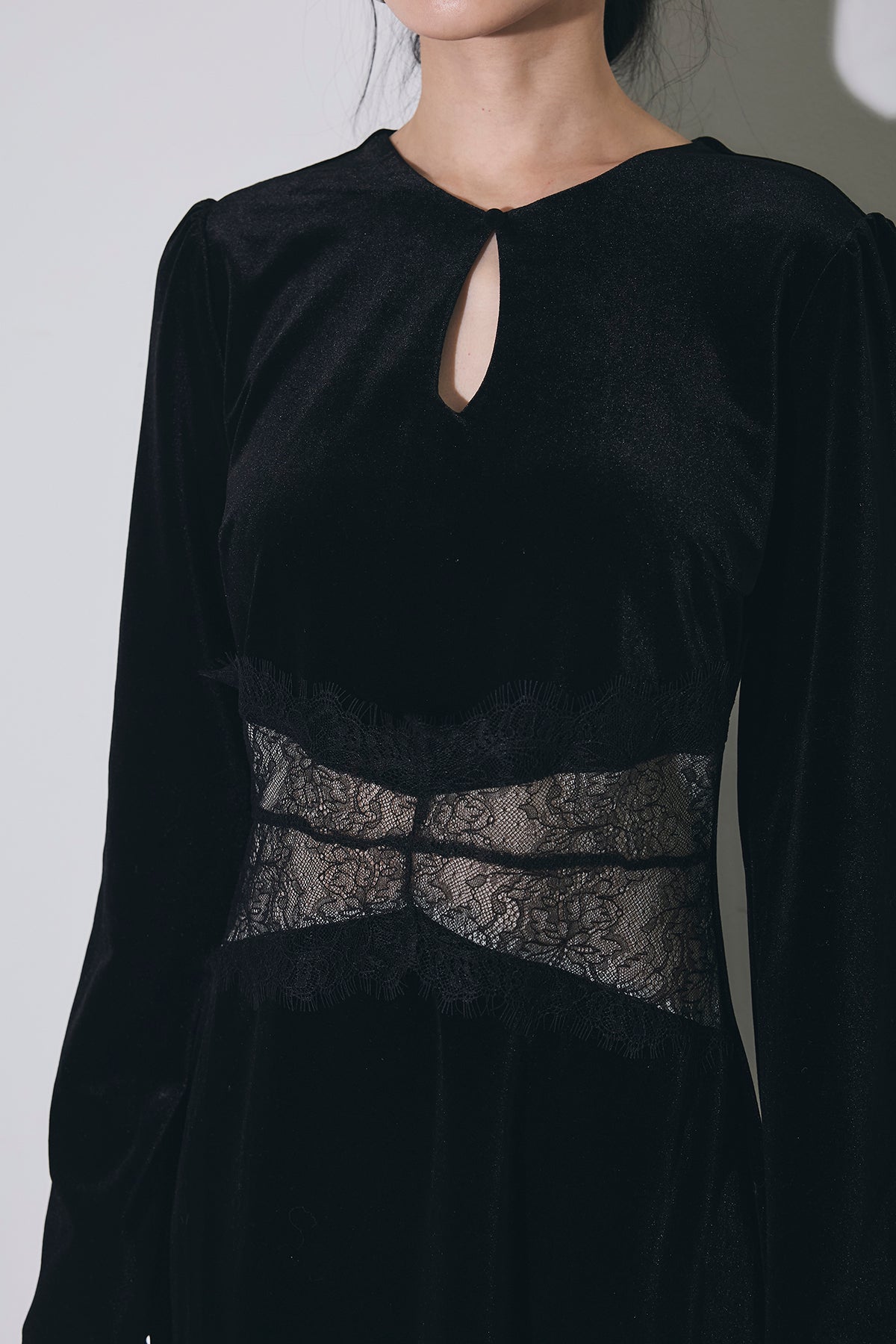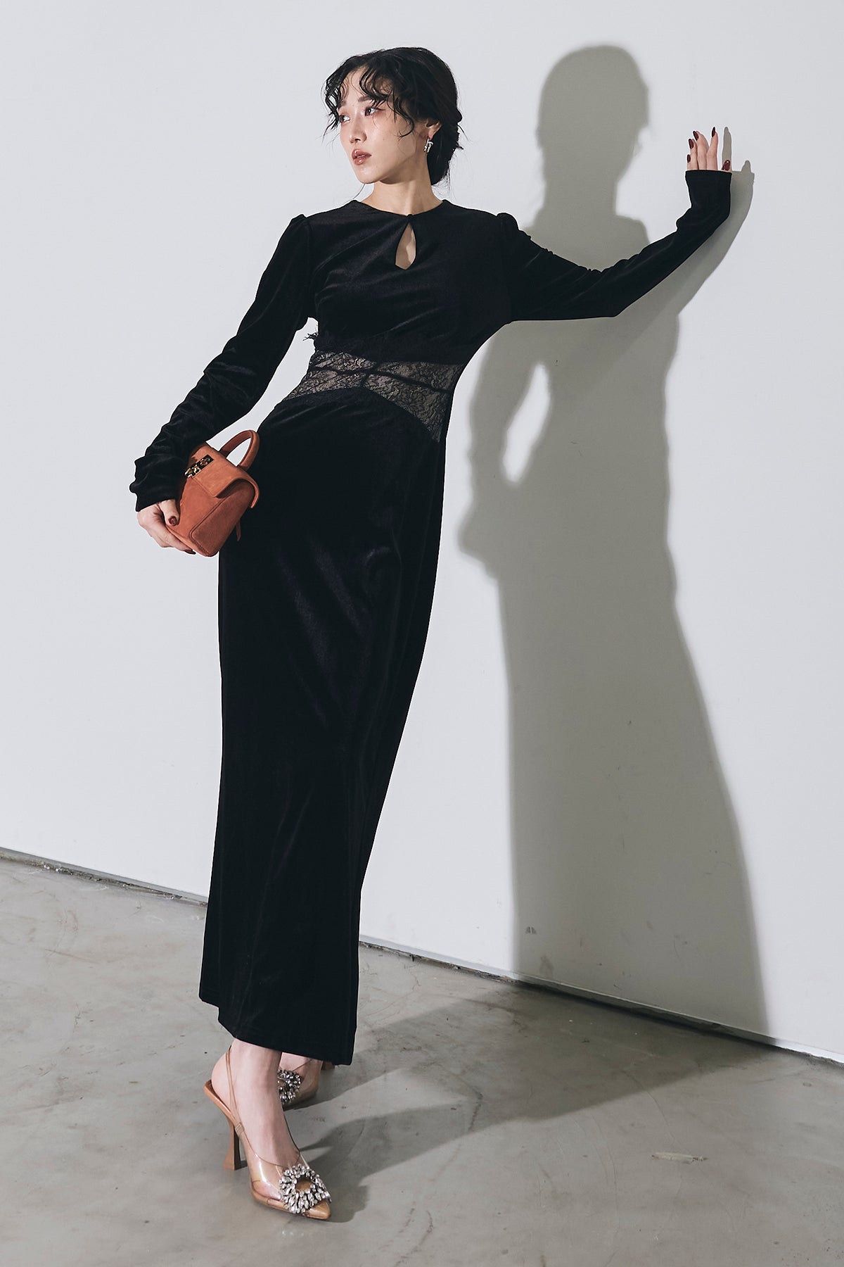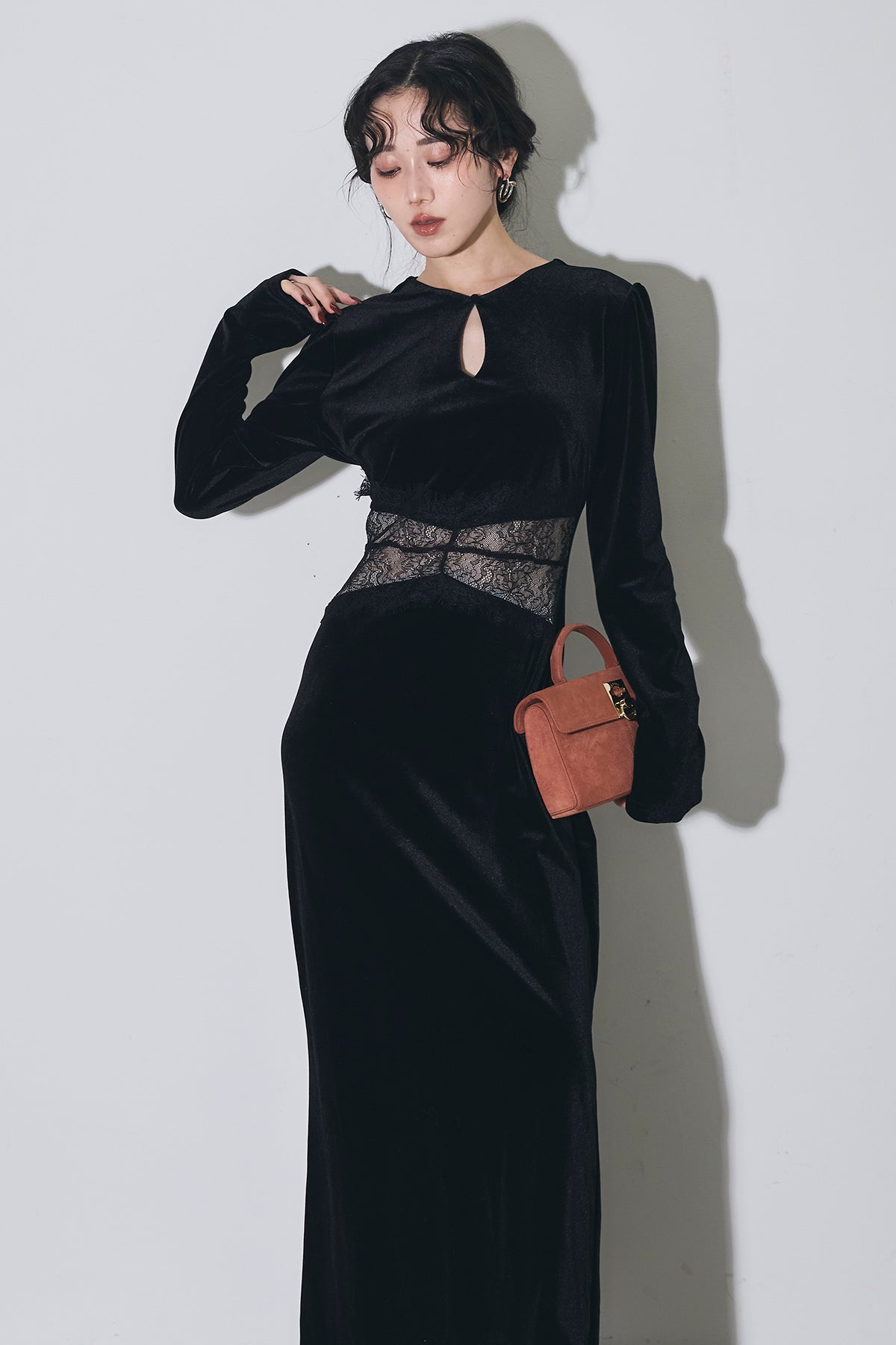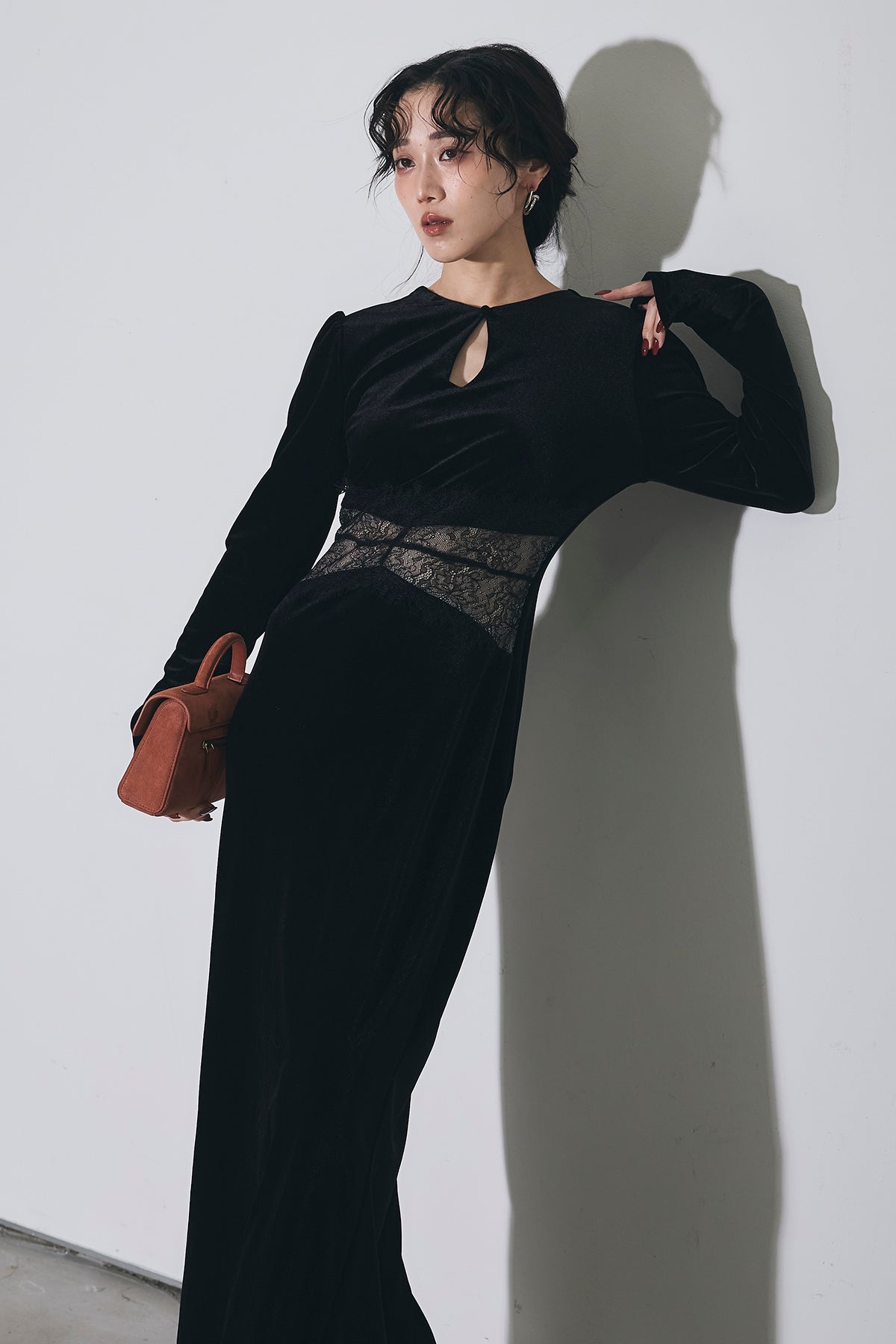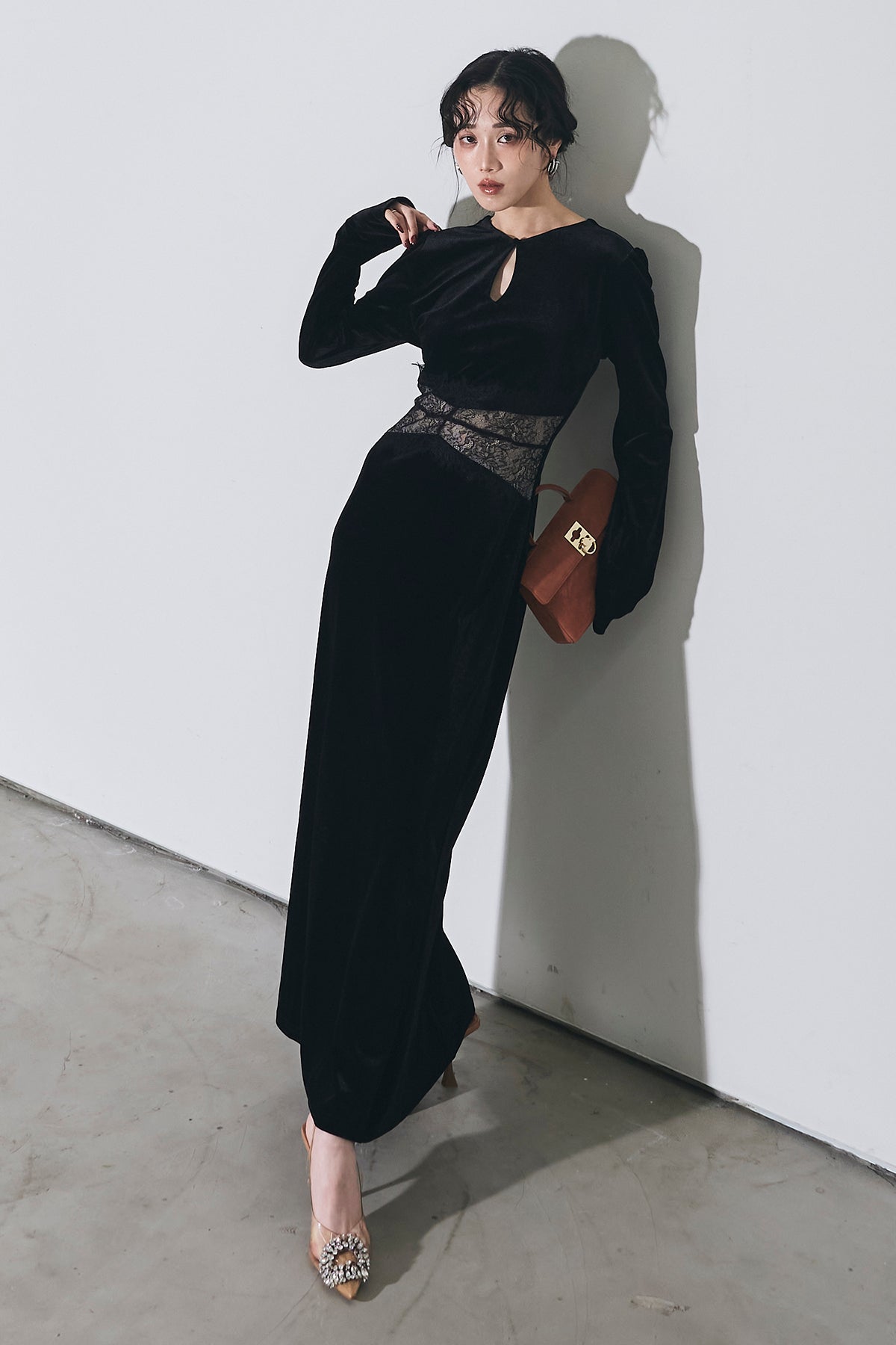 上品な光沢のベロア素材に、胸元のスリットとウエストのレース切り替えがアクセントになった、シンプルながら女性らしさが引き立つロングワンピース。