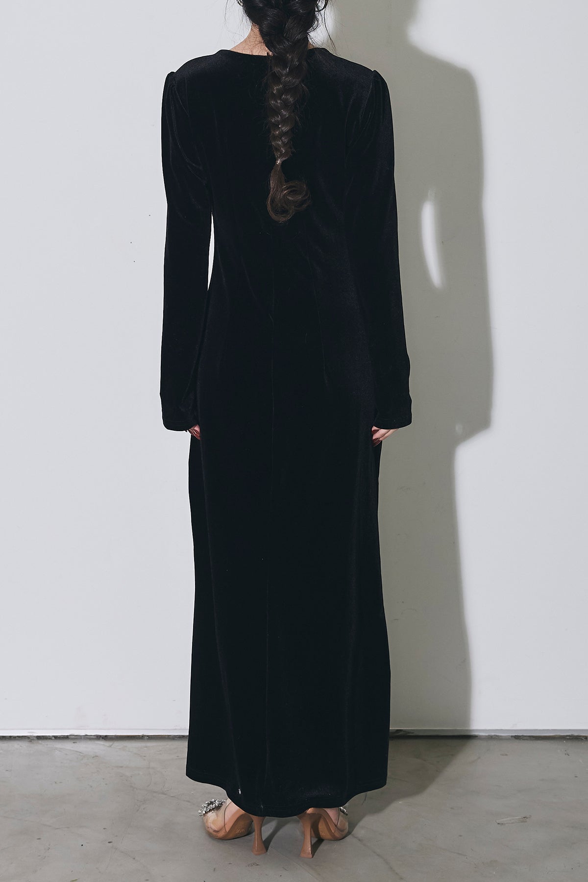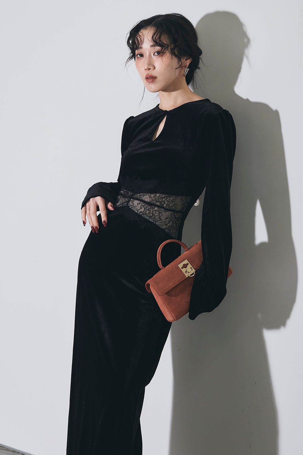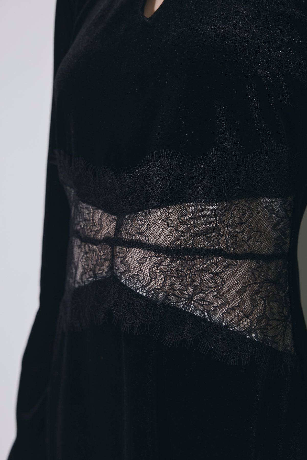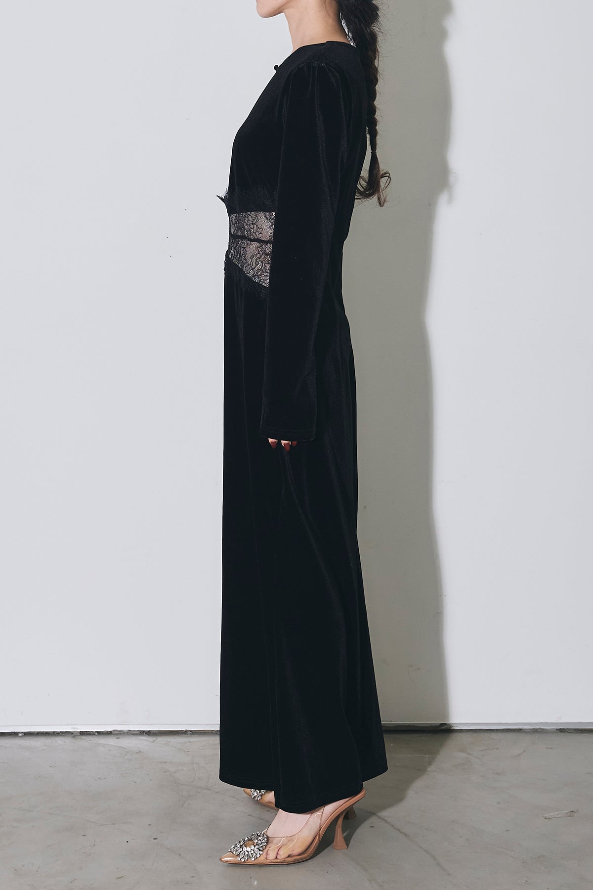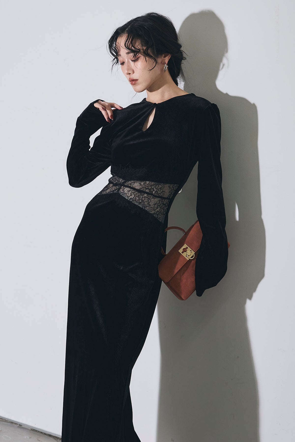 上品な光沢のベロア素材に、胸元のスリットとウエストのレース切り替えがアクセントになった、シンプルながら女性らしさが引き立つロングワンピース。
