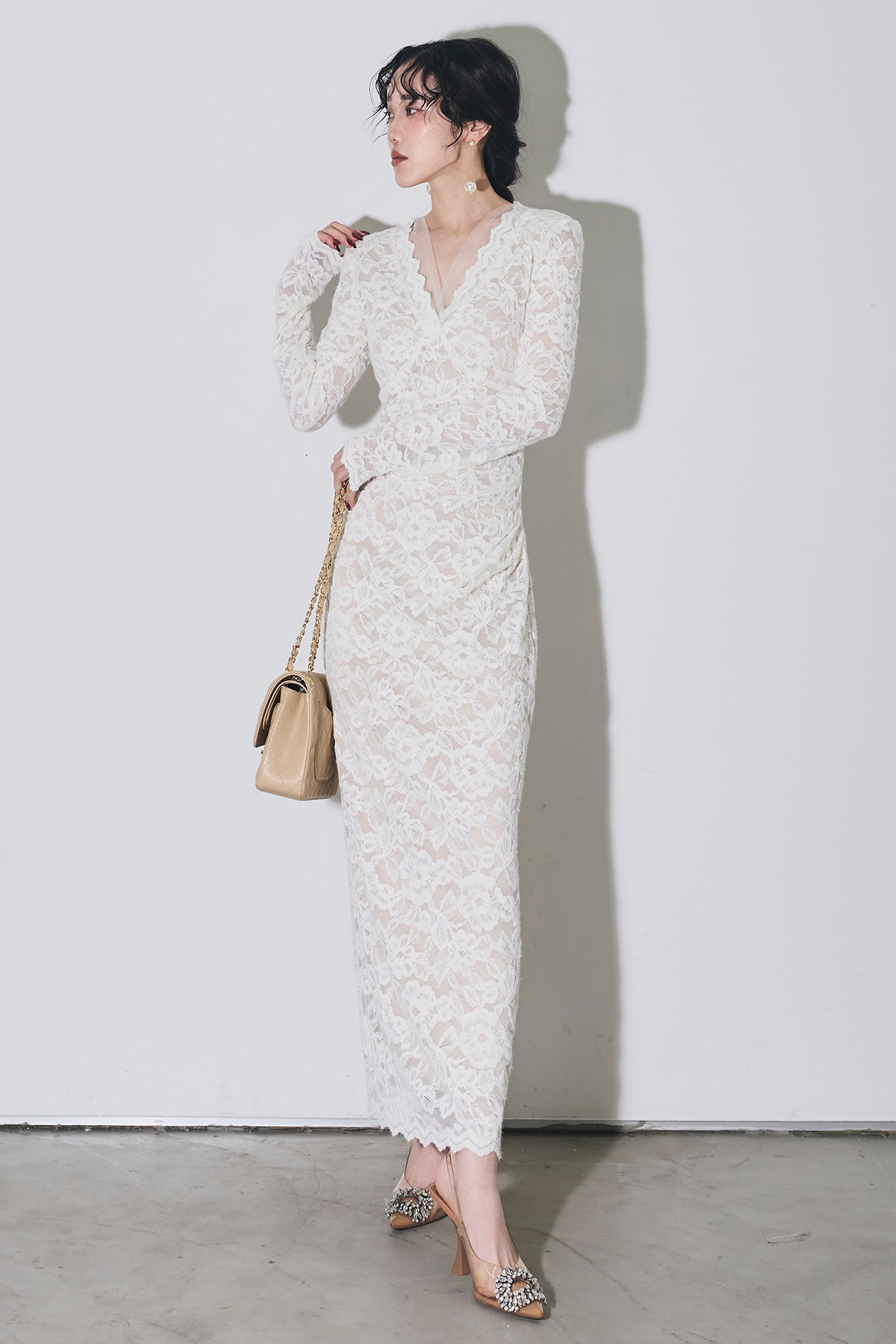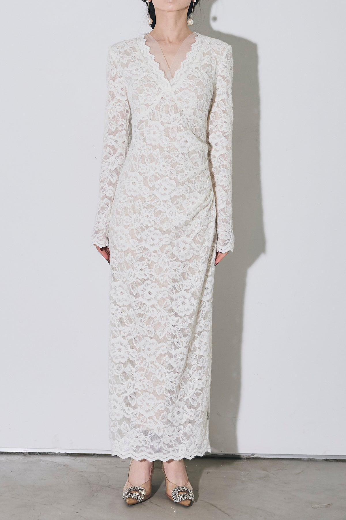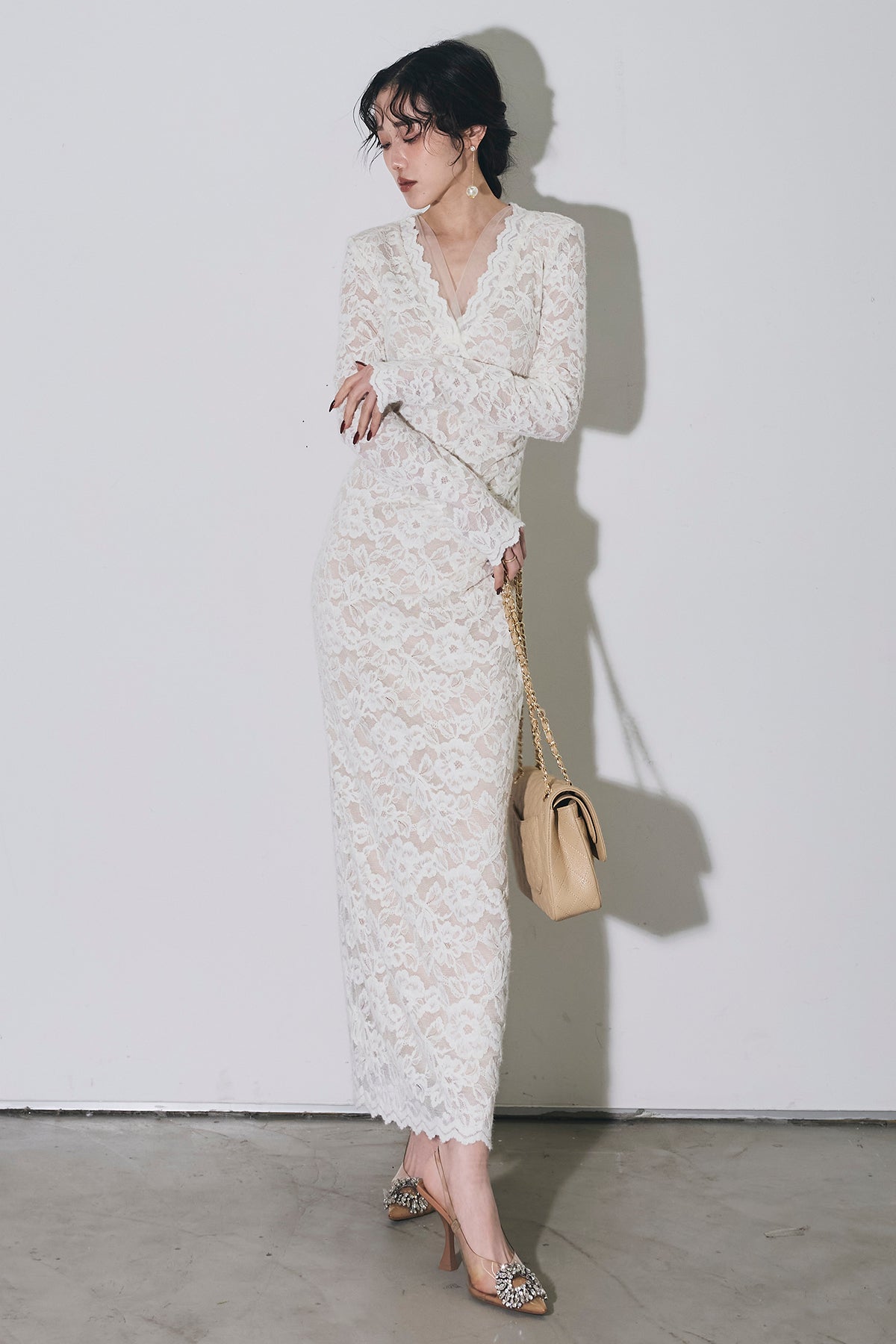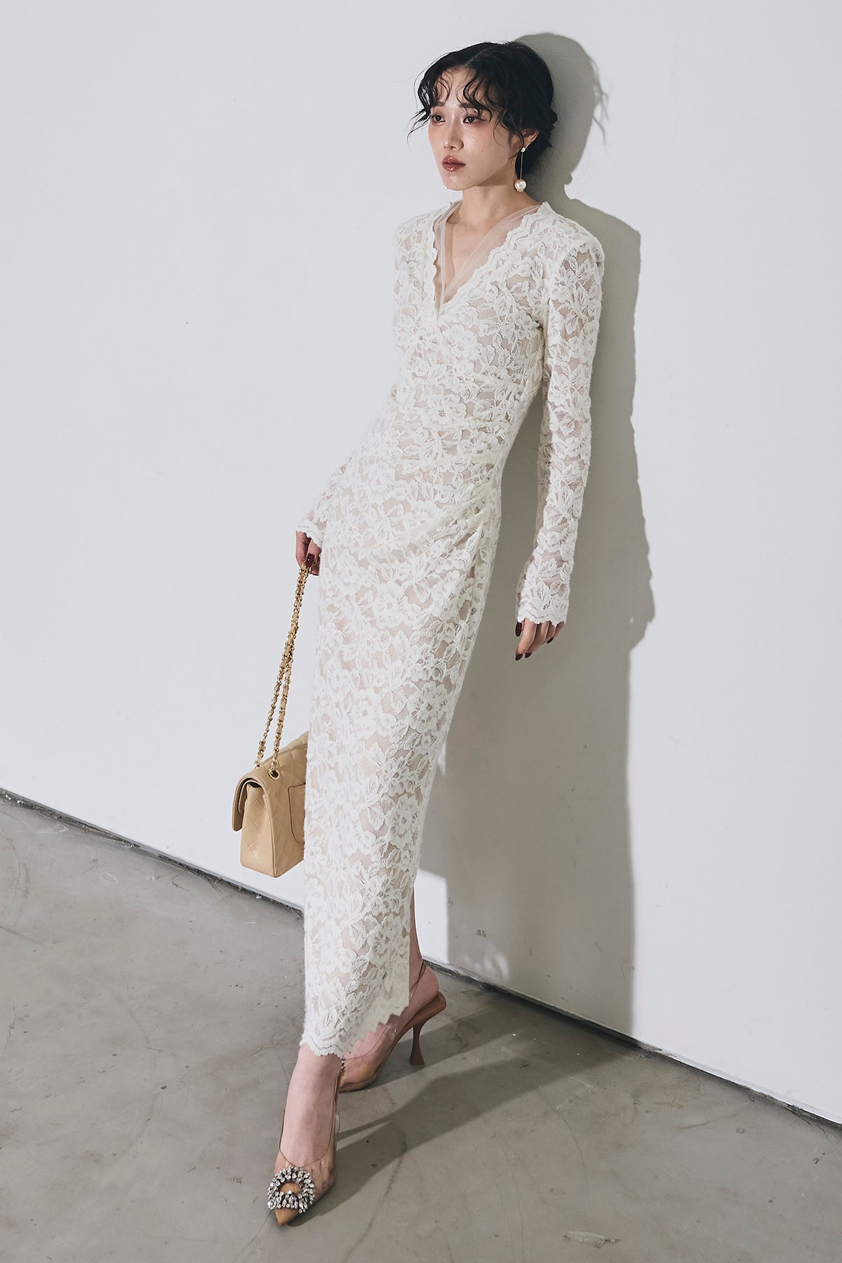 繊細な総レースにVネックの抜け感とロング丈の上品さを重ね、身体に沿うすっきりシルエットで一枚で華やかに決まる主役ワンピース。