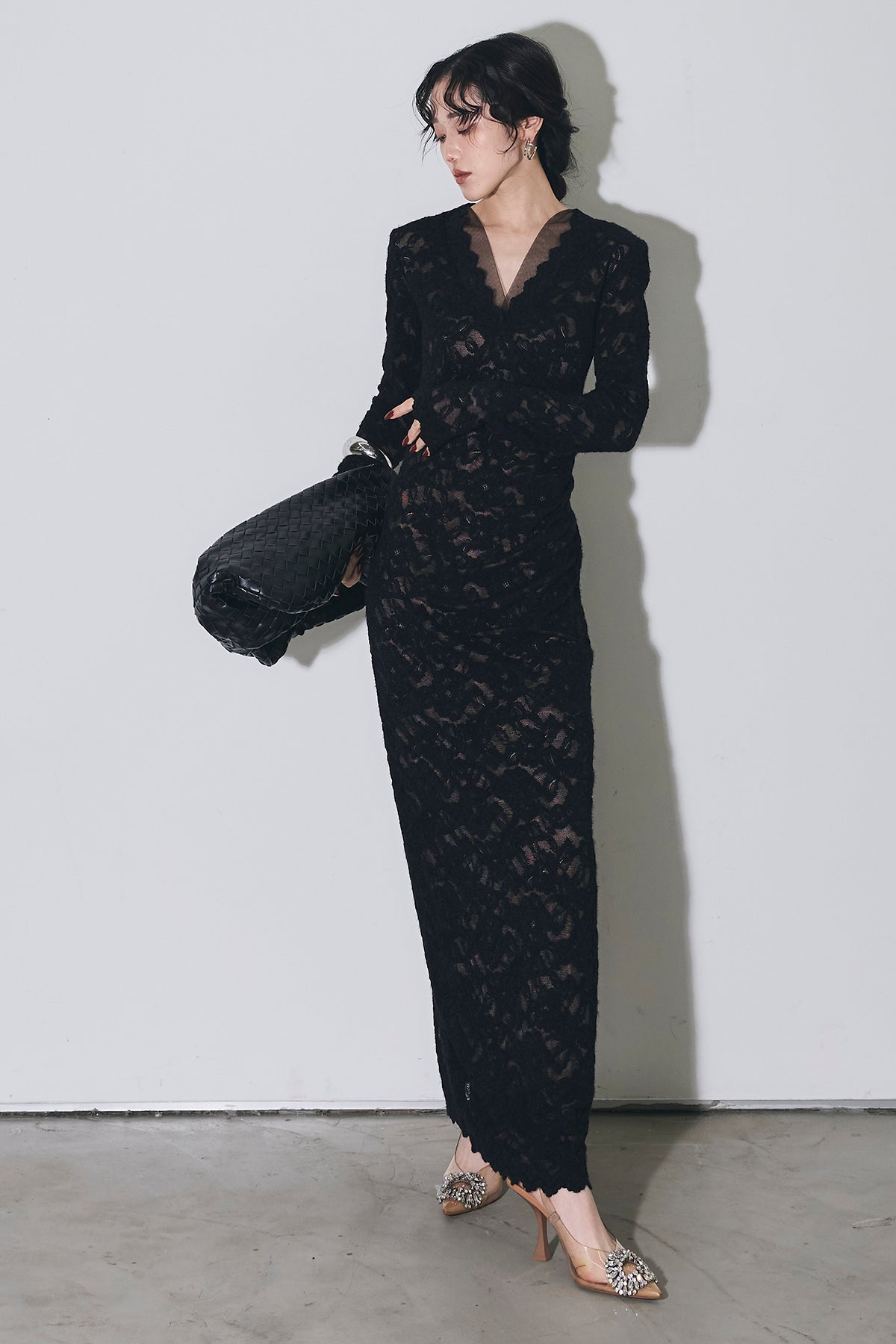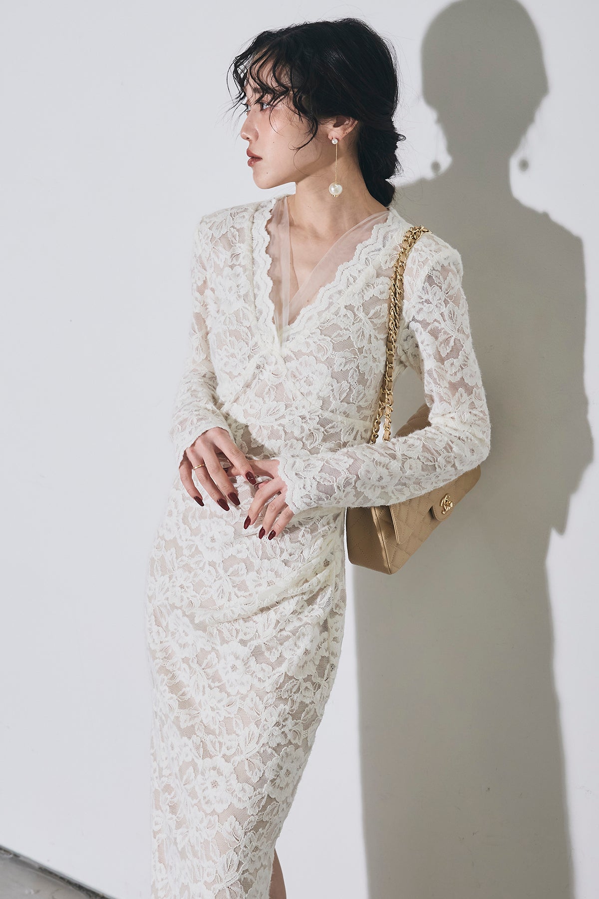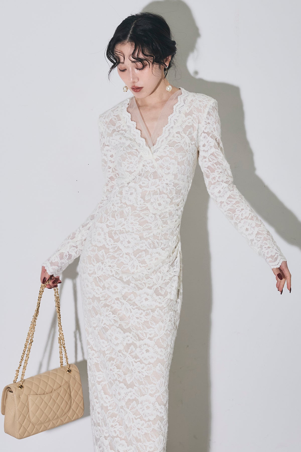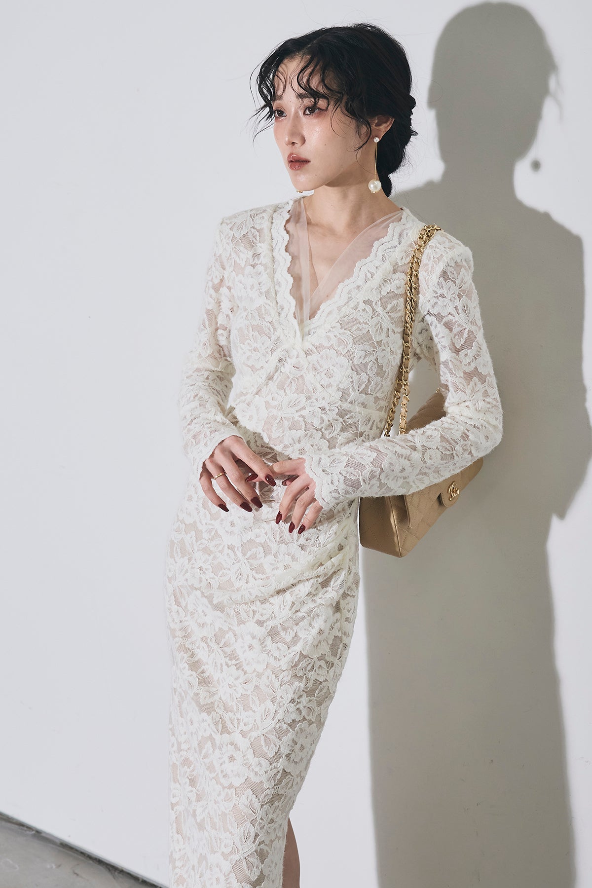 繊細な総レースにVネックの抜け感とロング丈の上品さを重ね、身体に沿うすっきりシルエットで一枚で華やかに決まる主役ワンピース。