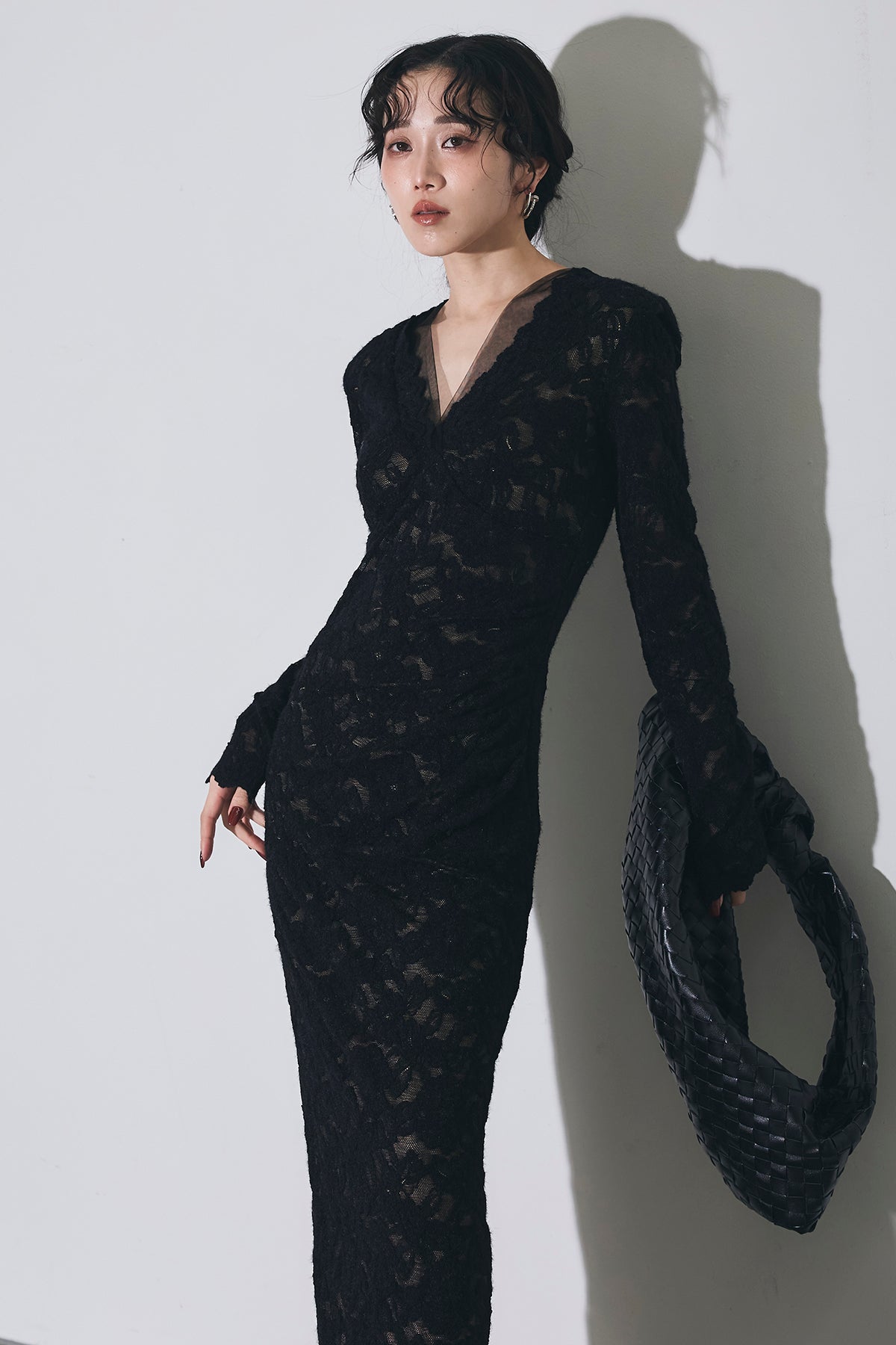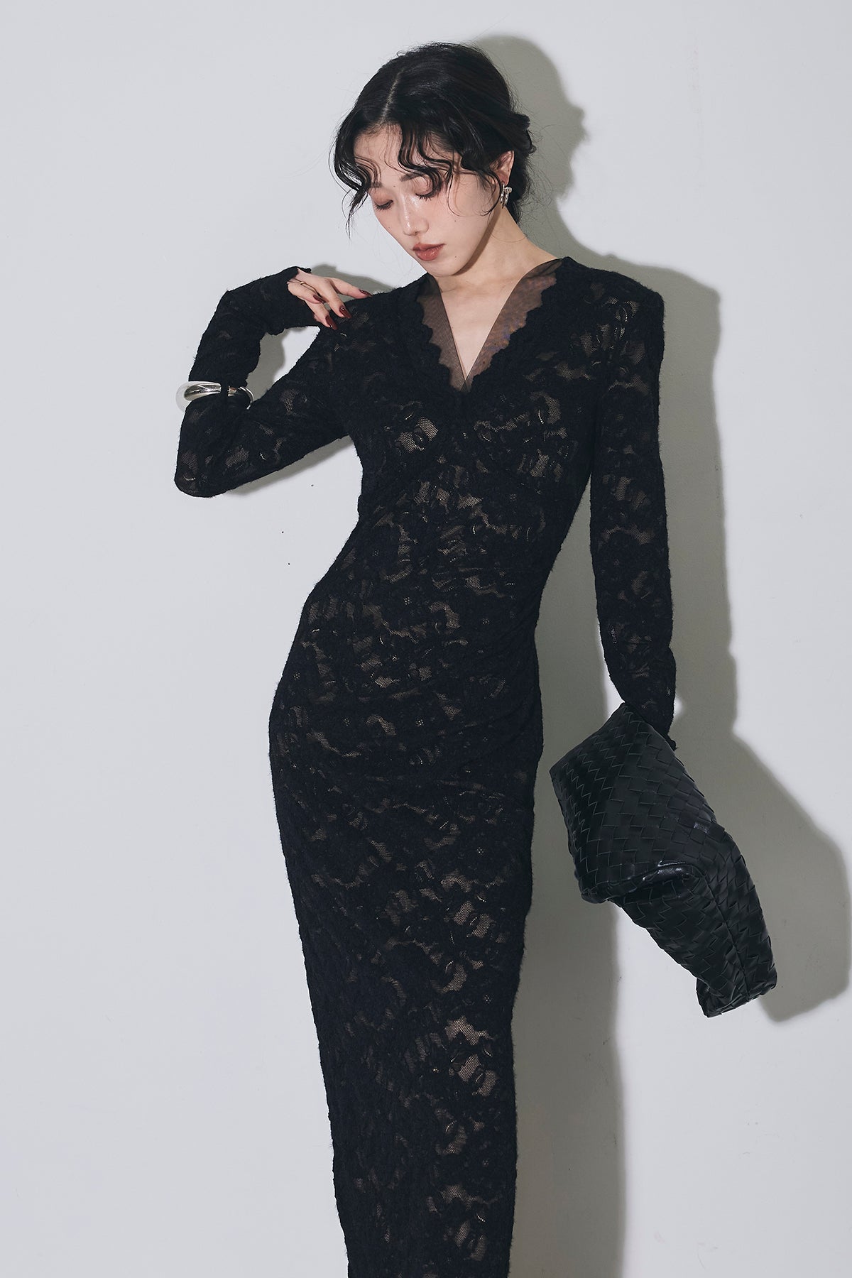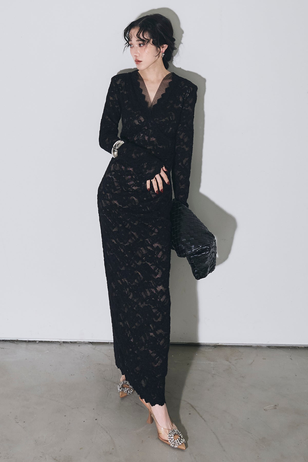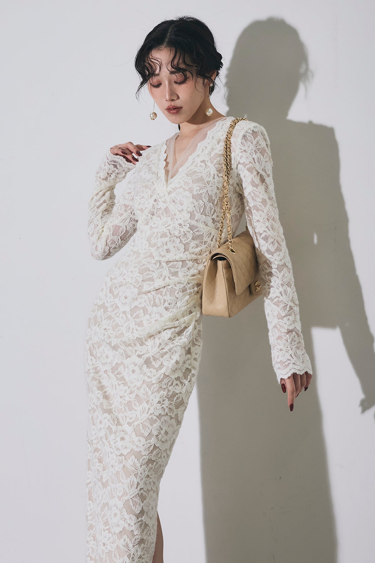 繊細な総レースにVネックの抜け感とロング丈の上品さを重ね、身体に沿うすっきりシルエットで一枚で華やかに決まる主役ワンピース。