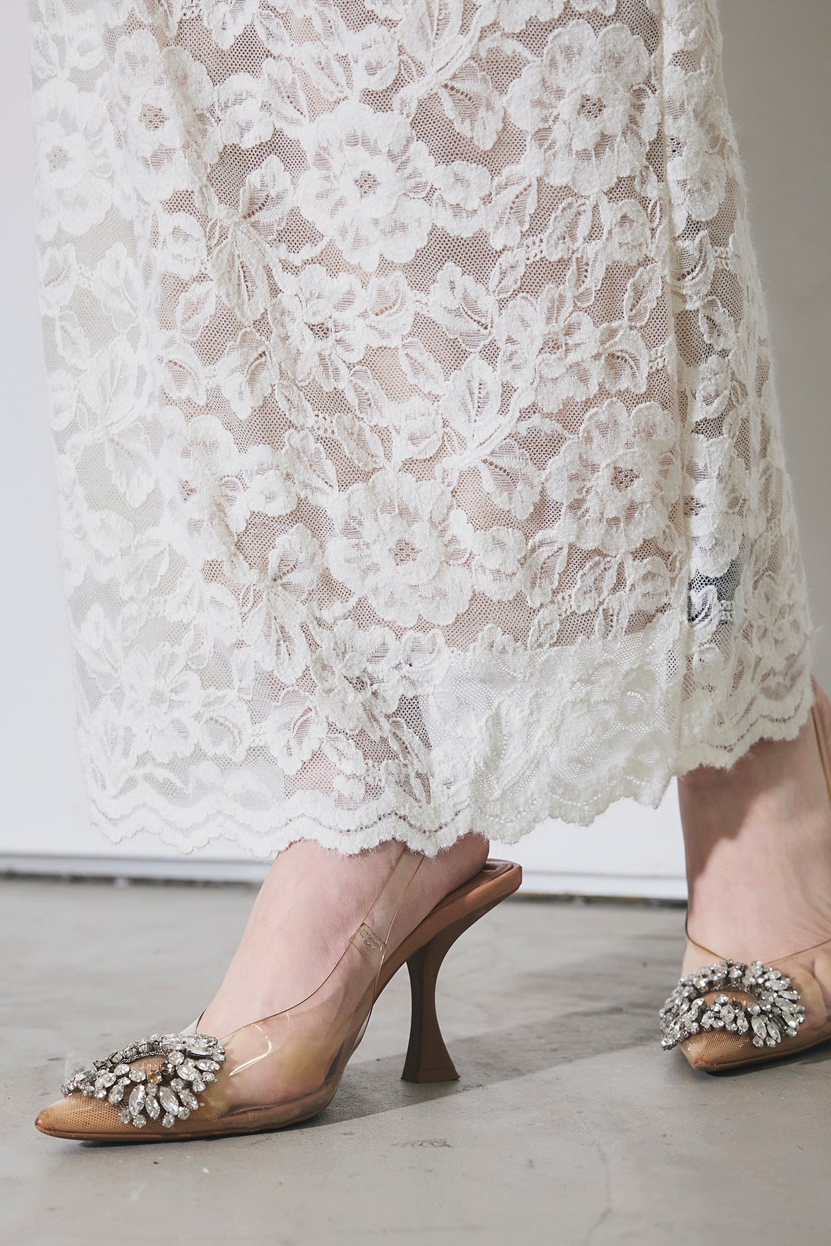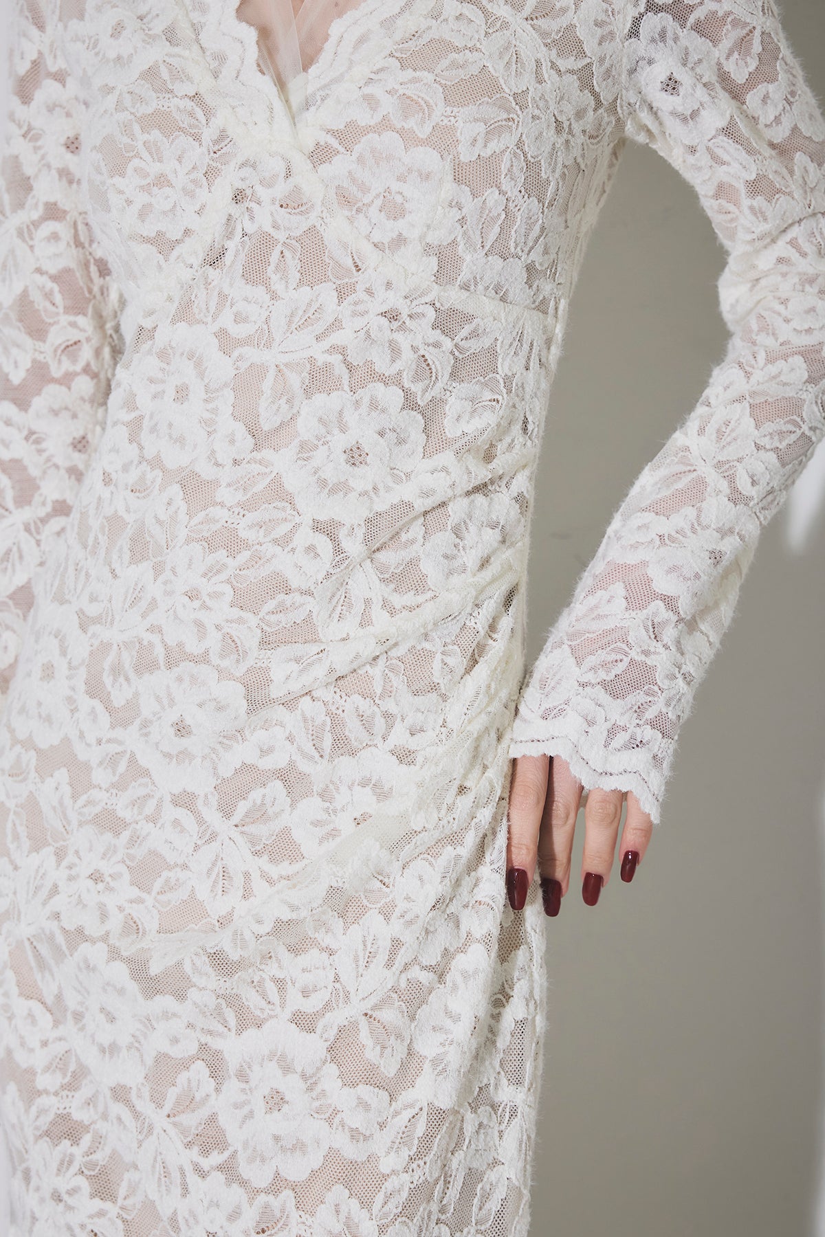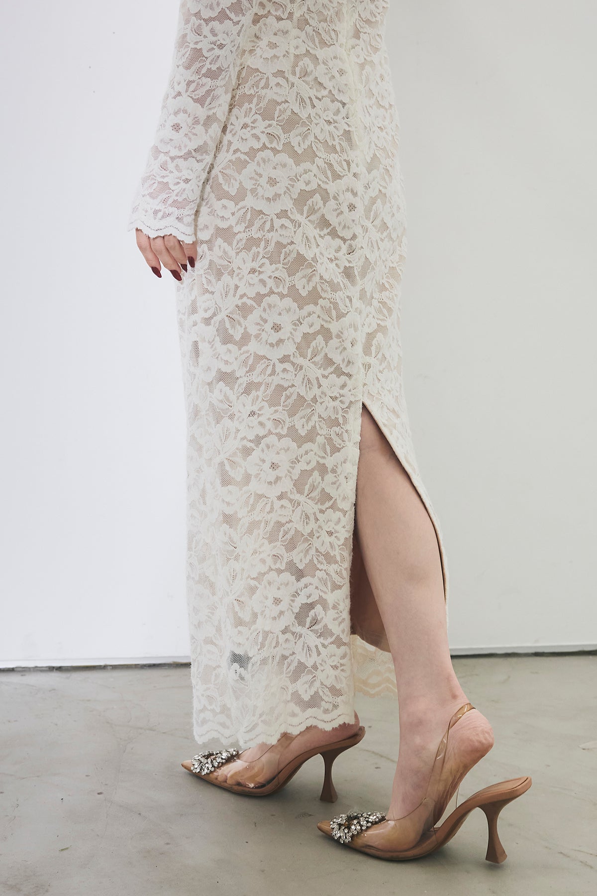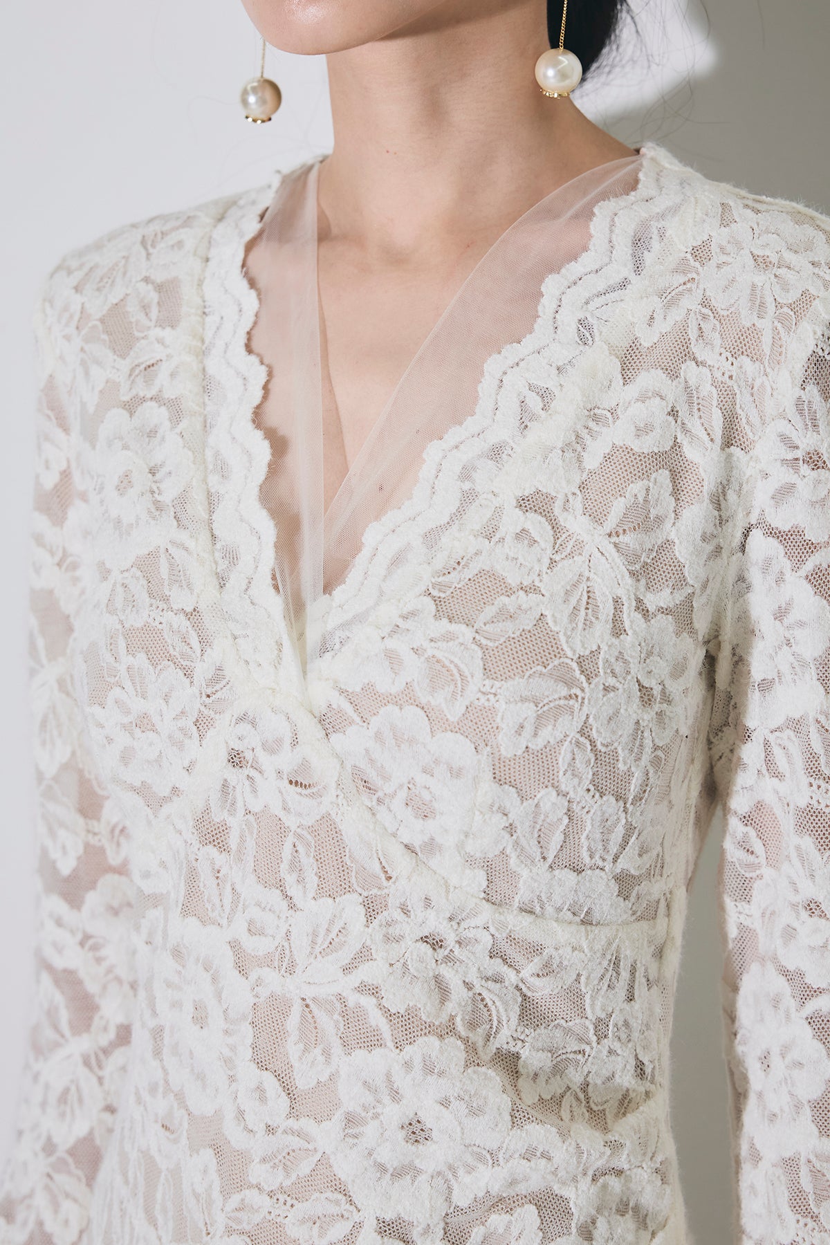 繊細な総レースにVネックの抜け感とロング丈の上品さを重ね、身体に沿うすっきりシルエットで一枚で華やかに決まる主役ワンピース。