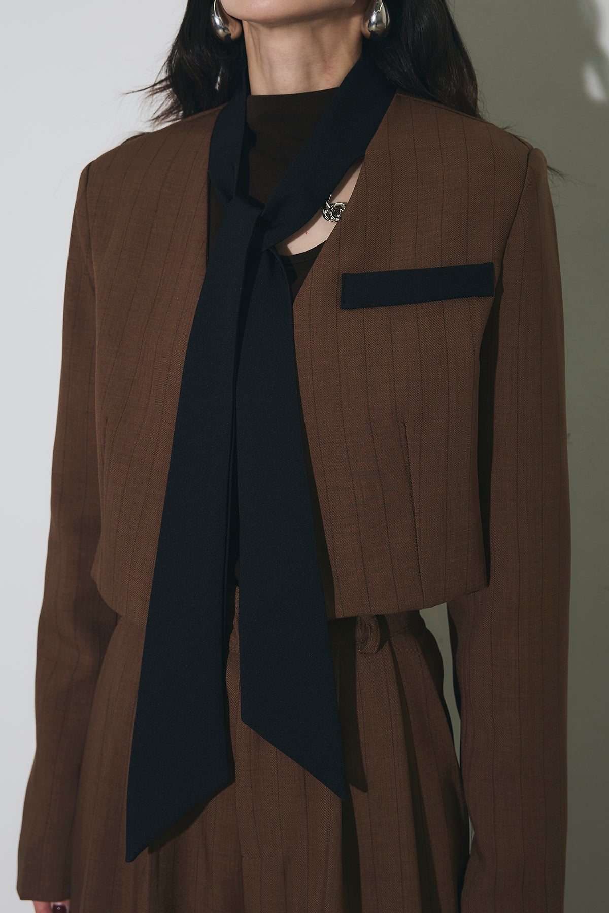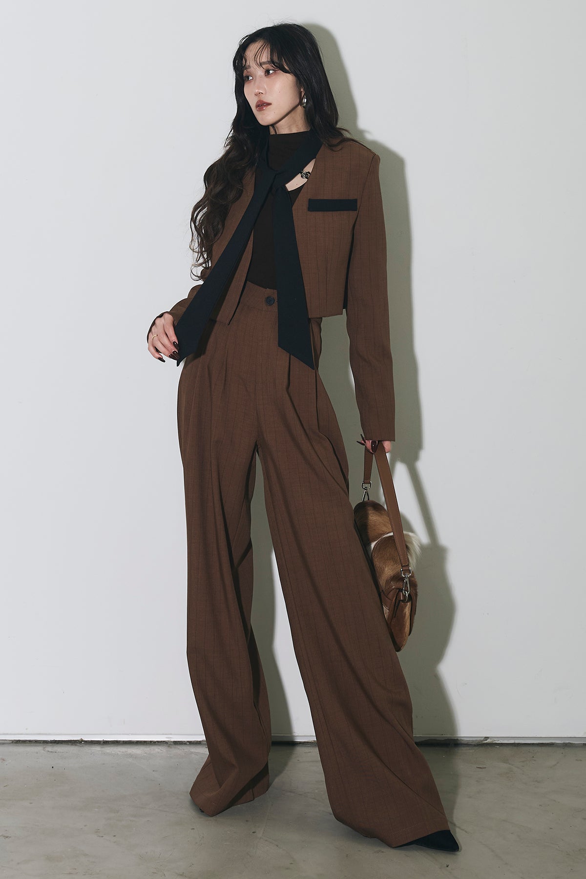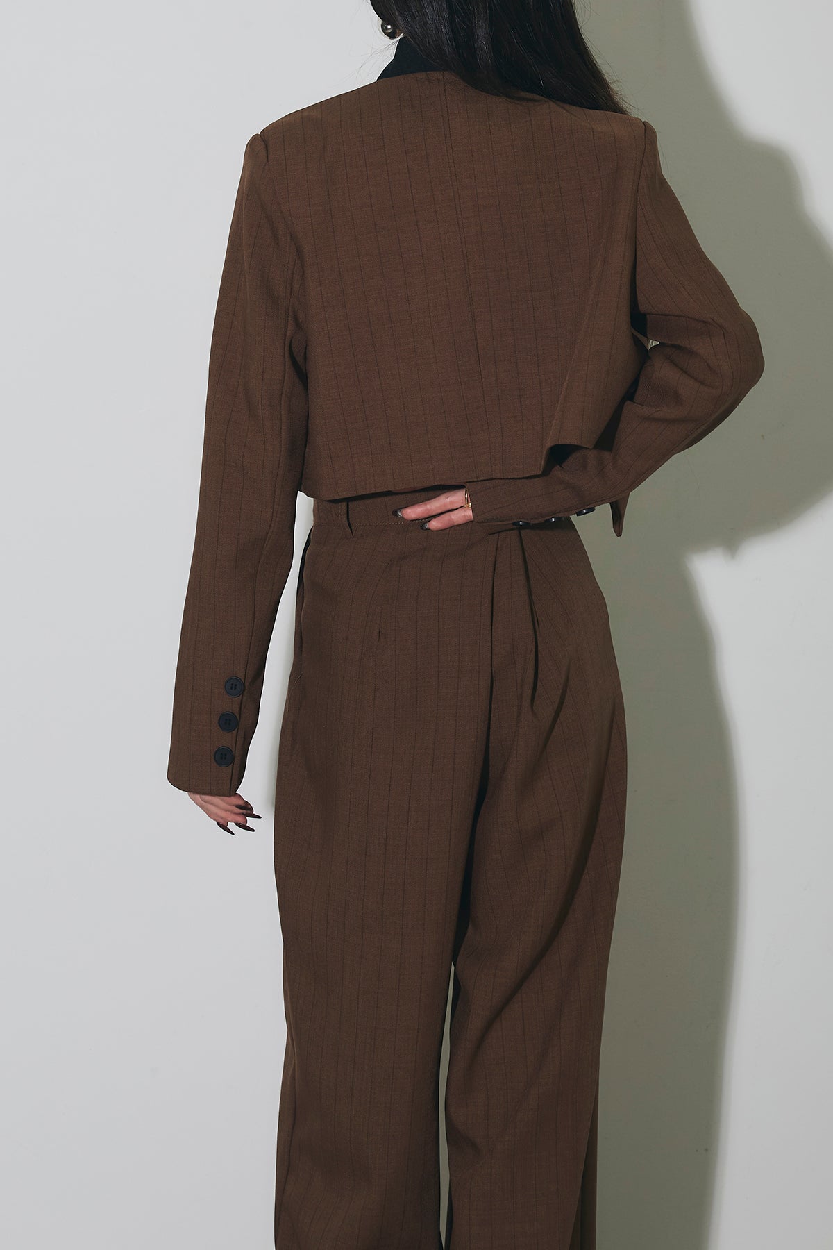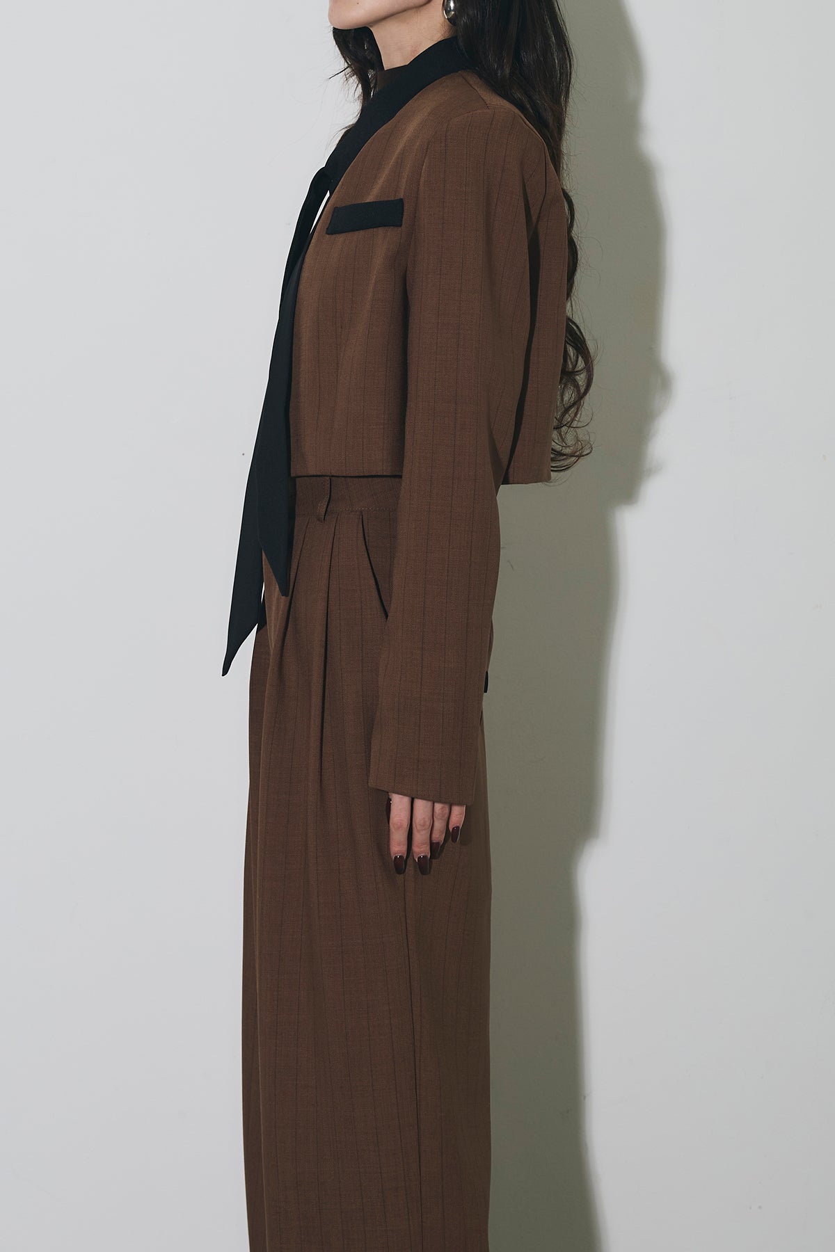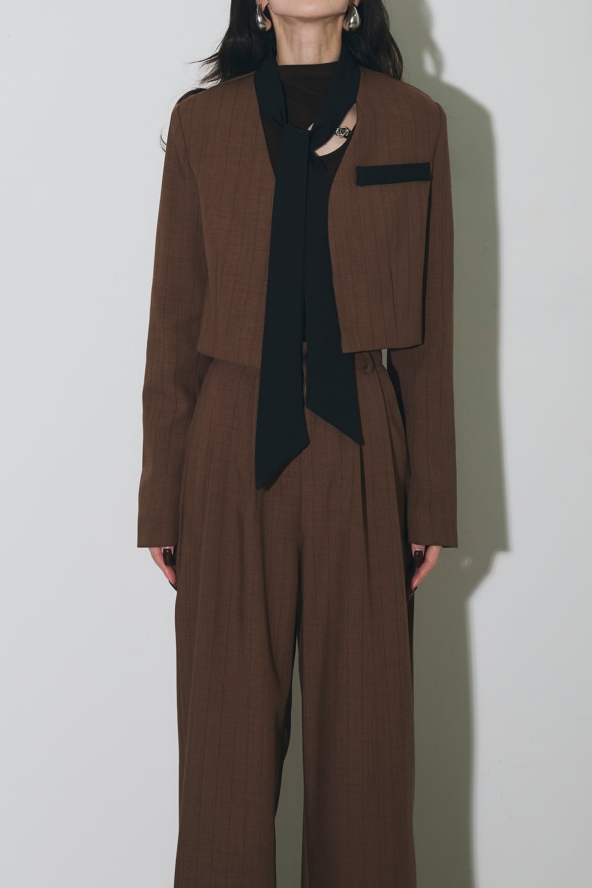 ご注文前に必ずページ下部「お届け期間」をご確認くださいませ。ショート丈ジャケットとワイドパンツのセットアップ。 縦のラインを意識したシルエットで、スタイルアップが叶います。 インナーのデザインがアクセントになり、程よくモードな印象に。 それぞれ単品使いもしやすく、着回し力も◎。 オンオフ問わず幅広いシーンで活躍するアイテムです。