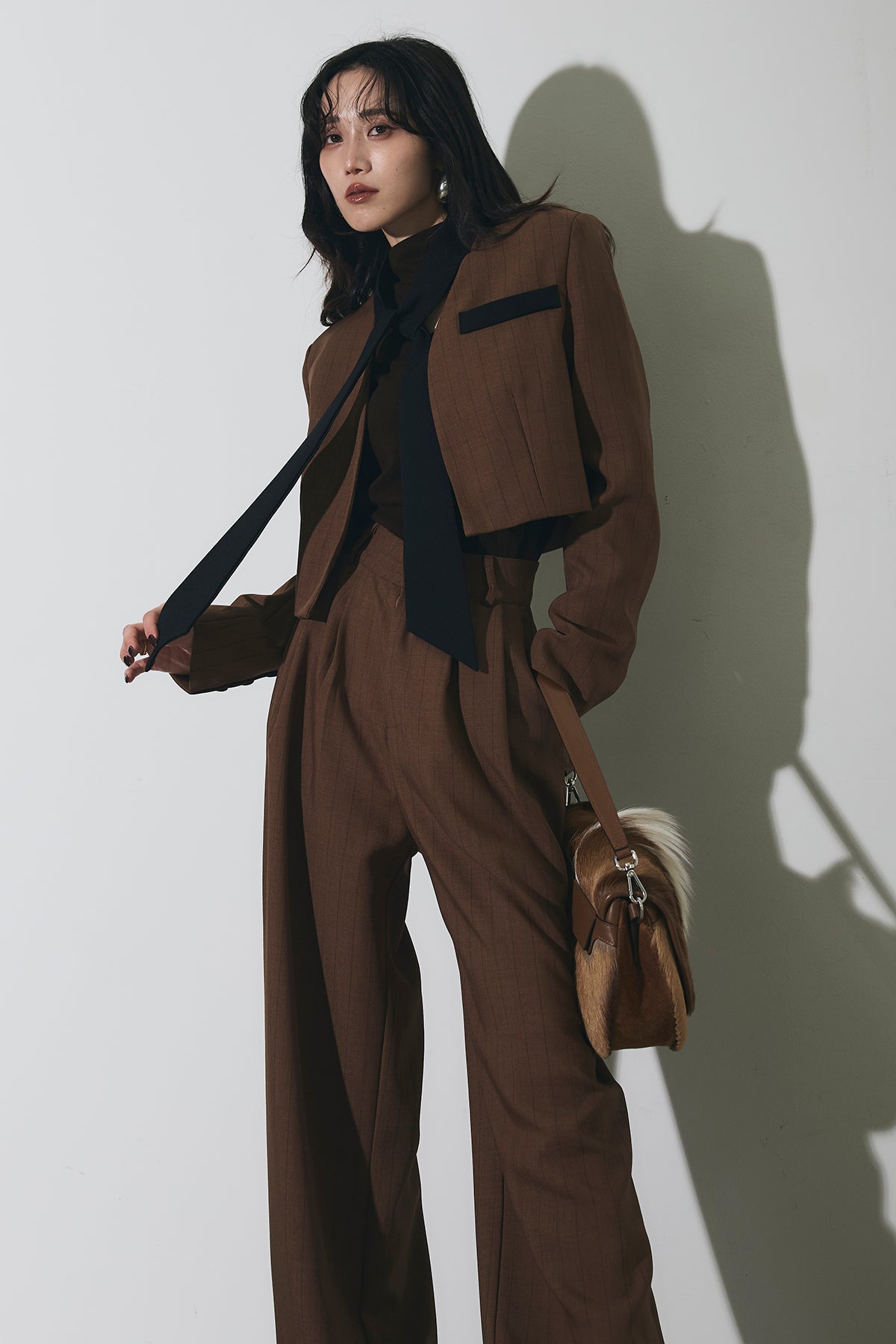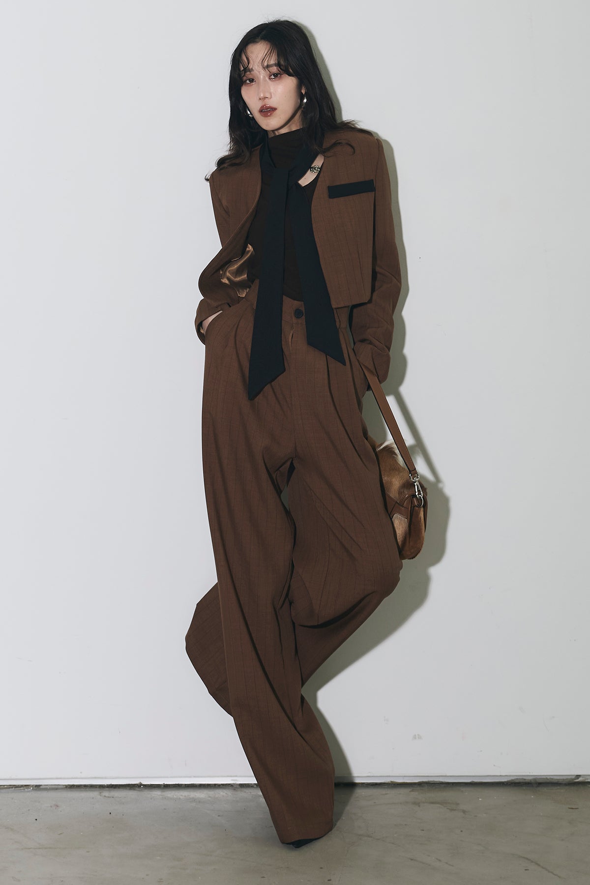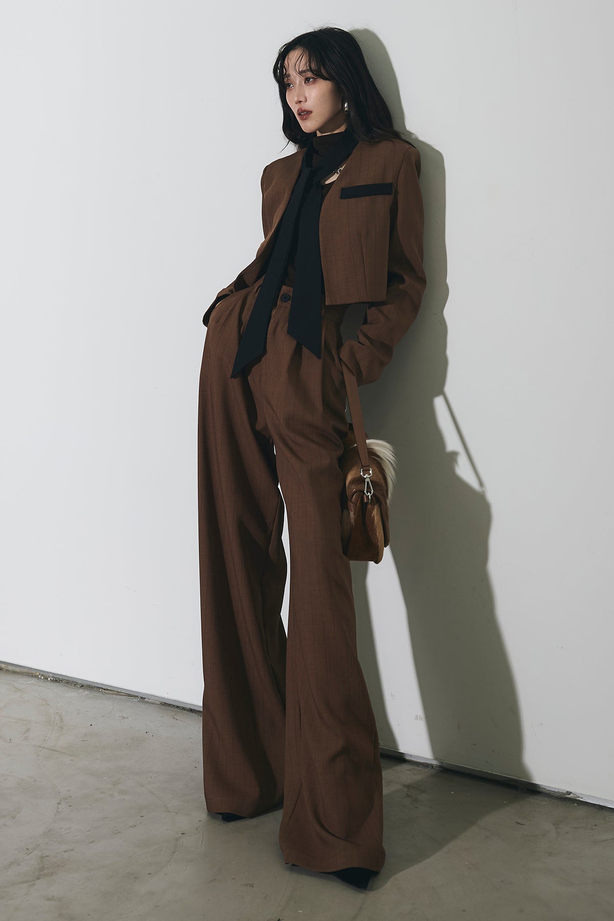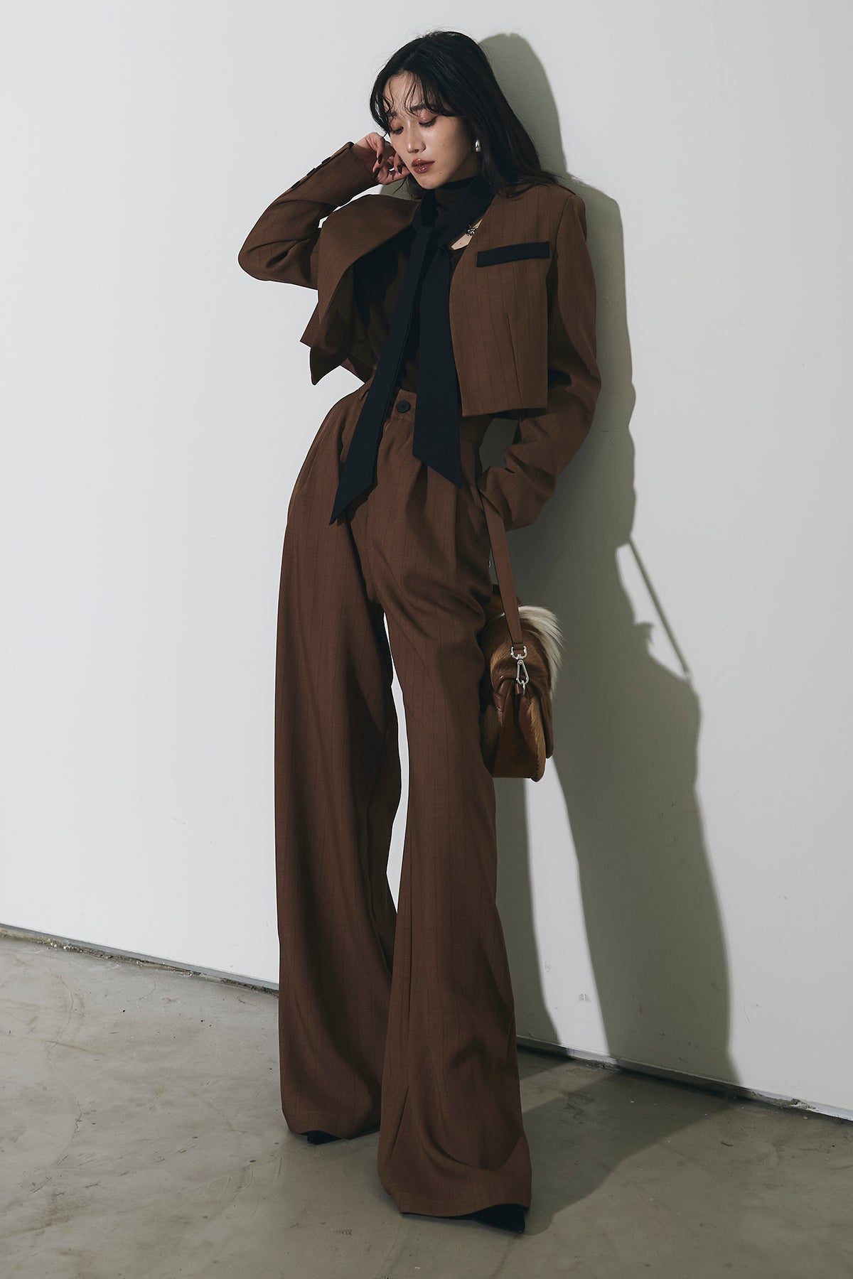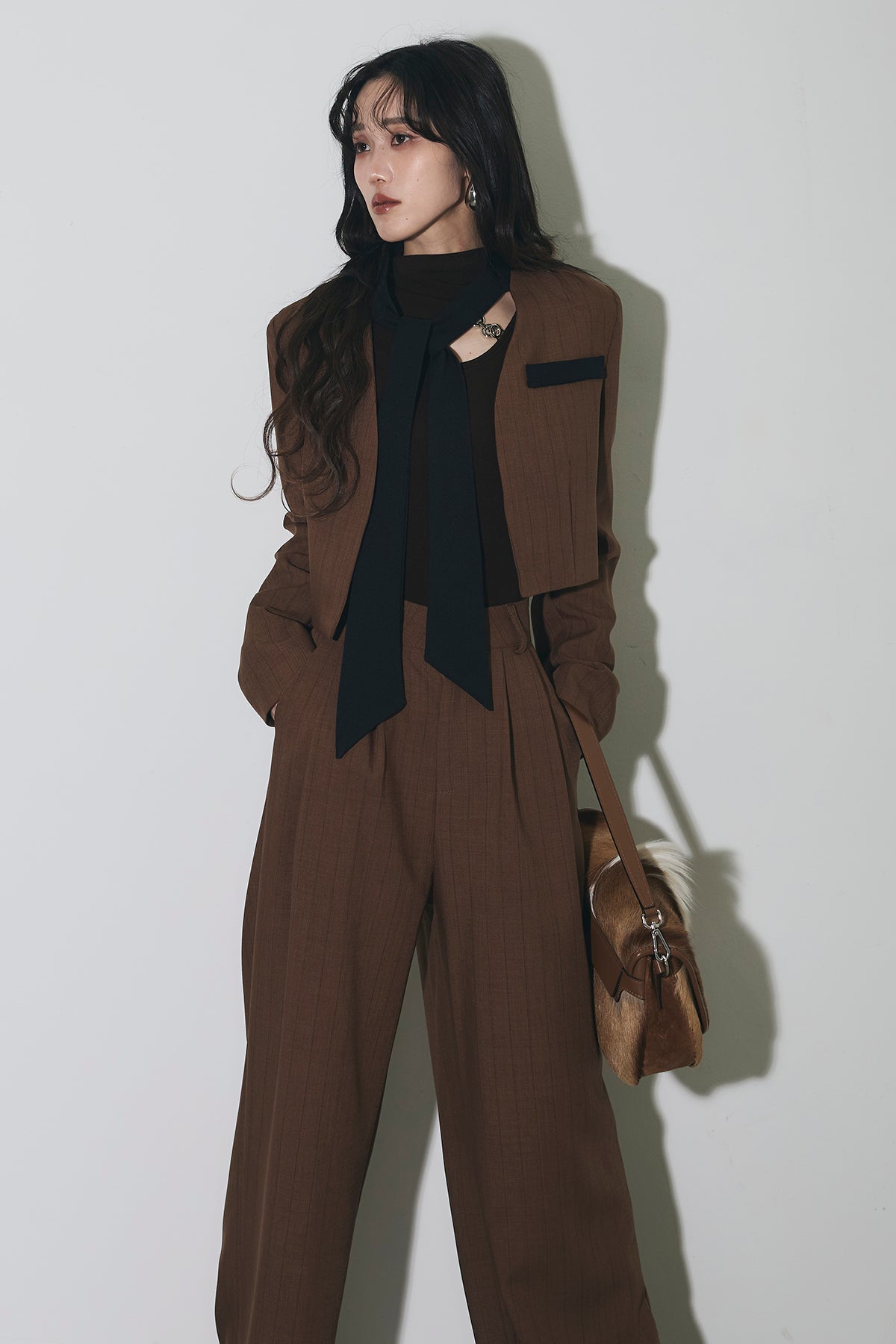 ご注文前に必ずページ下部「お届け期間」をご確認くださいませ。ショート丈ジャケットとワイドパンツのセットアップ。 縦のラインを意識したシルエットで、スタイルアップが叶います。 インナーのデザインがアクセントになり、程よくモードな印象に。 それぞれ単品使いもしやすく、着回し力も◎。 オンオフ問わず幅広いシーンで活躍するアイテムです。