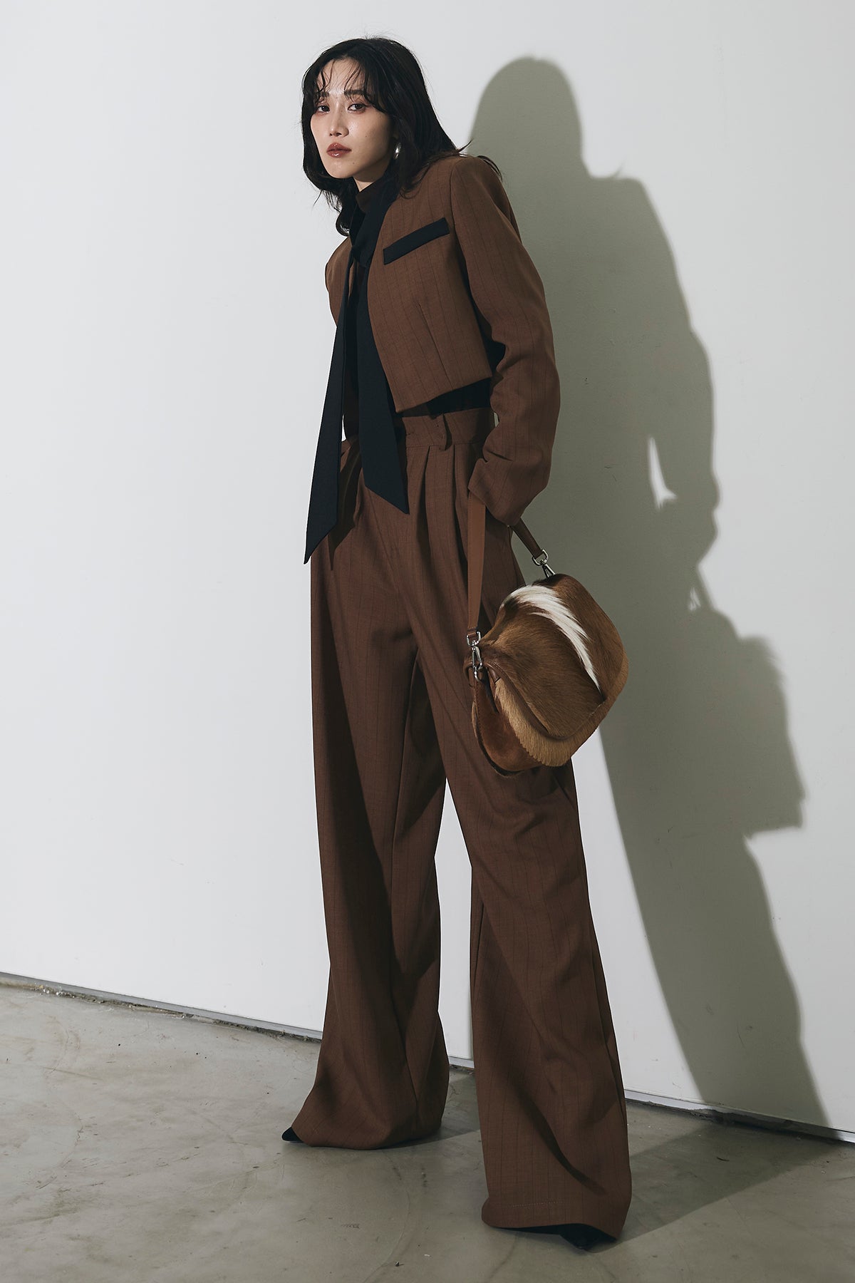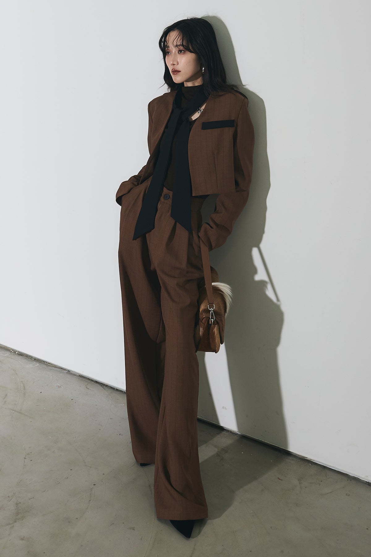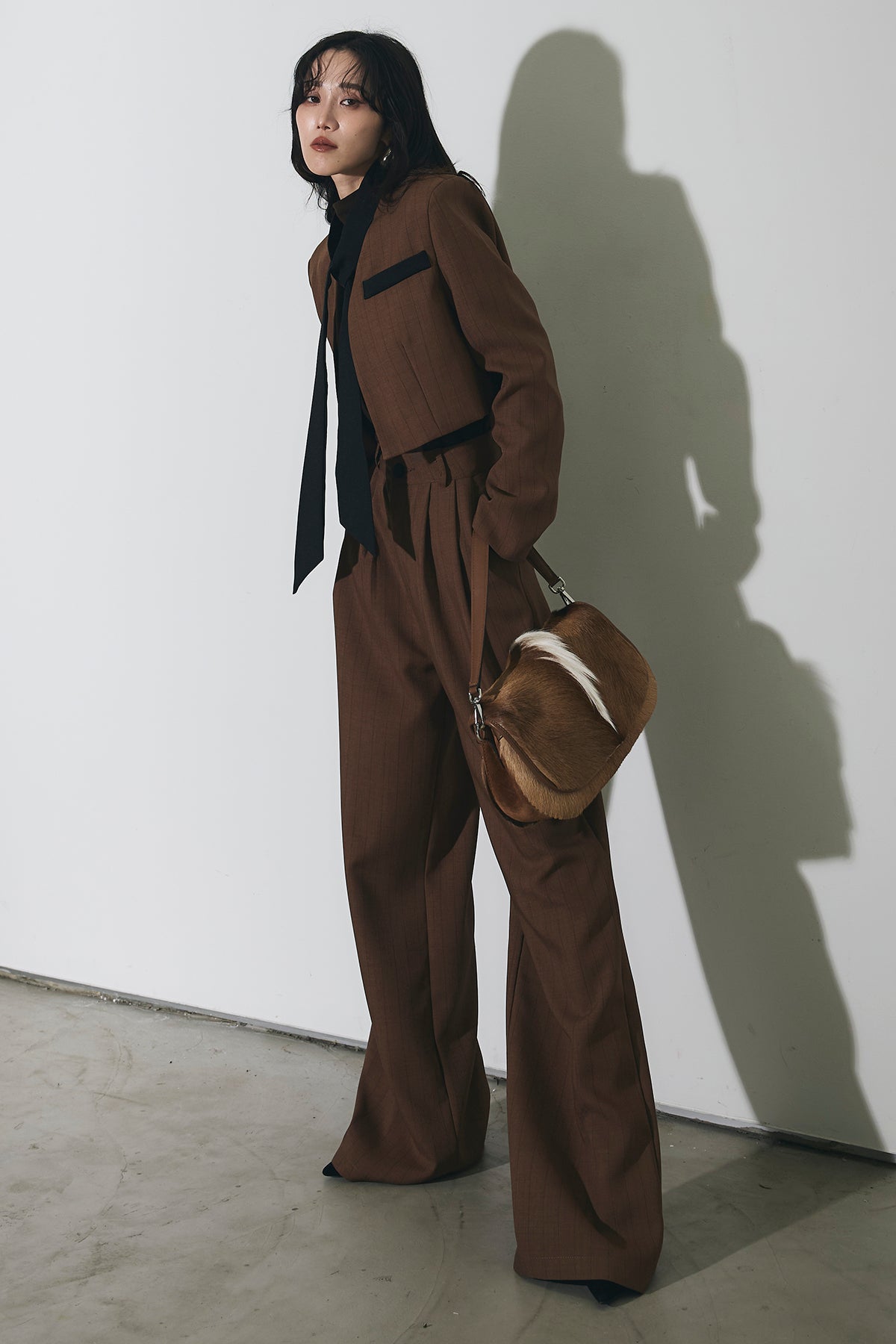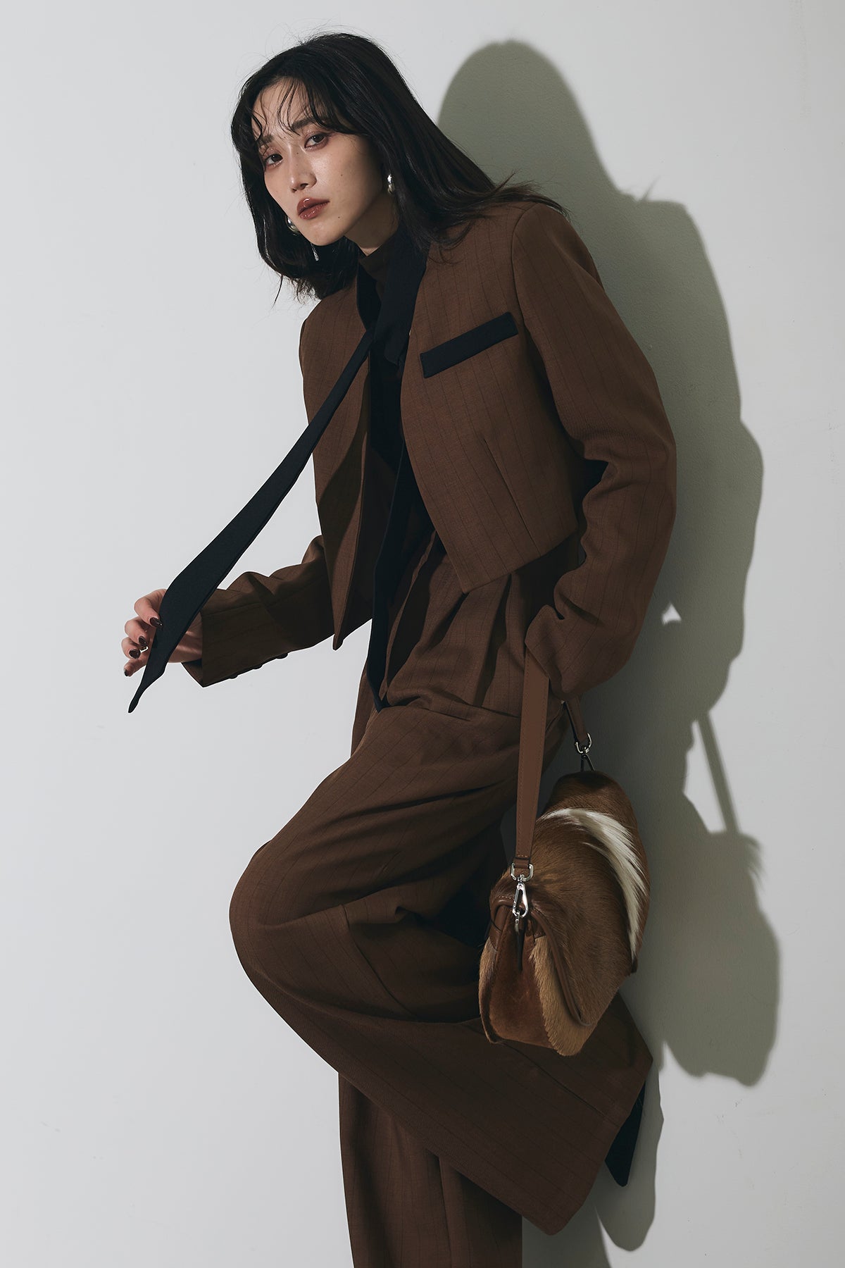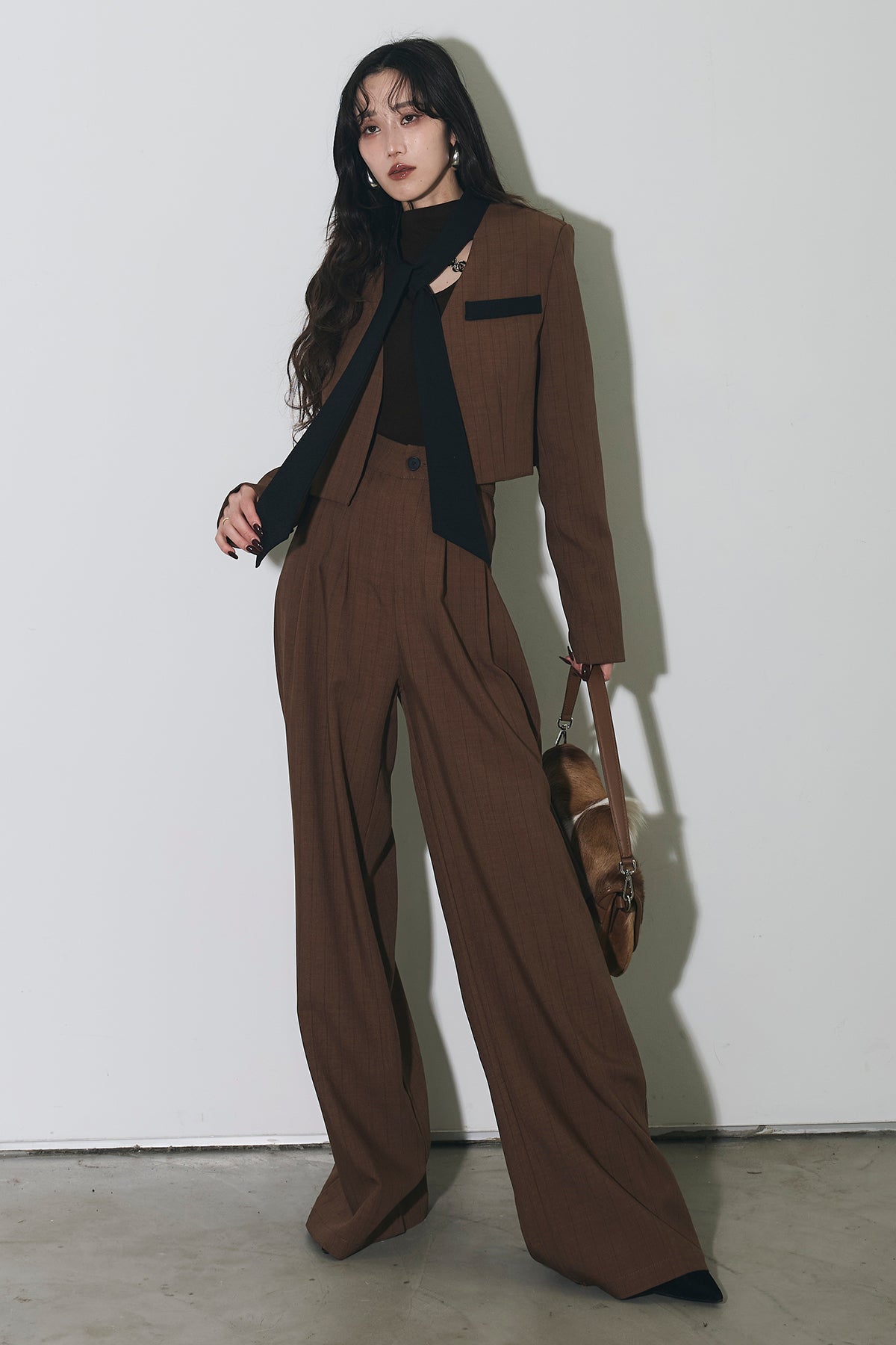 ご注文前に必ずページ下部「お届け期間」をご確認くださいませ。ショート丈ジャケットとワイドパンツのセットアップ。 縦のラインを意識したシルエットで、スタイルアップが叶います。 インナーのデザインがアクセントになり、程よくモードな印象に。 それぞれ単品使いもしやすく、着回し力も◎。 オンオフ問わず幅広いシーンで活躍するアイテムです。